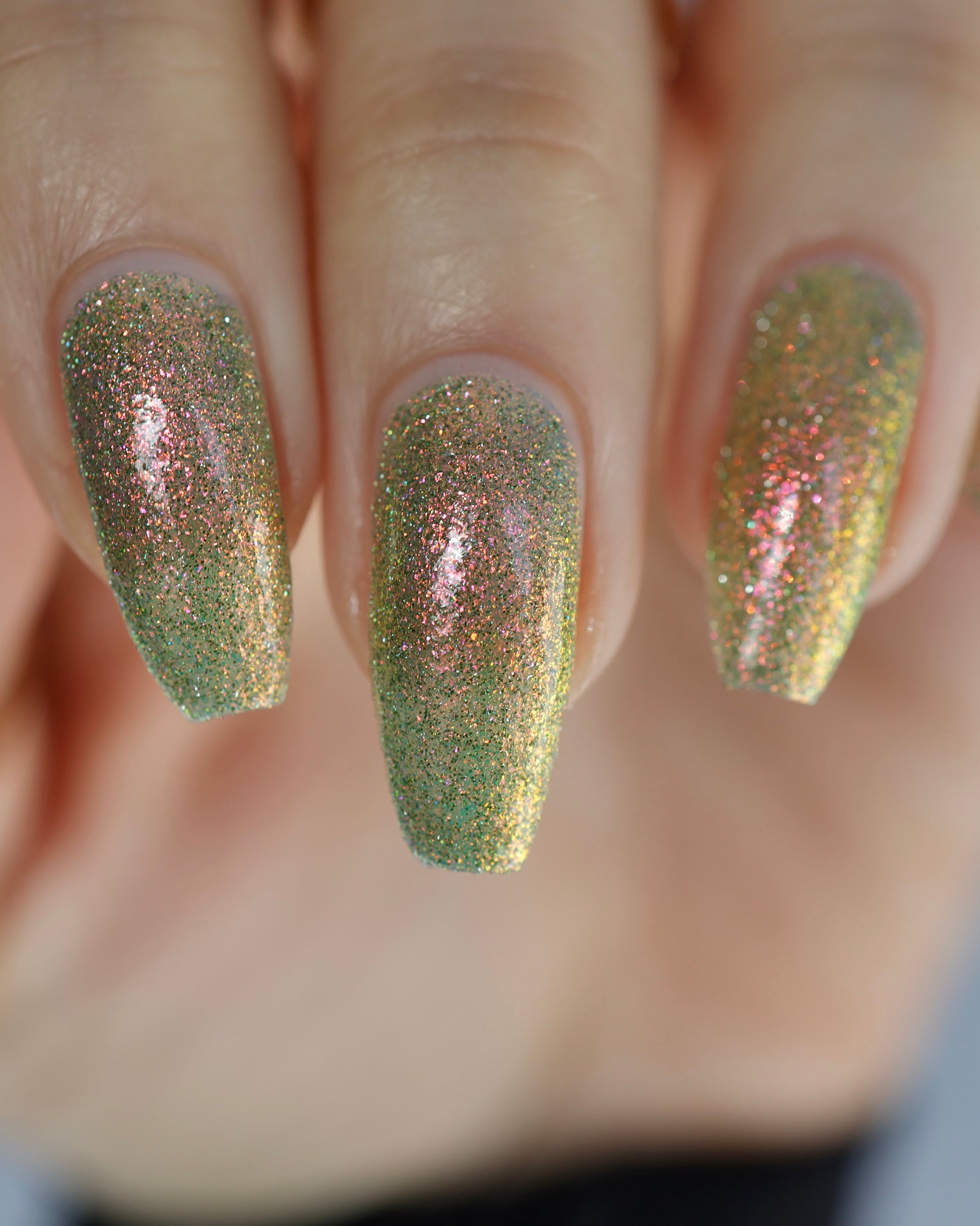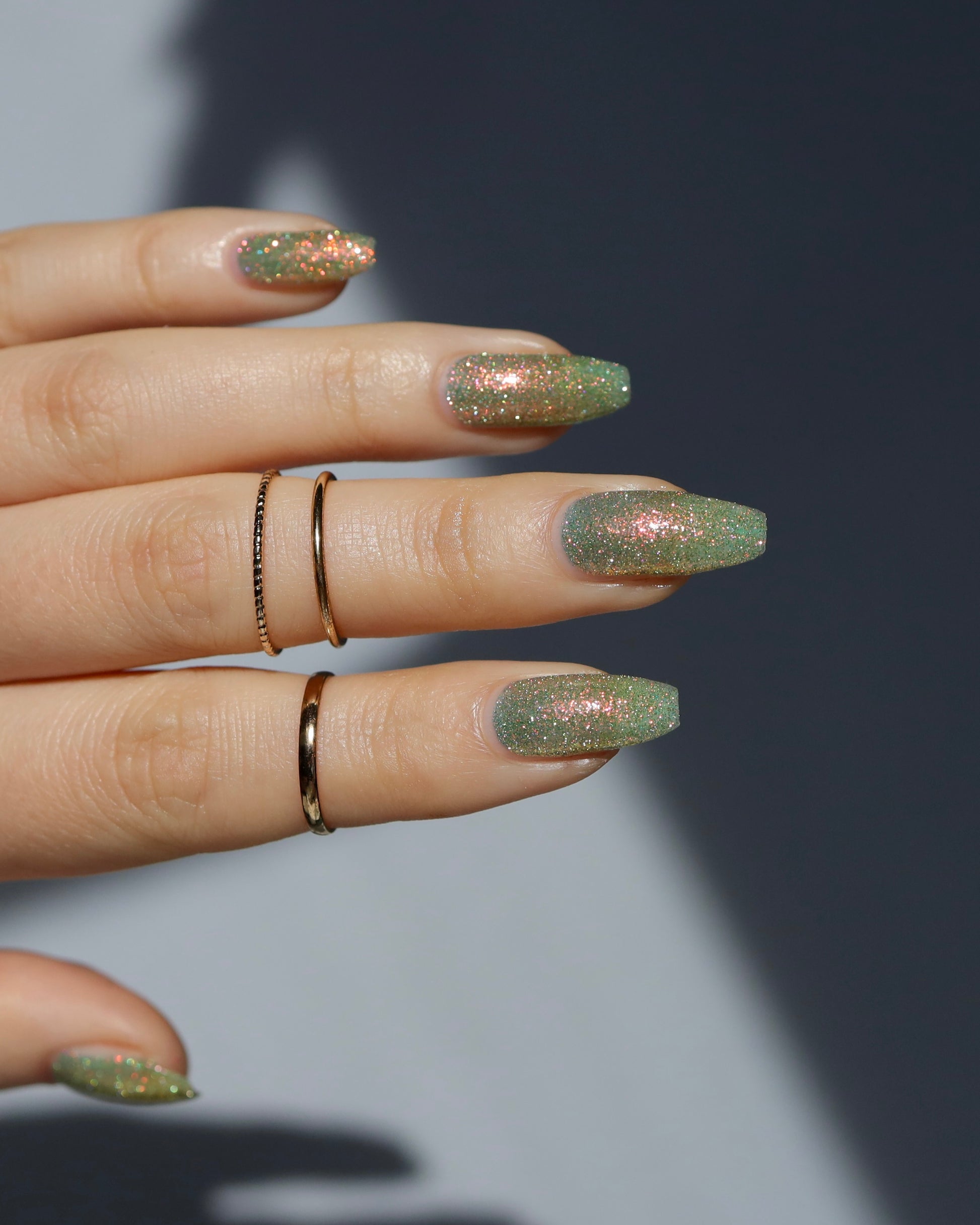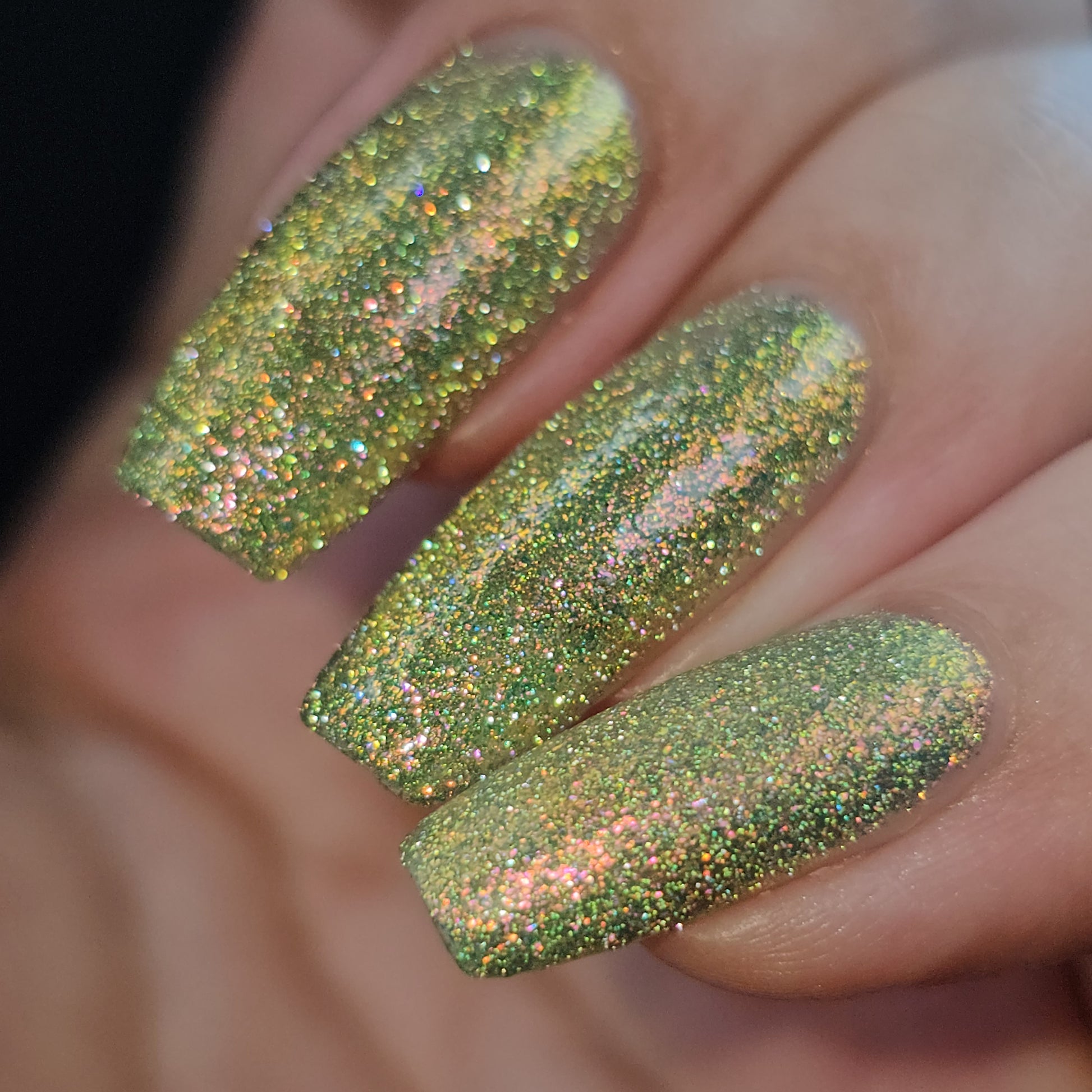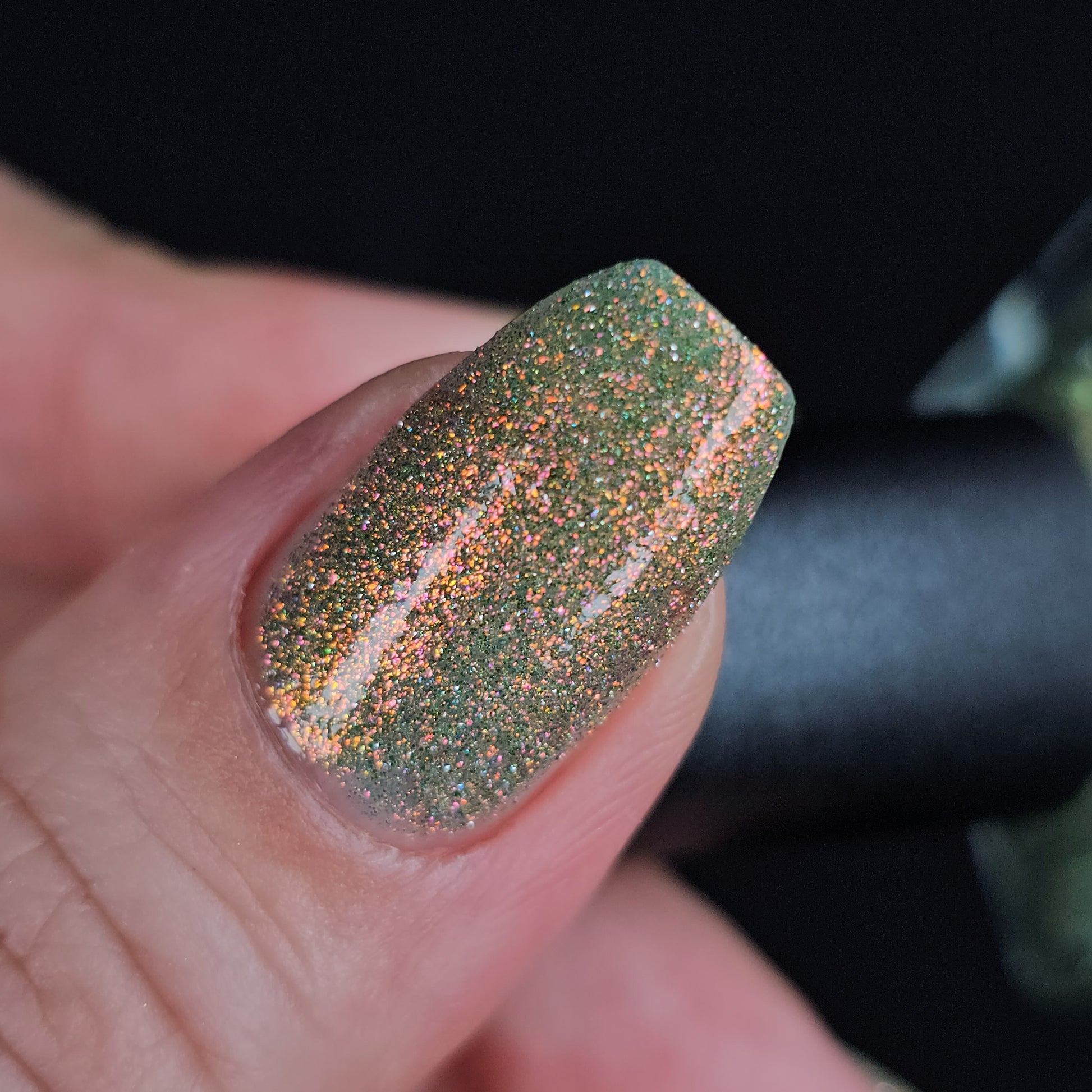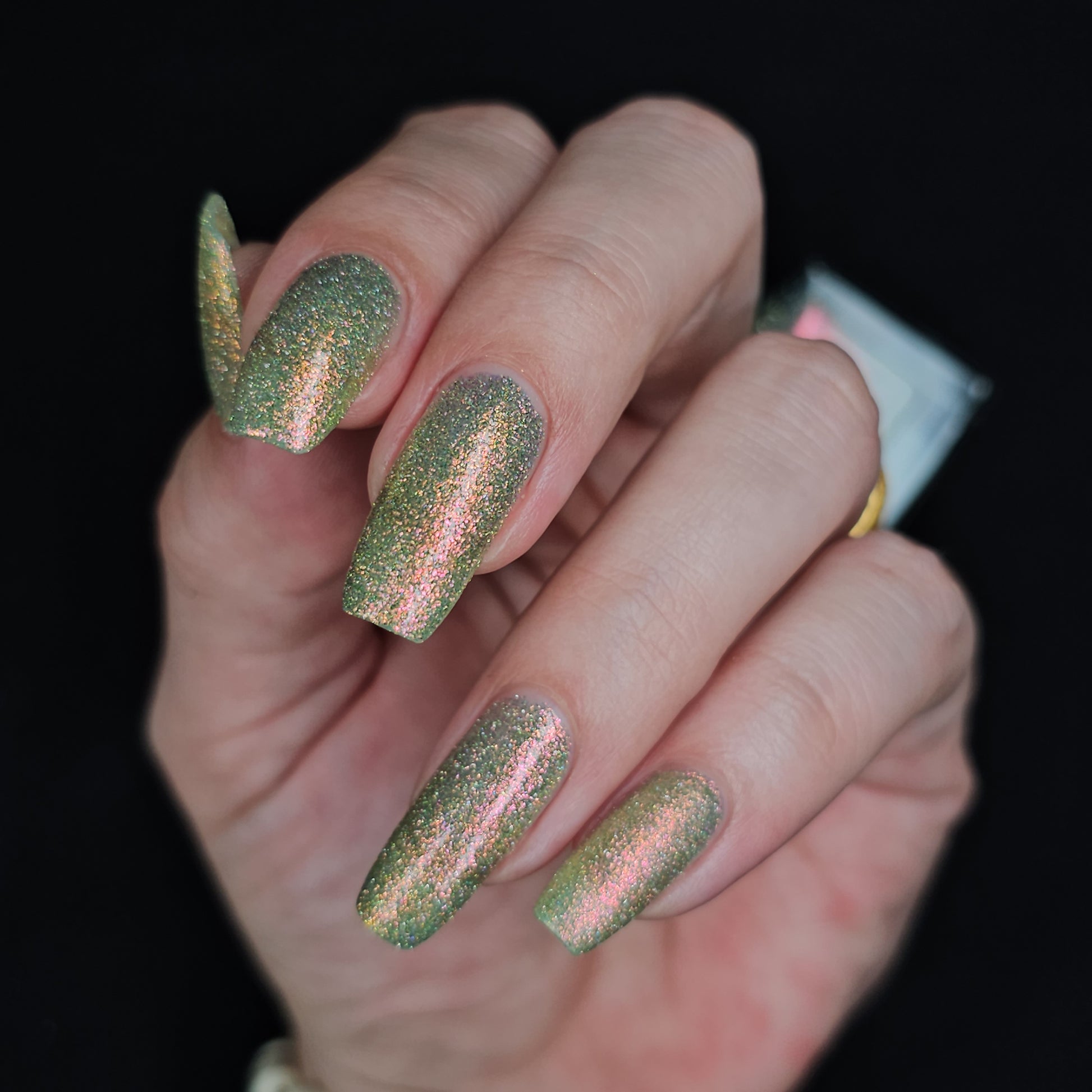 A moss green jelly base with a vibrant aurora microflake that shifts from orange to gold to green and chartreuse light reflective glitter