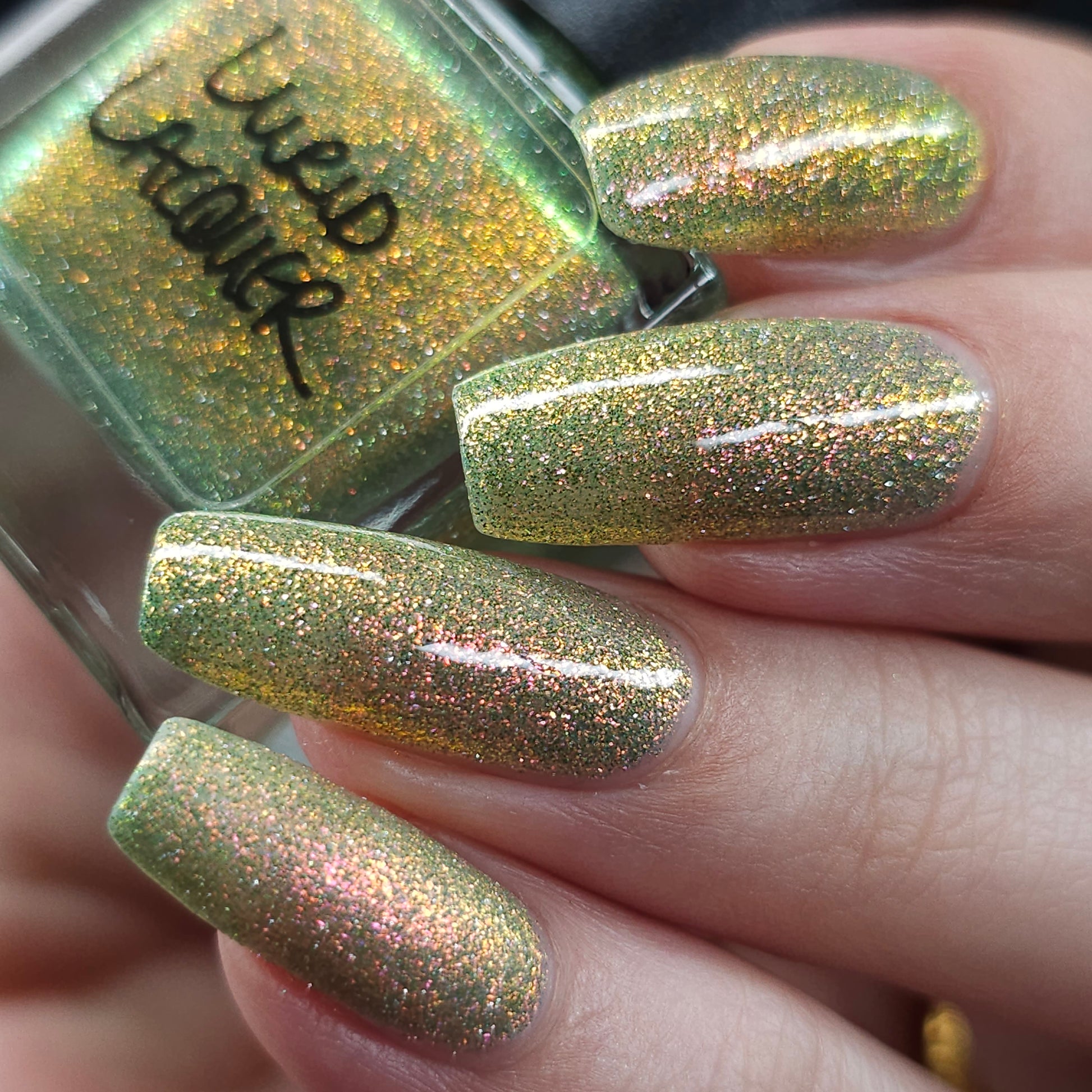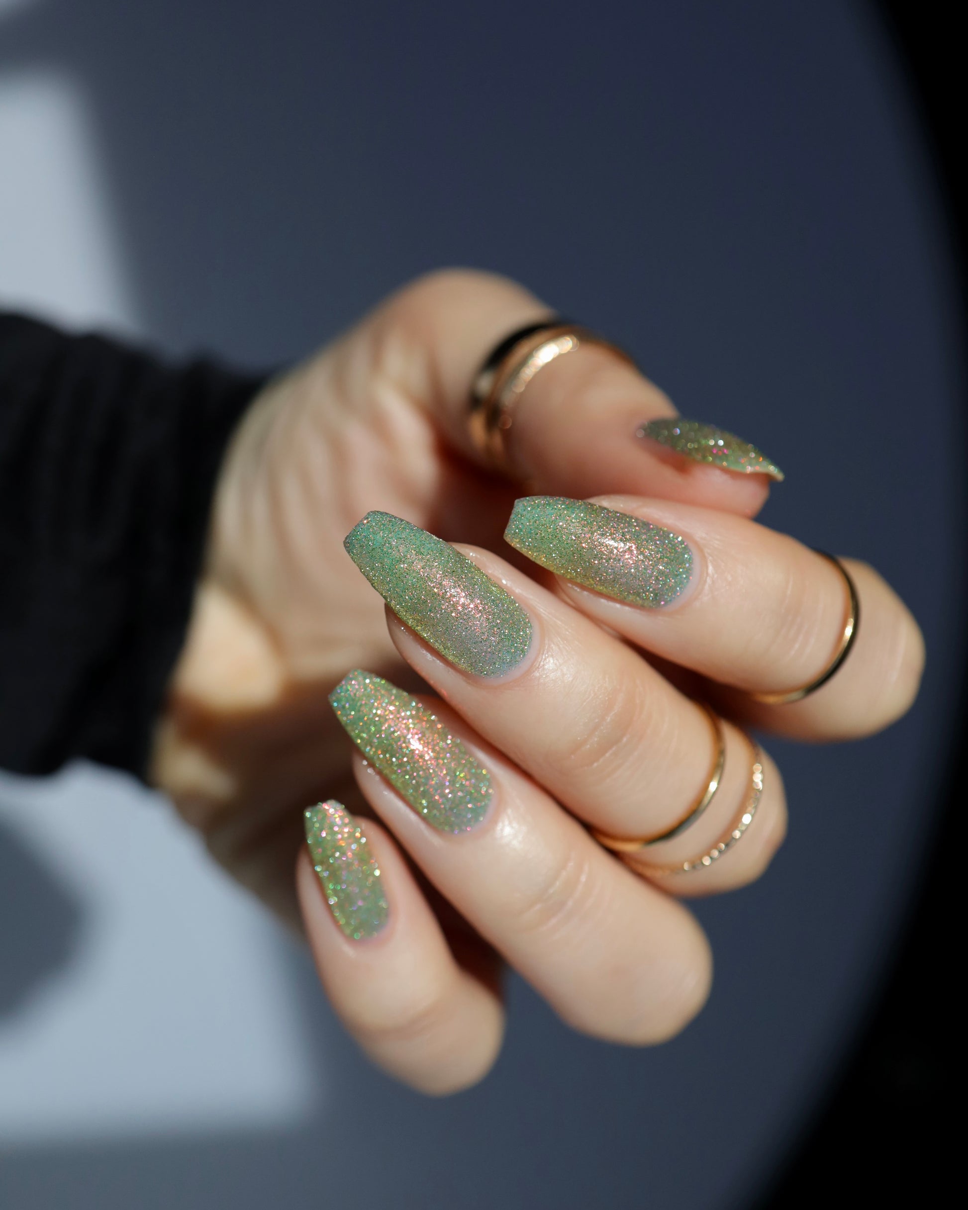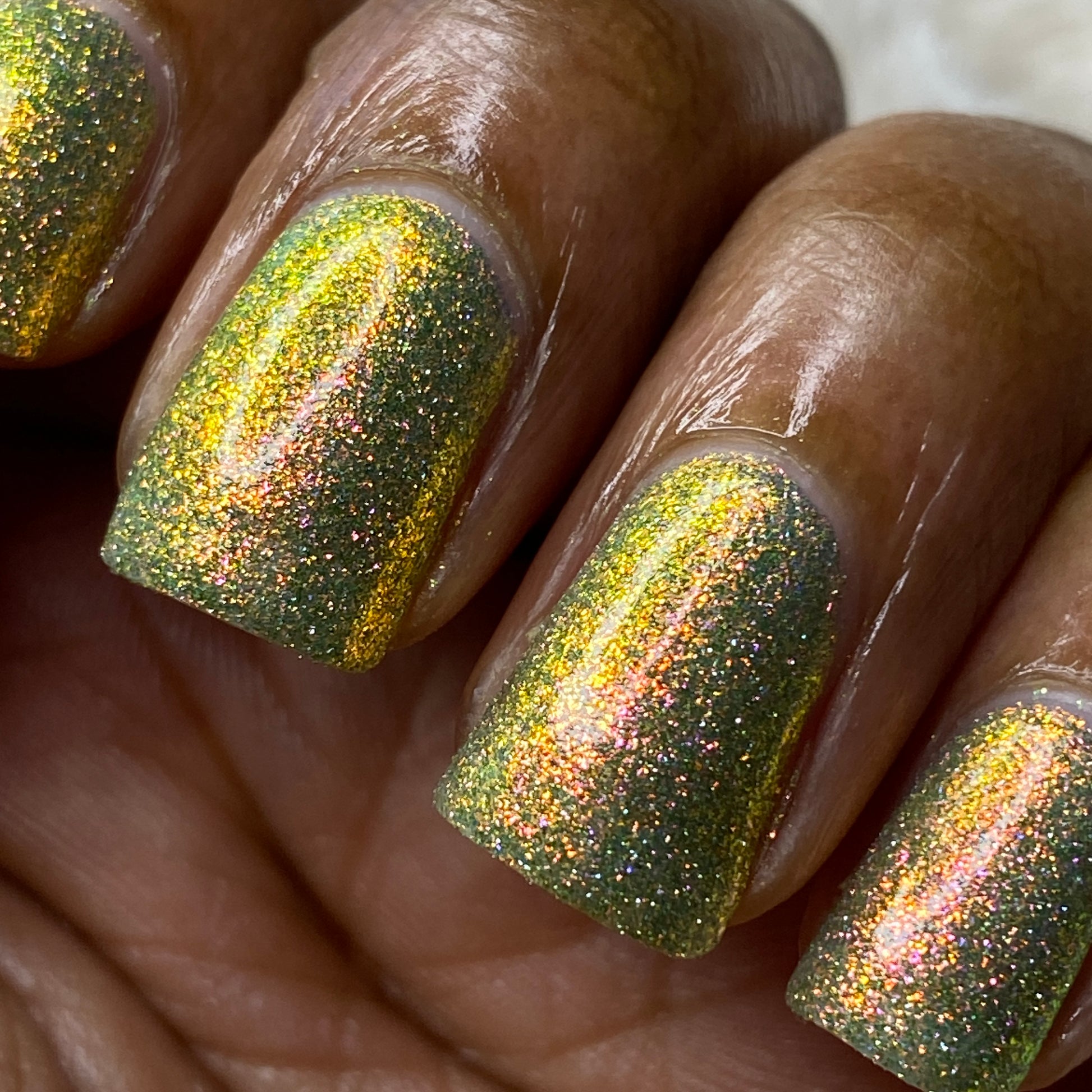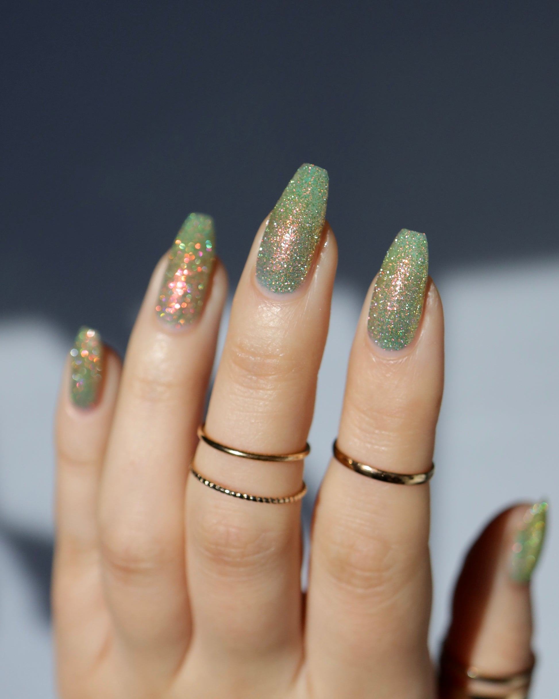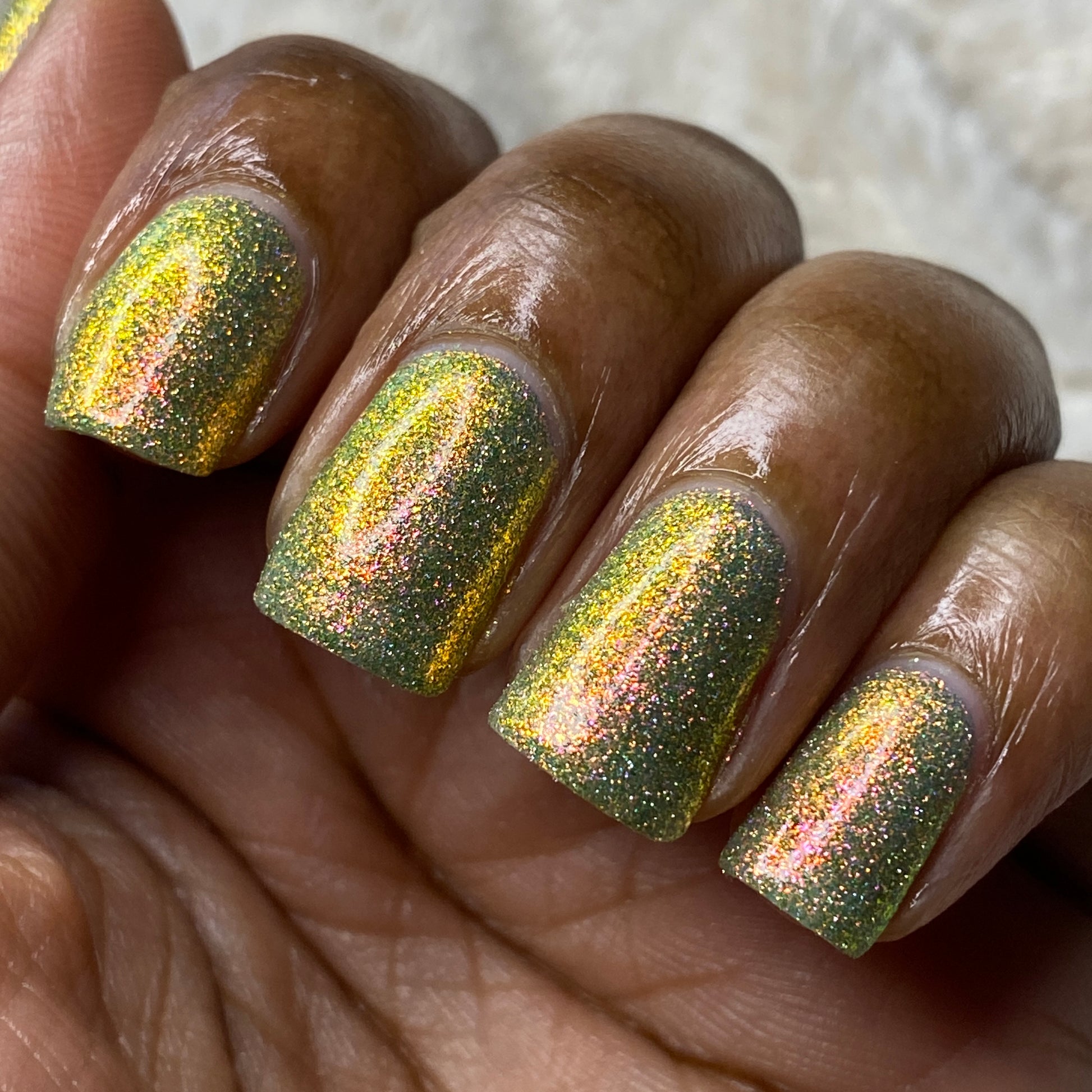 A moss green jelly base with a vibrant aurora microflake that shifts from orange to gold to green and chartreuse light reflective glitter
