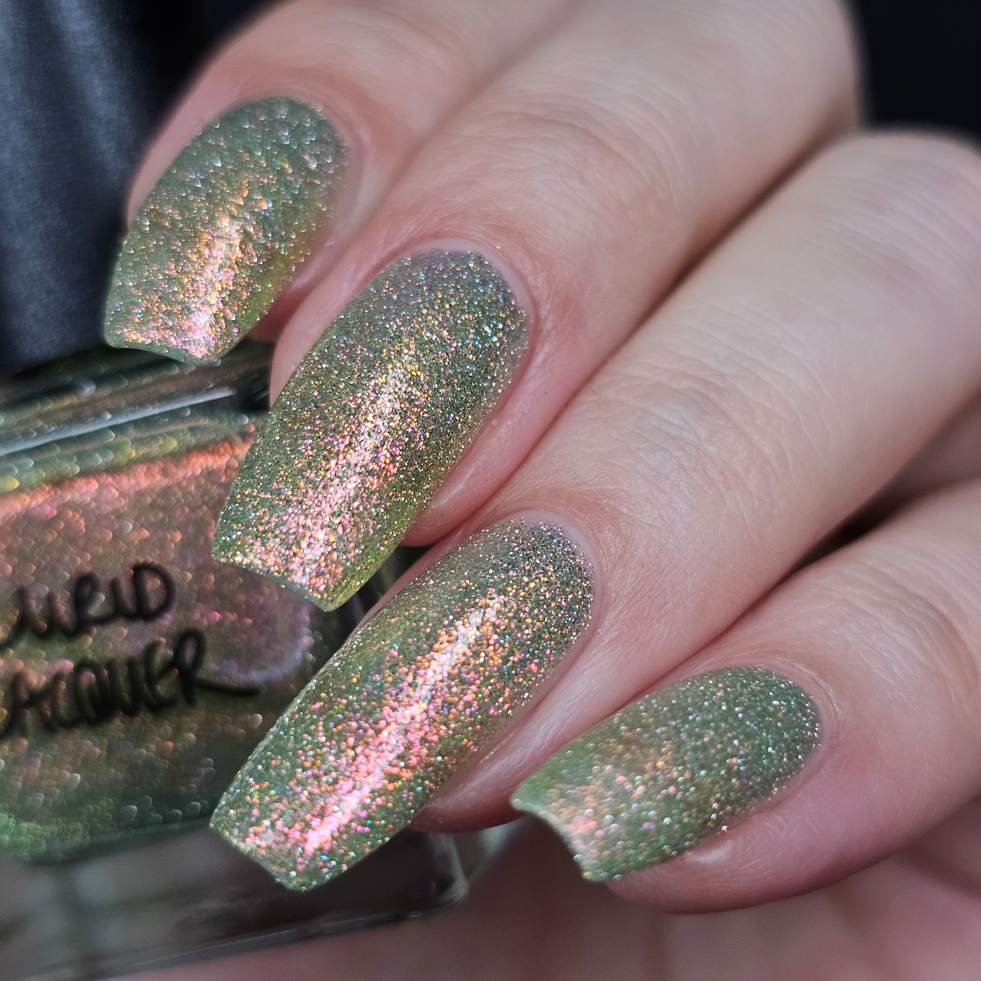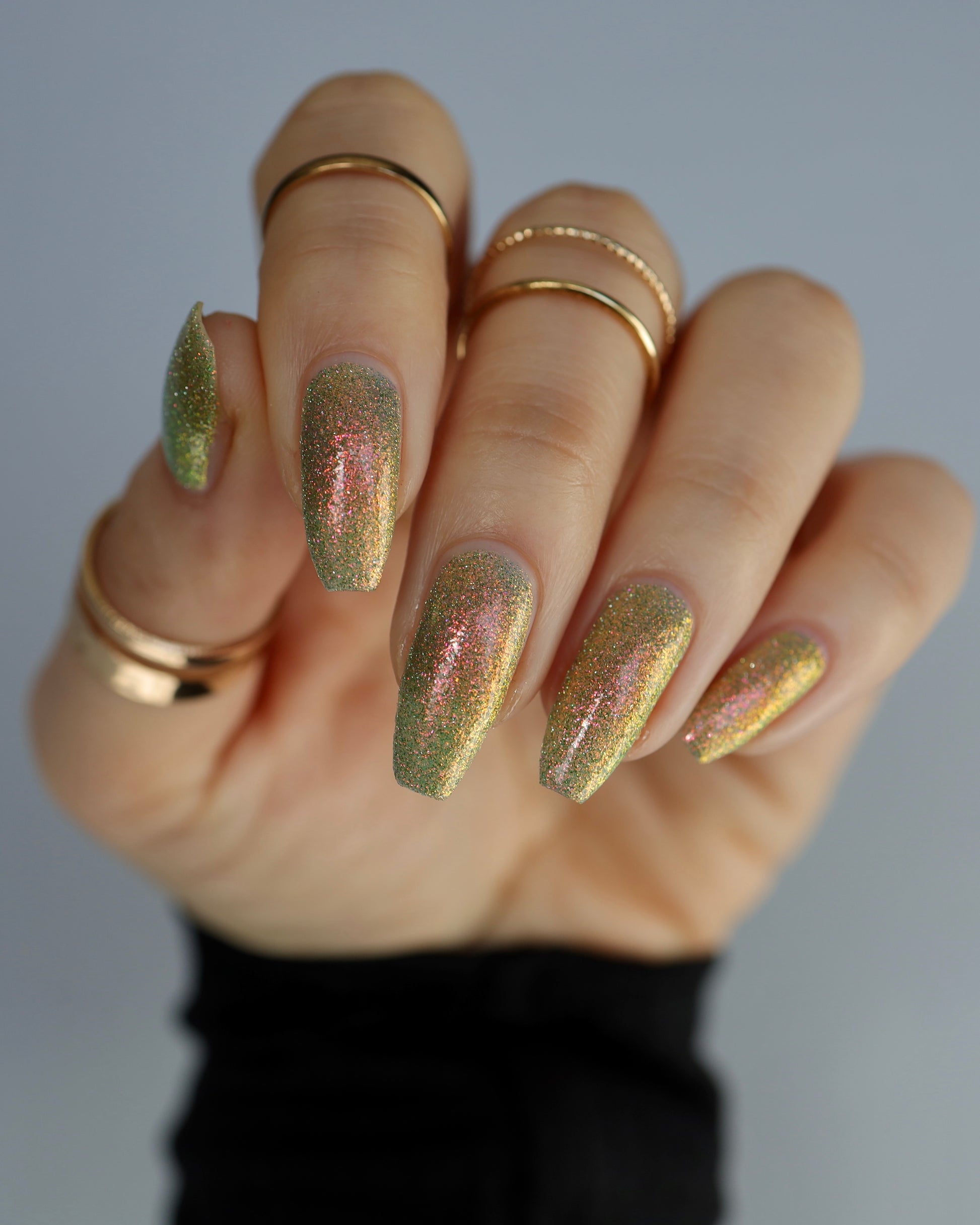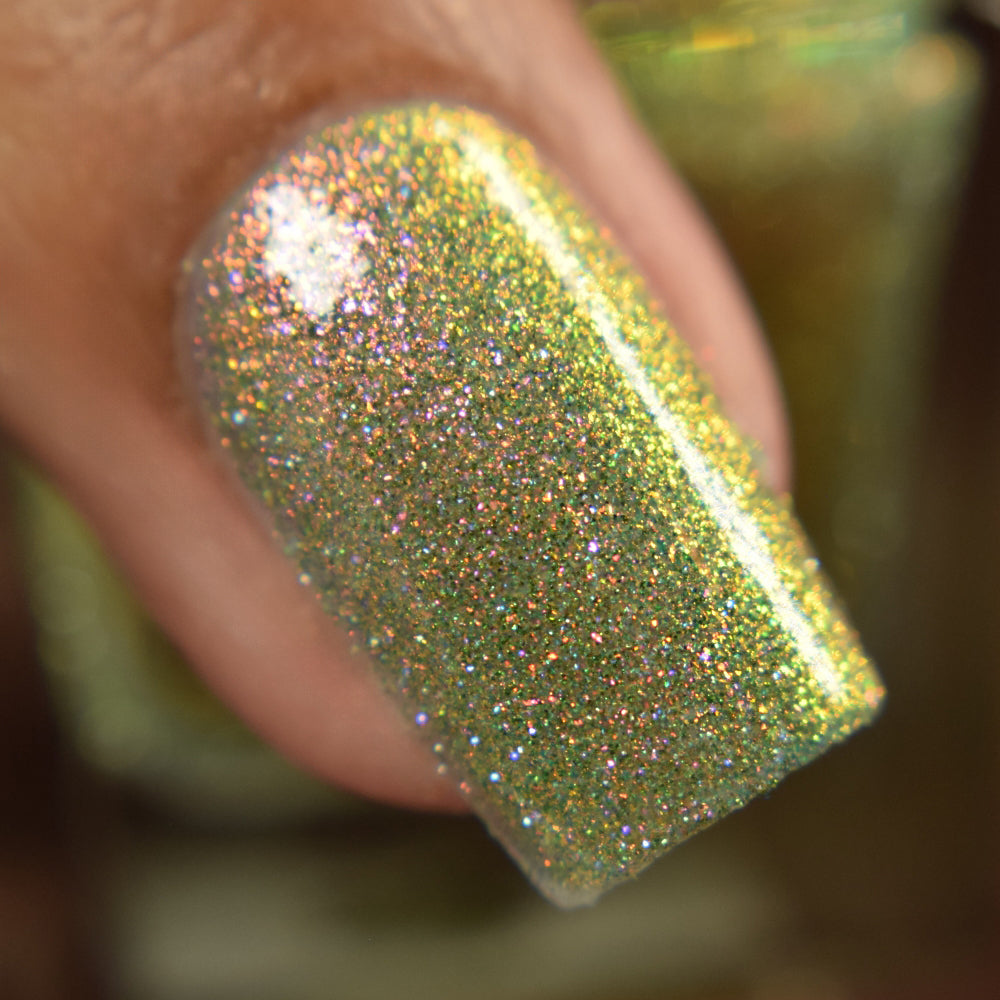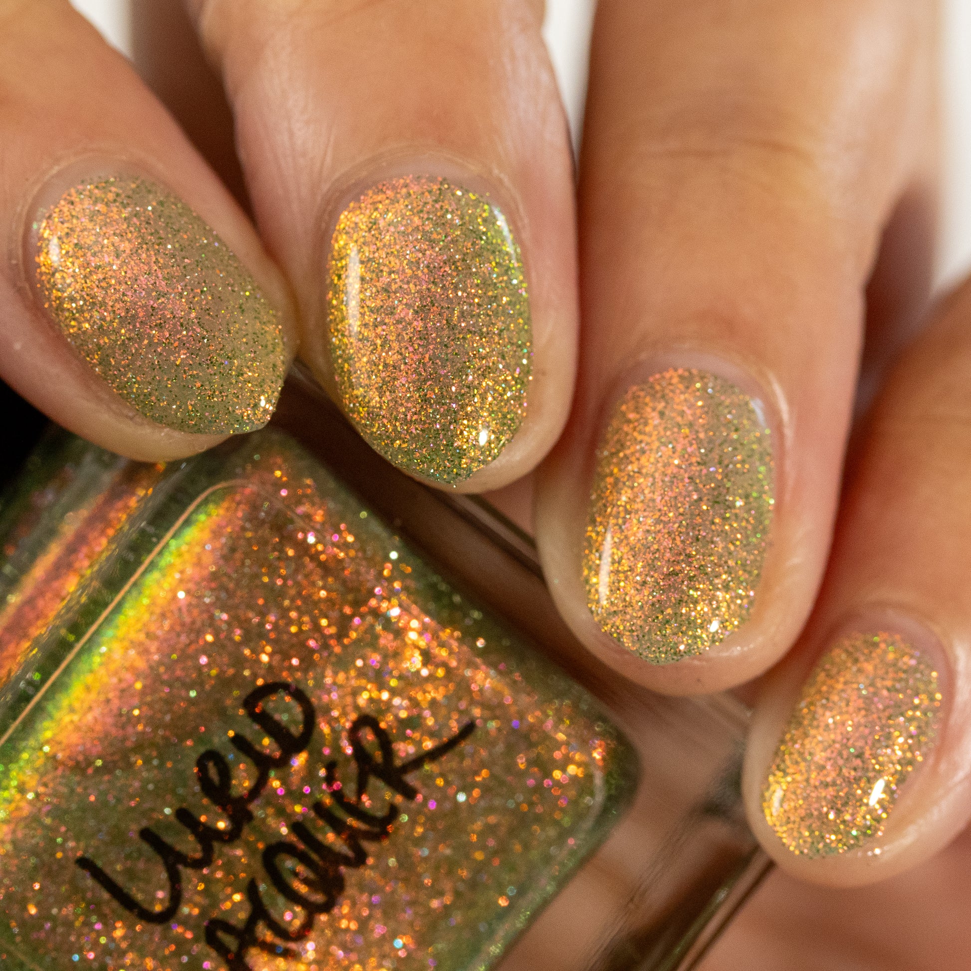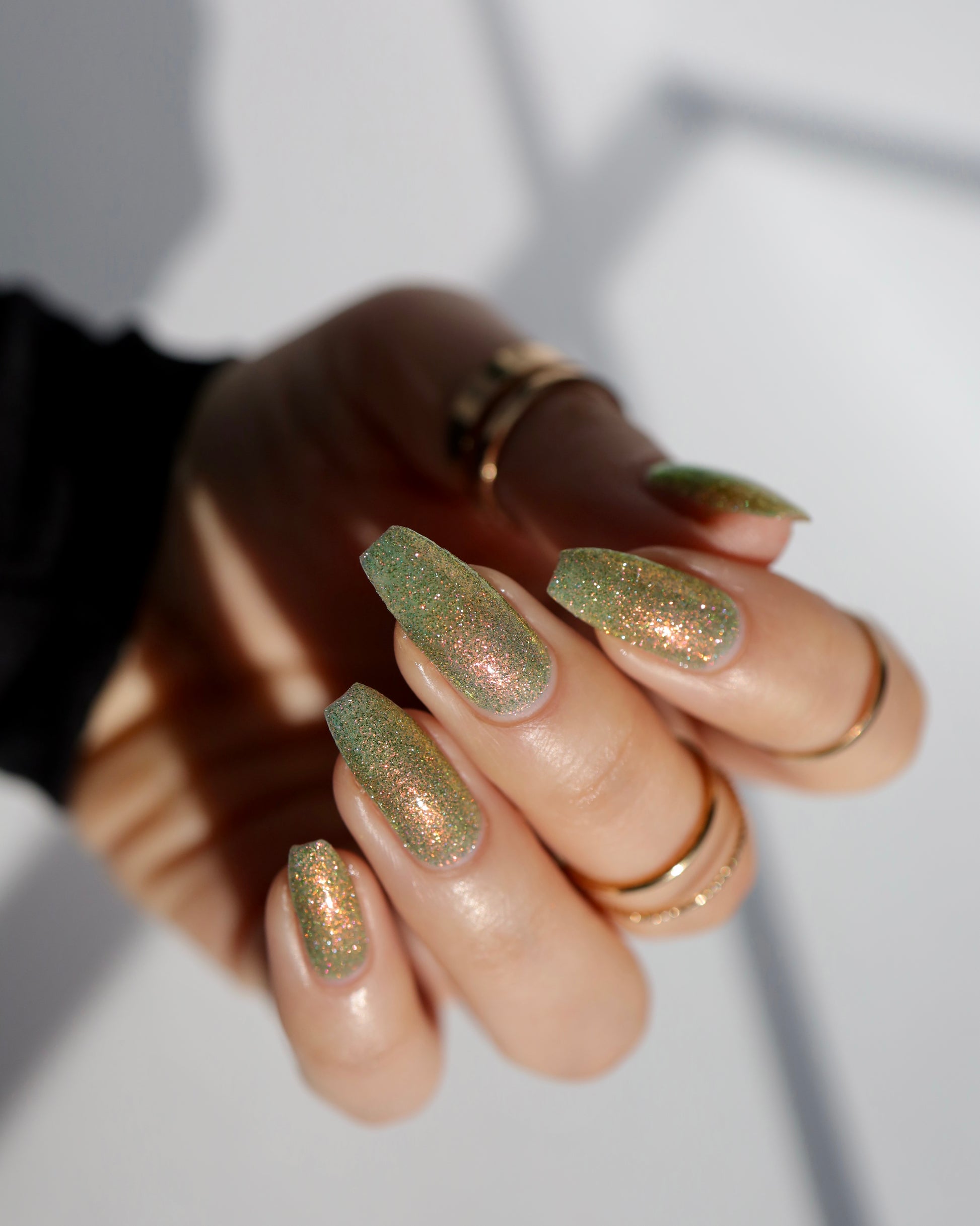 A moss green jelly base with a vibrant aurora microflake that shifts from orange to gold to green and chartreuse light reflective glitter