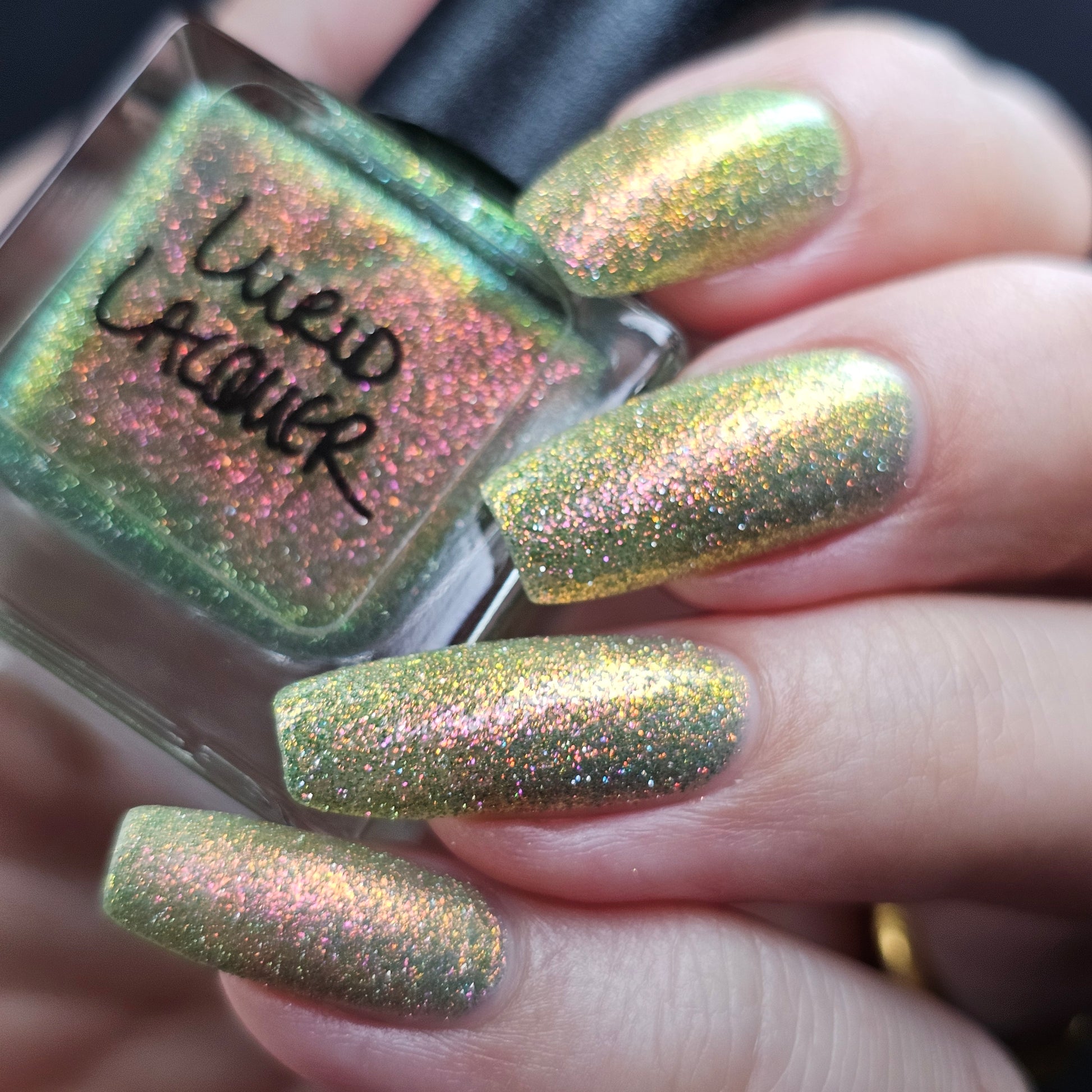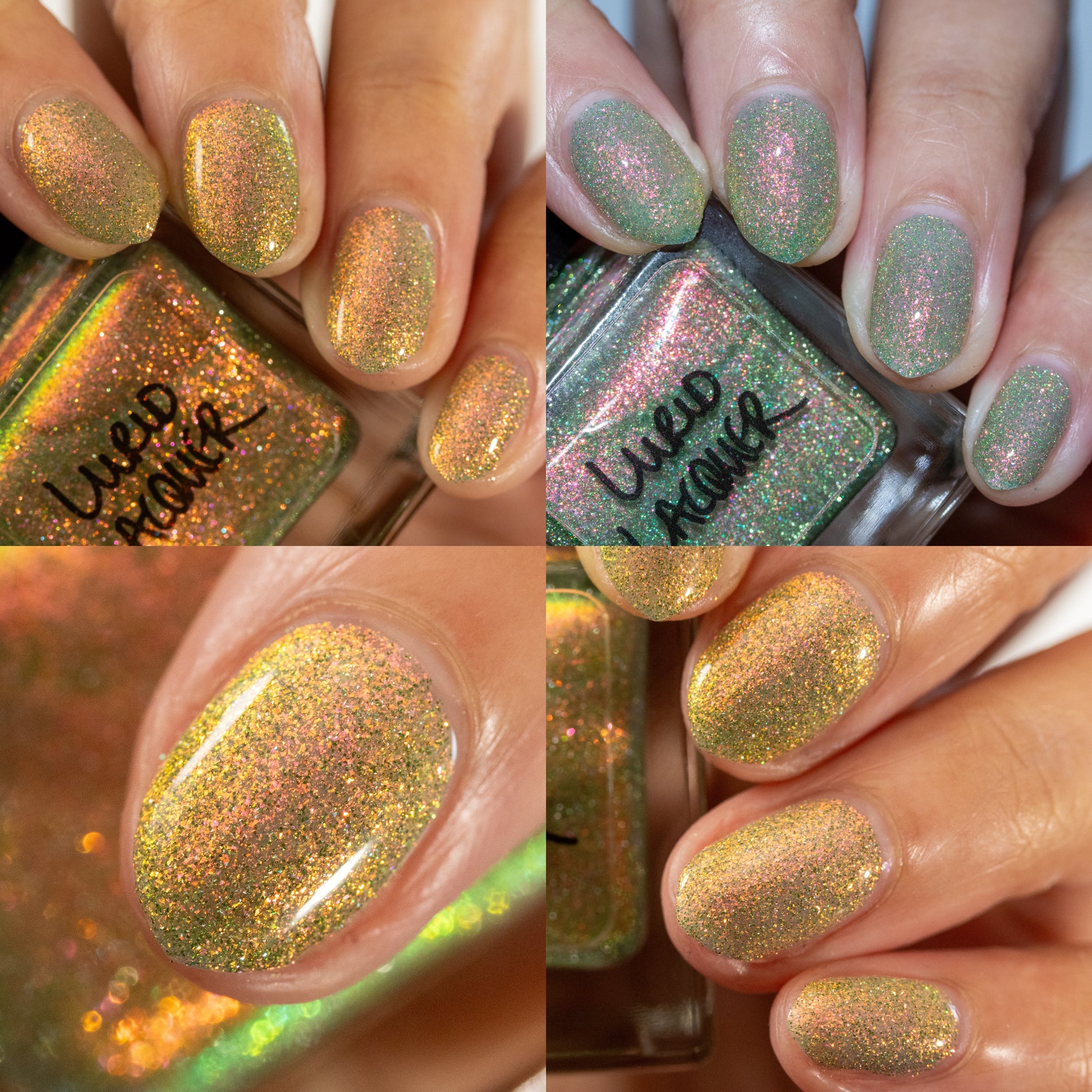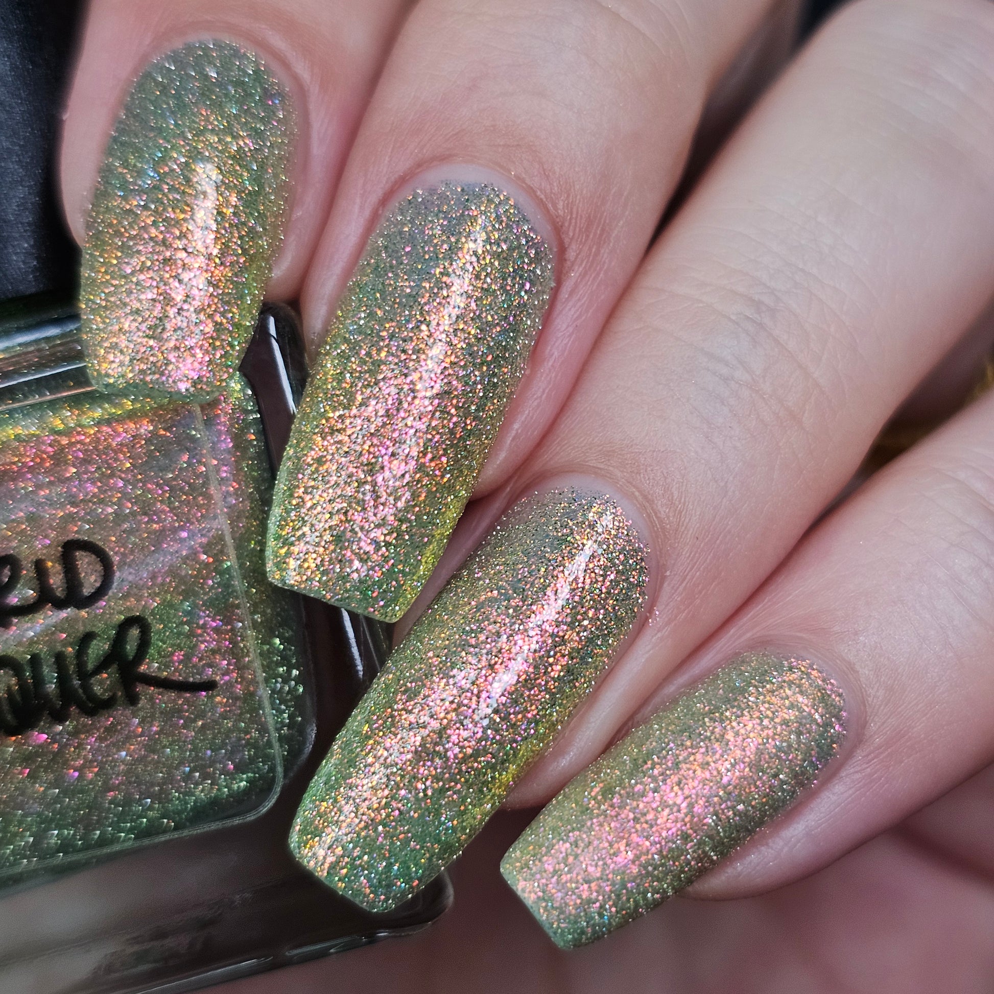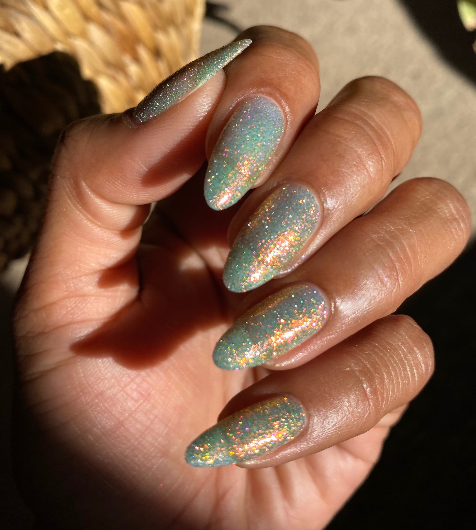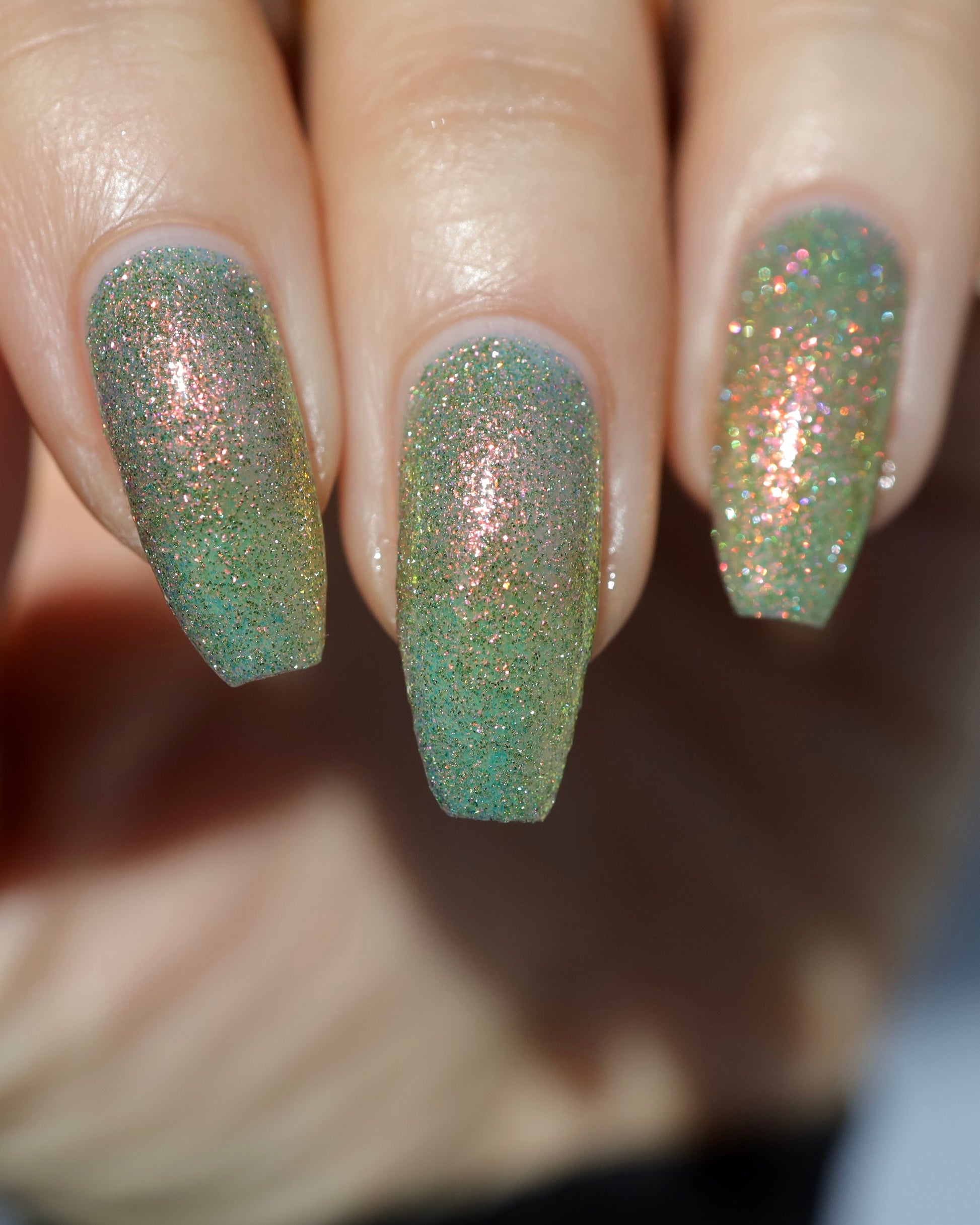 A moss green jelly base with a vibrant aurora microflake that shifts from orange to gold to green and chartreuse light reflective glitter