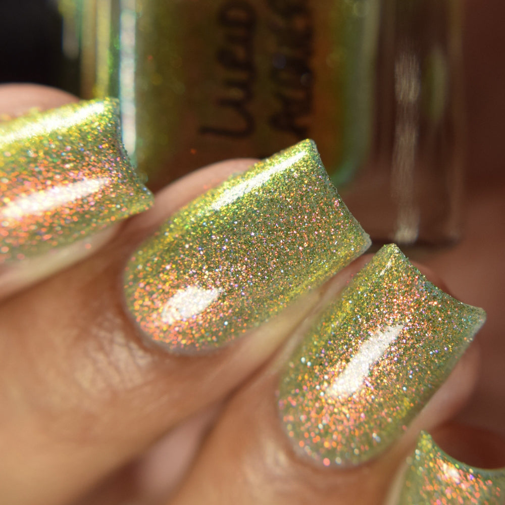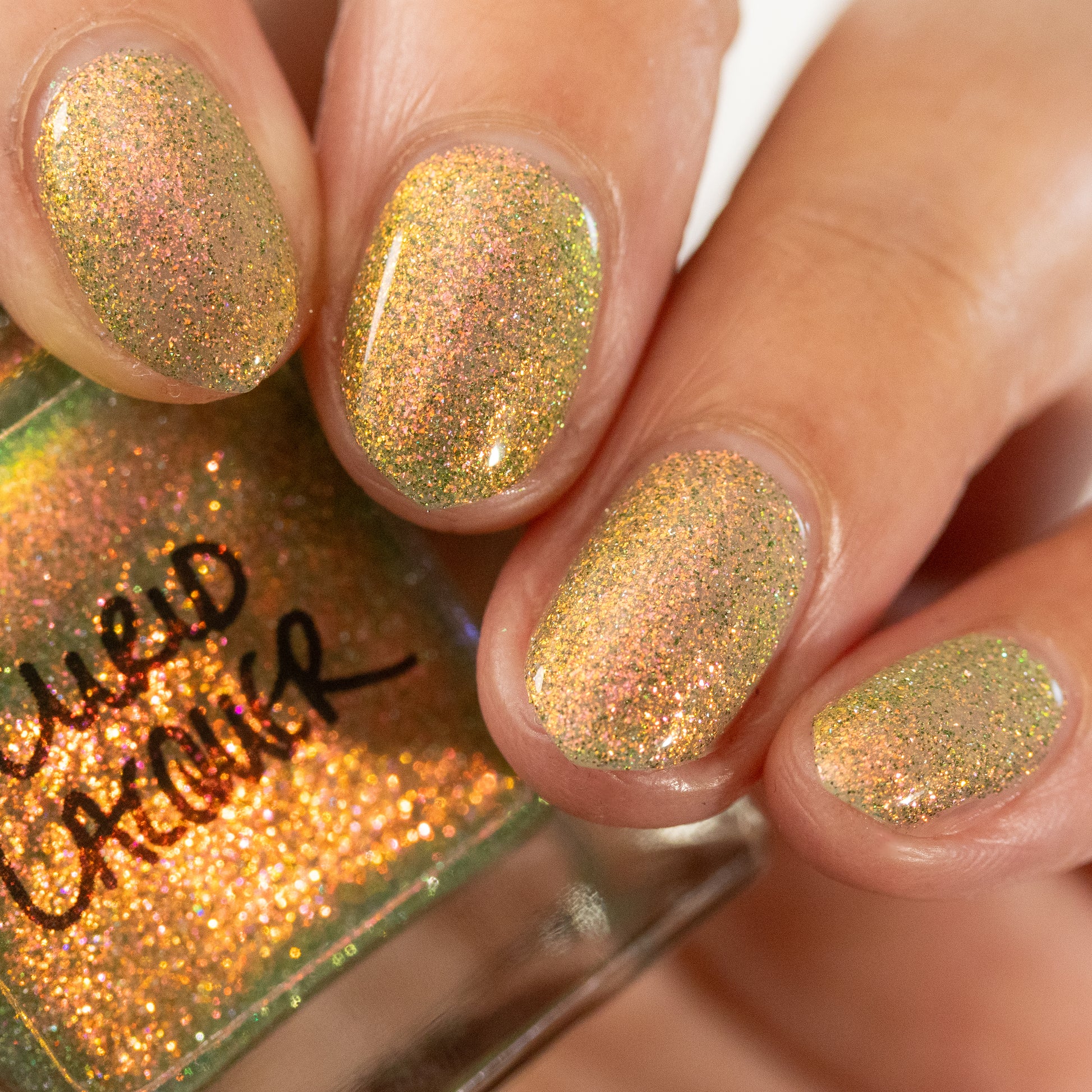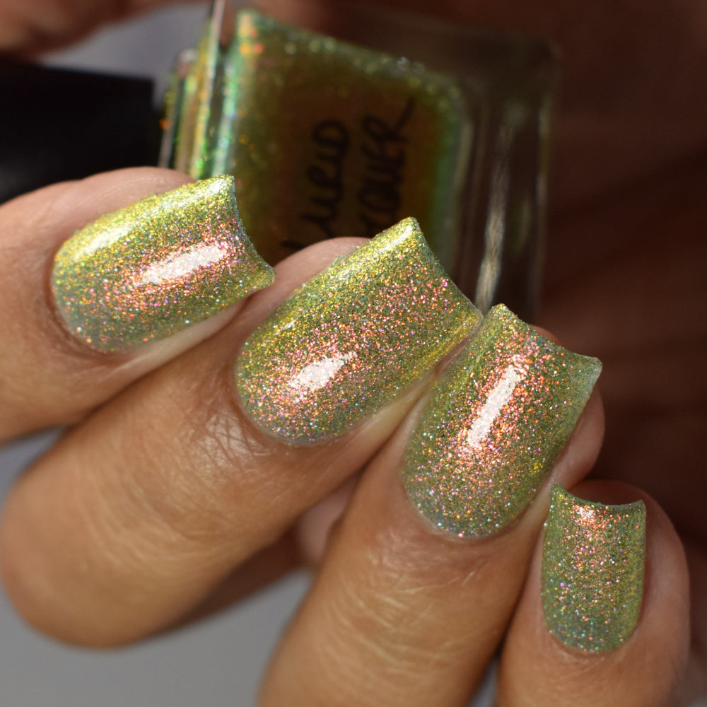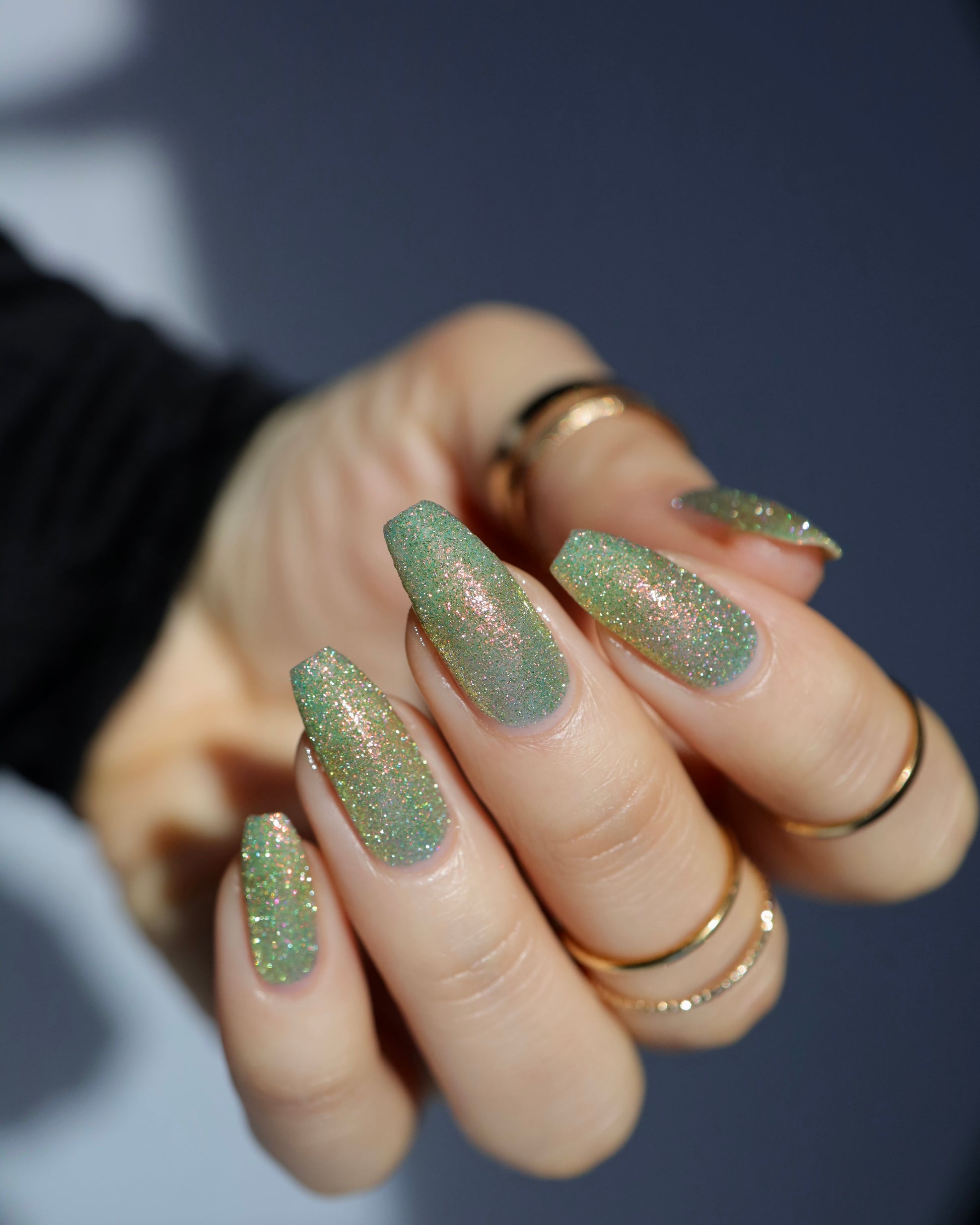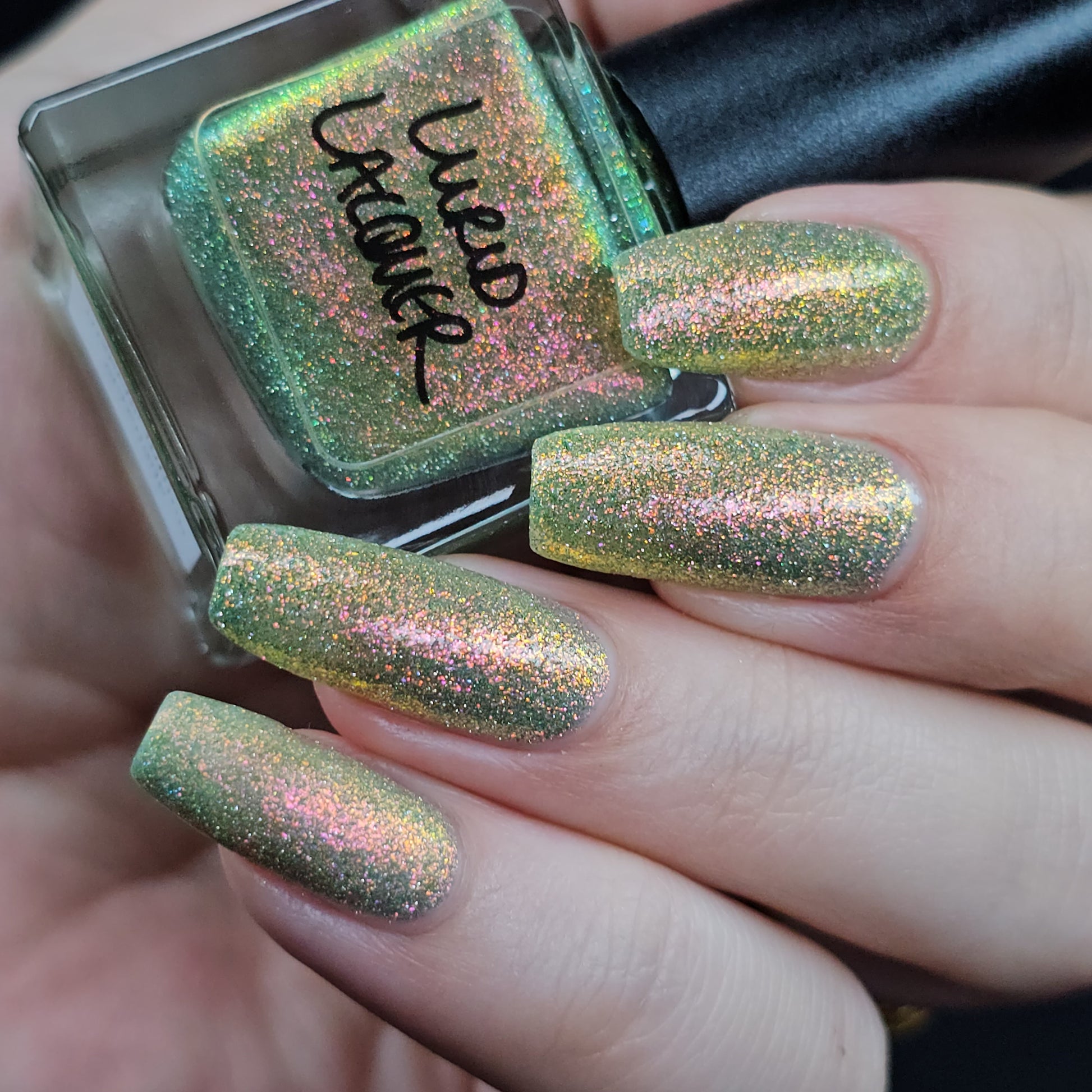 A moss green jelly base with a vibrant aurora microflake that shifts from orange to gold to green and chartreuse light reflective glitter