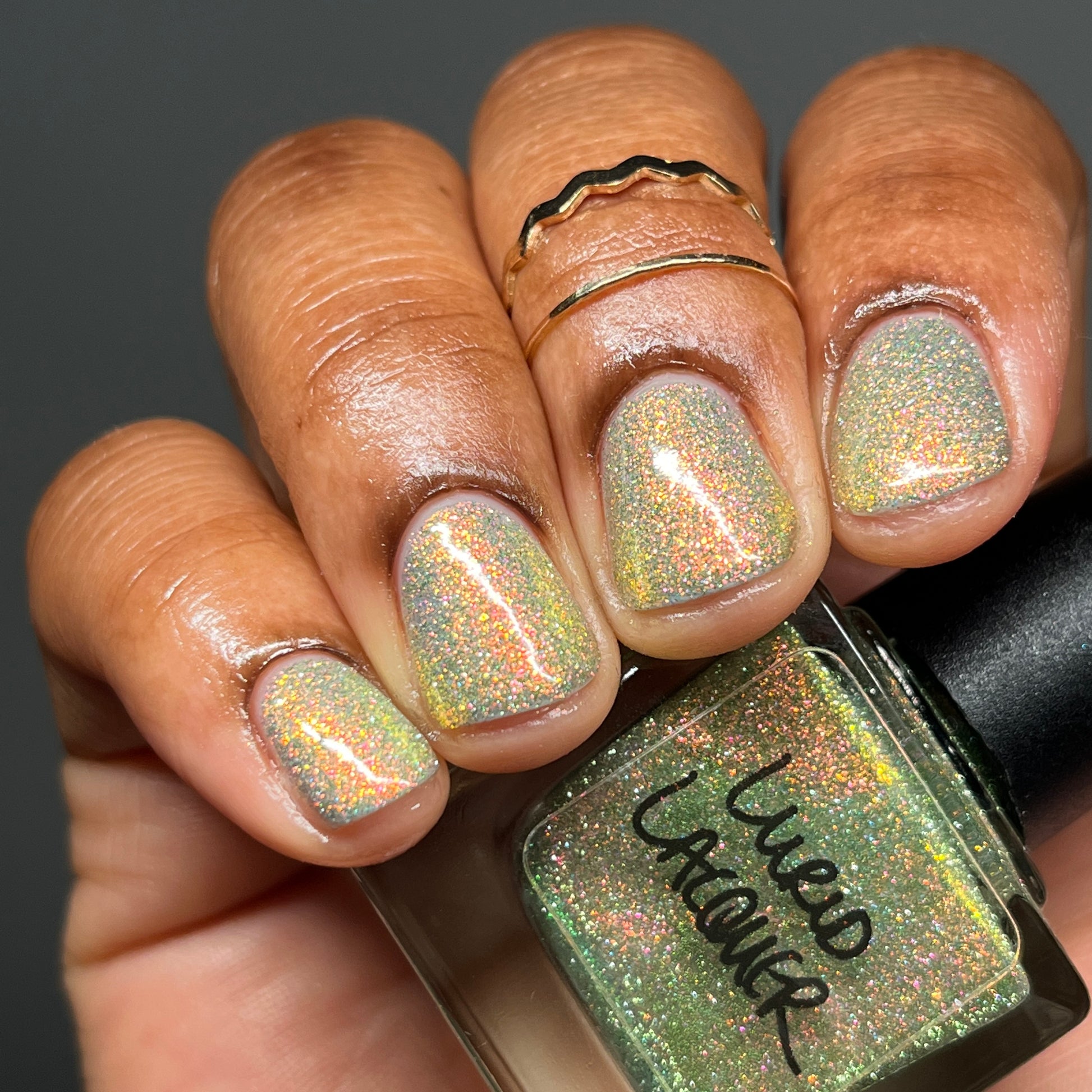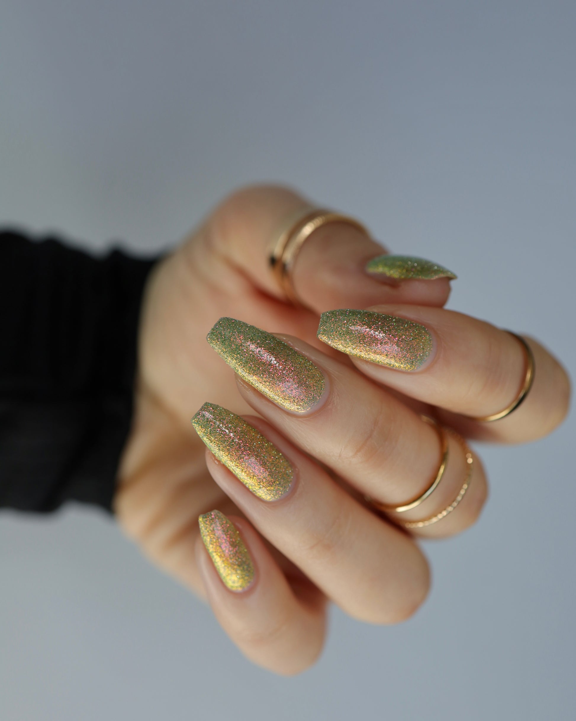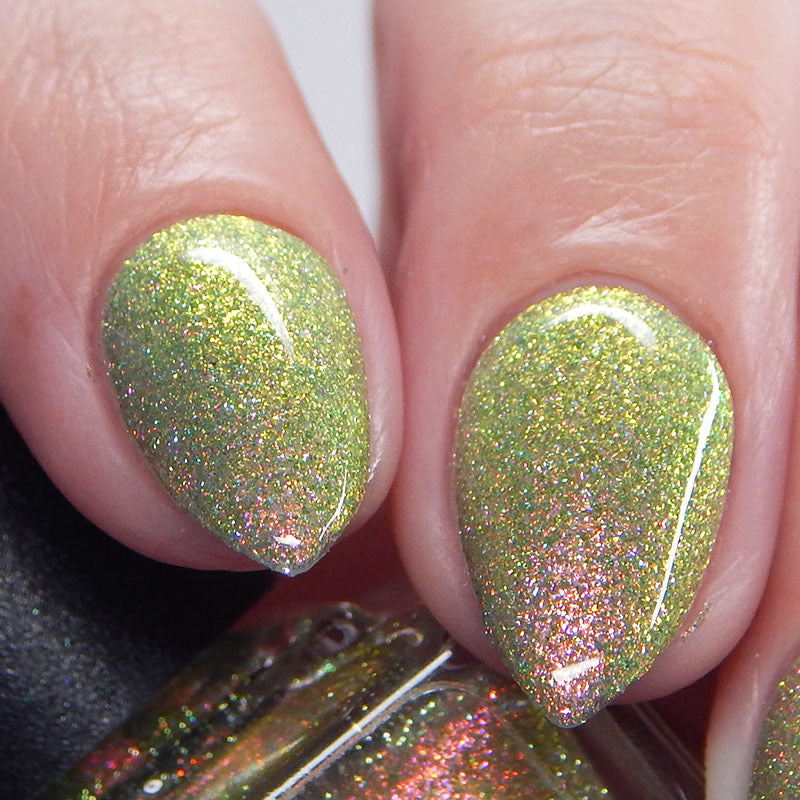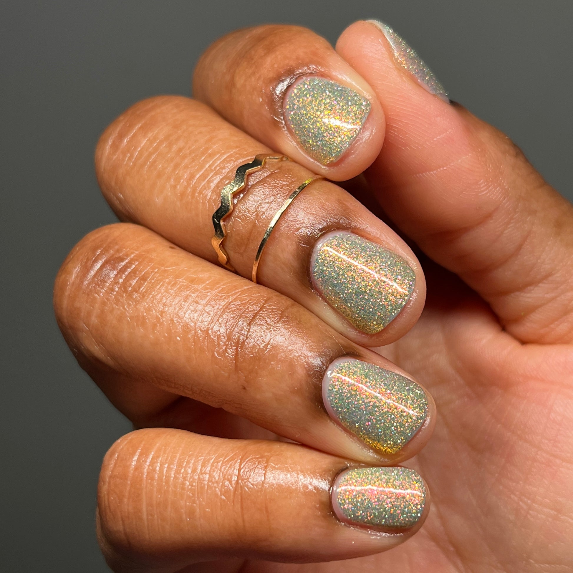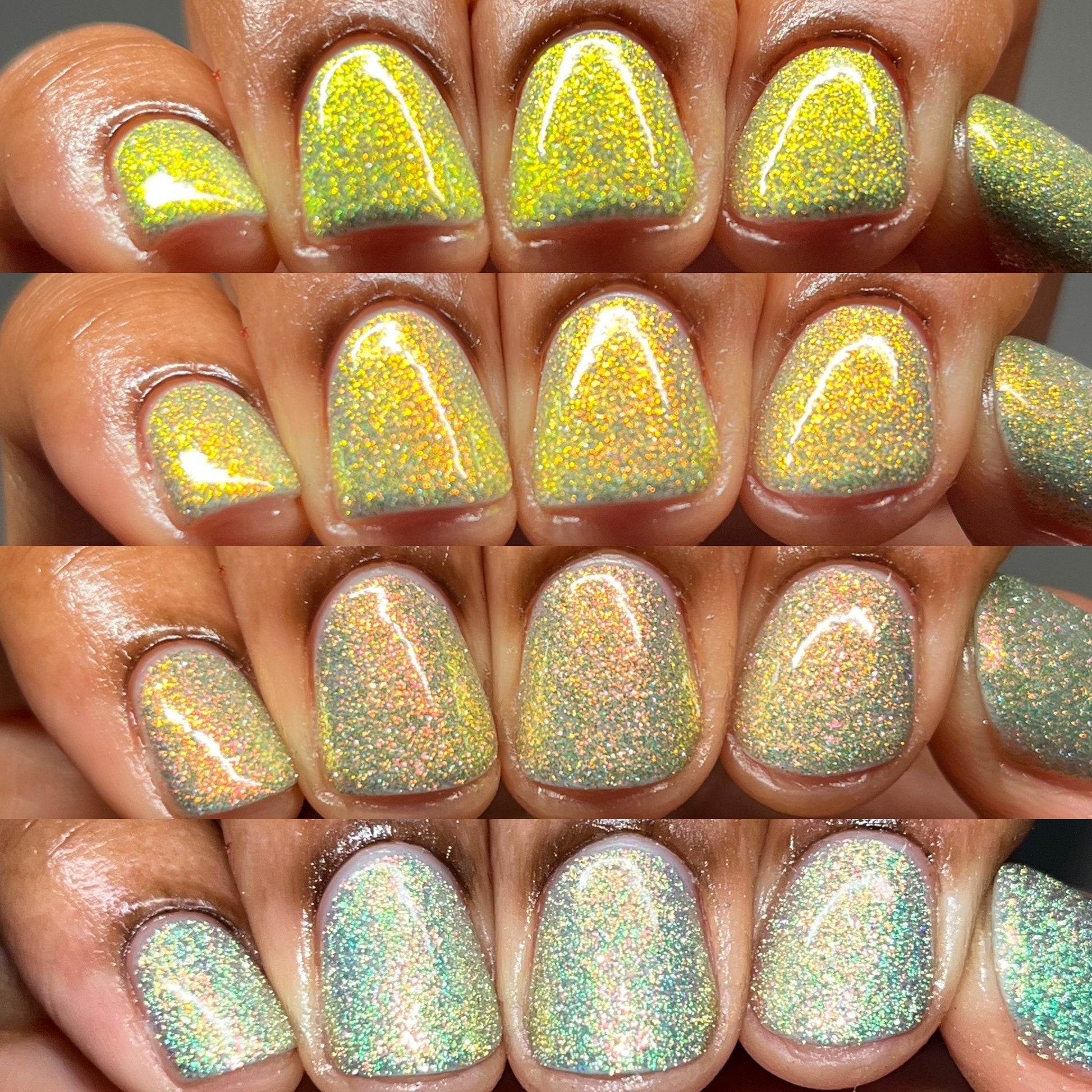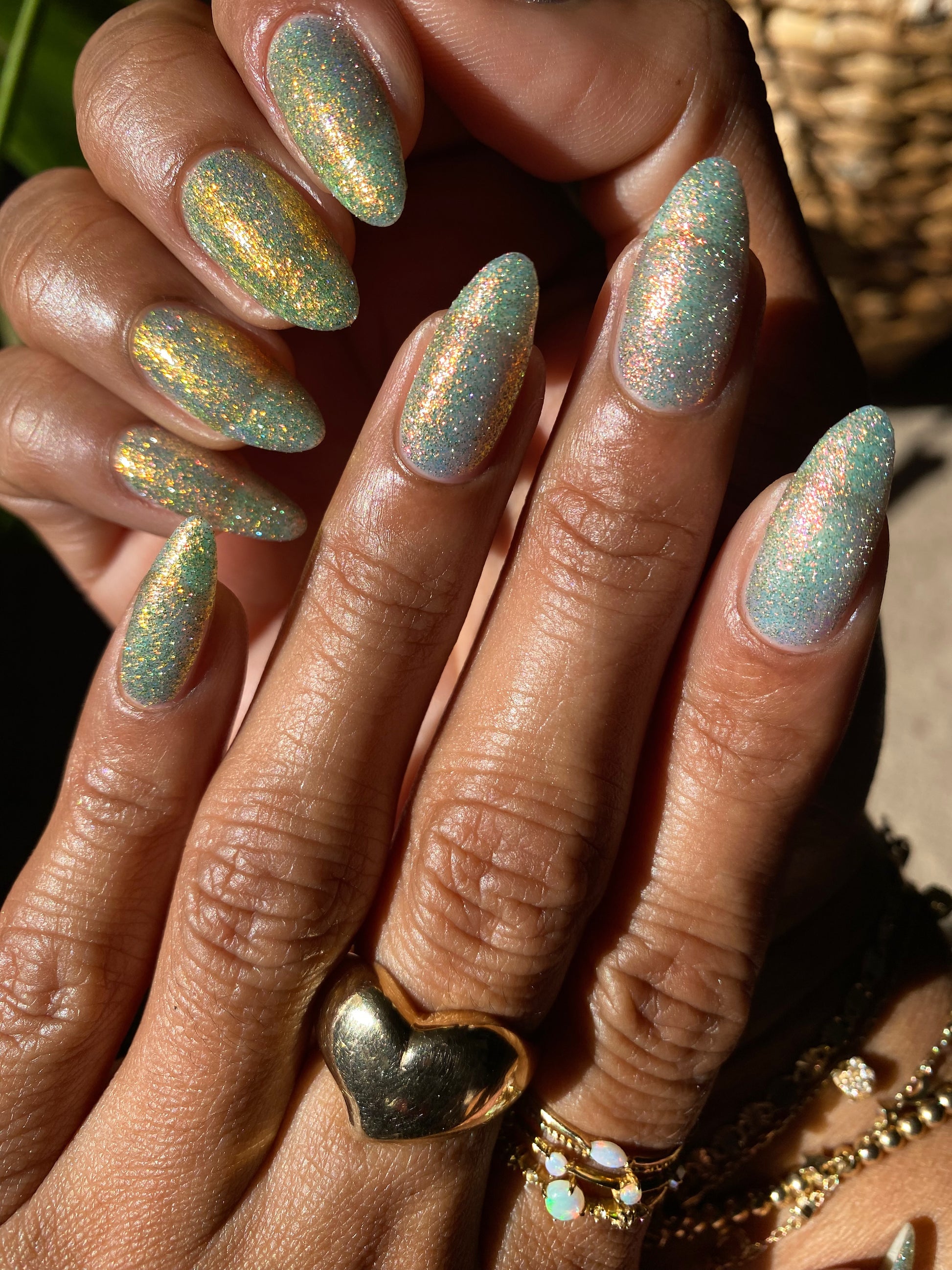 A moss green jelly base with a vibrant aurora microflake that shifts from orange to gold to green and chartreuse light reflective glitter