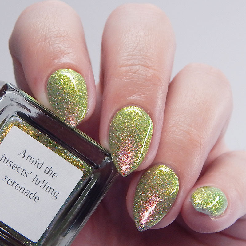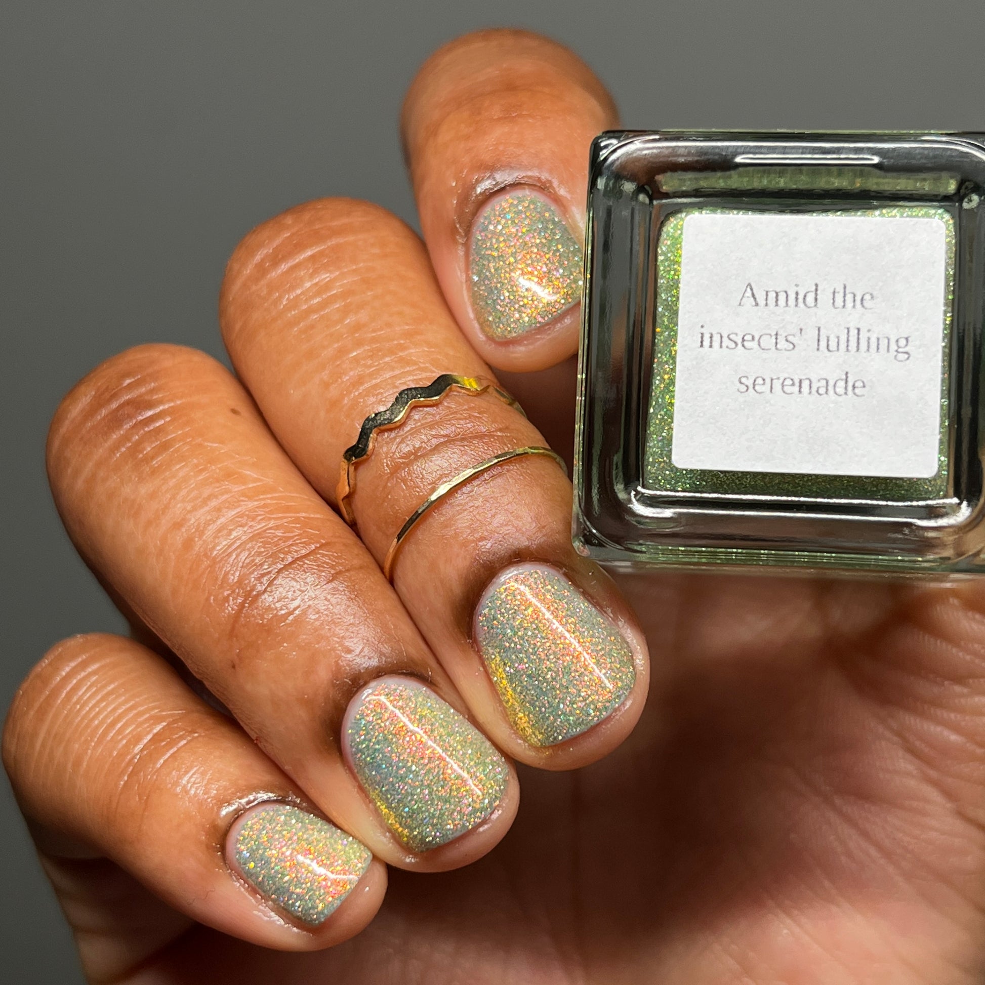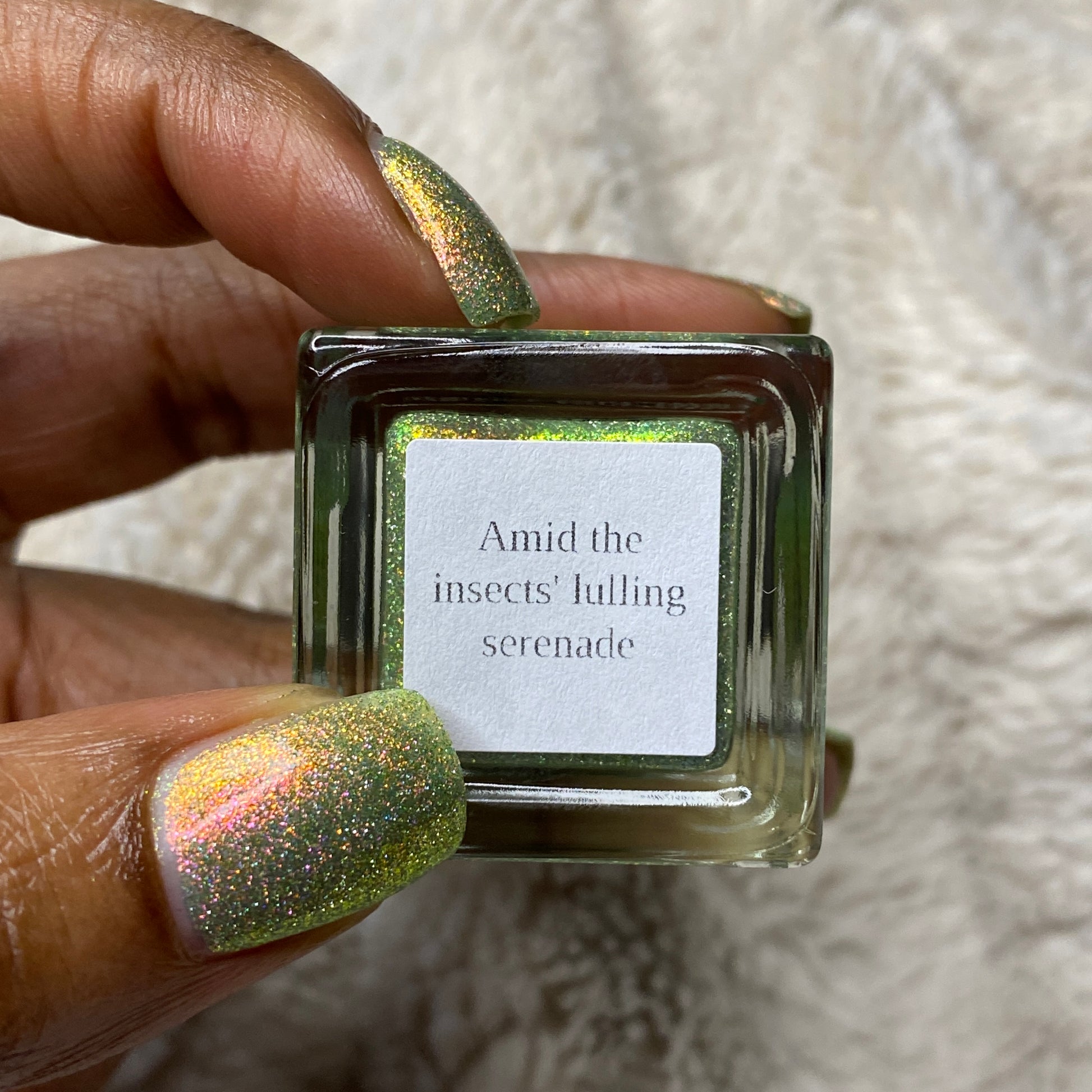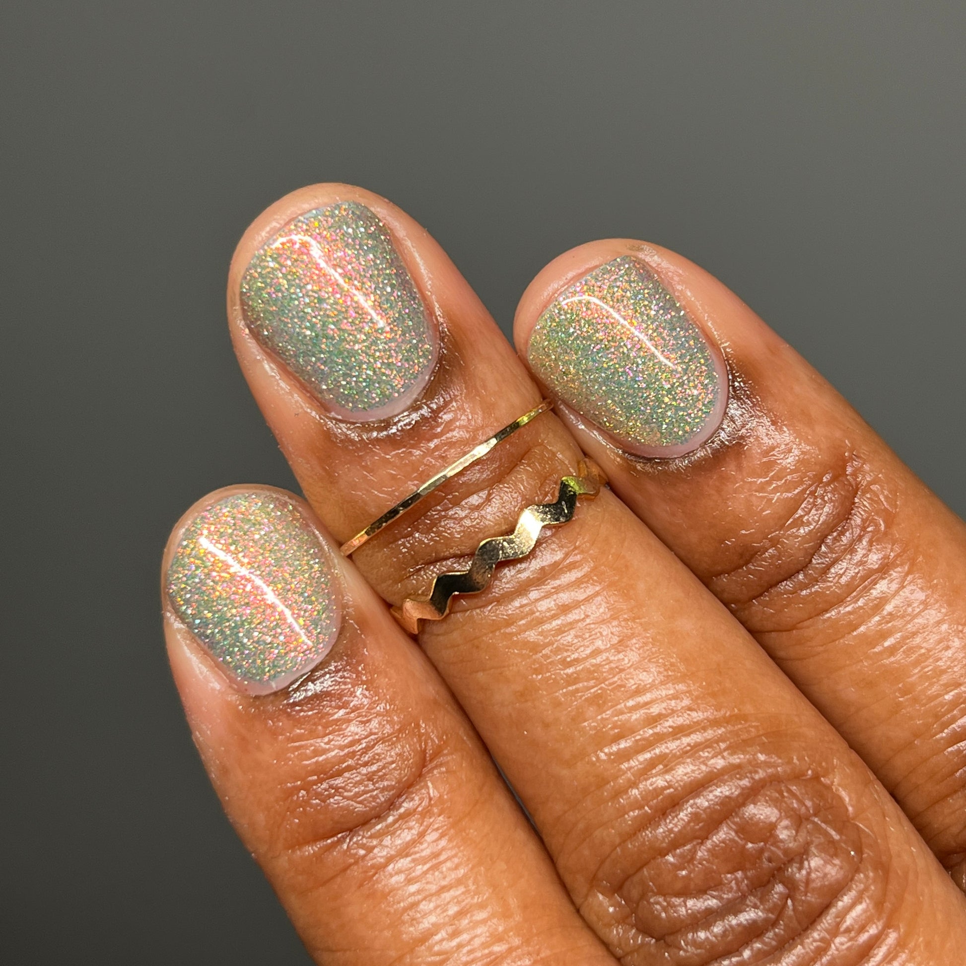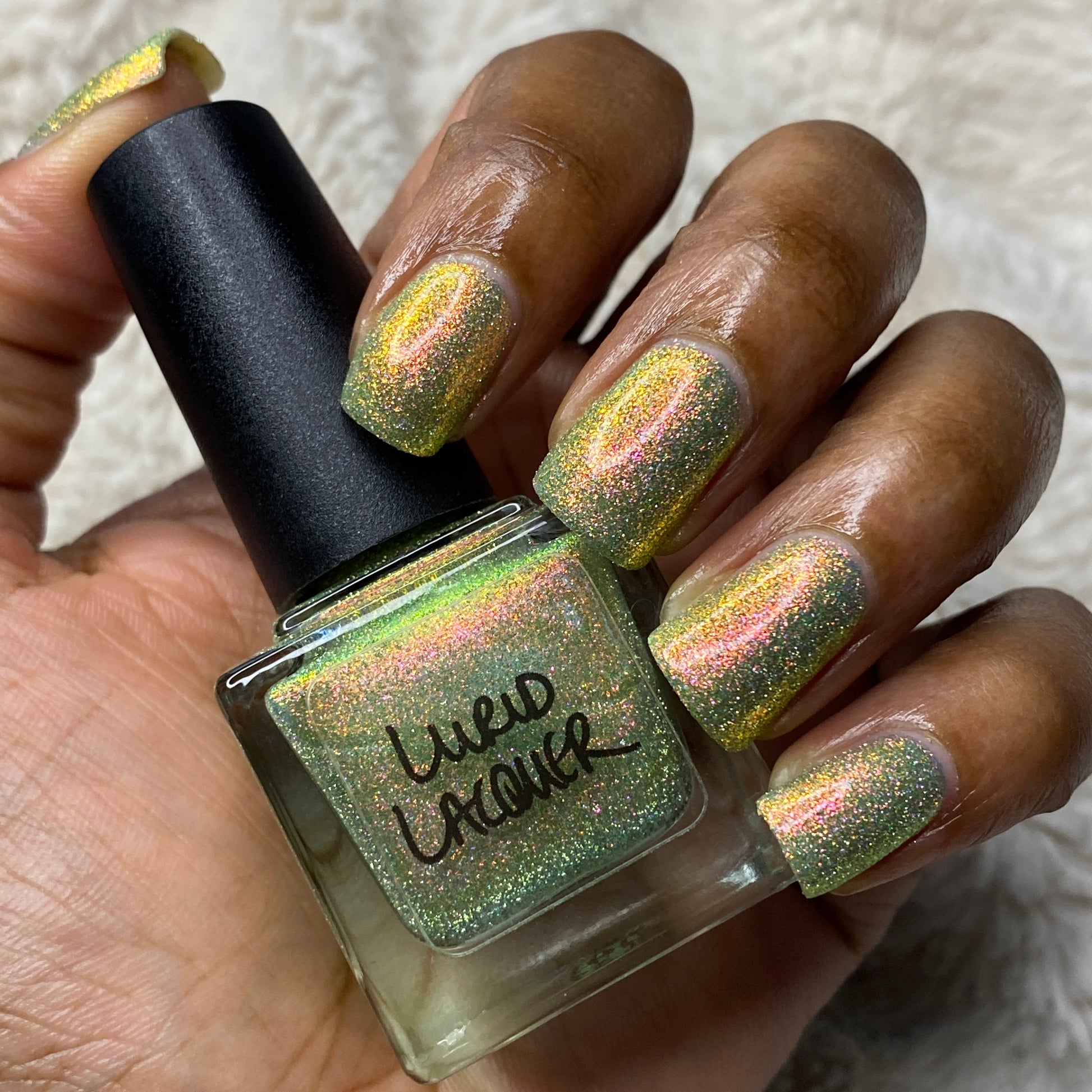 A moss green jelly base with a vibrant aurora microflake that shifts from orange to gold to green and chartreuse light reflective glitter