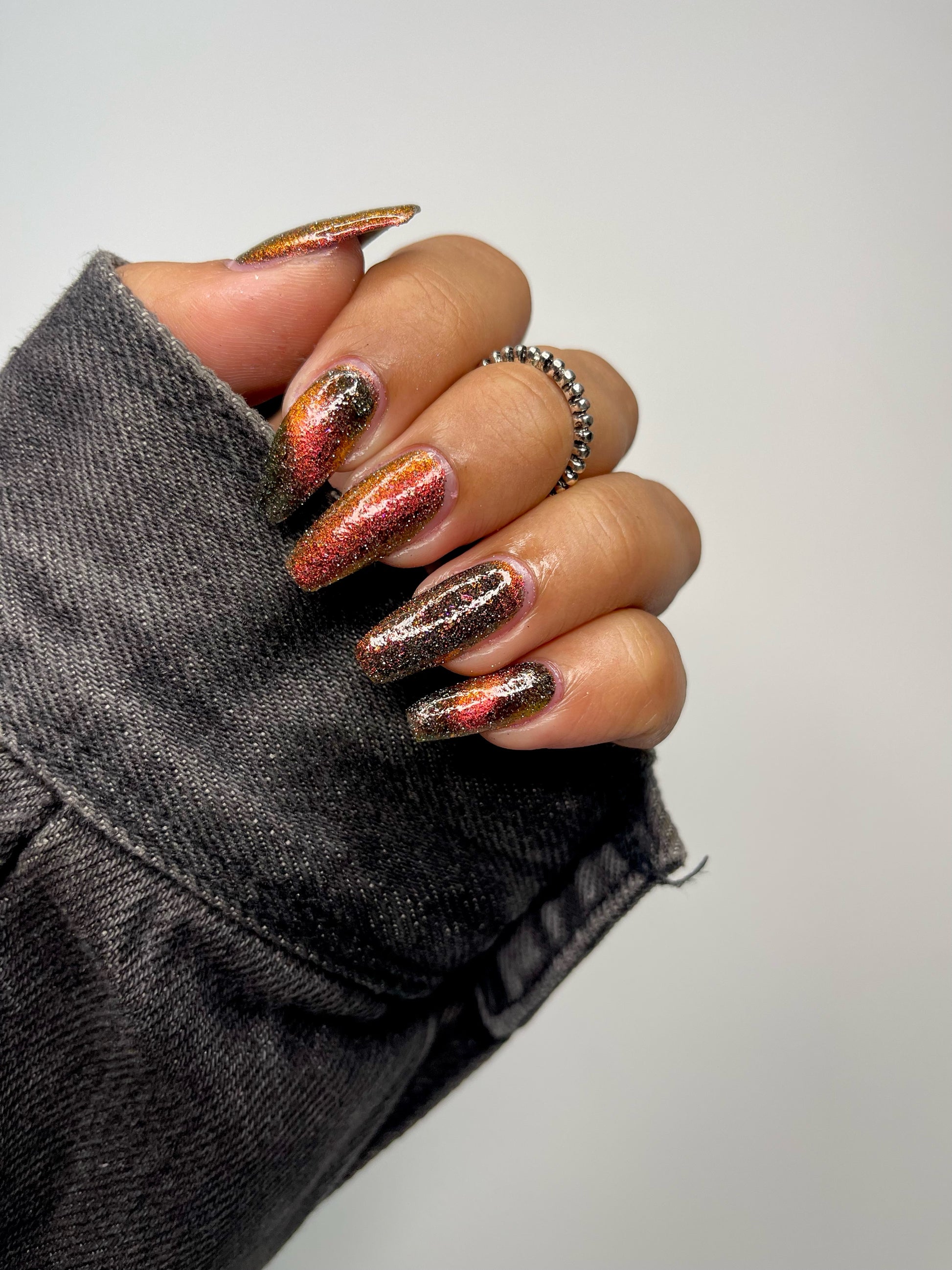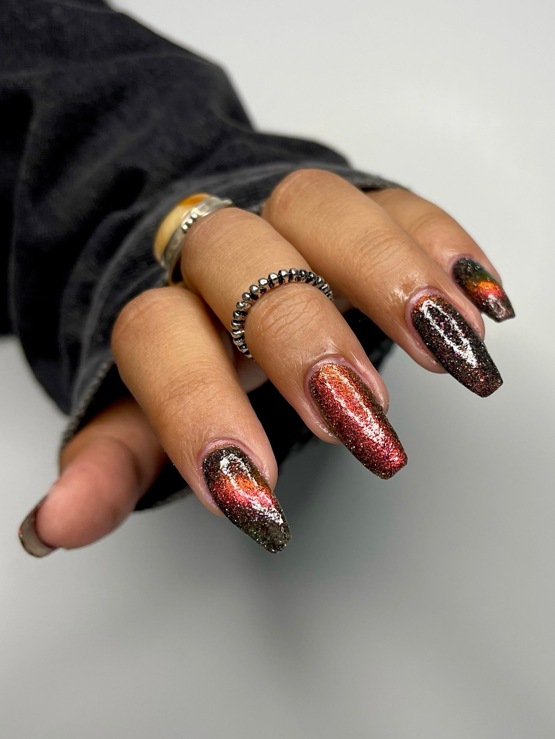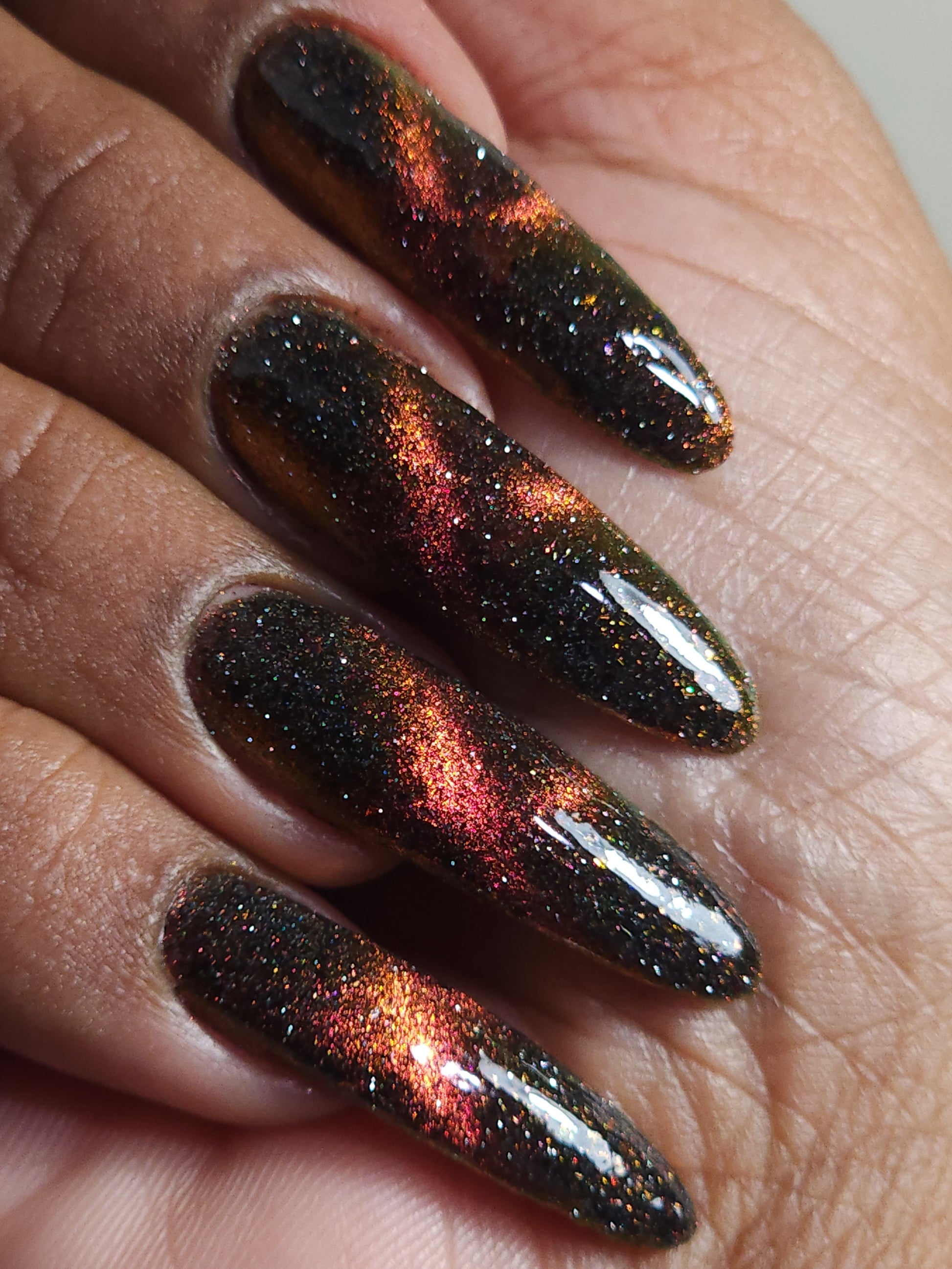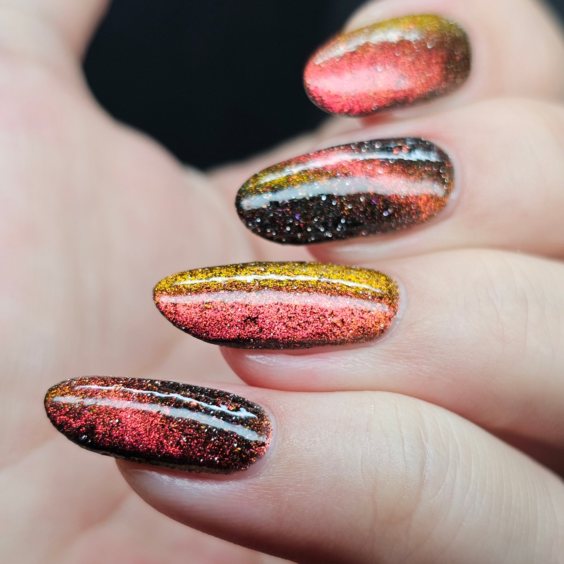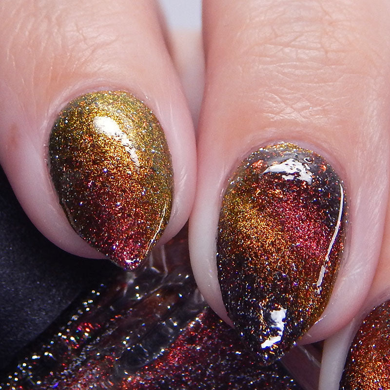 A black base with multichrome magnetic pigment that shifts from orange to gold to green, black to red to orange multichrome flakes, and silver light reflective glitter