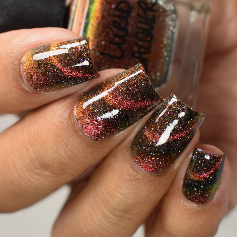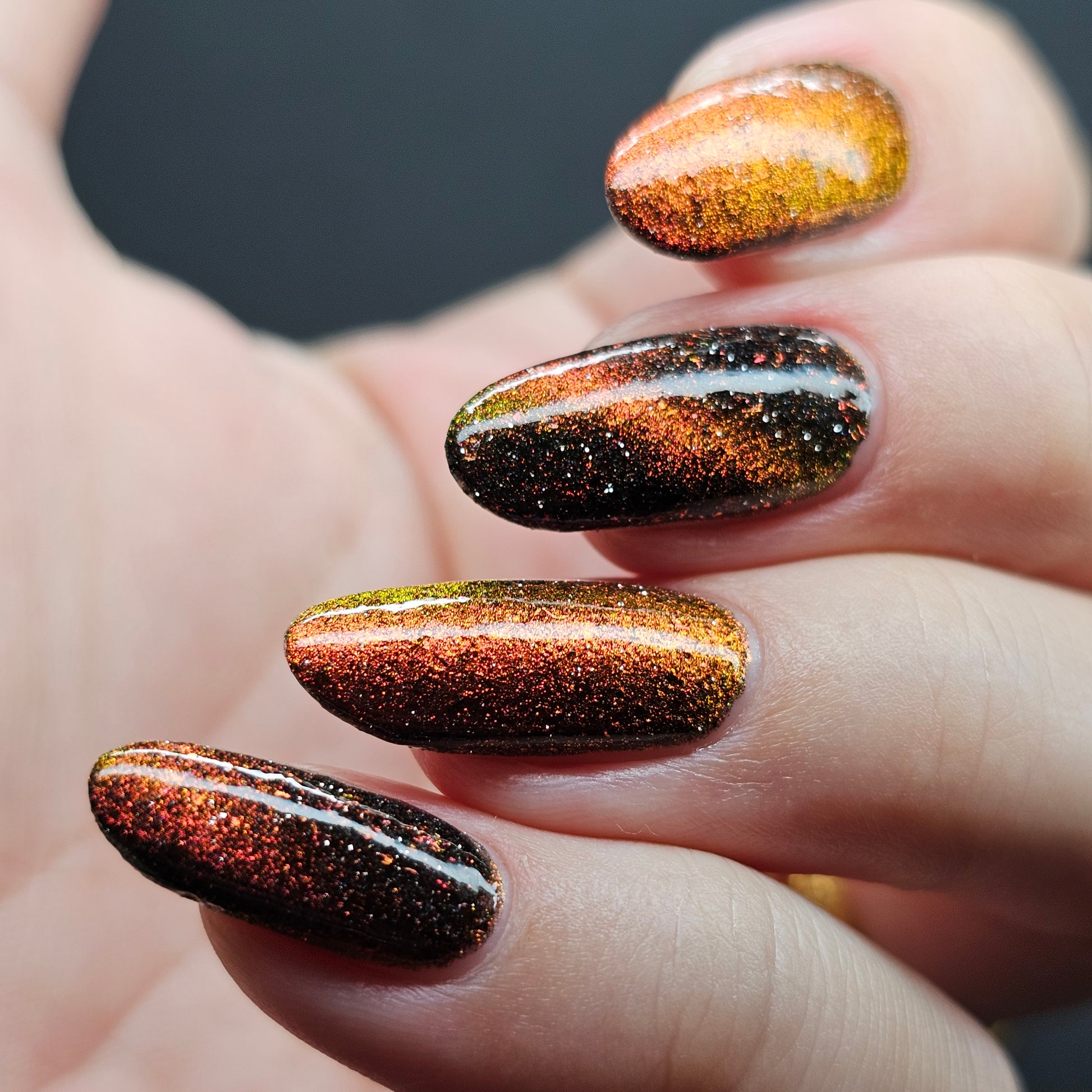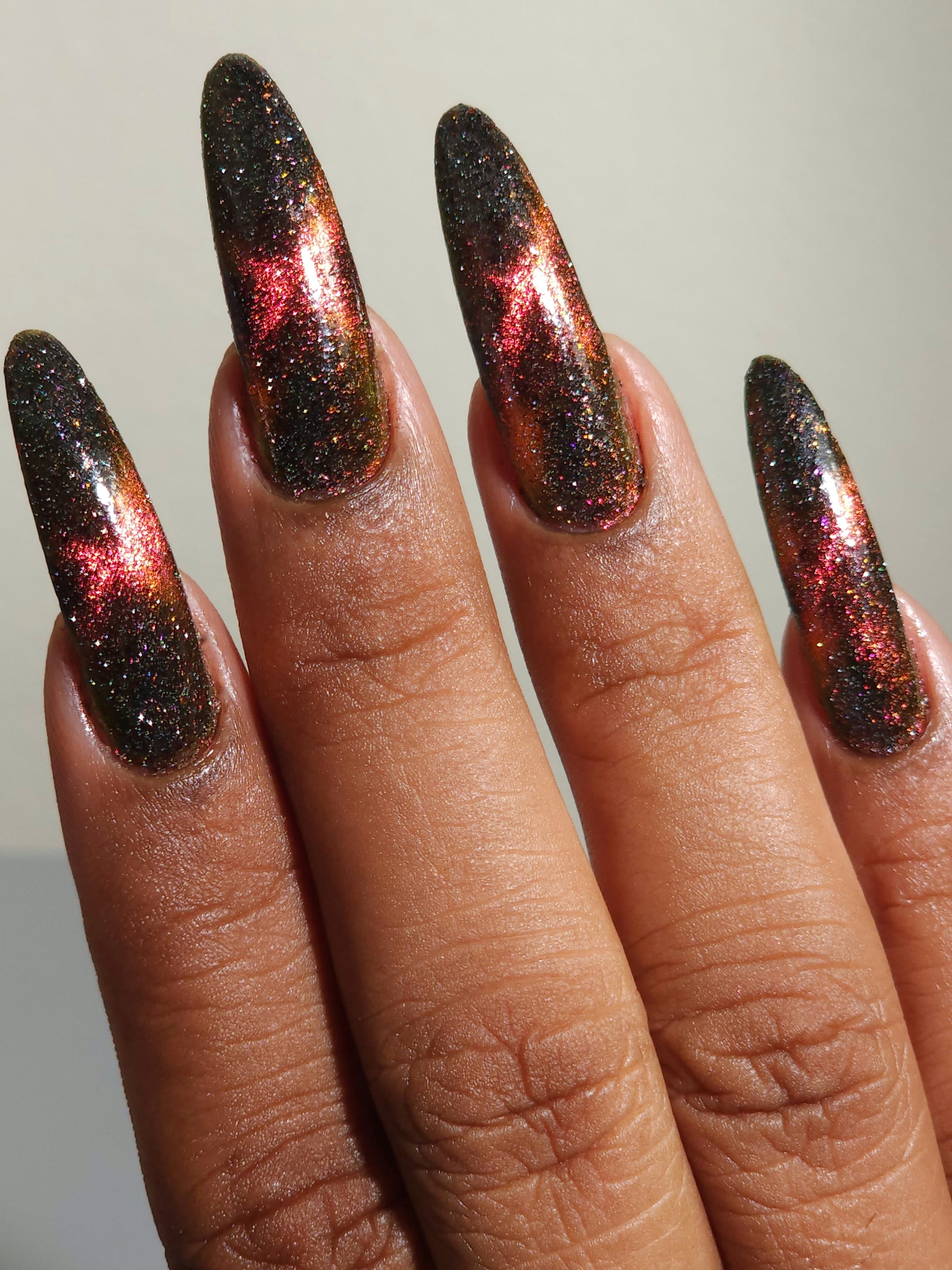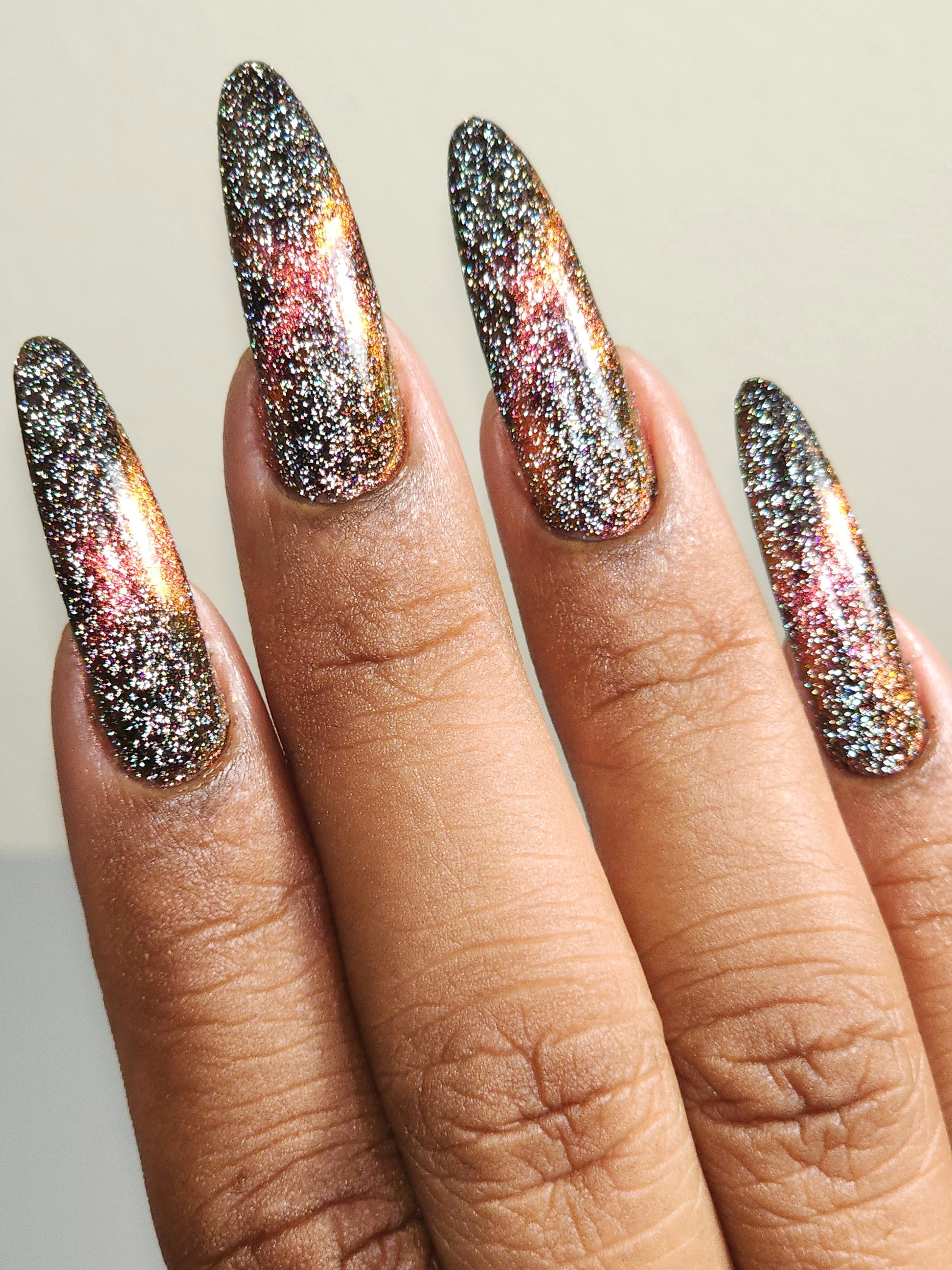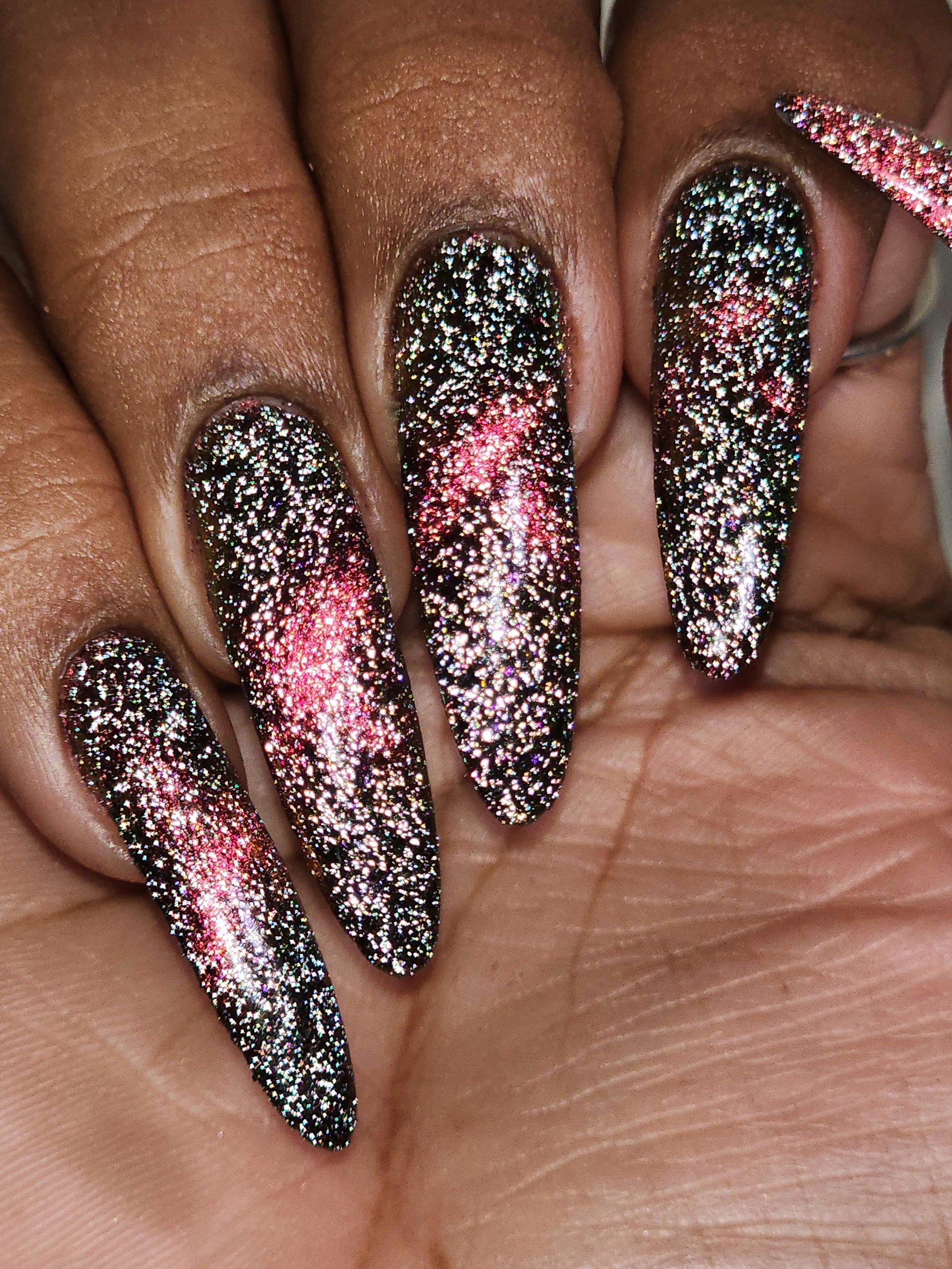 A black base with multichrome magnetic pigment that shifts from orange to gold to green, black to red to orange multichrome flakes, and silver light reflective glitter