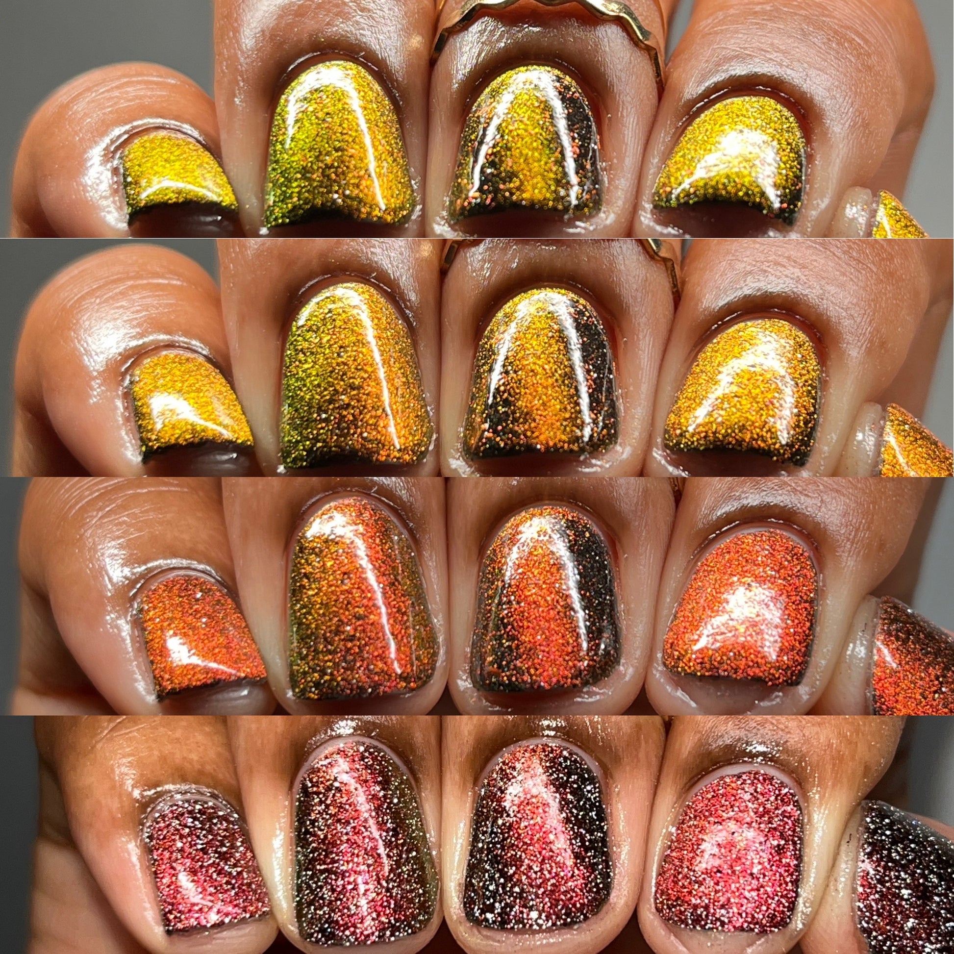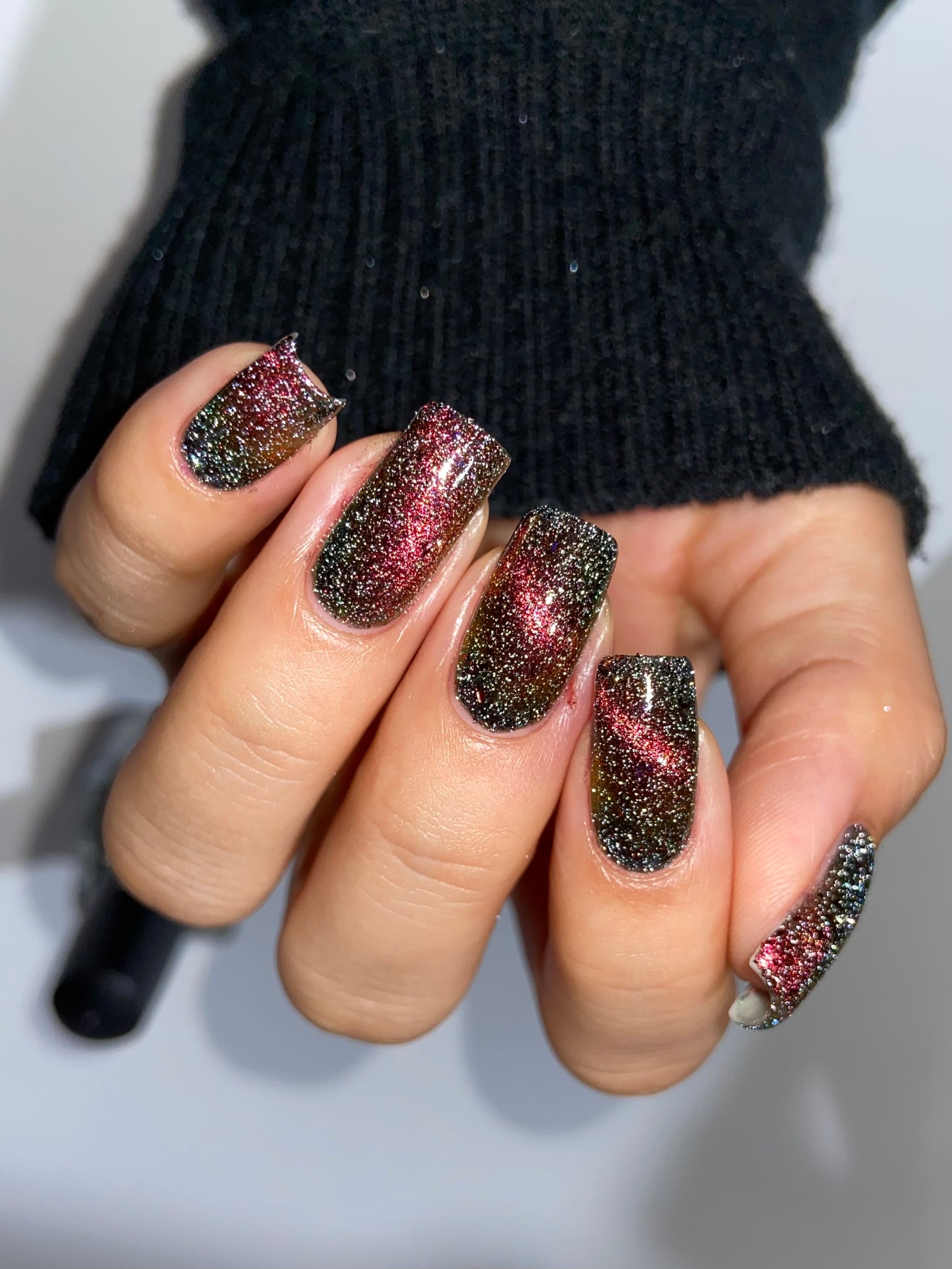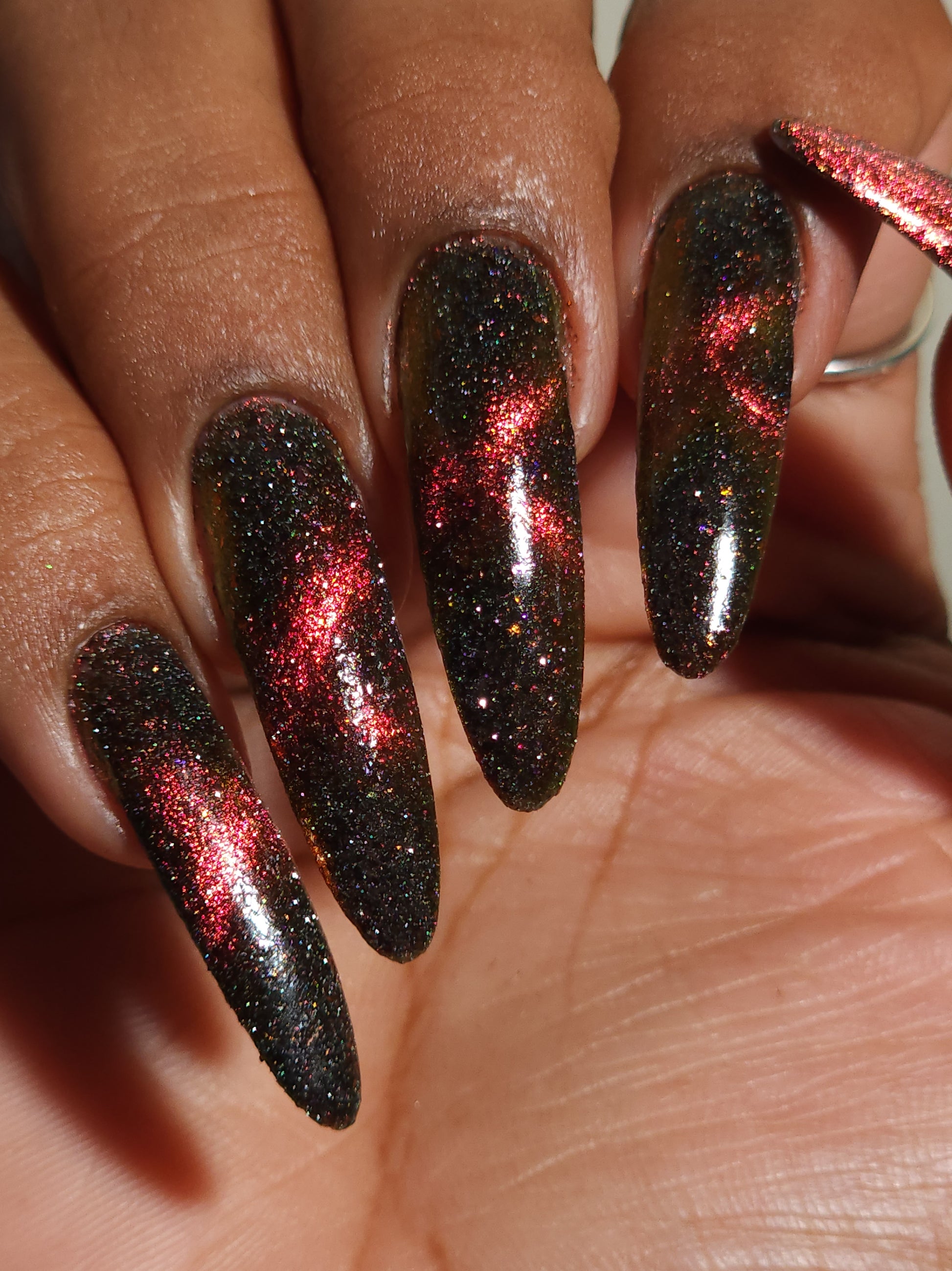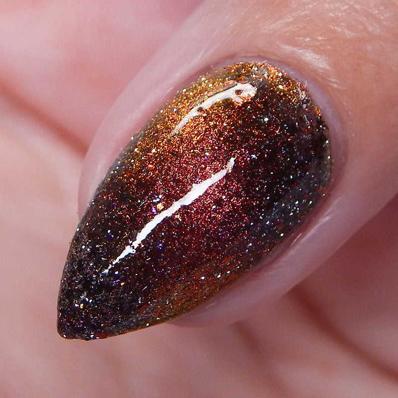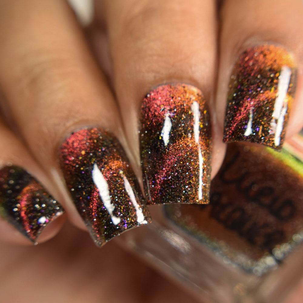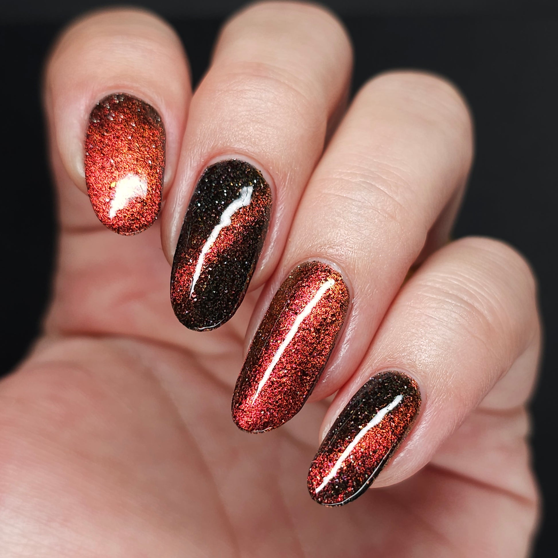 A black base with multichrome magnetic pigment that shifts from orange to gold to green, black to red to orange multichrome flakes, and silver light reflective glitter
