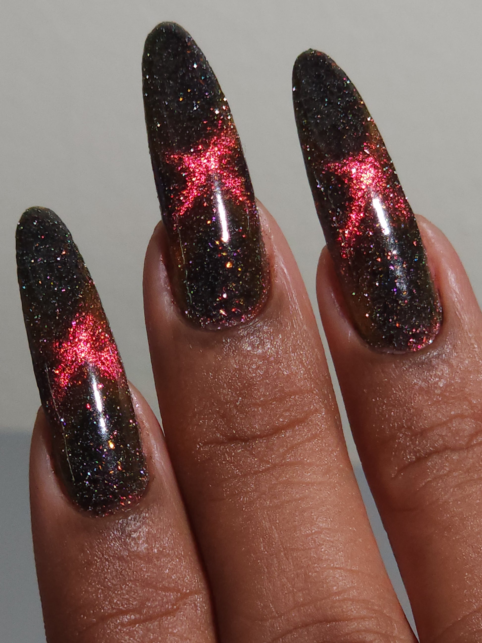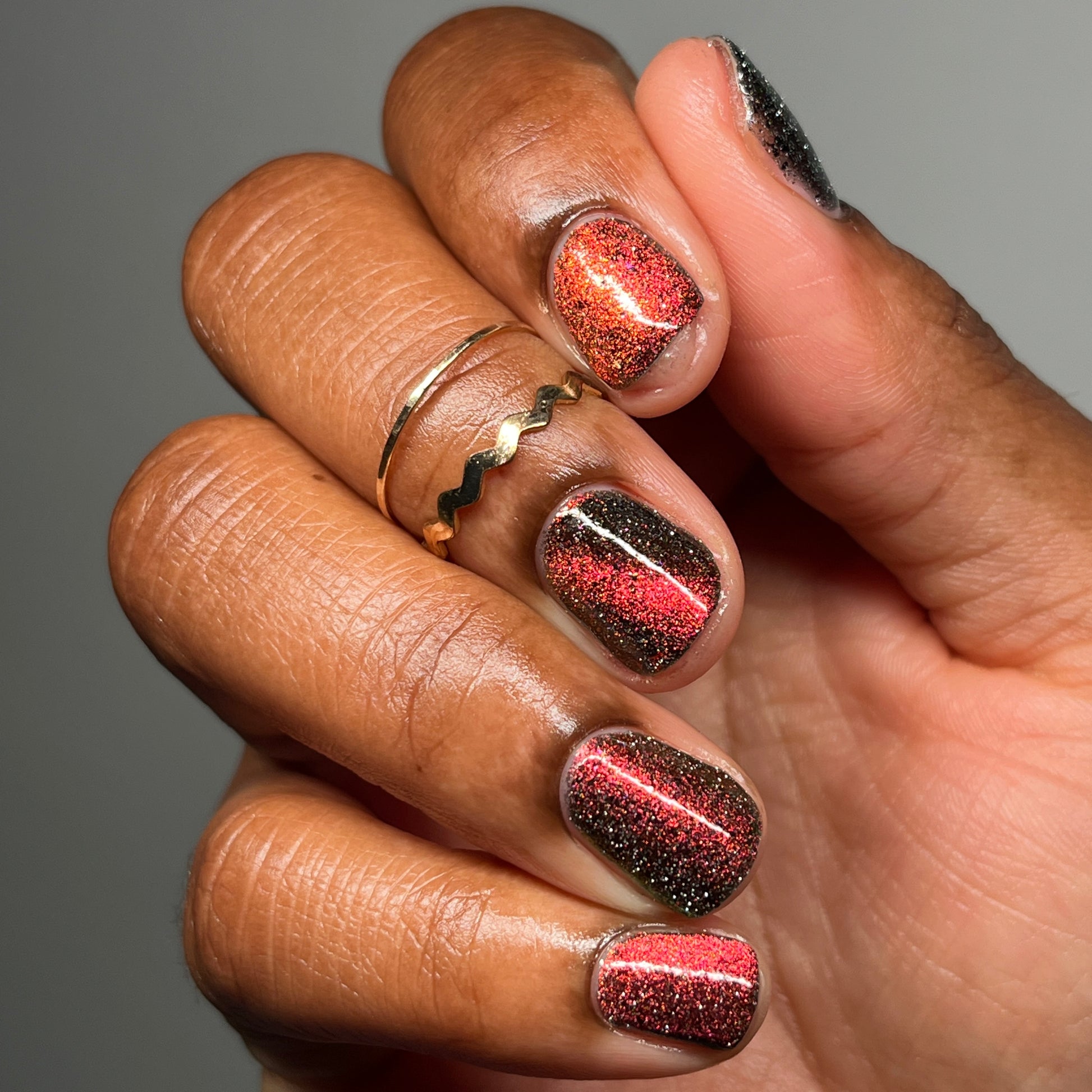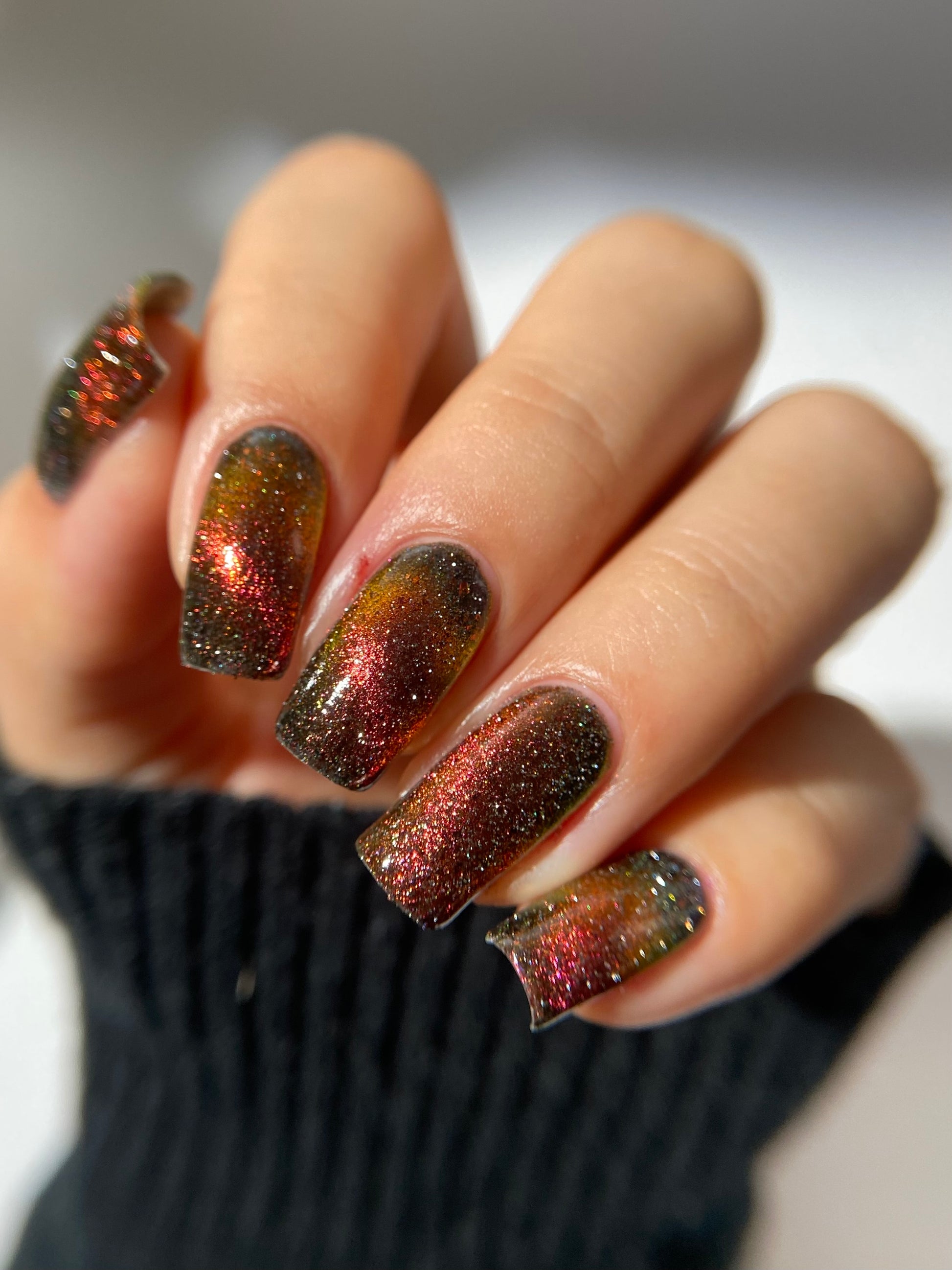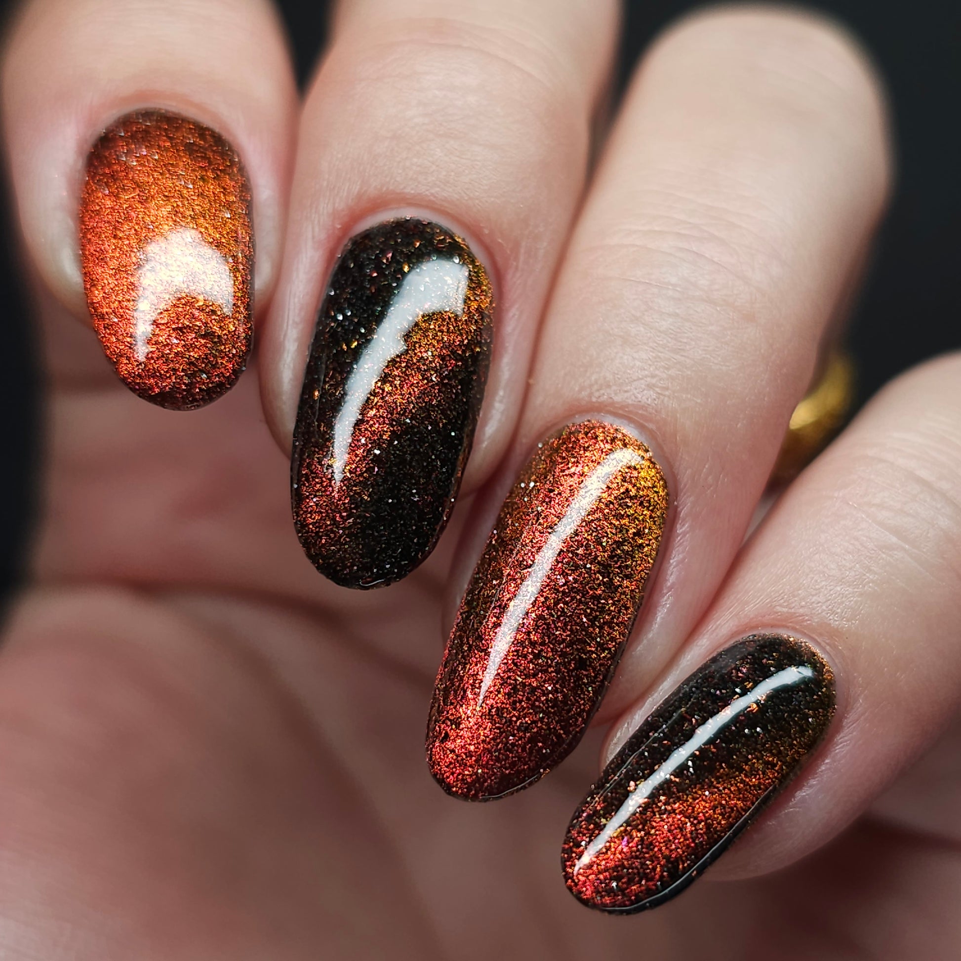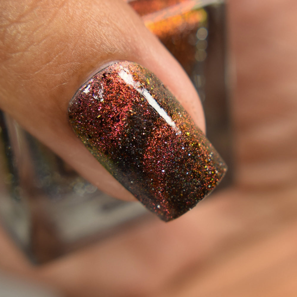 A black base with multichrome magnetic pigment that shifts from orange to gold to green, black to red to orange multichrome flakes, and silver light reflective glitter
