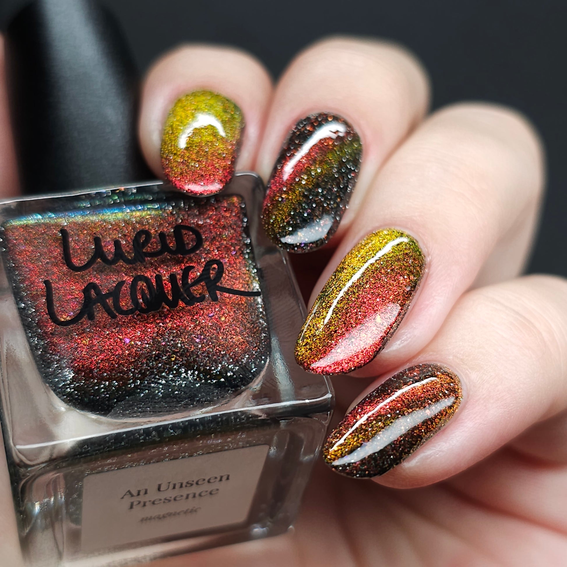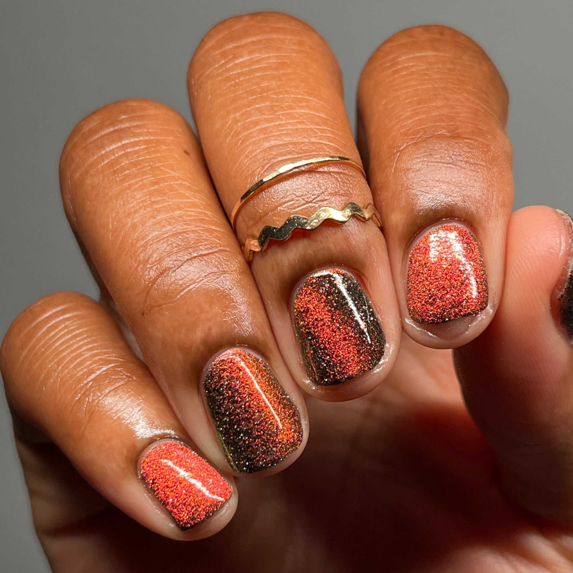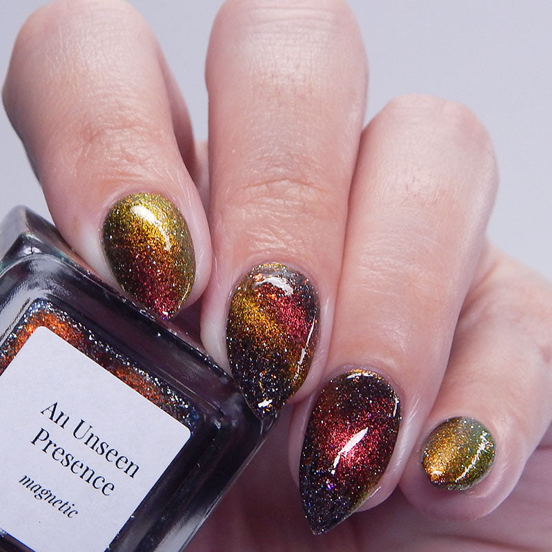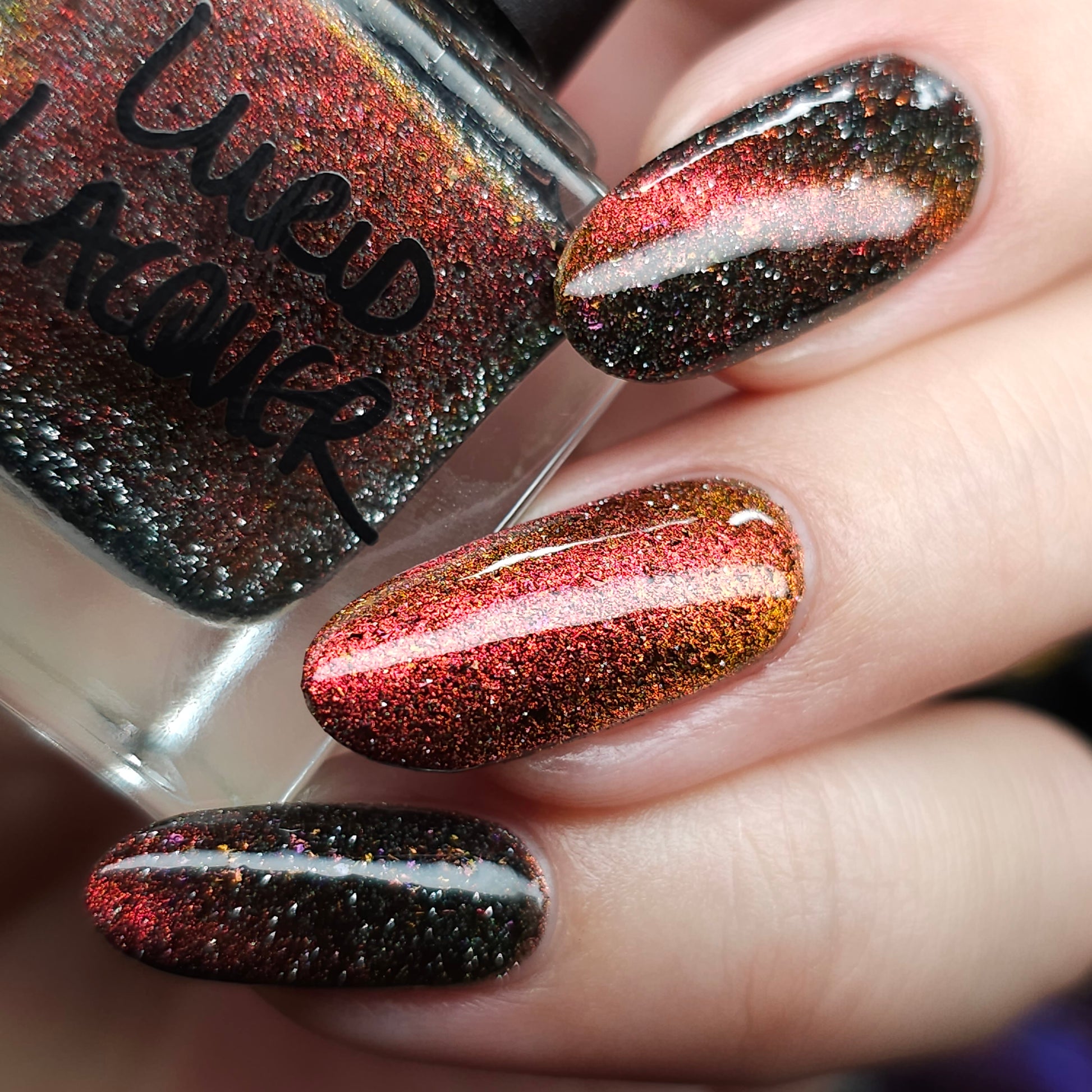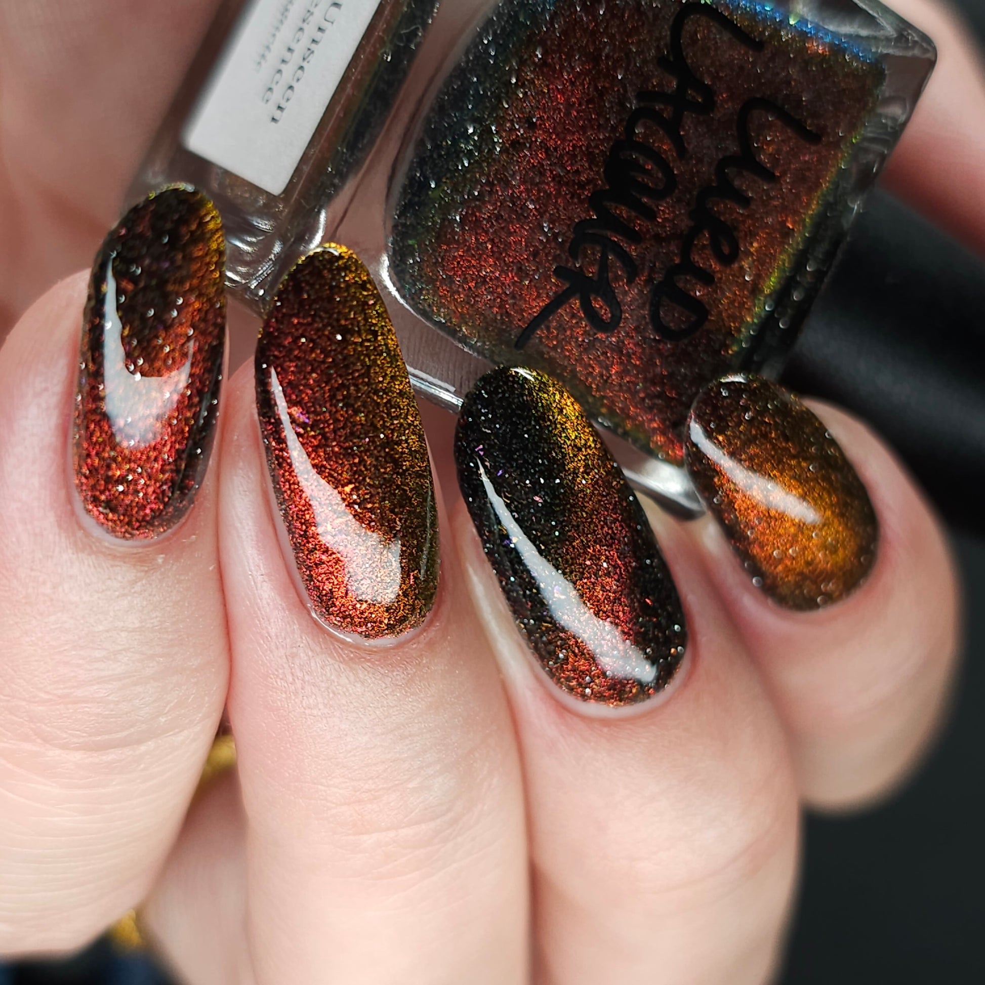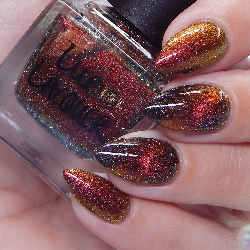 A black base with multichrome magnetic pigment that shifts from orange to gold to green, black to red to orange multichrome flakes, and silver light reflective glitter