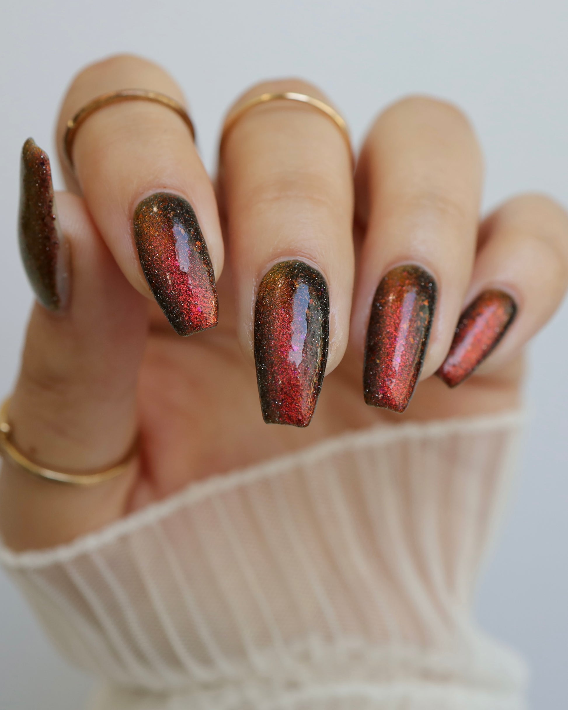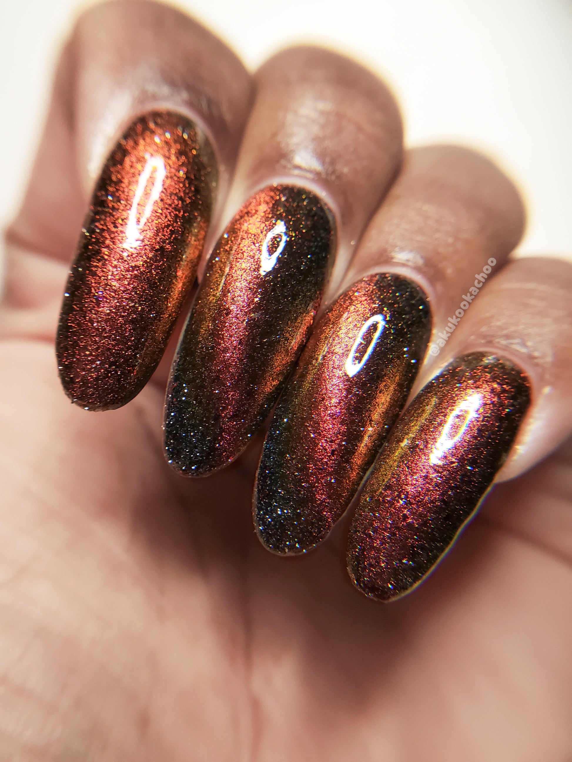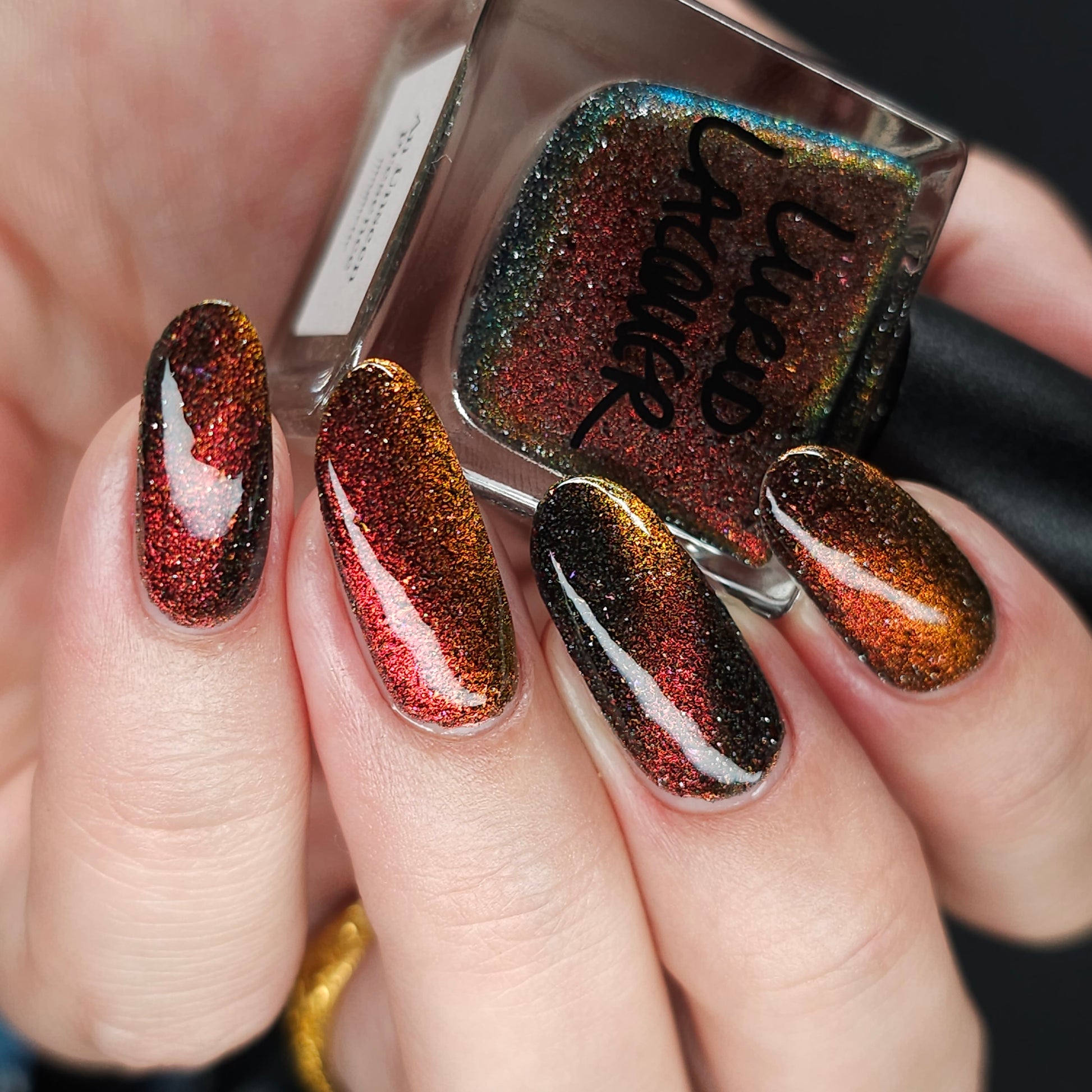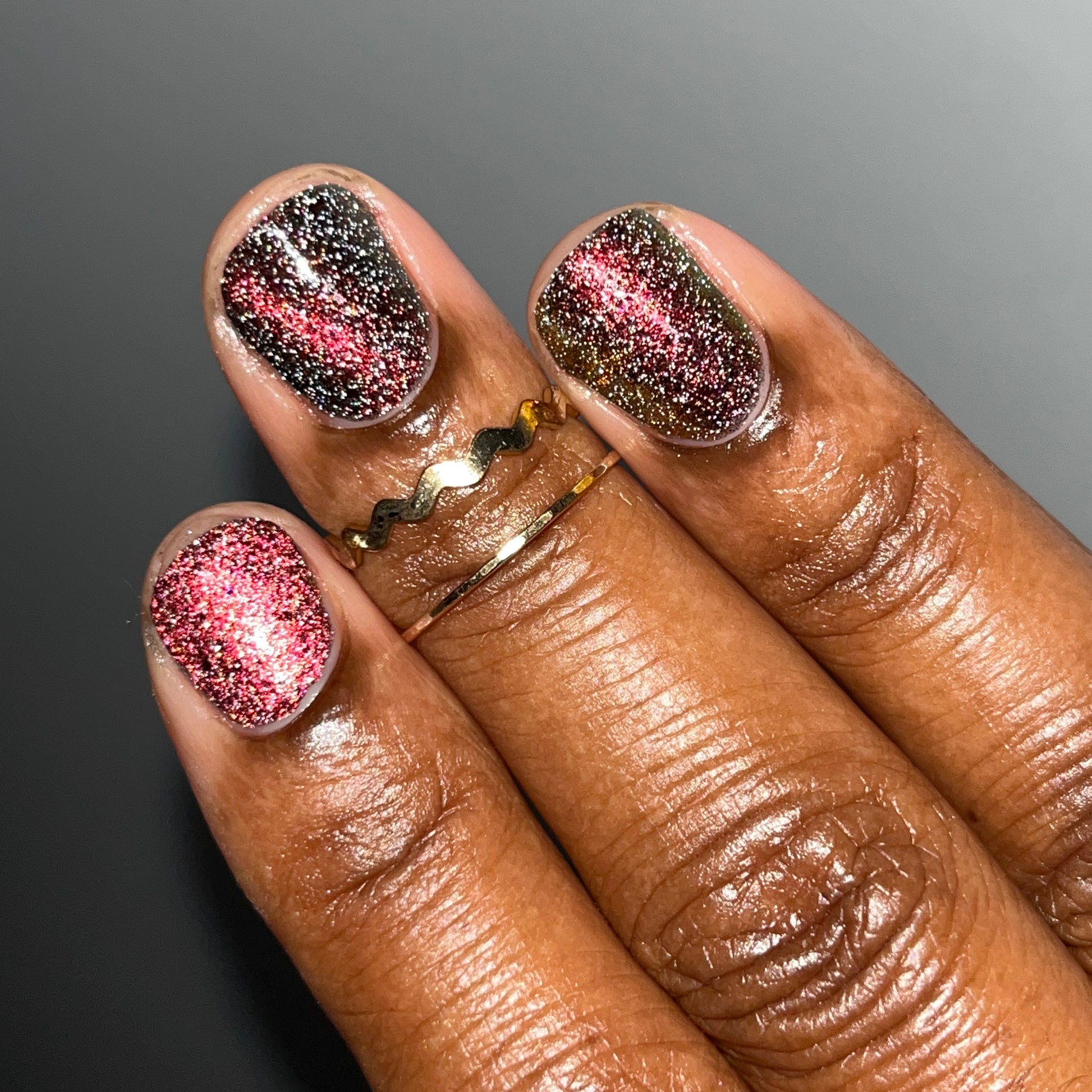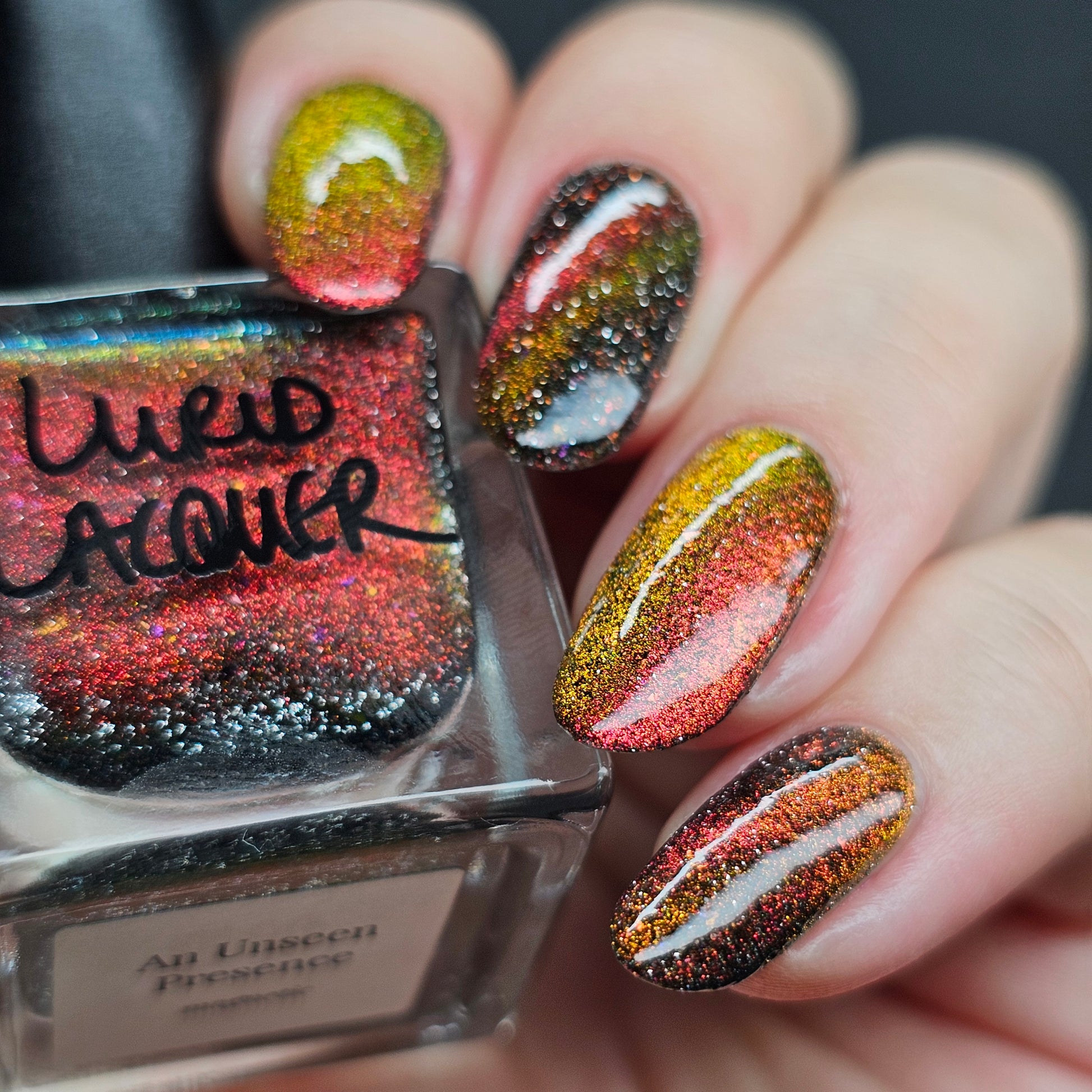 A black base with multichrome magnetic pigment that shifts from orange to gold to green, black to red to orange multichrome flakes, and silver light reflective glitter