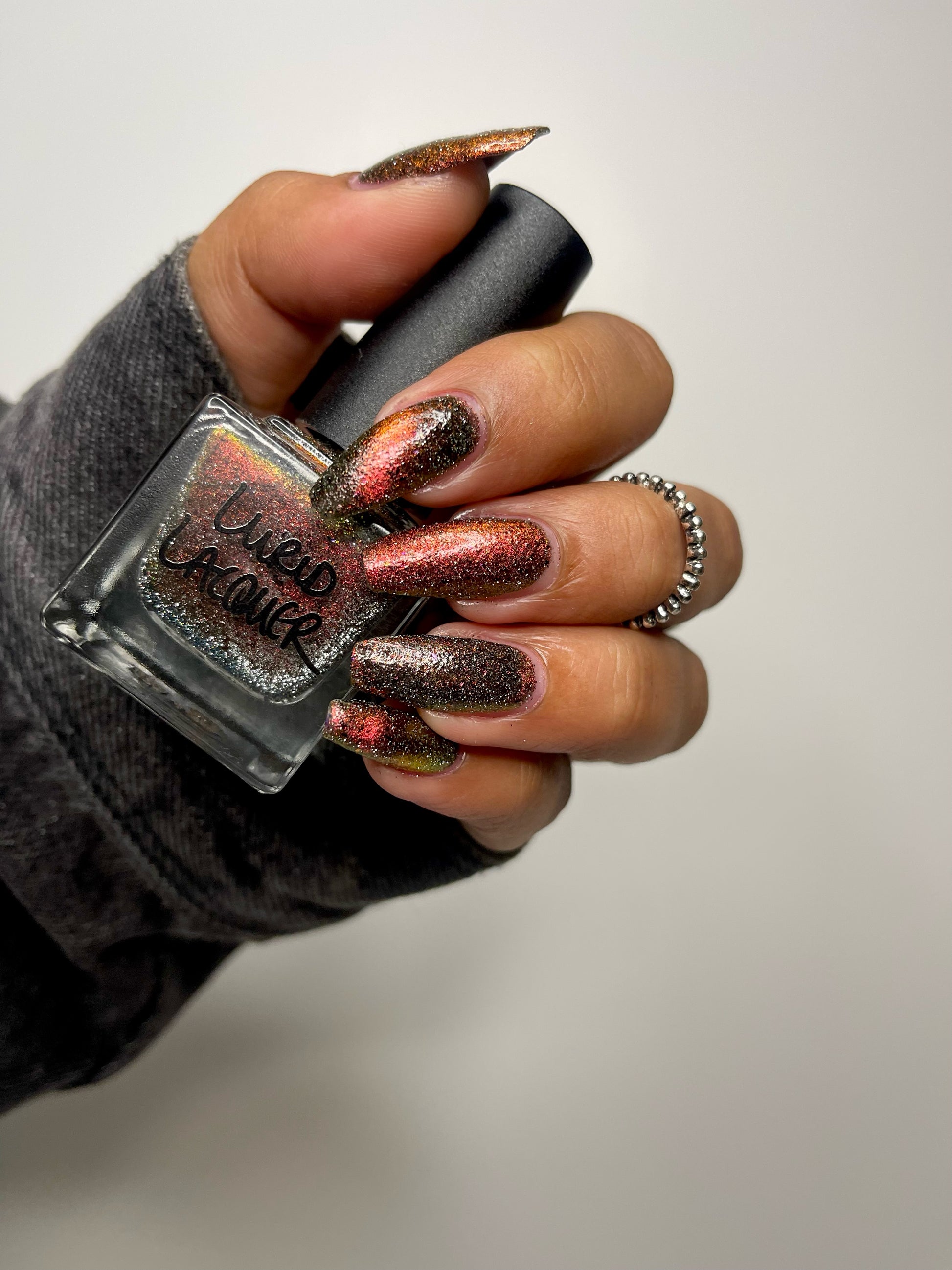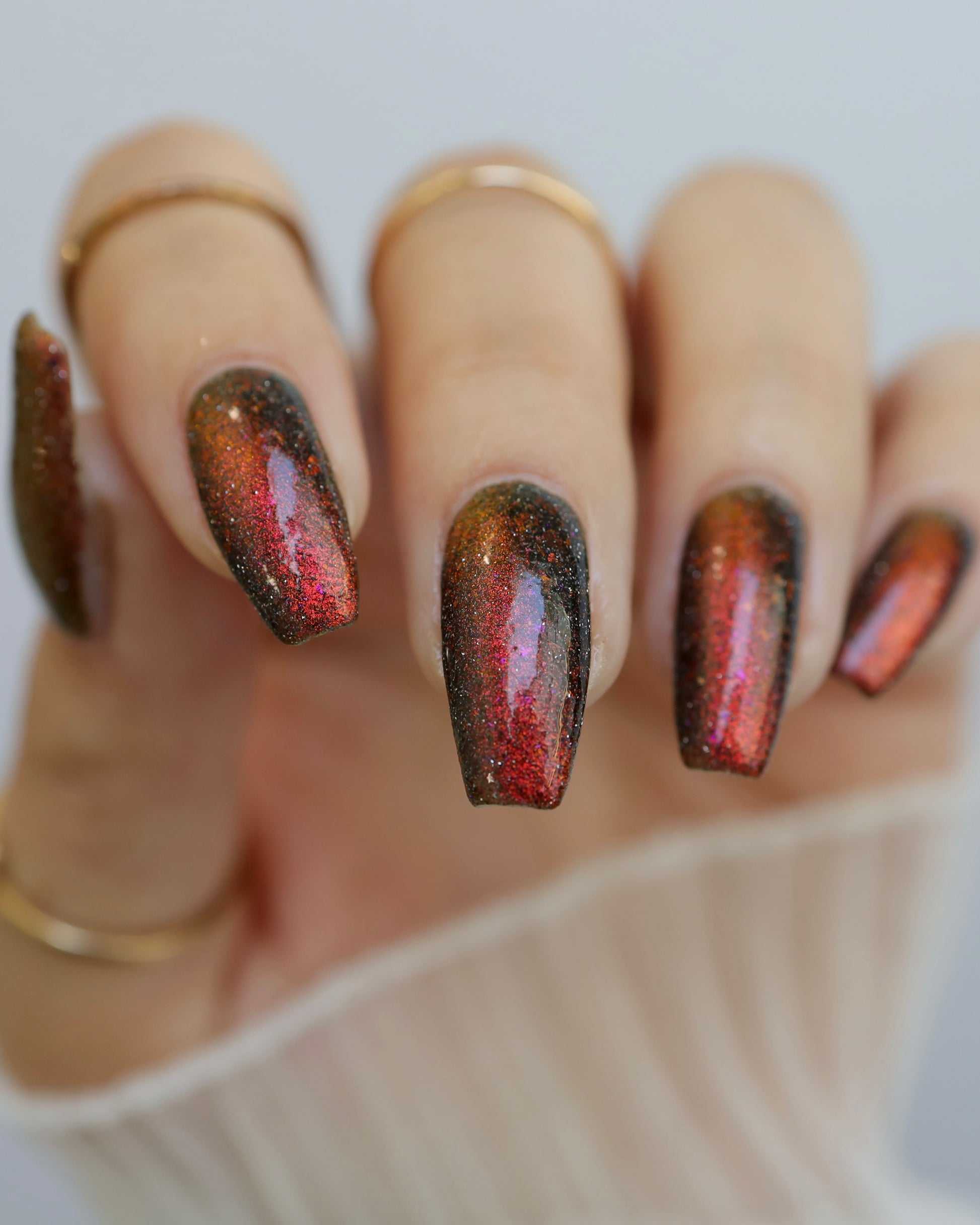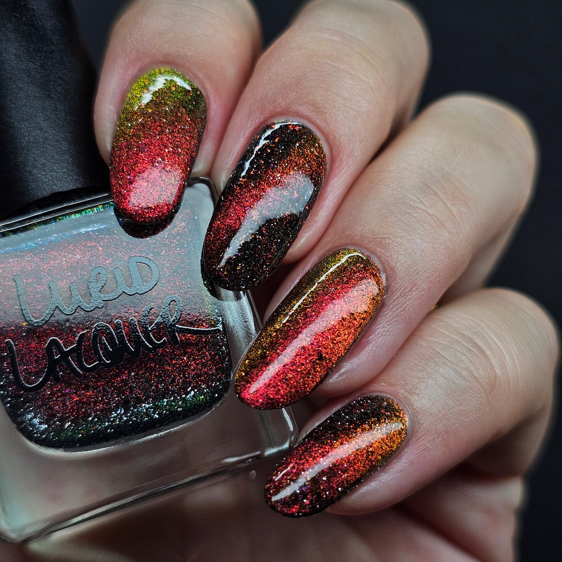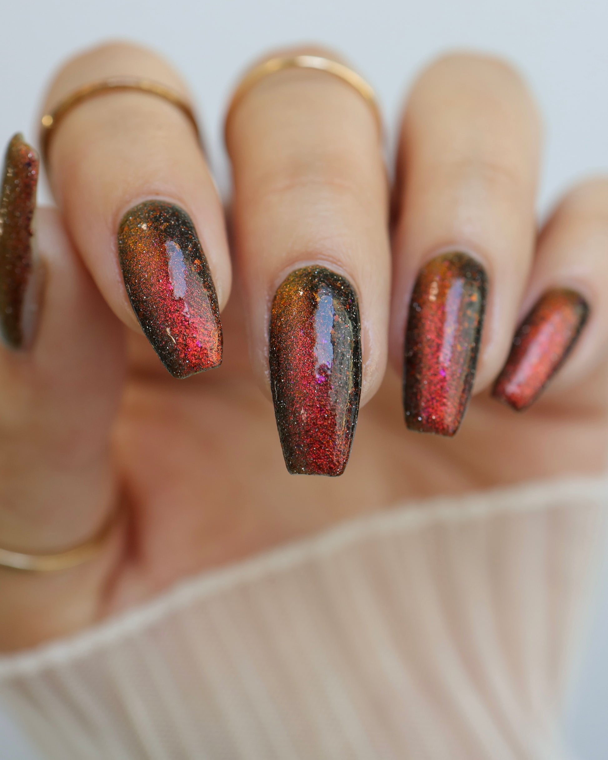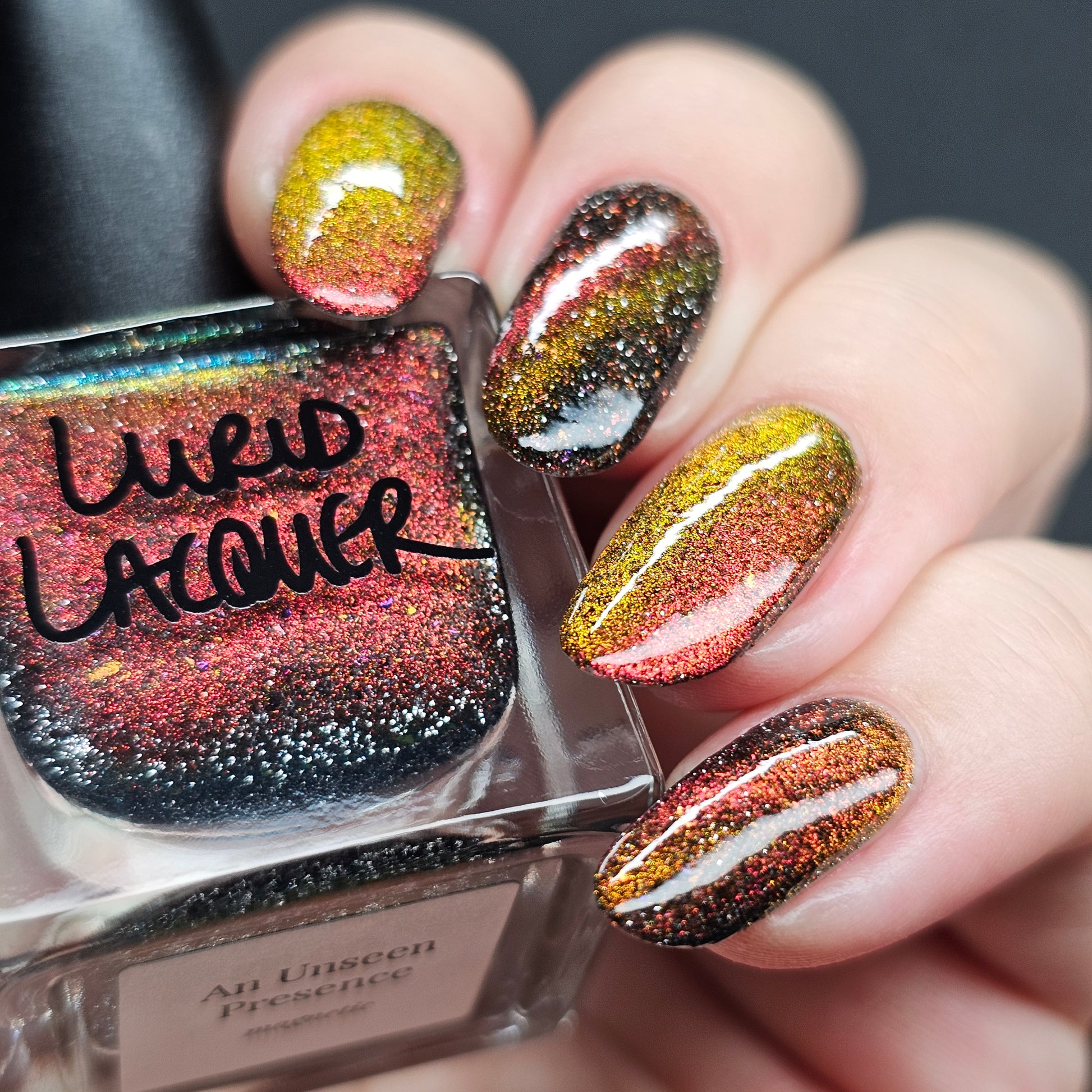 A black base with multichrome magnetic pigment that shifts from orange to gold to green, black to red to orange multichrome flakes, and silver light reflective glitter