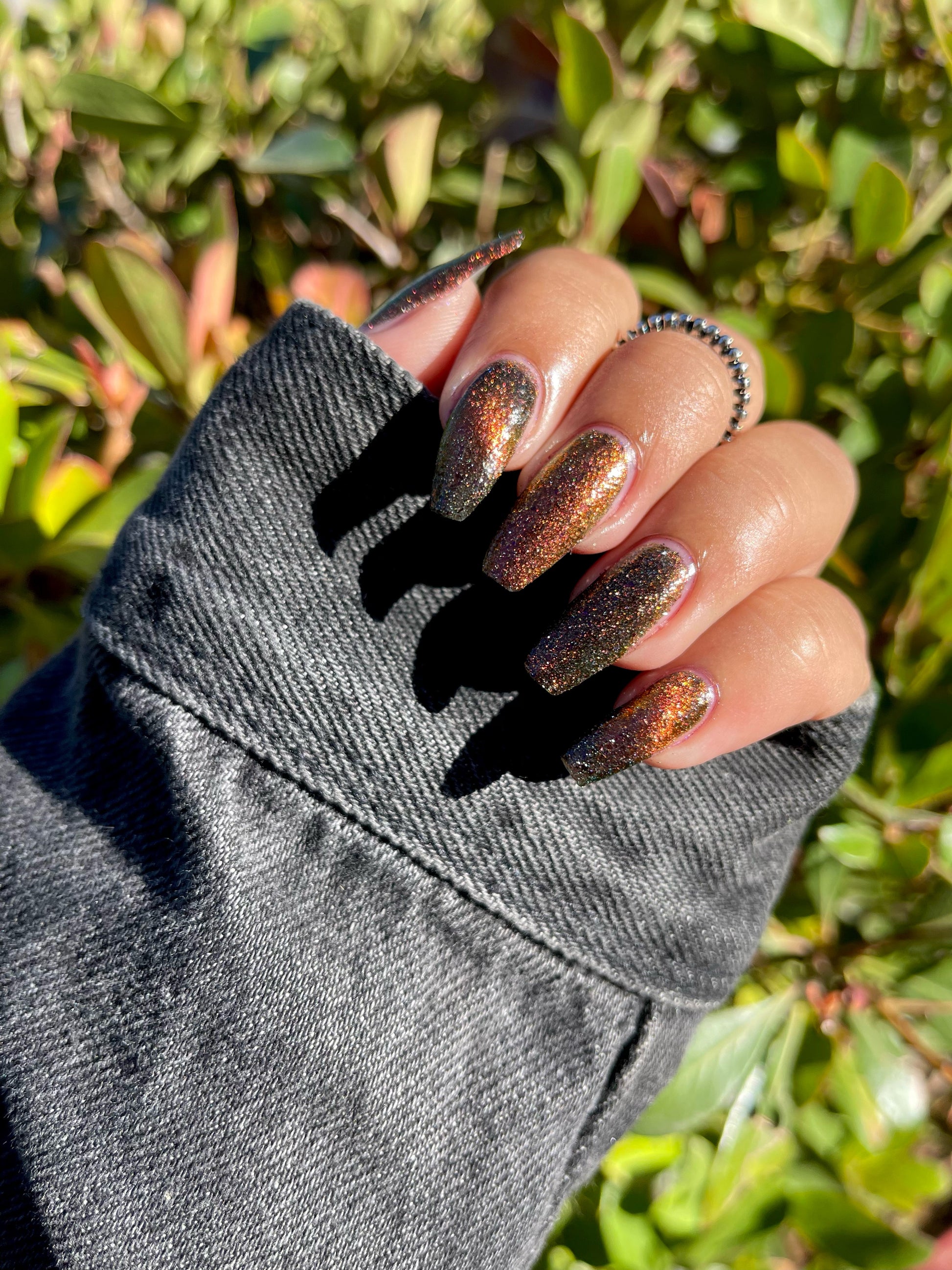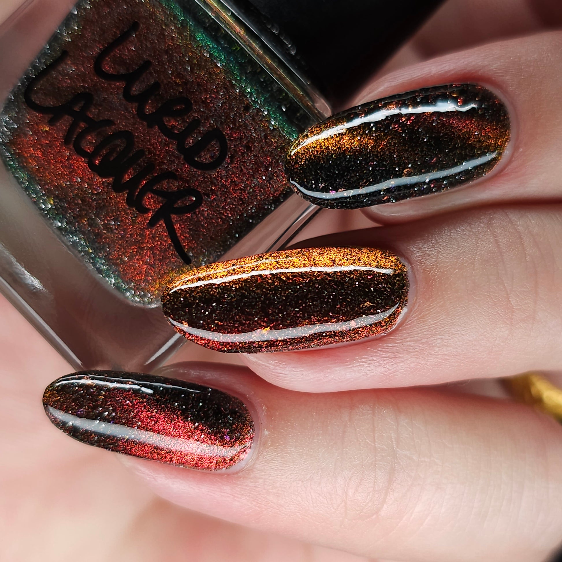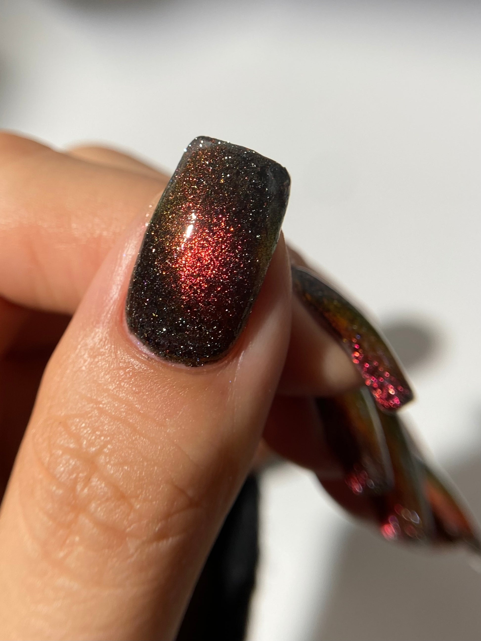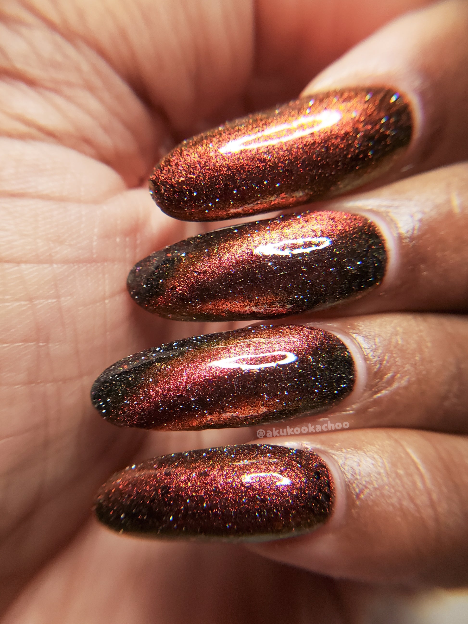 A black base with multichrome magnetic pigment that shifts from orange to gold to green, black to red to orange multichrome flakes, and silver light reflective glitter