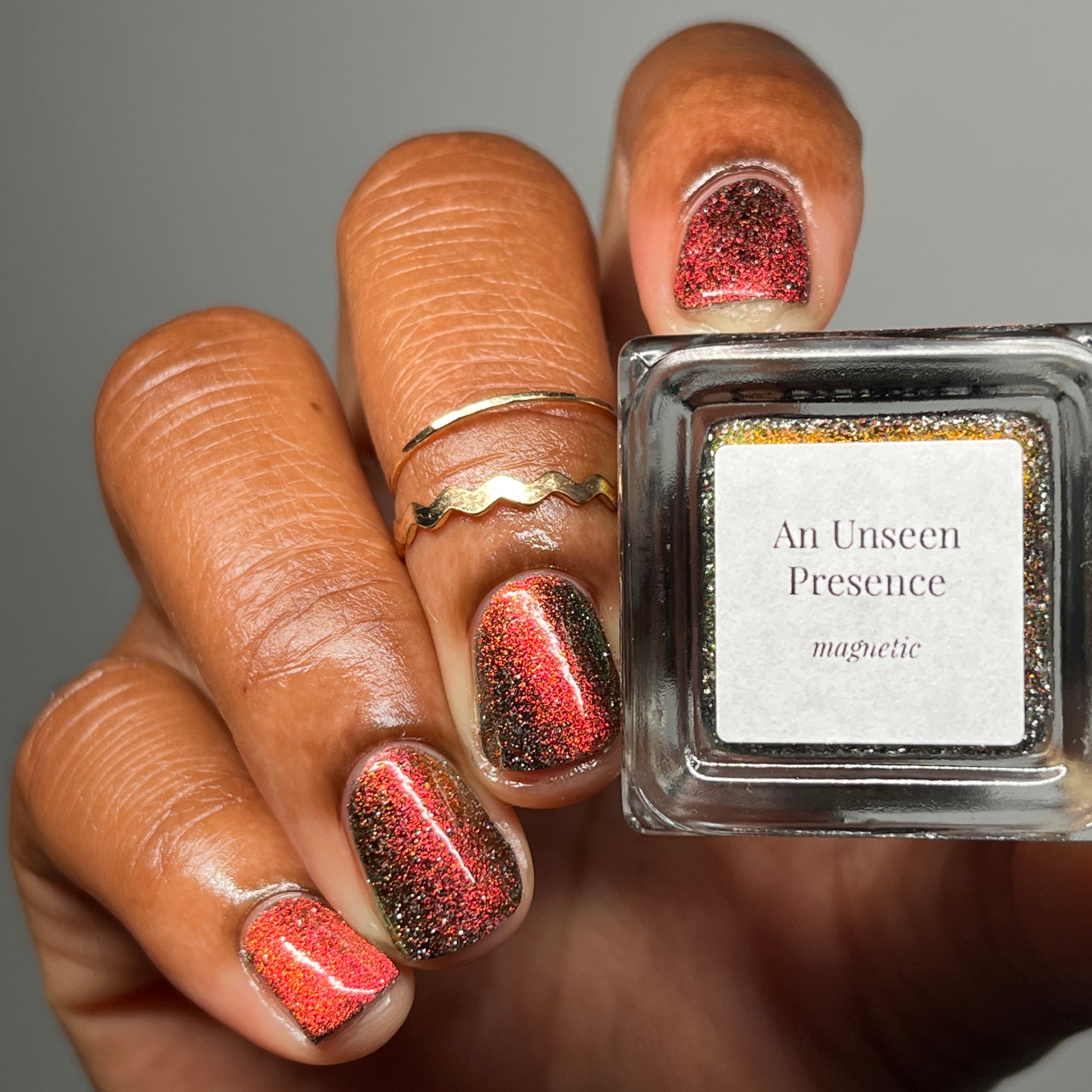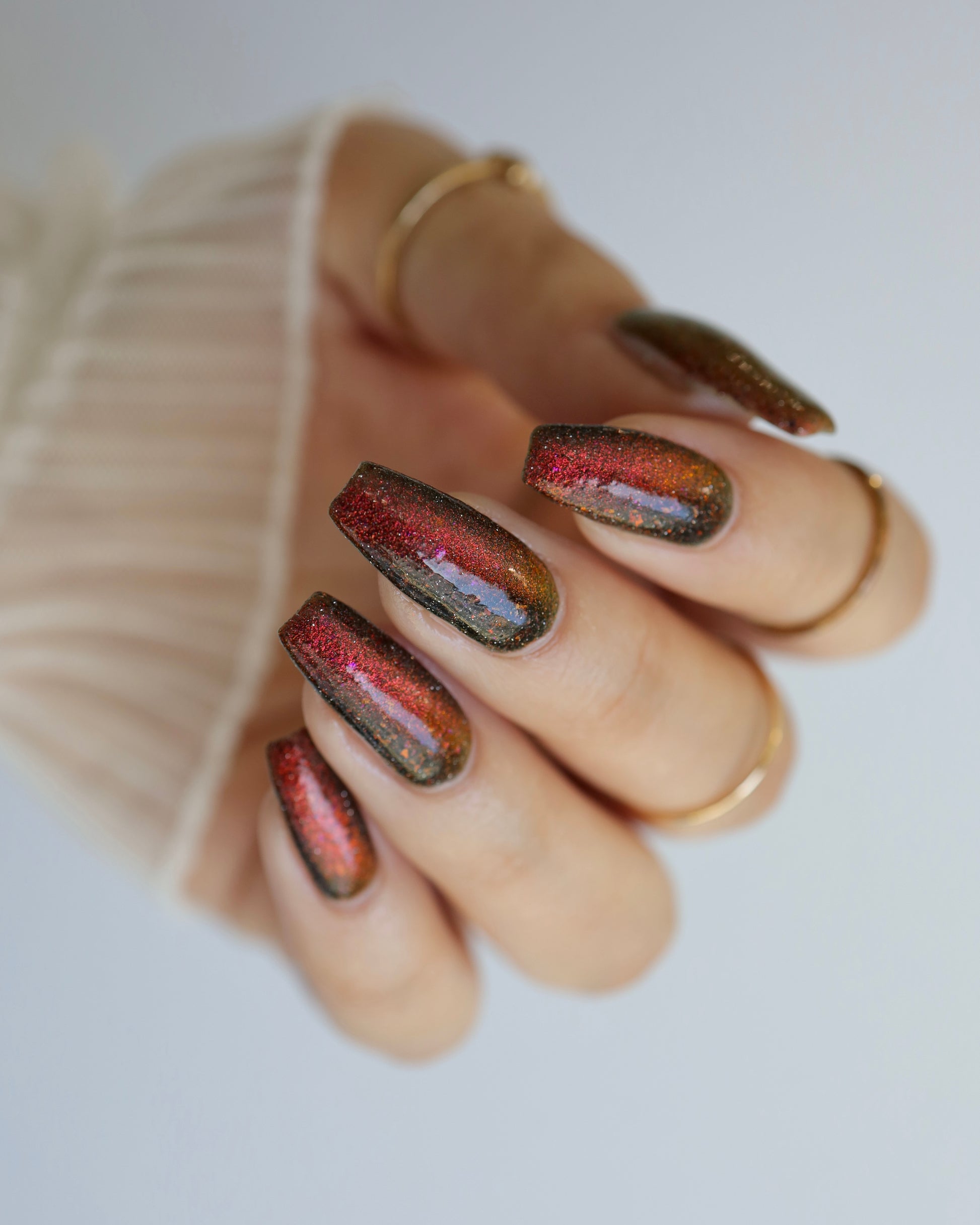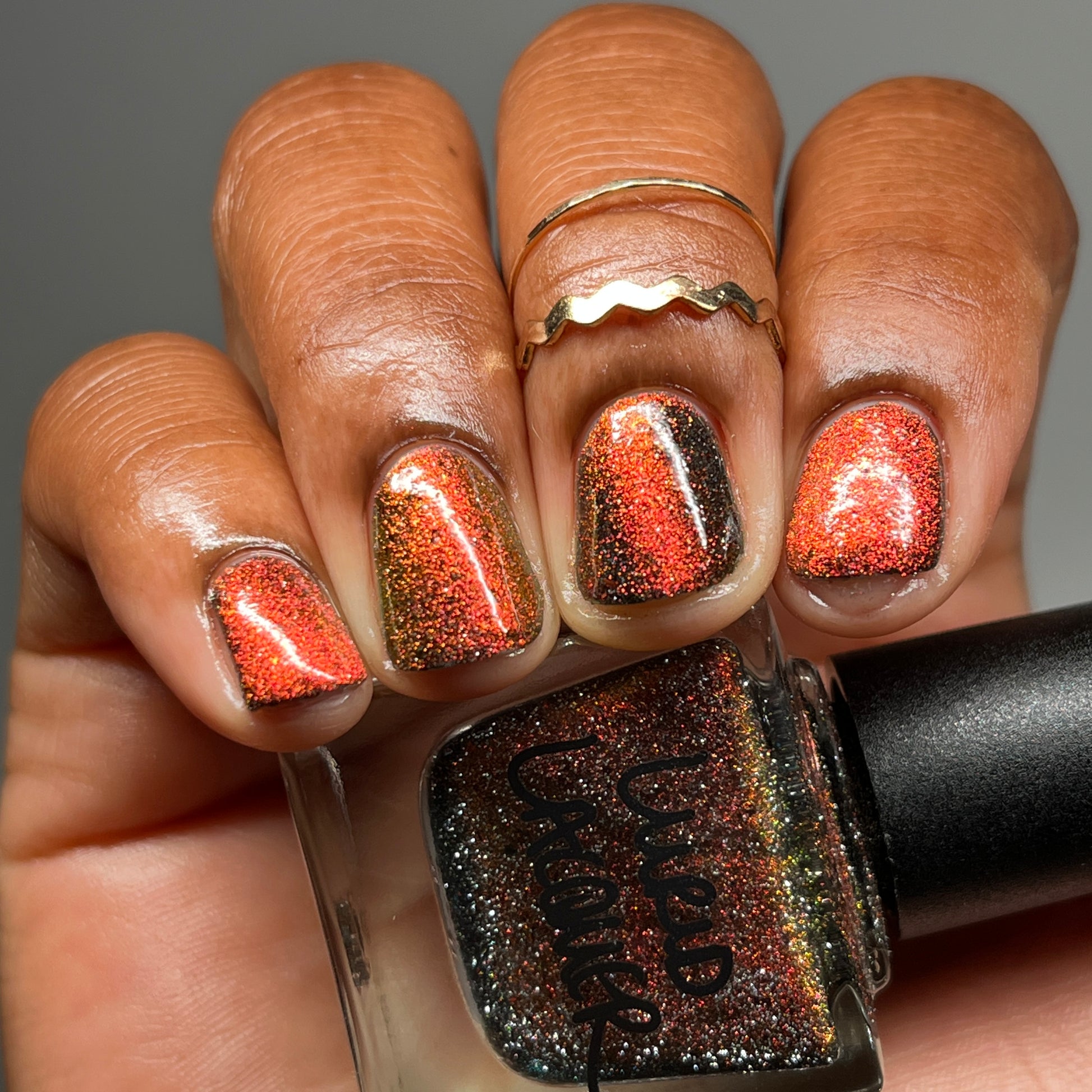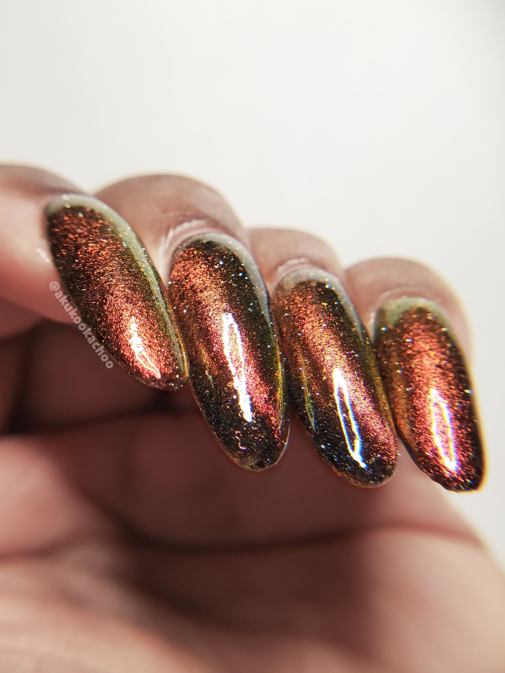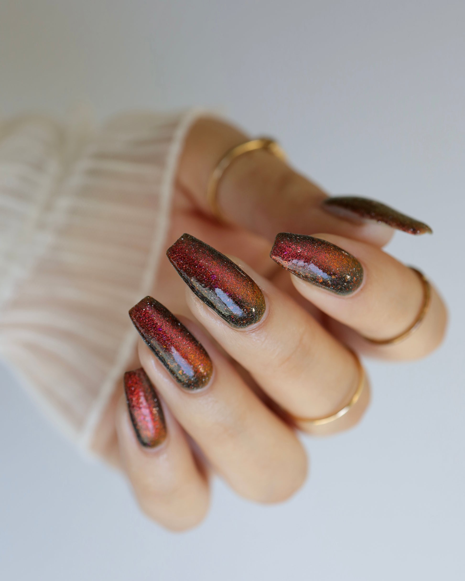 A black base with multichrome magnetic pigment that shifts from orange to gold to green, black to red to orange multichrome flakes, and silver light reflective glitter