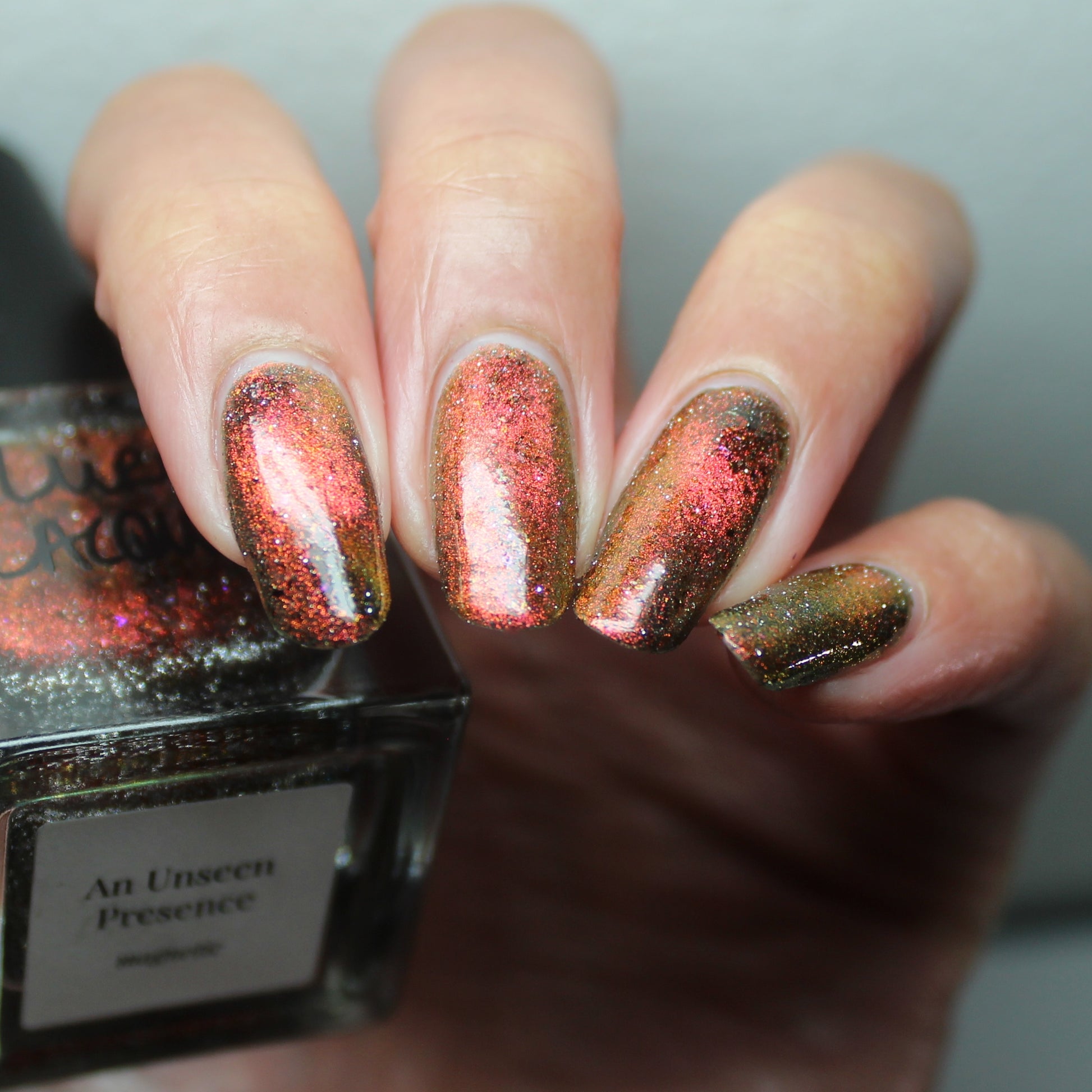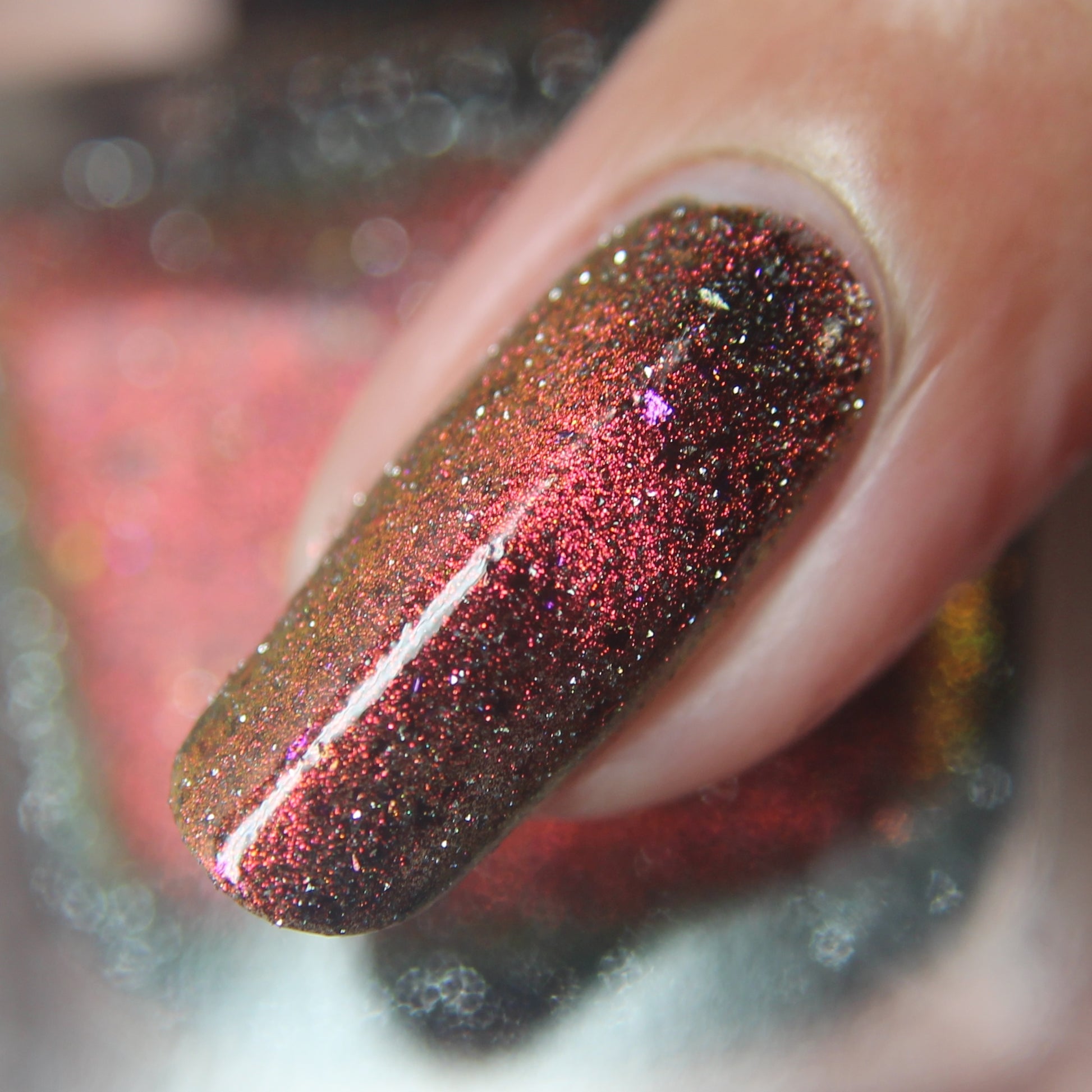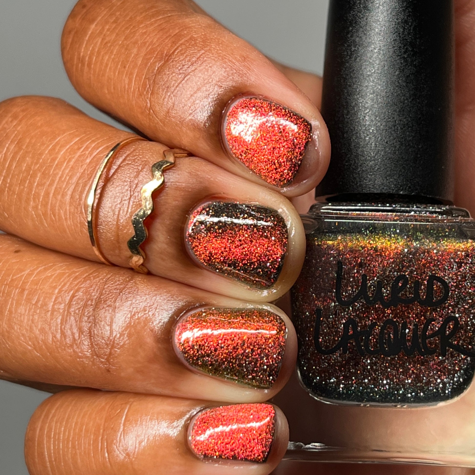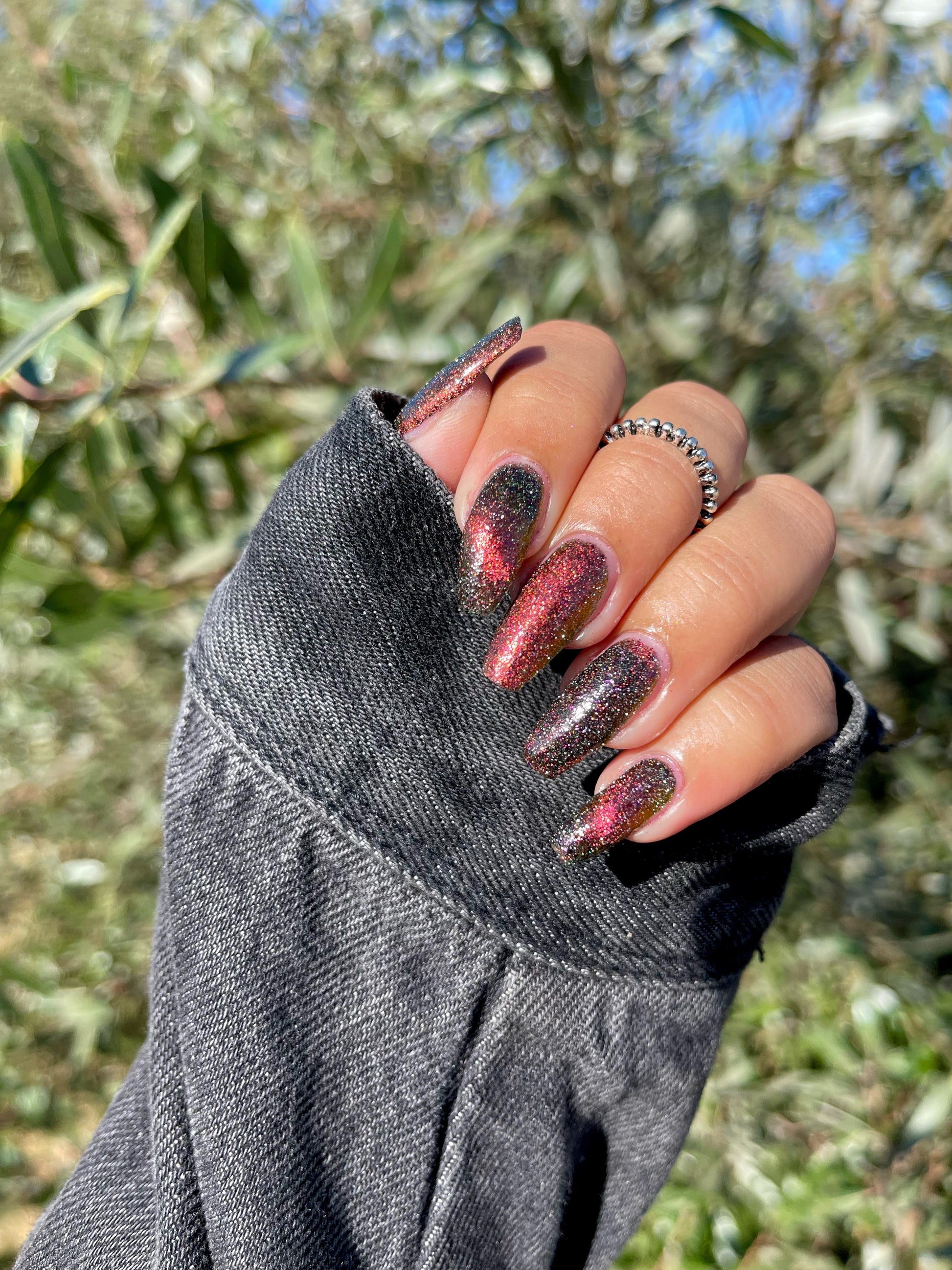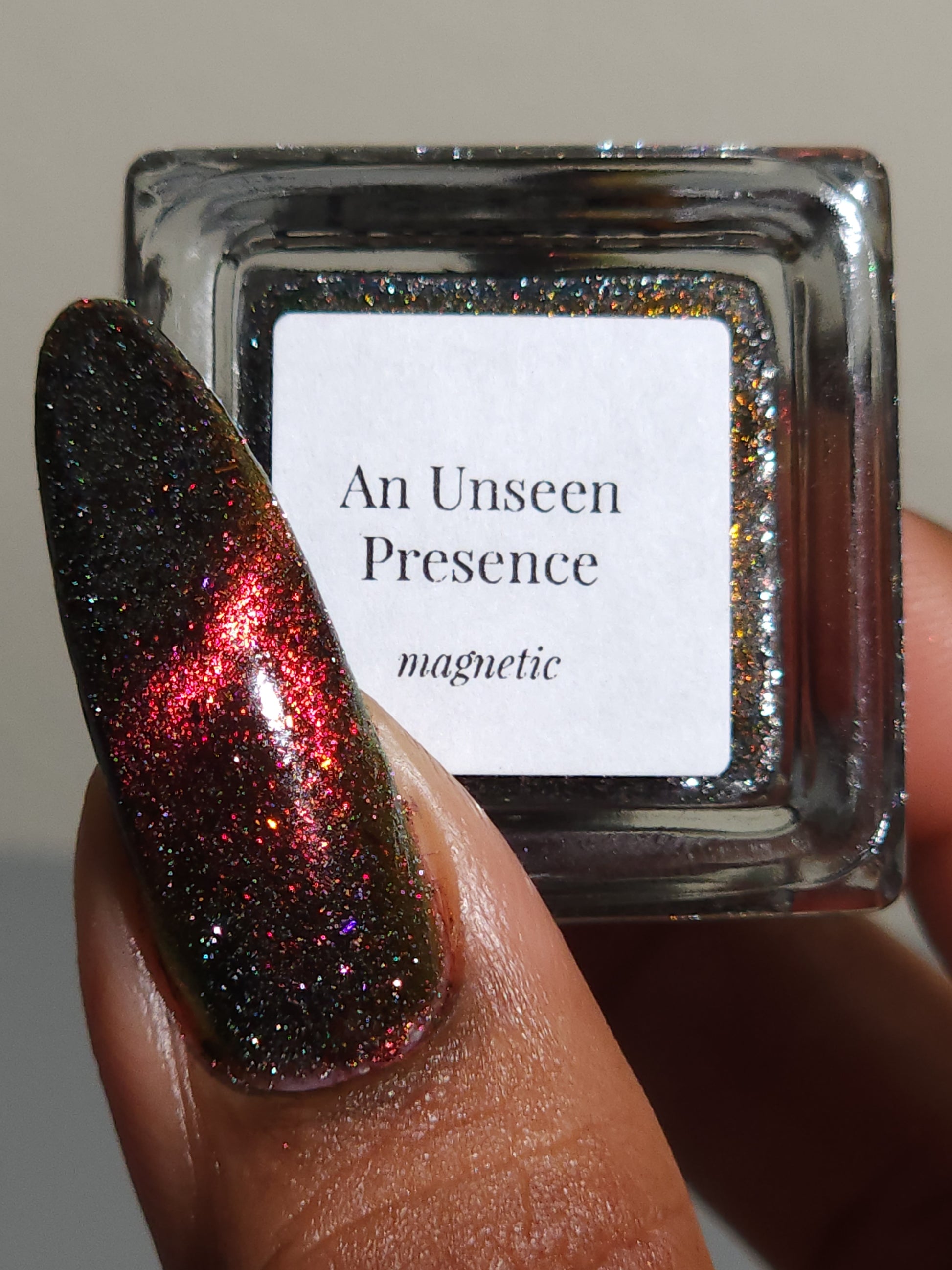 A black base with multichrome magnetic pigment that shifts from orange to gold to green, black to red to orange multichrome flakes, and silver light reflective glitter