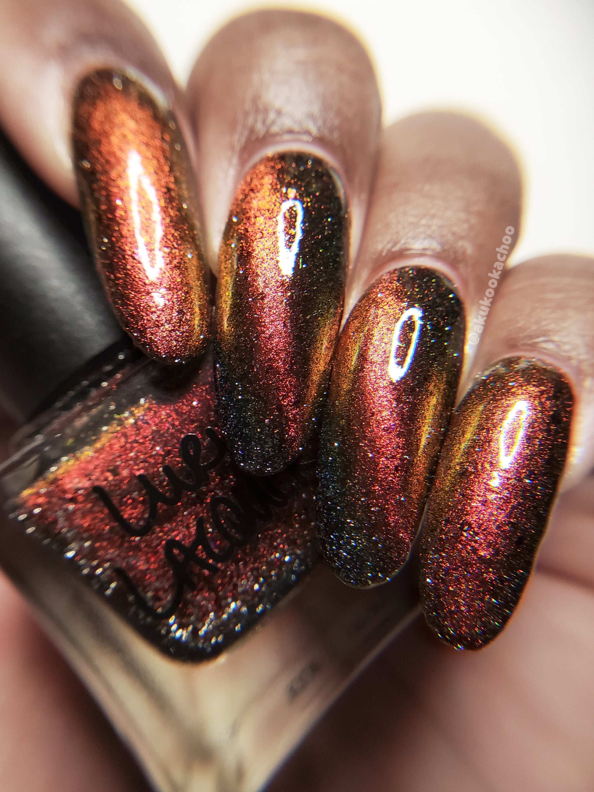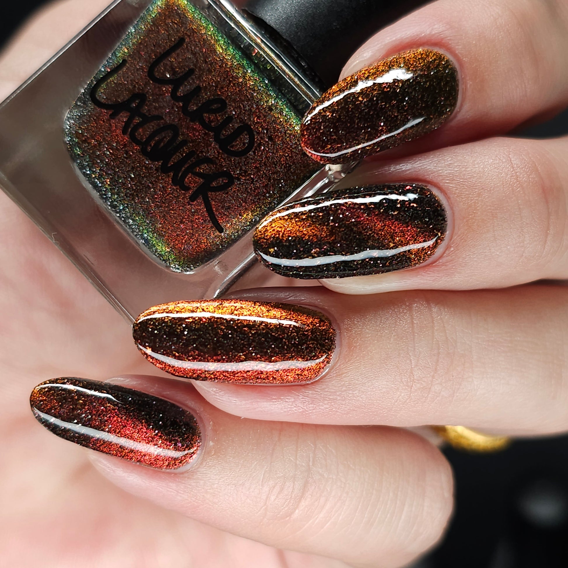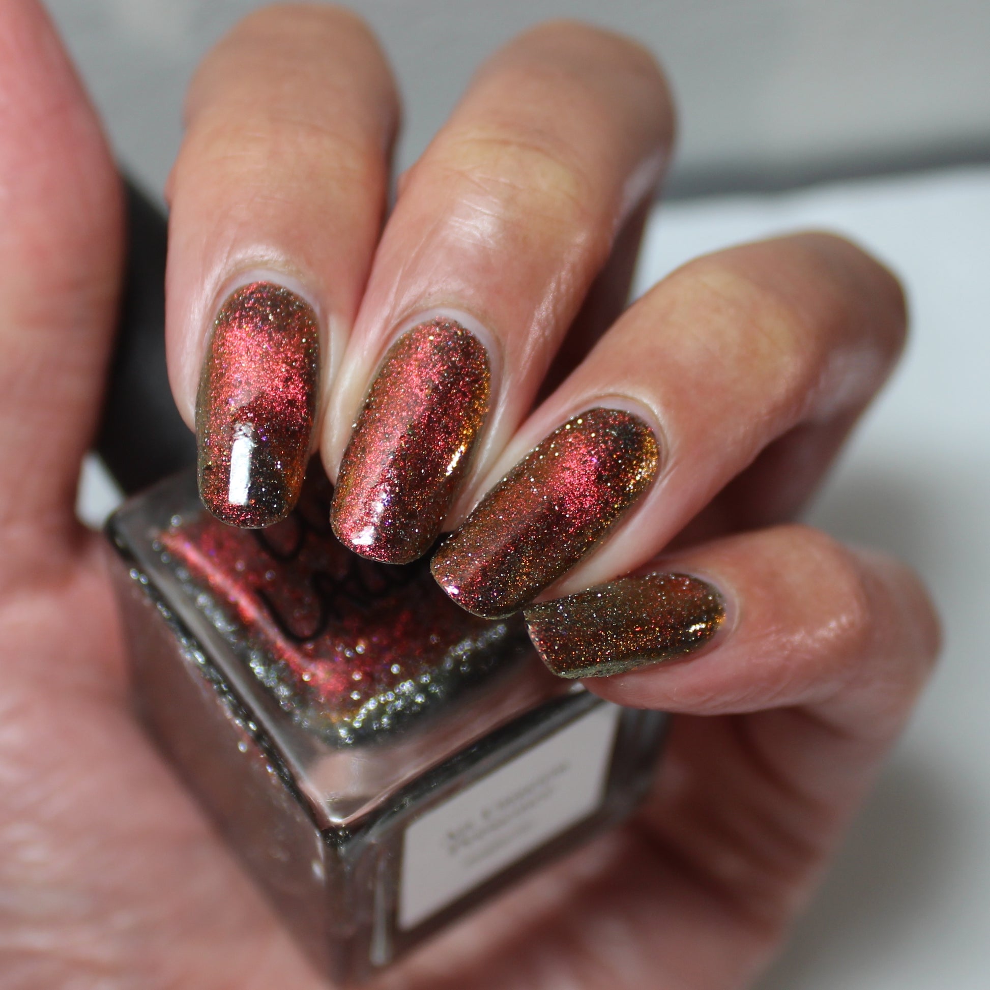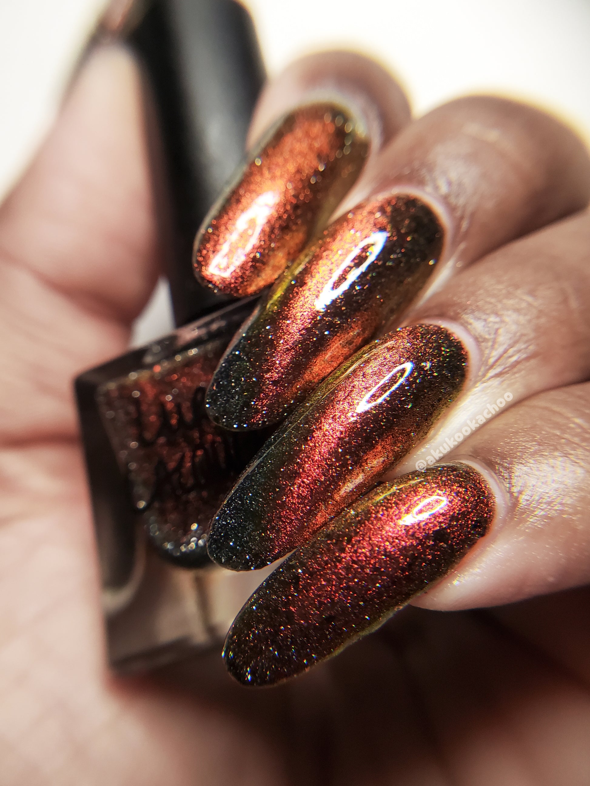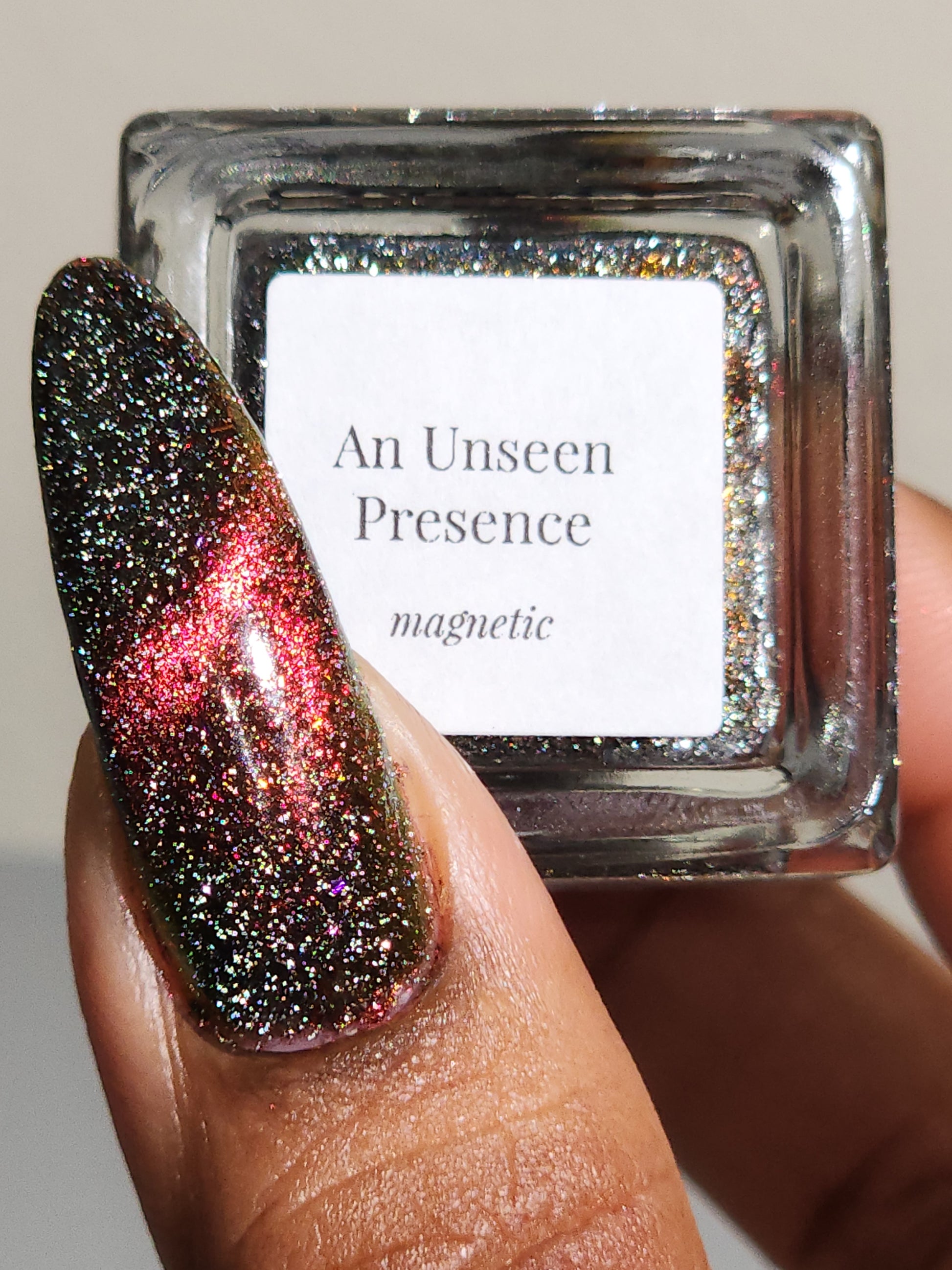 A black base with multichrome magnetic pigment that shifts from orange to gold to green, black to red to orange multichrome flakes, and silver light reflective glitter