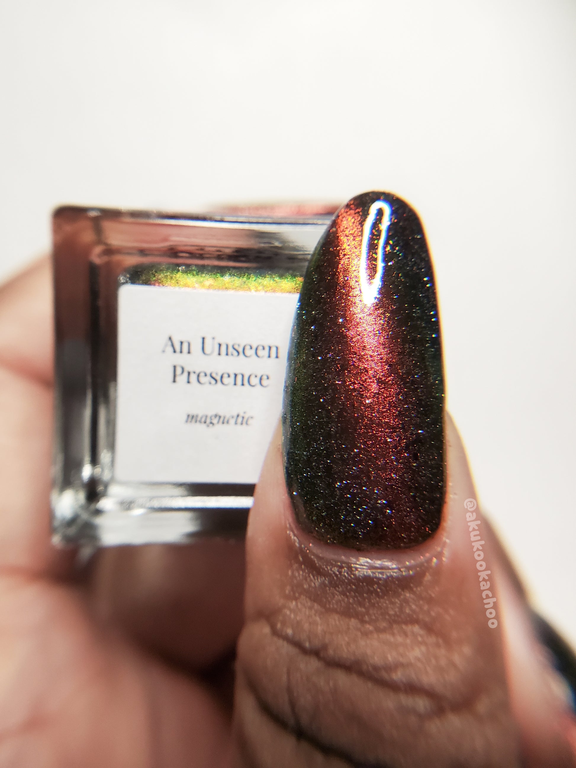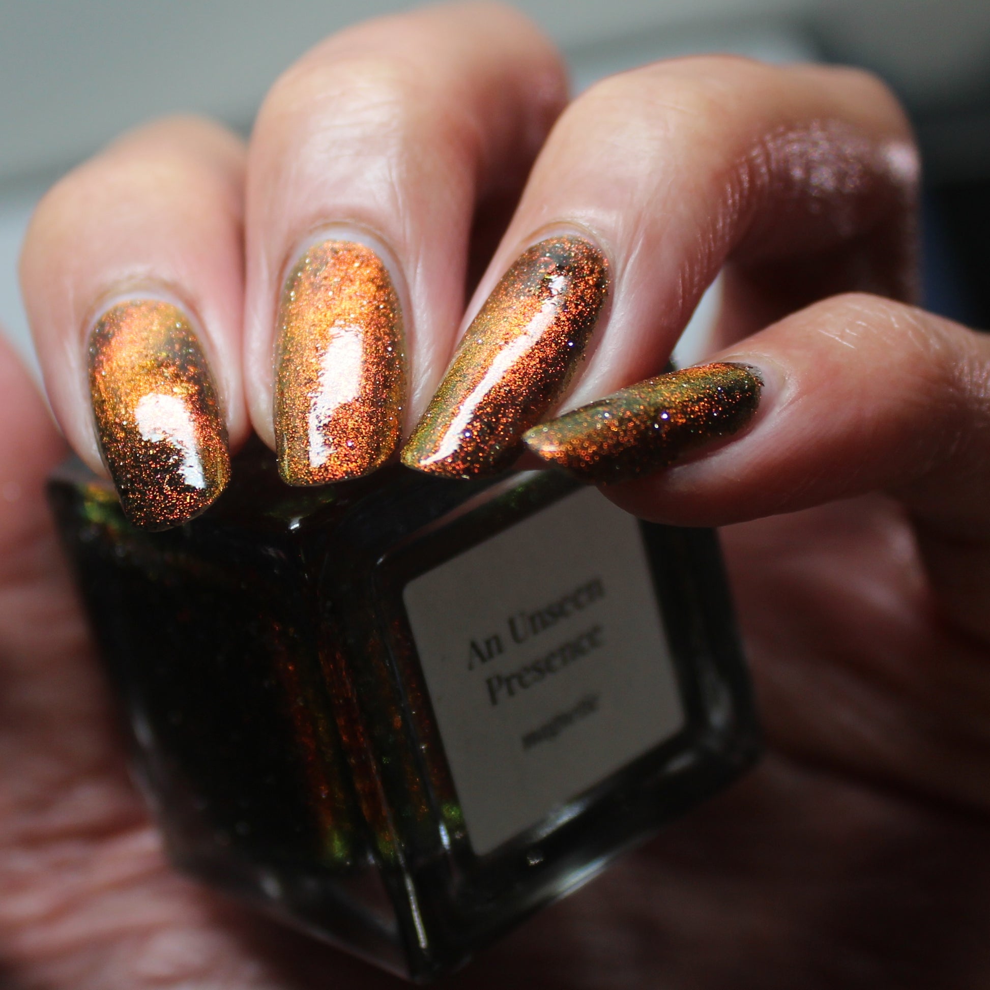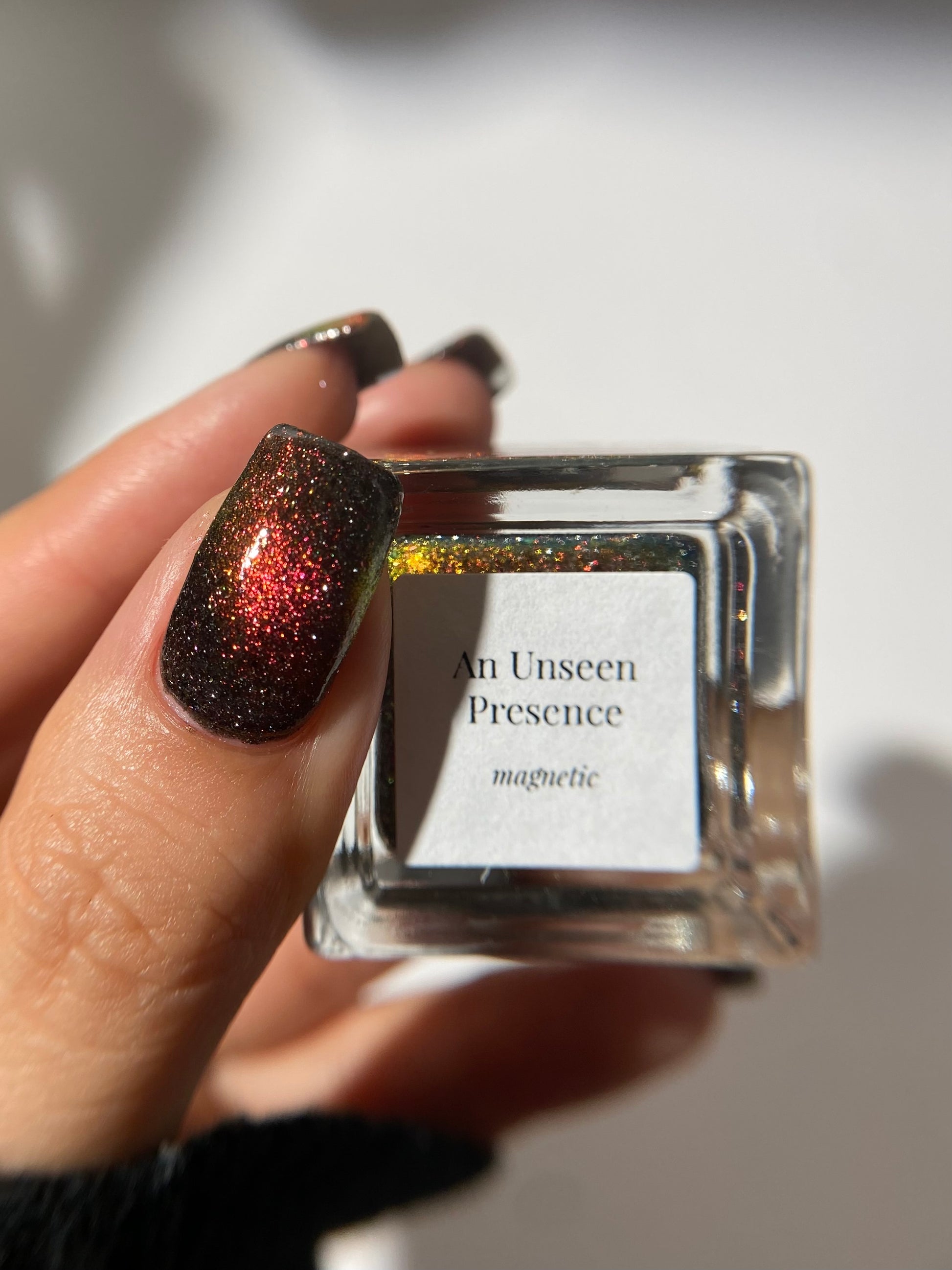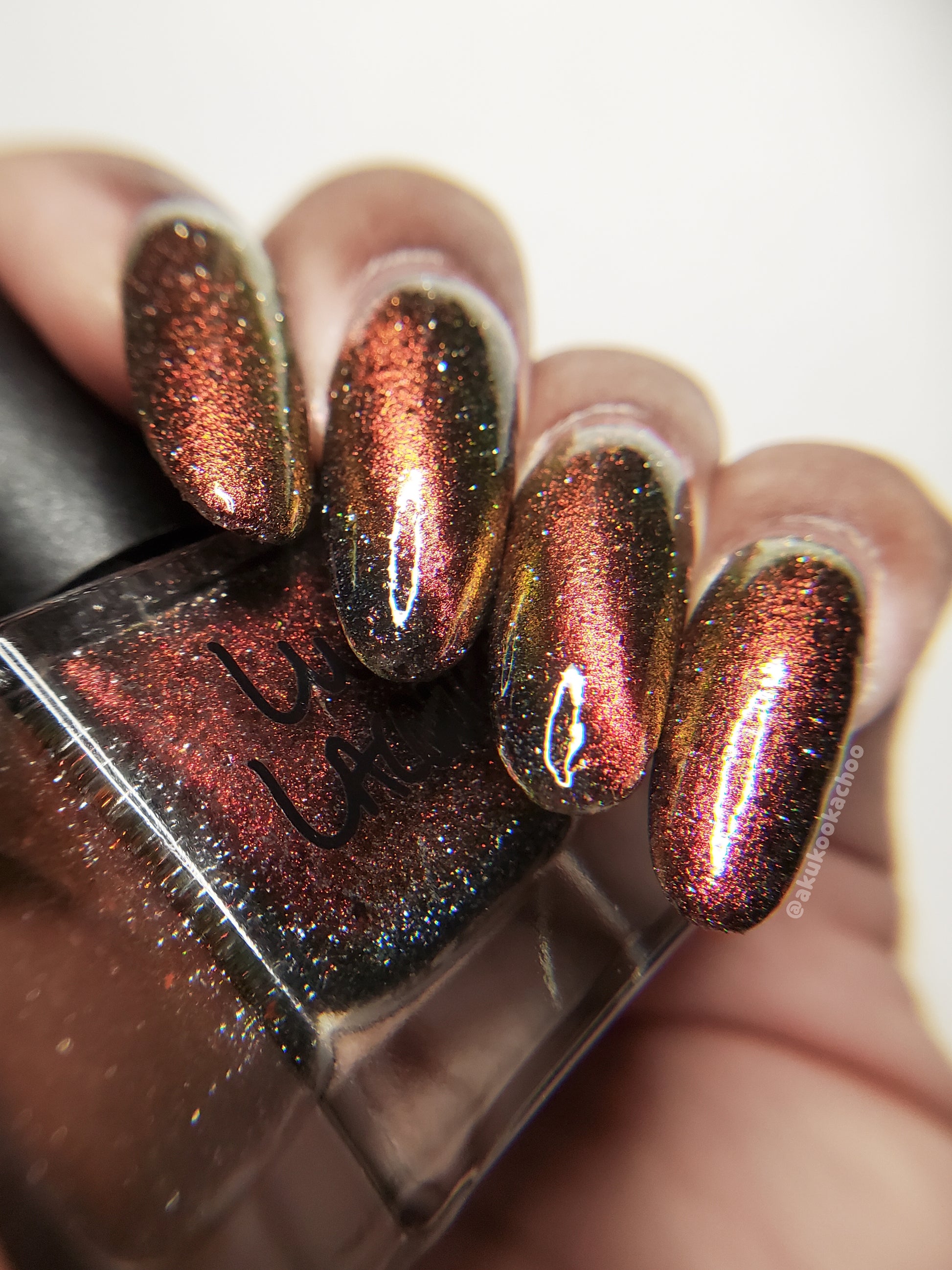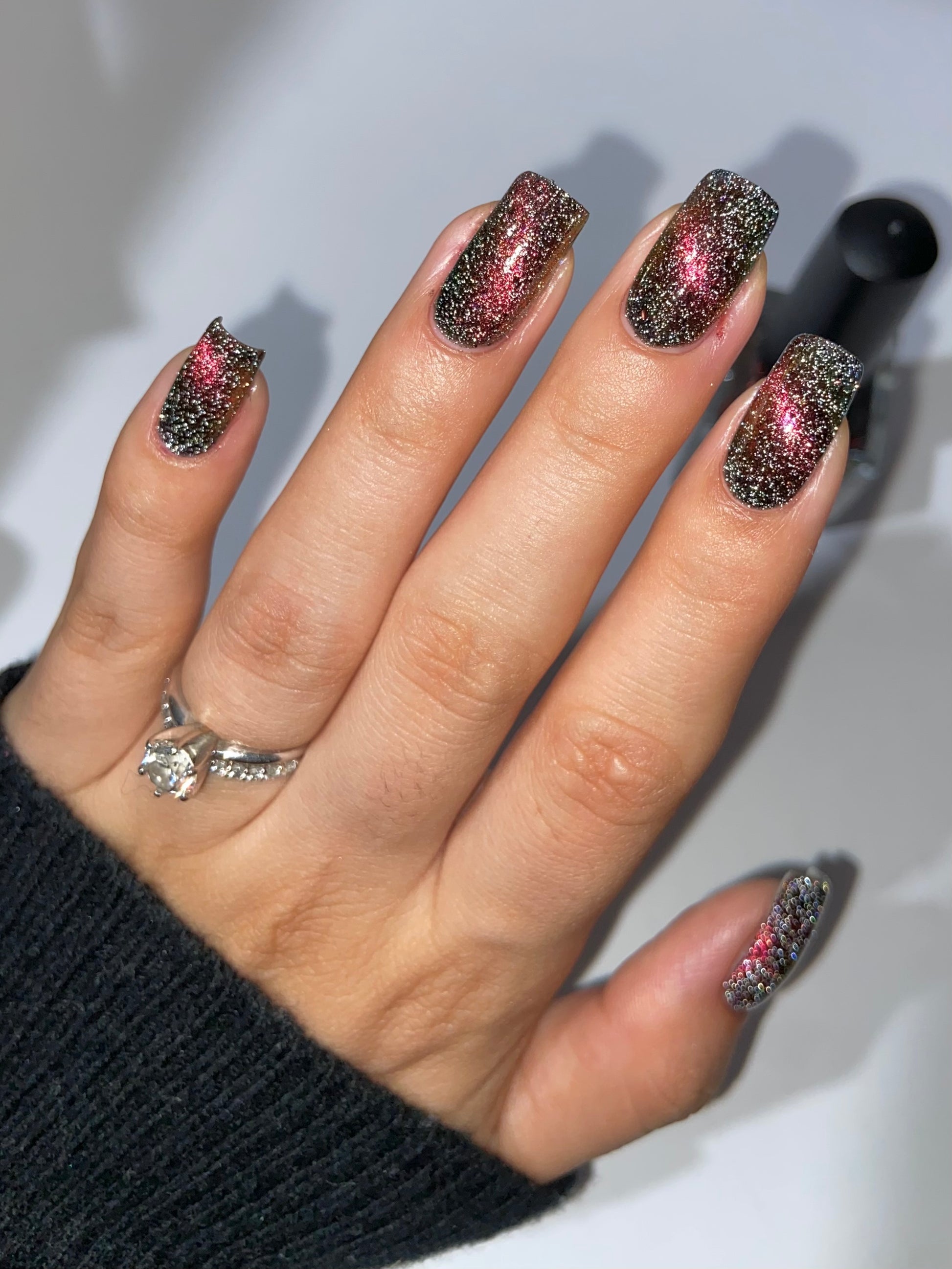 A black base with multichrome magnetic pigment that shifts from orange to gold to green, black to red to orange multichrome flakes, and silver light reflective glitter