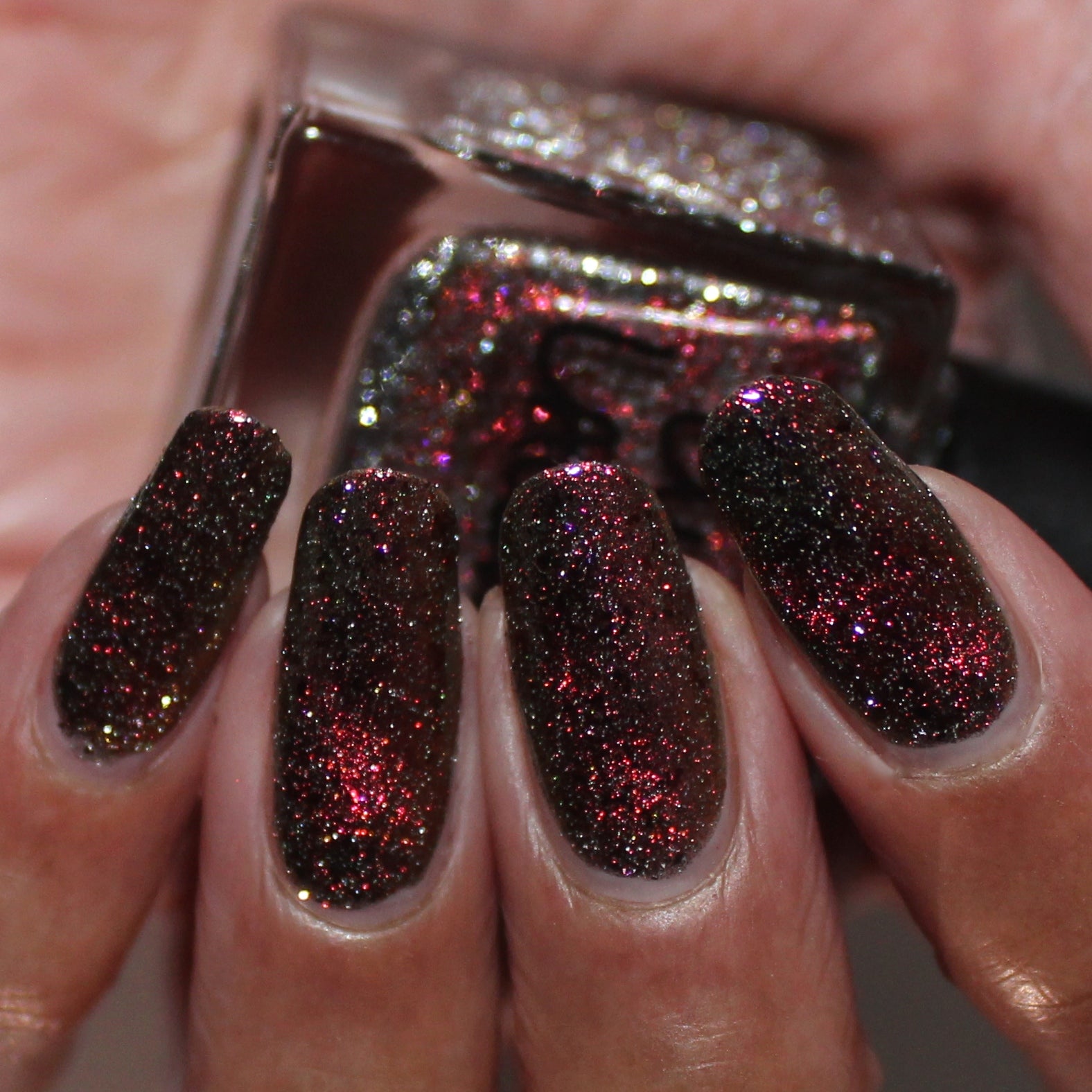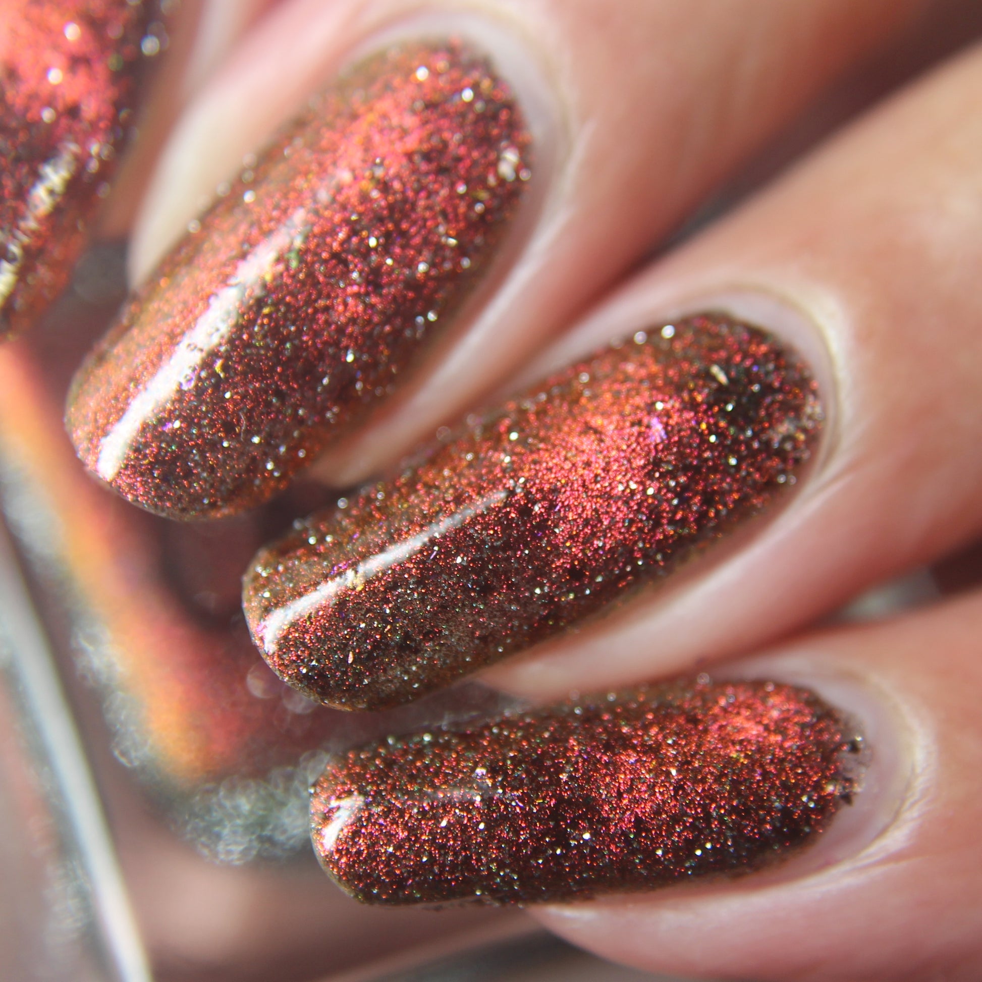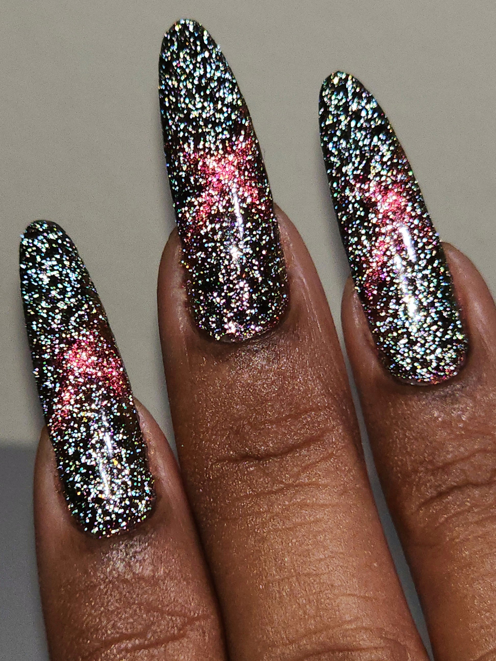 Please note: Reflective glitter polishes are textured and dry down with a gritty, sandpaper feeling. To make them look smooth and glossy, I recommend applying 2-3 coats of the polish, then applying one coat of a glitter smoother, followed by one coat of top coat.