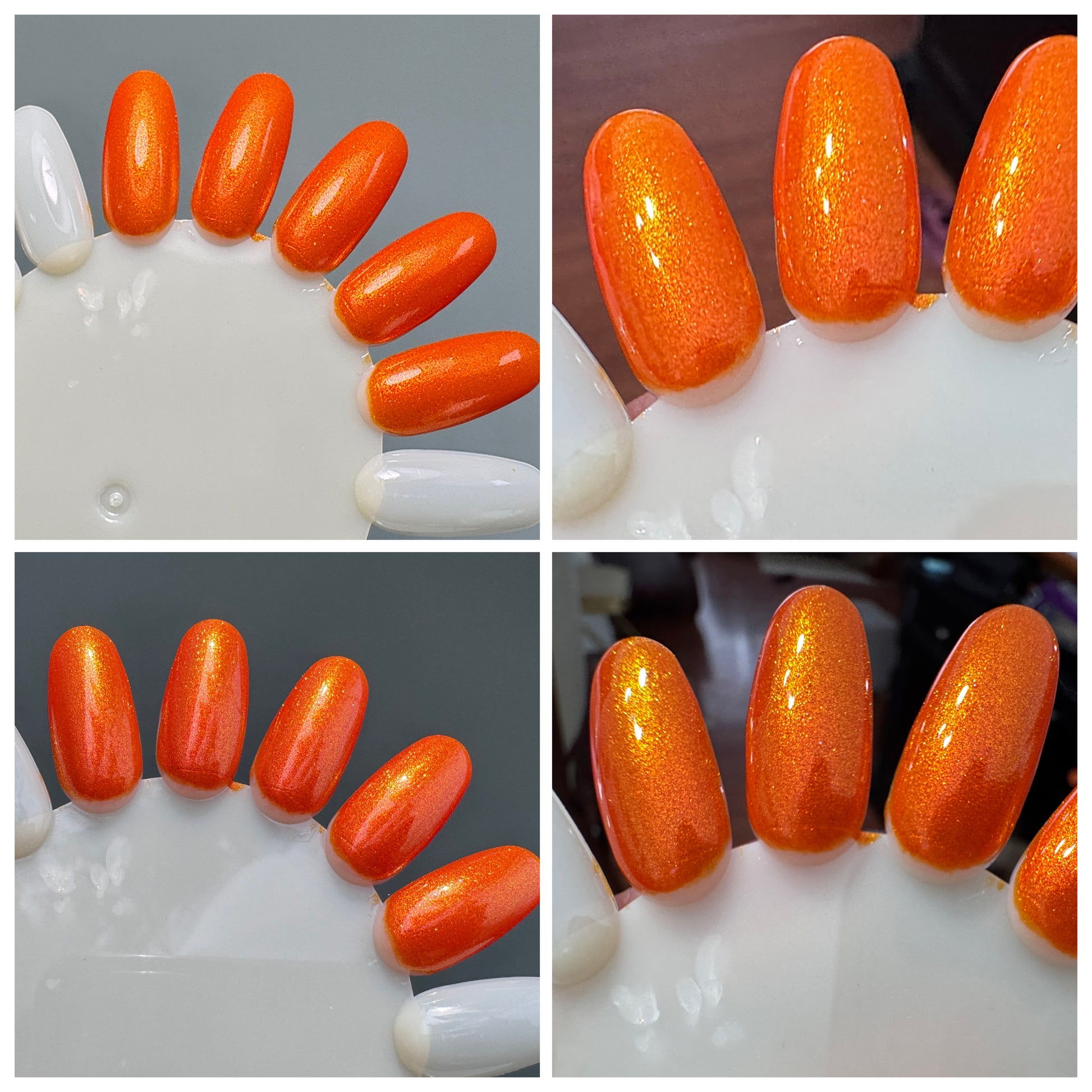 A yellowy-orange base with twinkly aurora shimmer that shifts from orange to gold