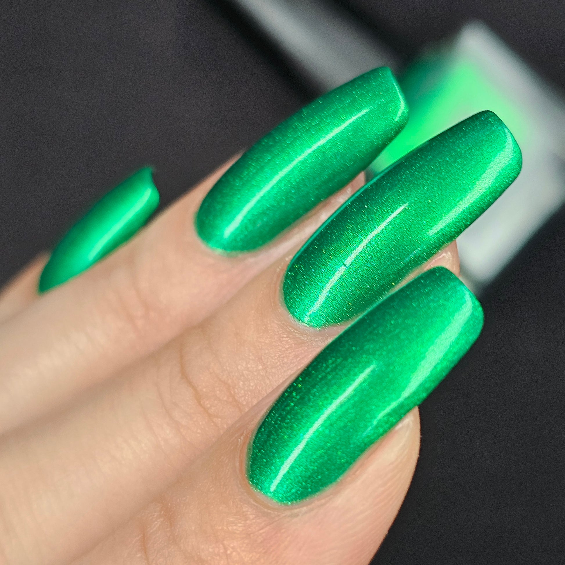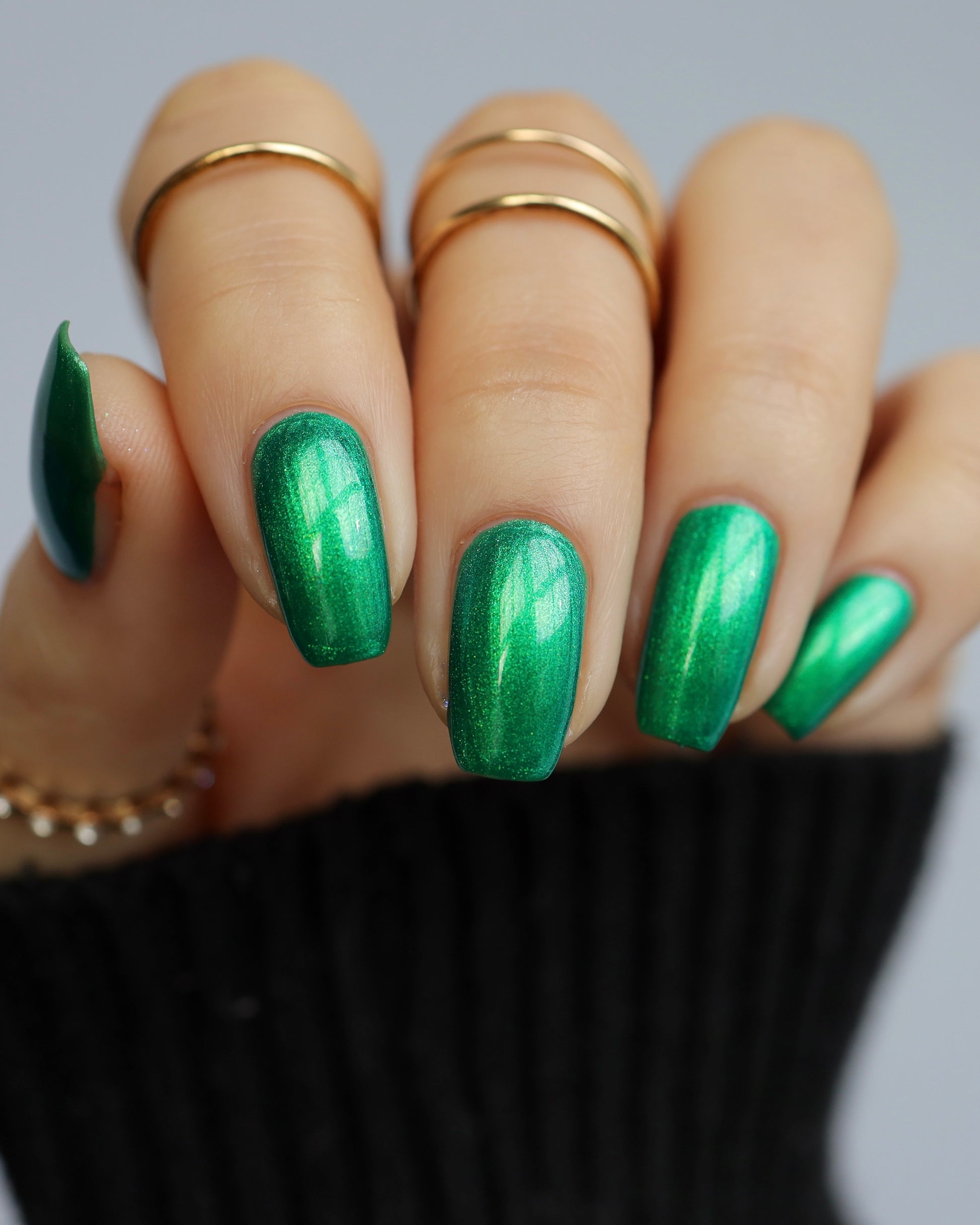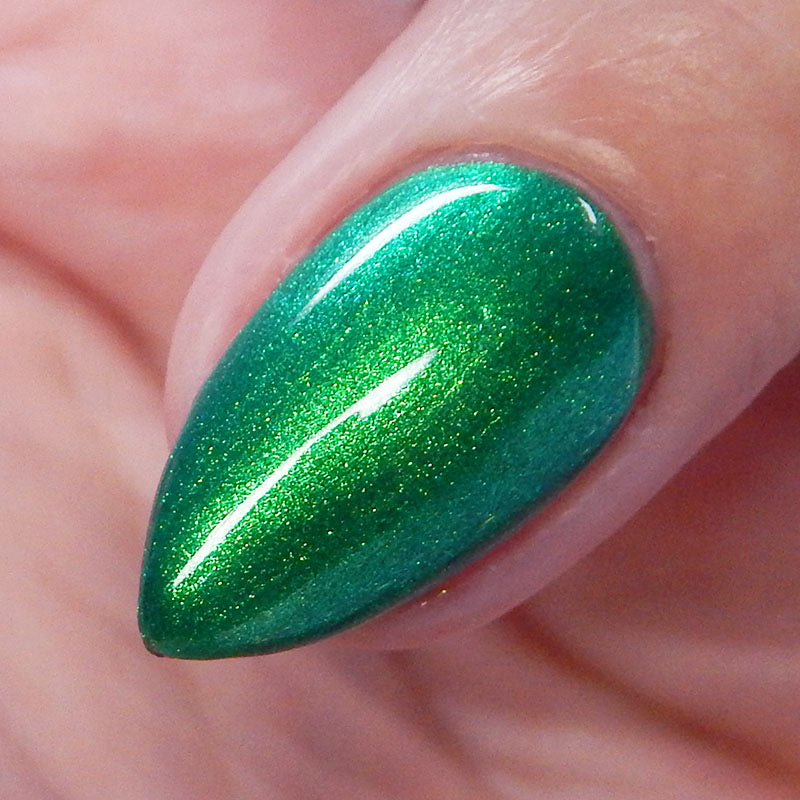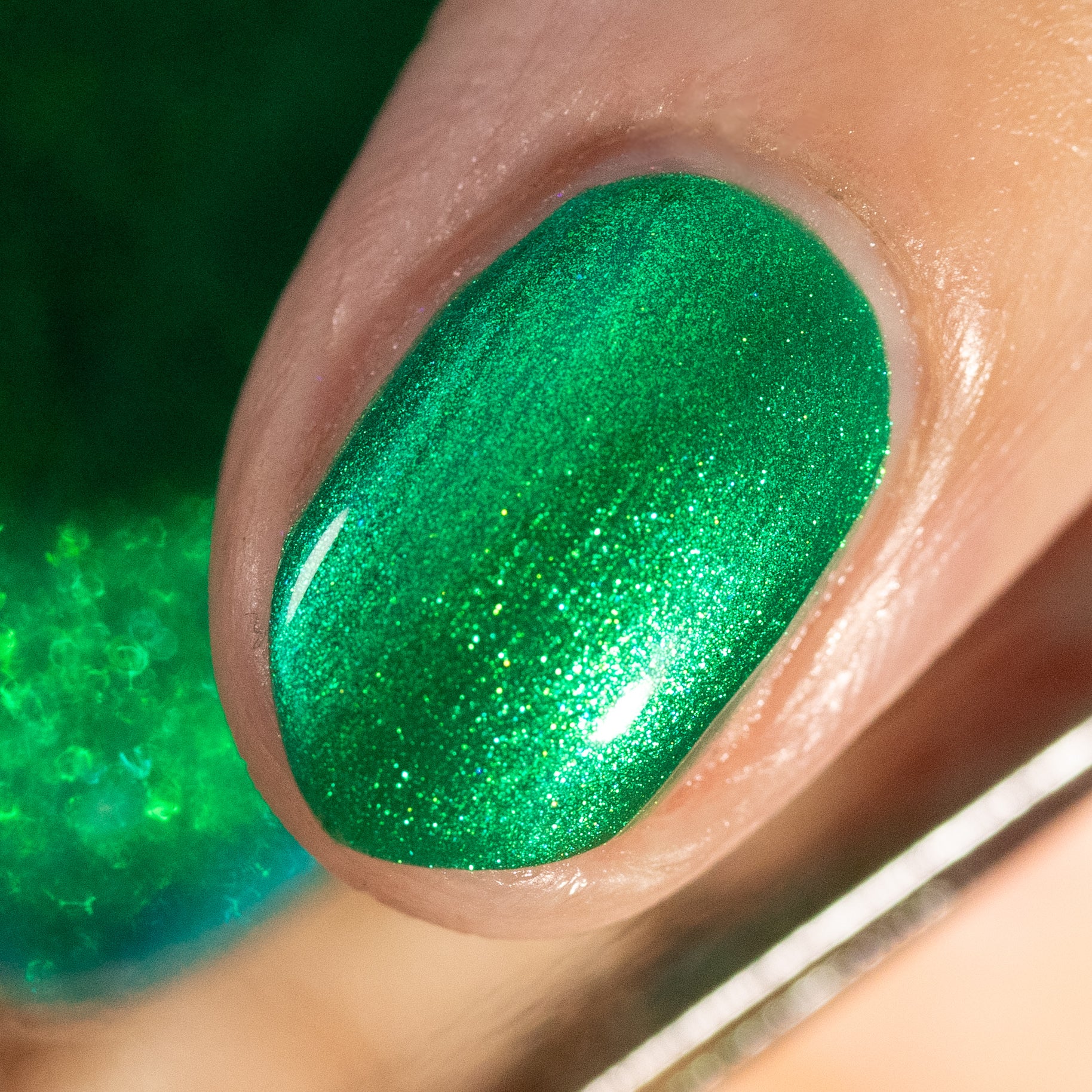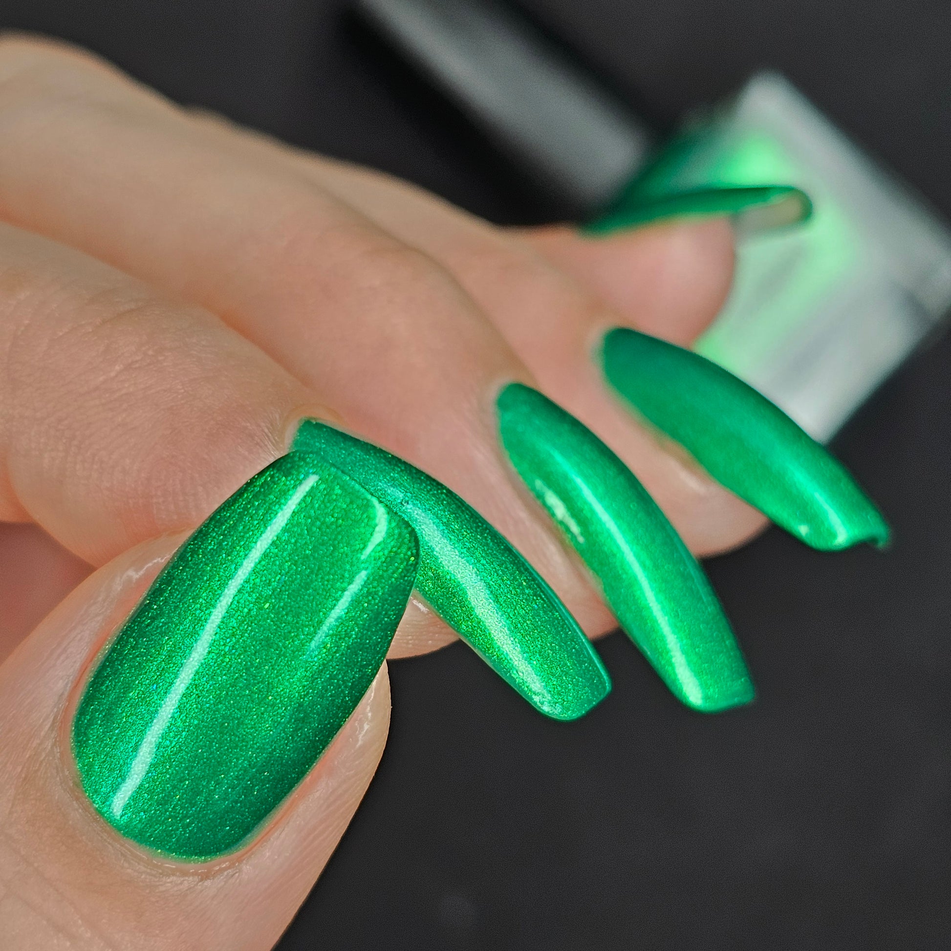 An emerald green base with vibrant green aurora shimmer that shifts subtly to teal