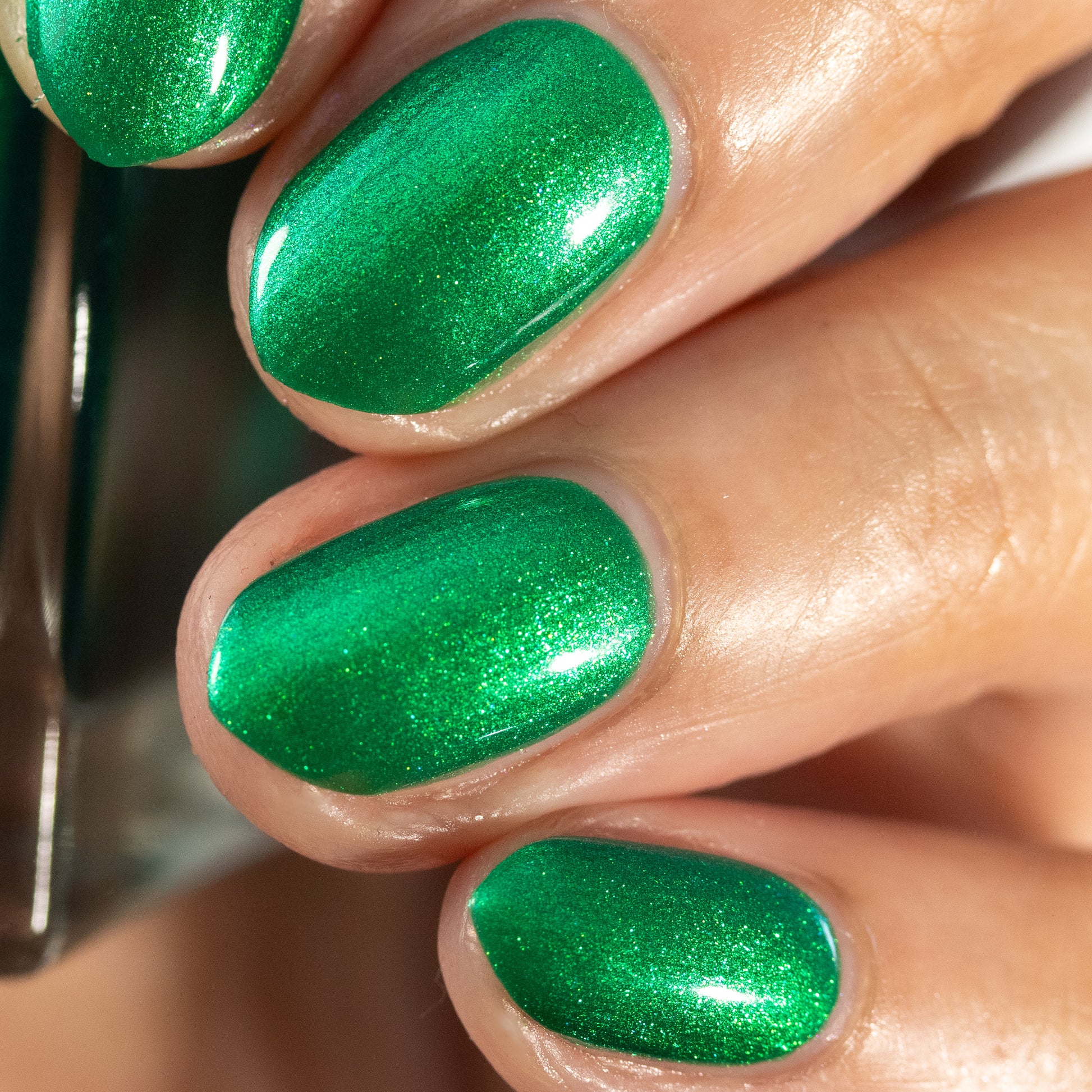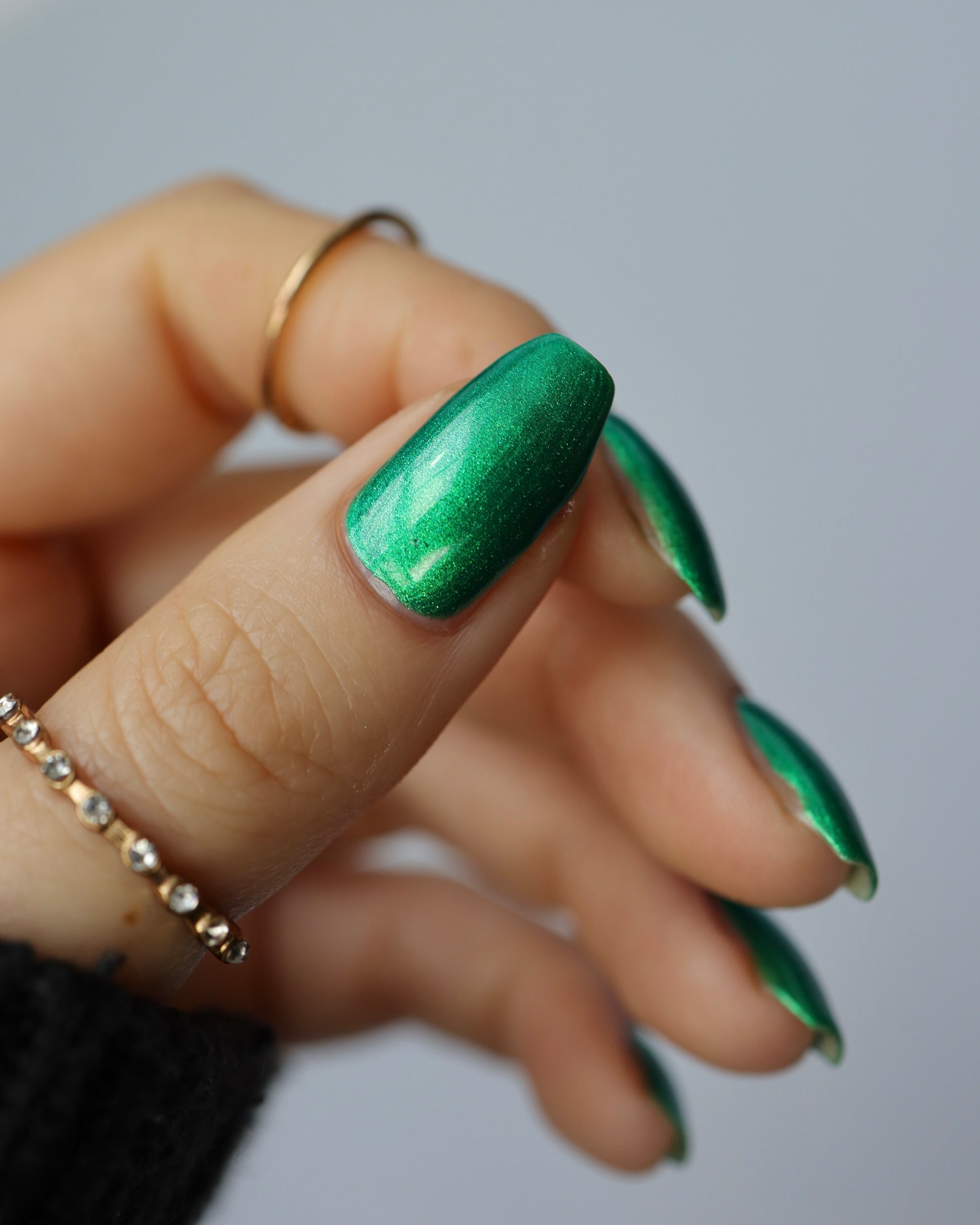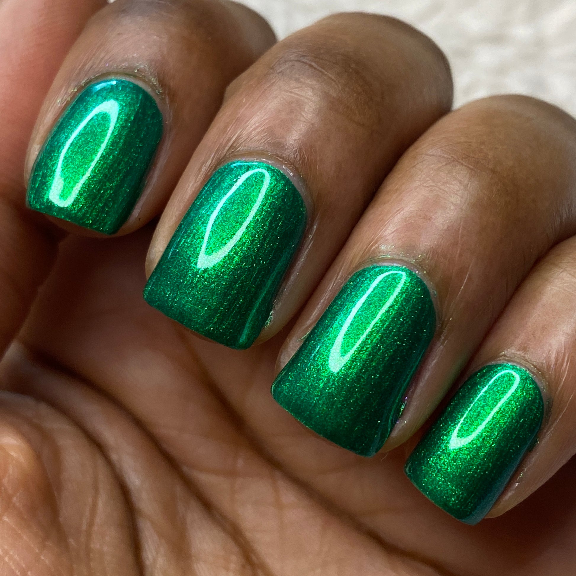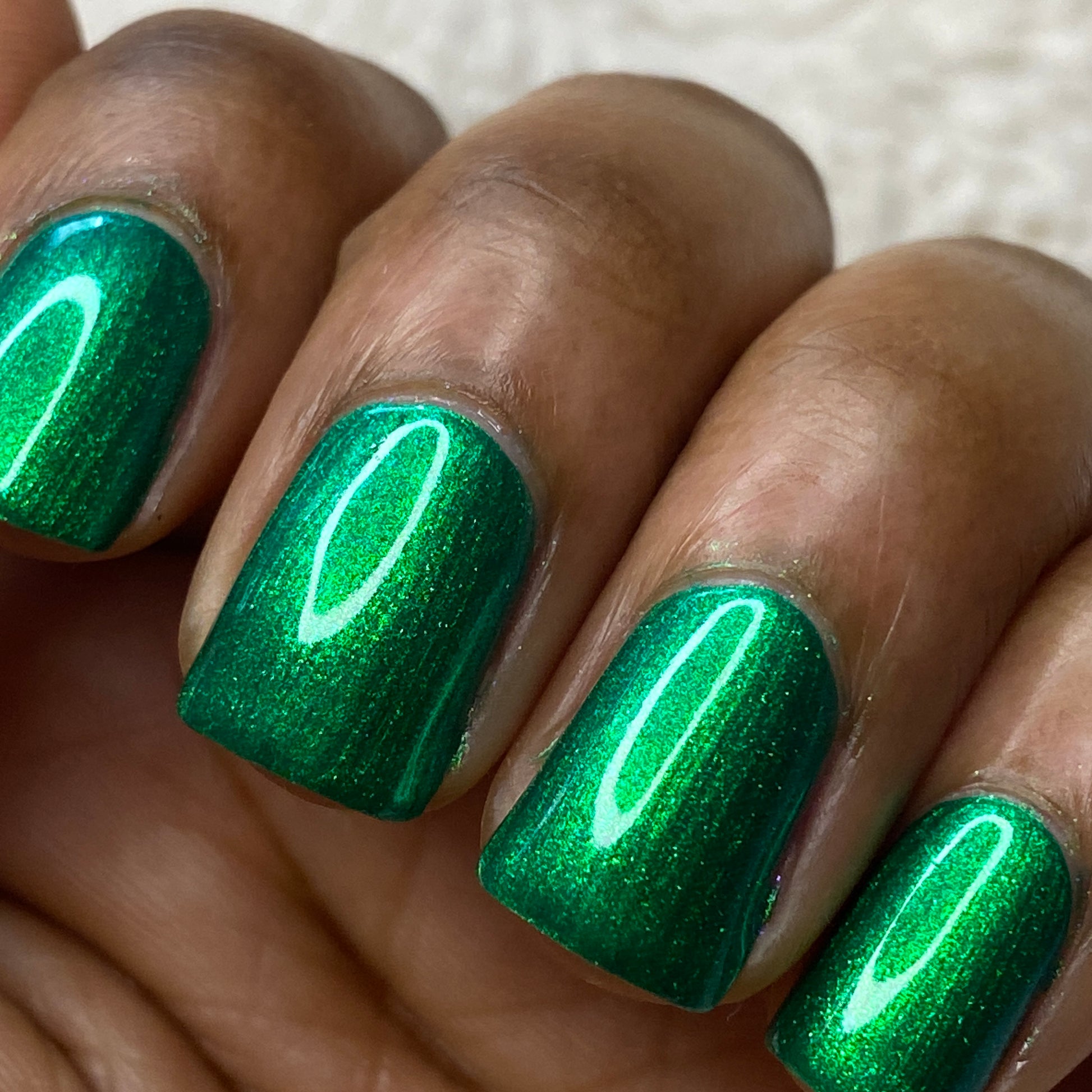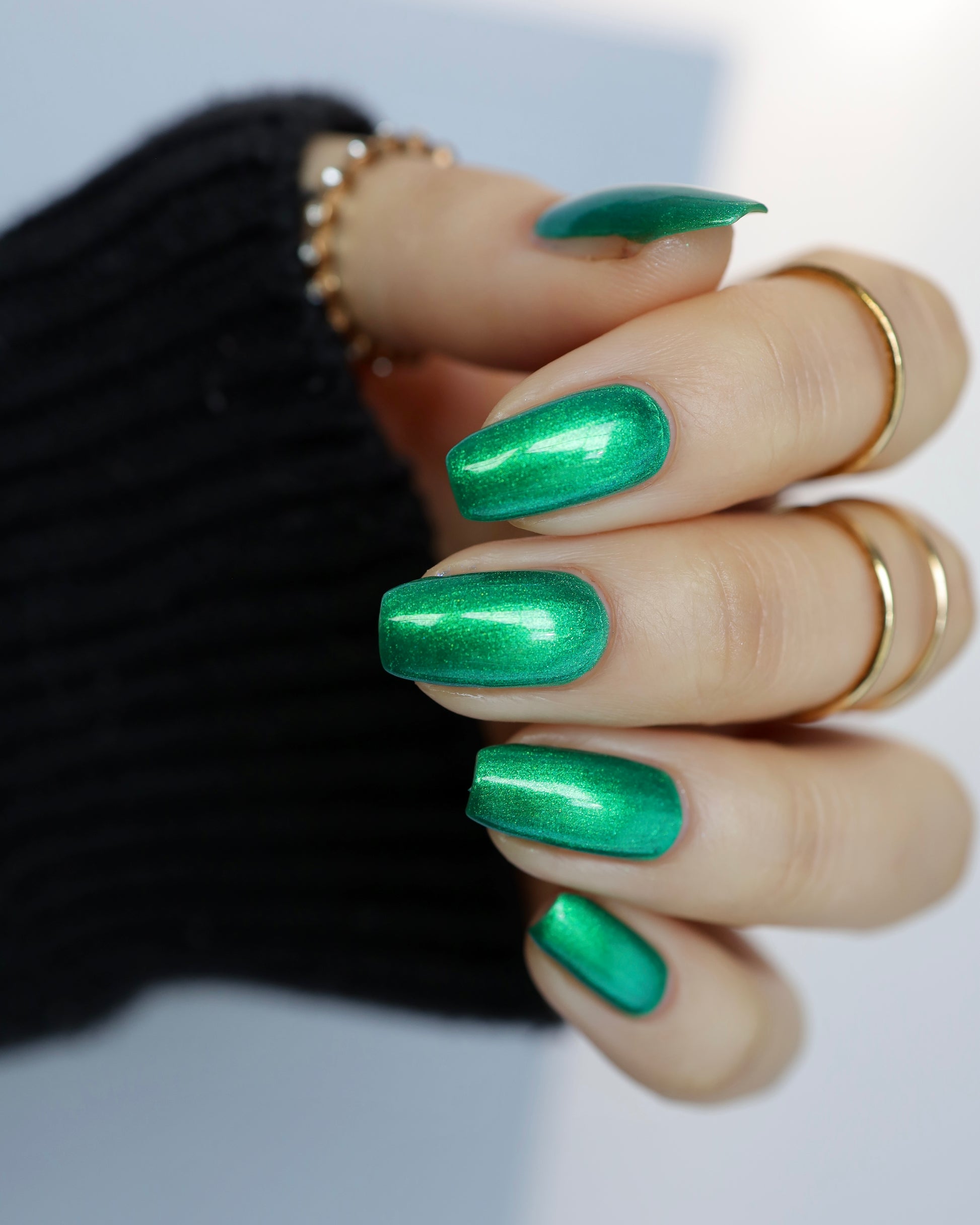 An emerald green base with vibrant green aurora shimmer that shifts subtly to teal