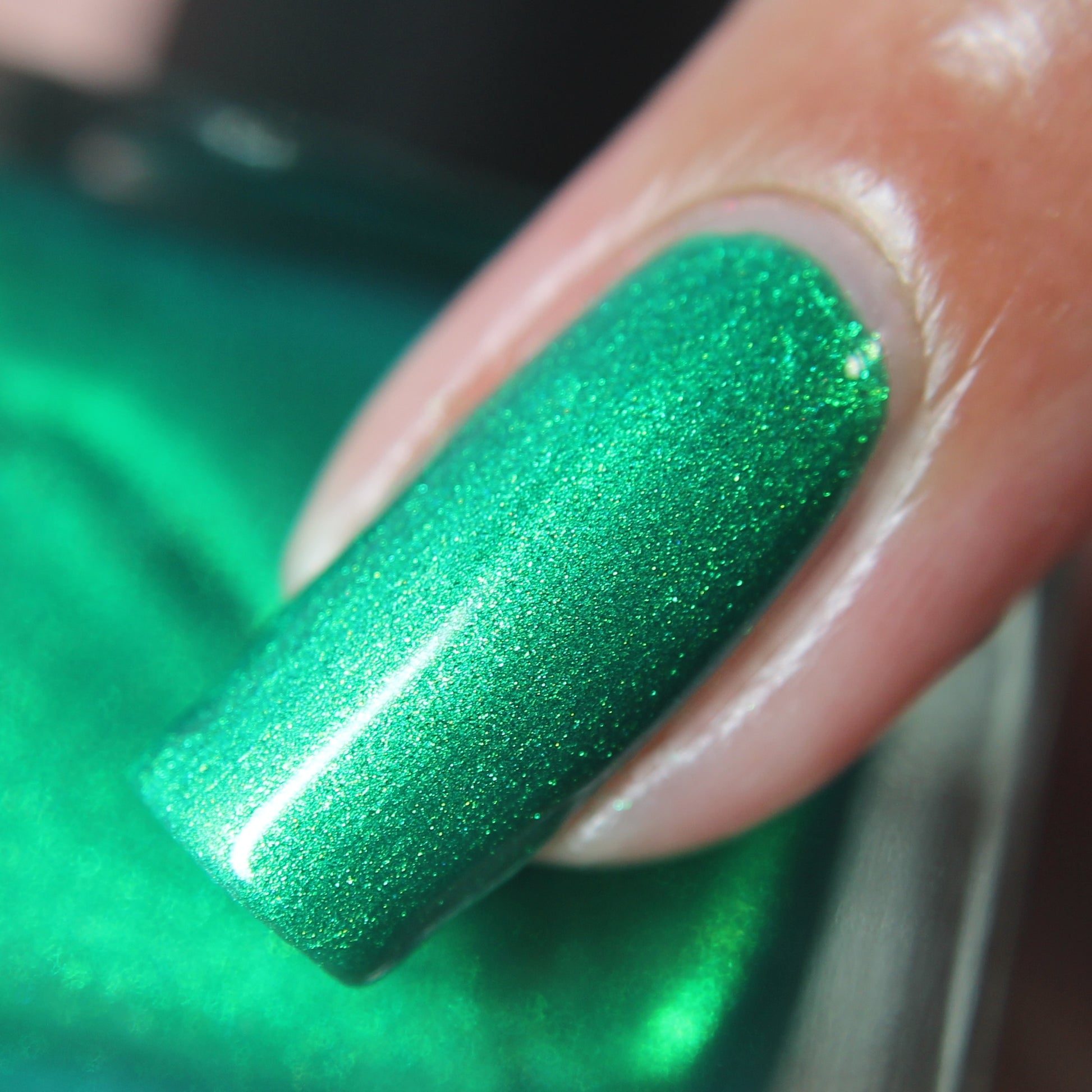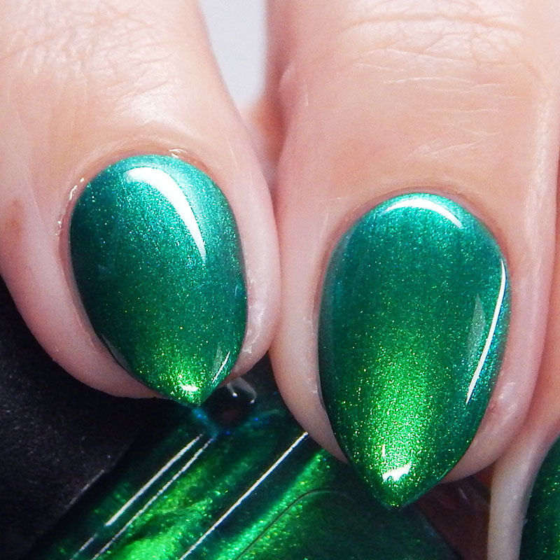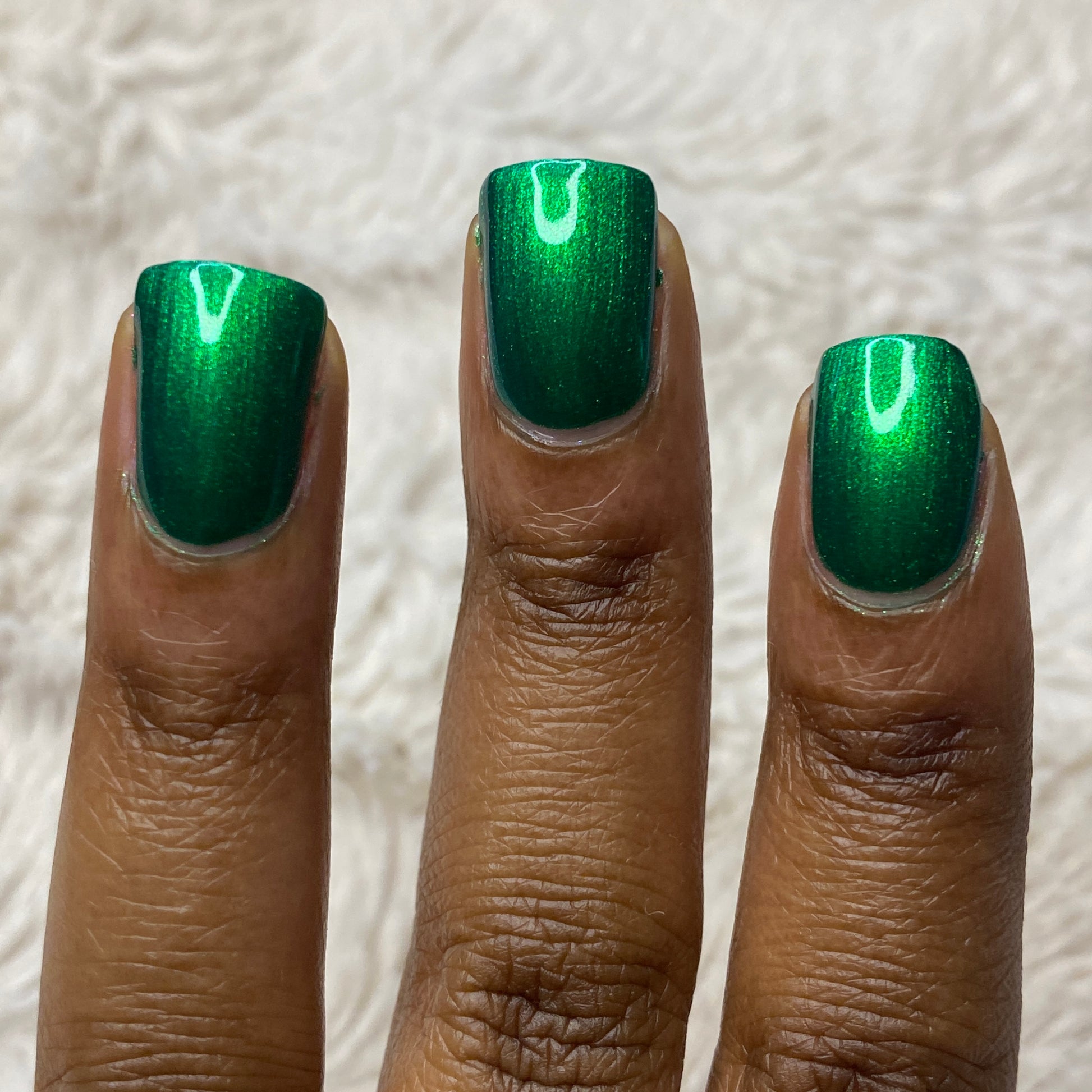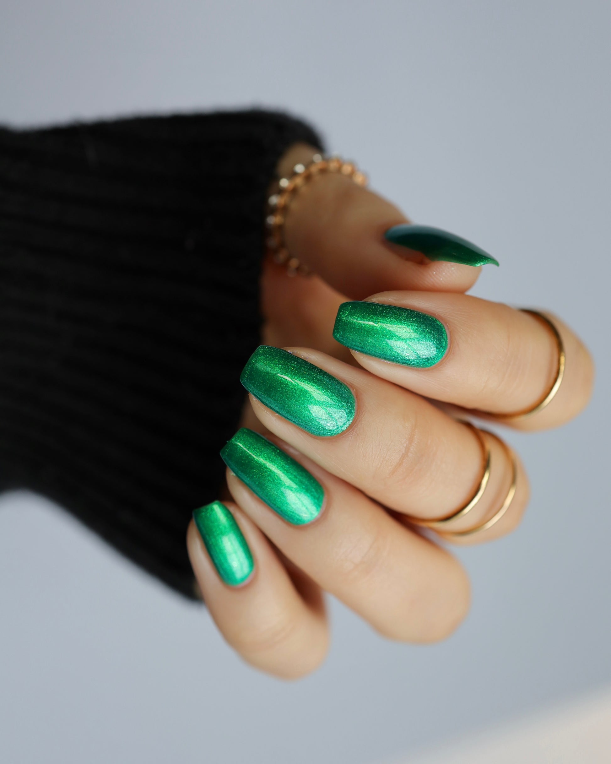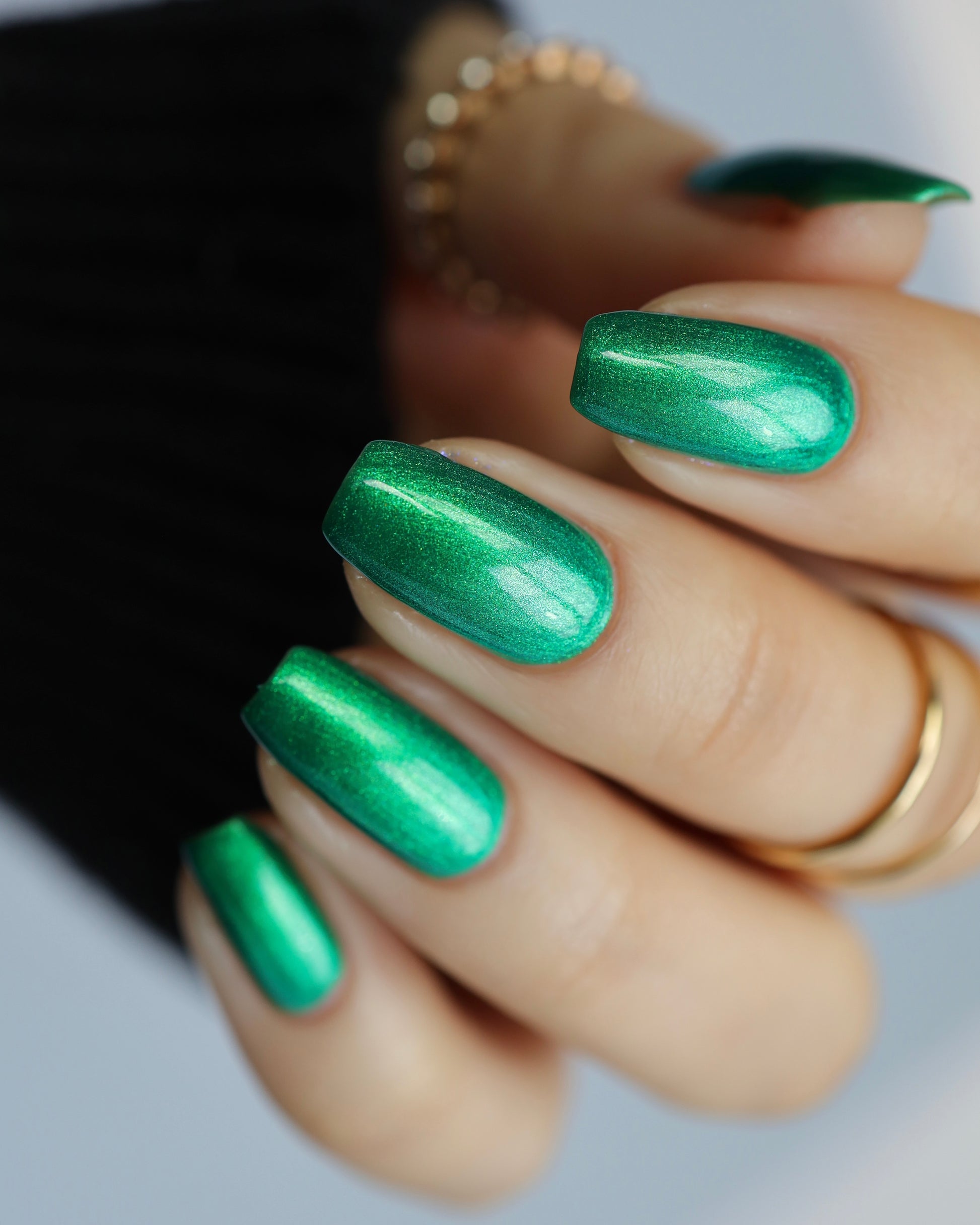 An emerald green base with vibrant green aurora shimmer that shifts subtly to teal