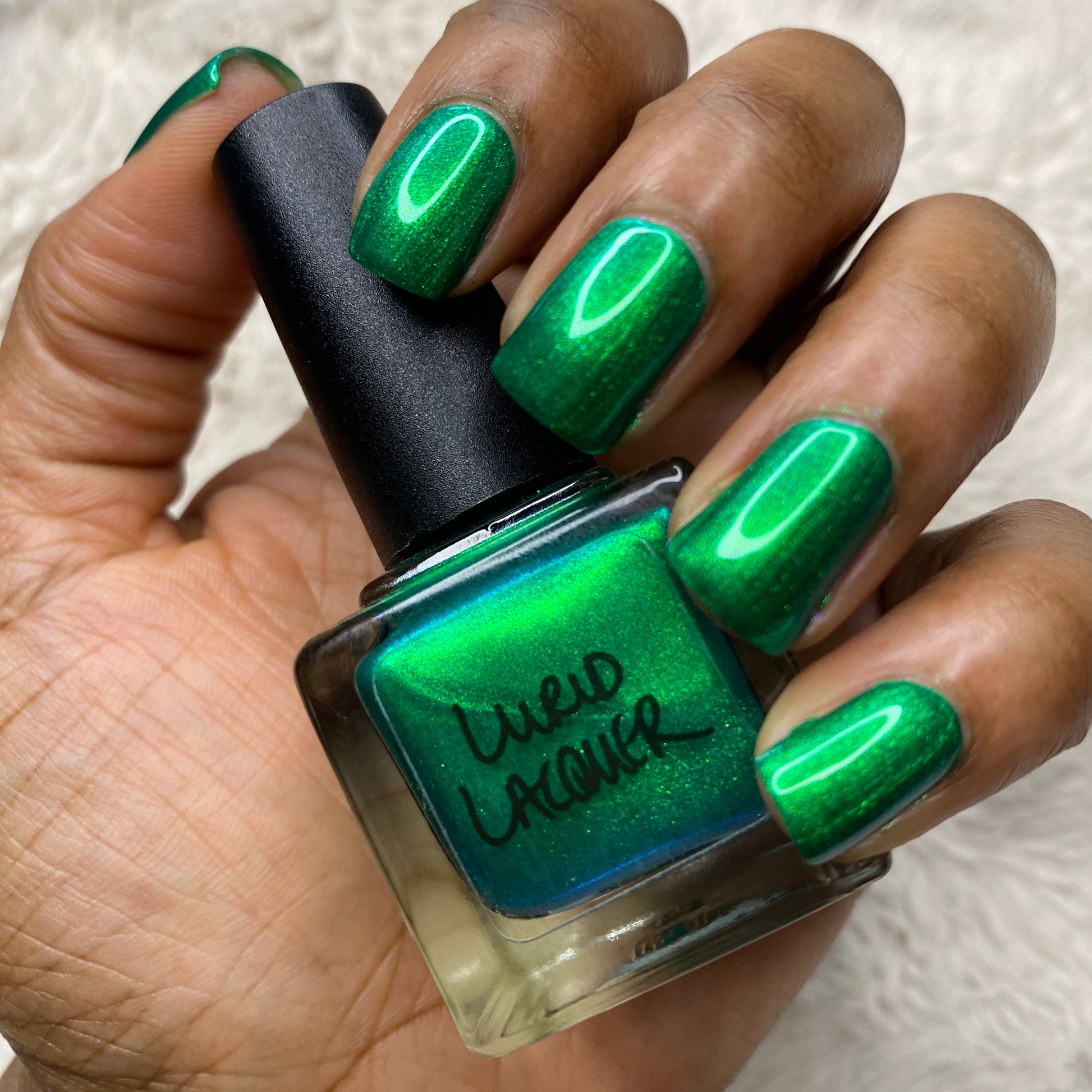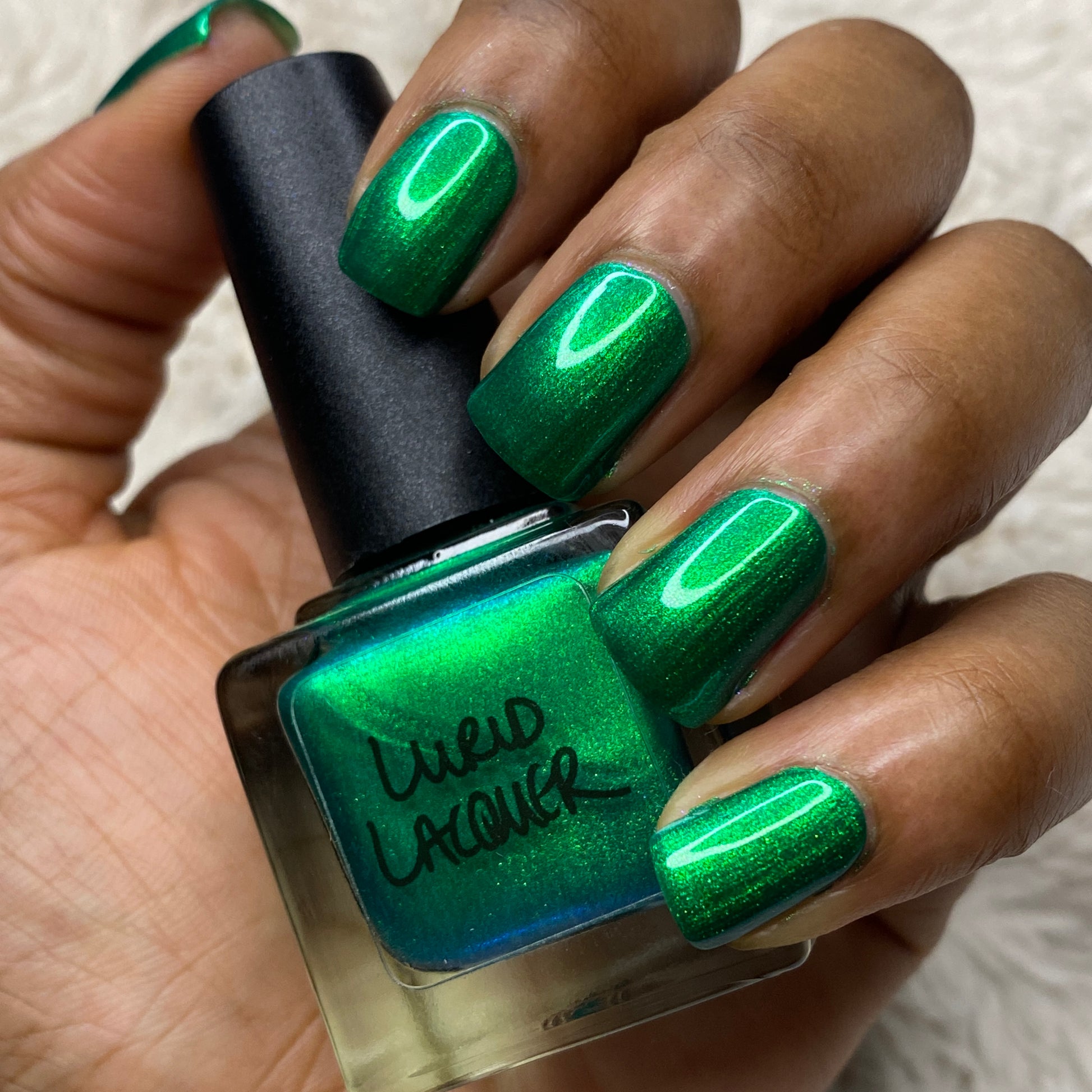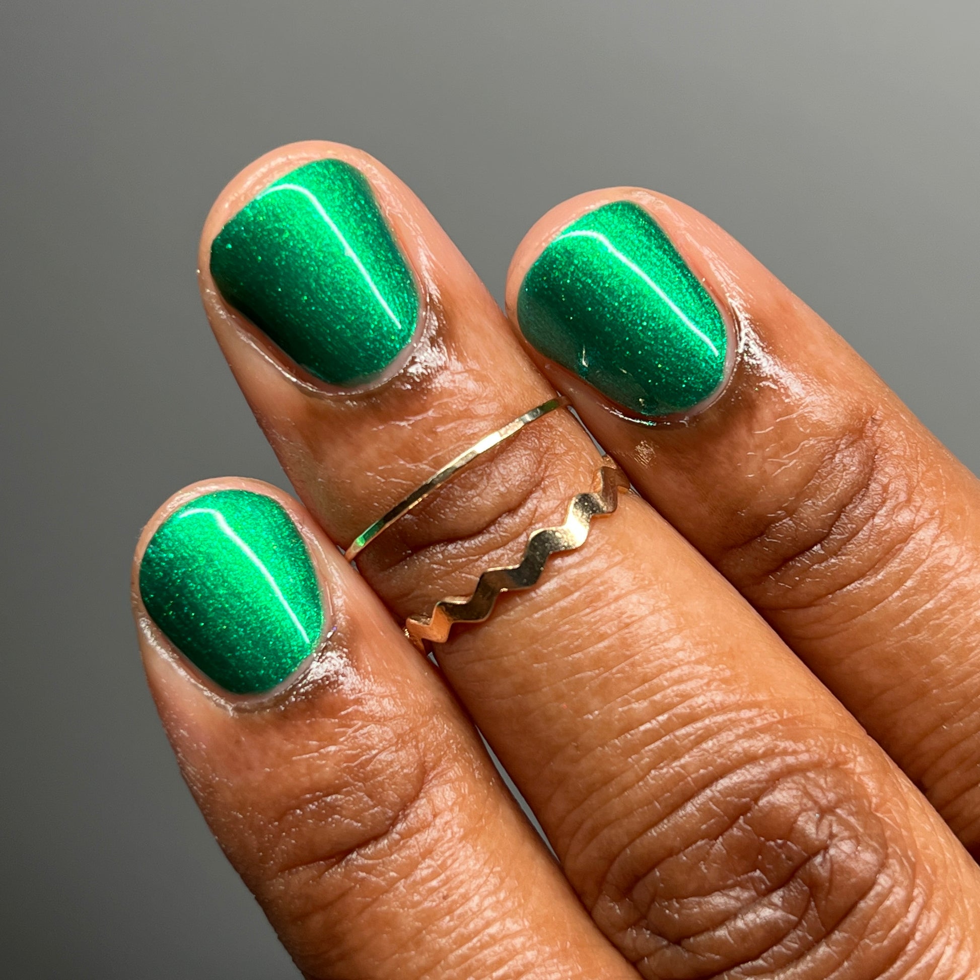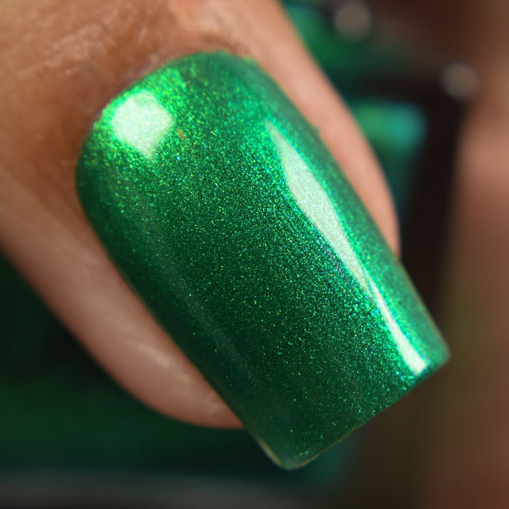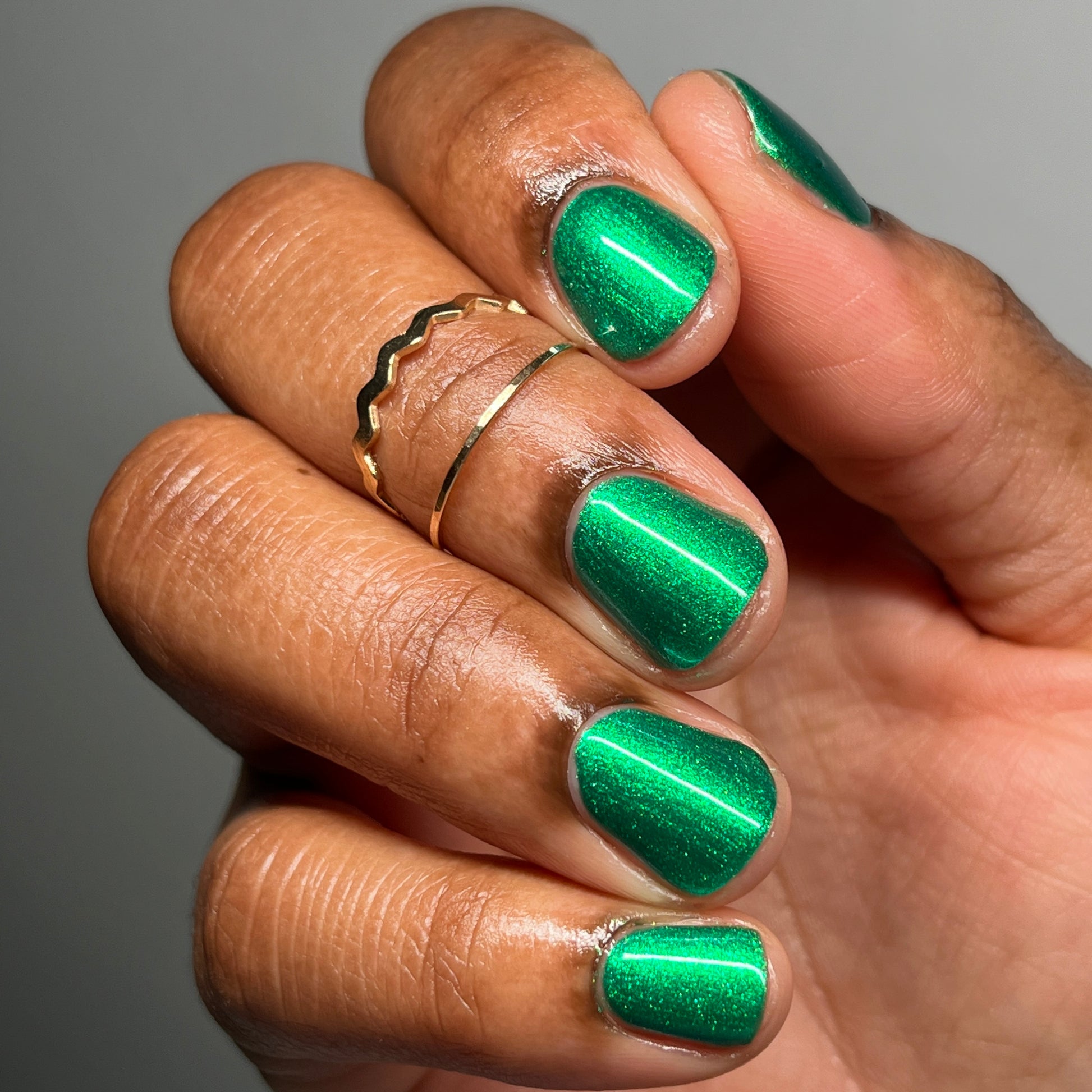 An emerald green base with vibrant green aurora shimmer that shifts subtly to teal