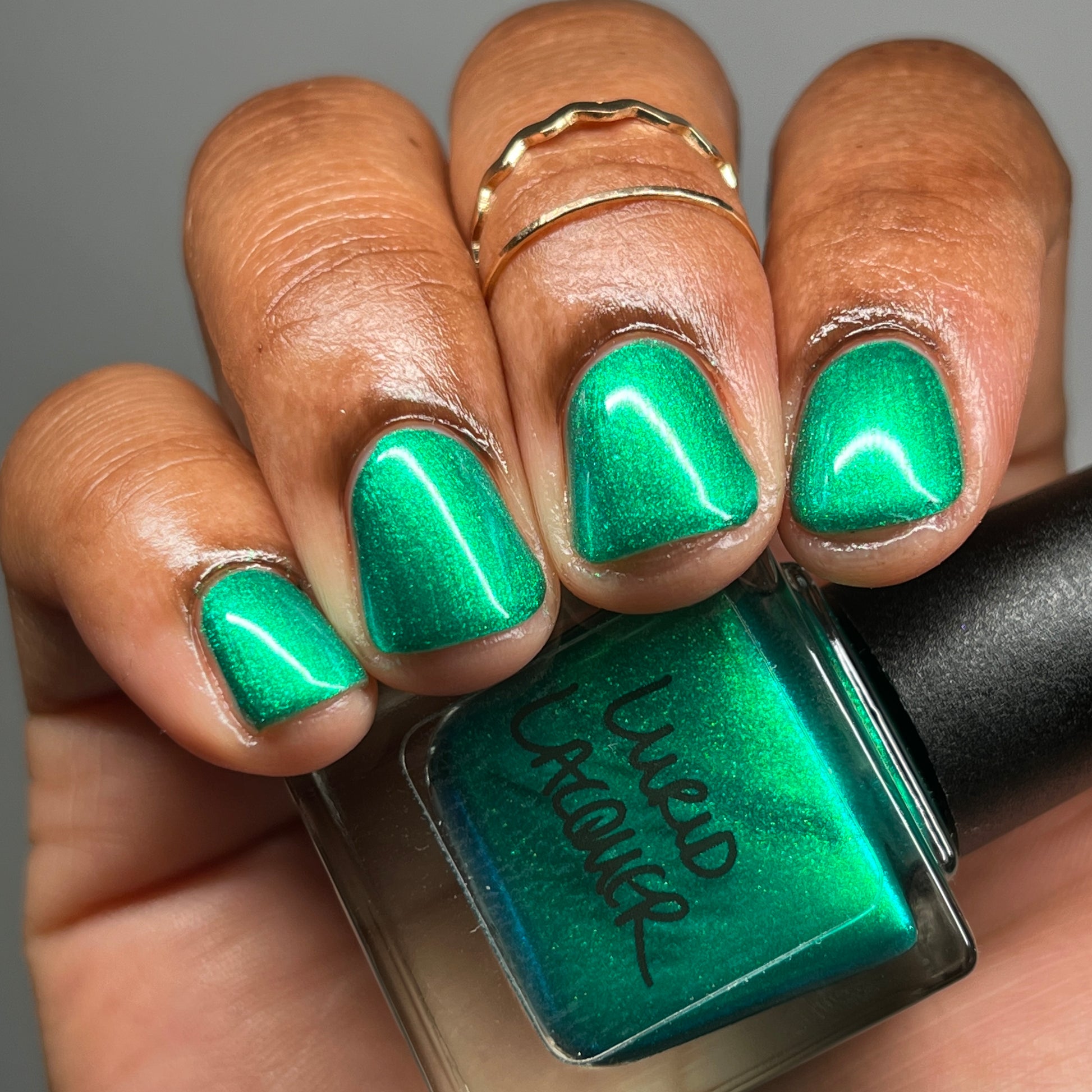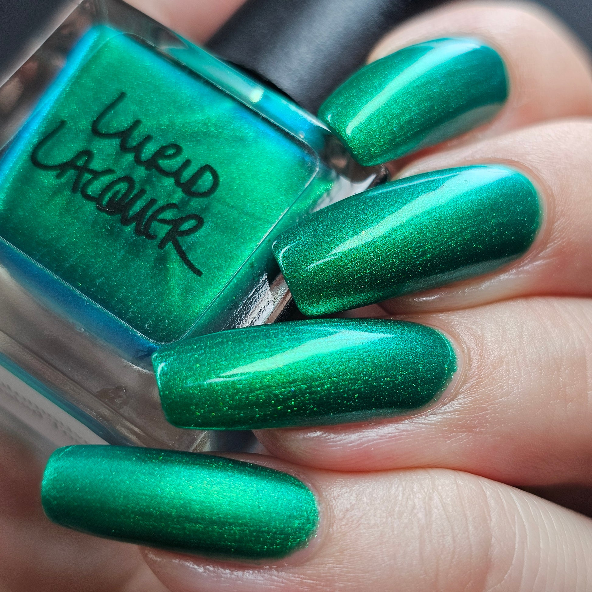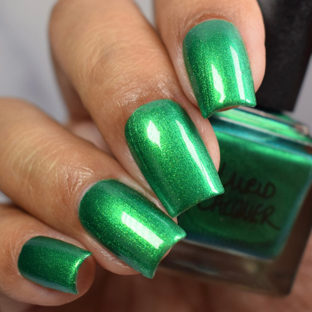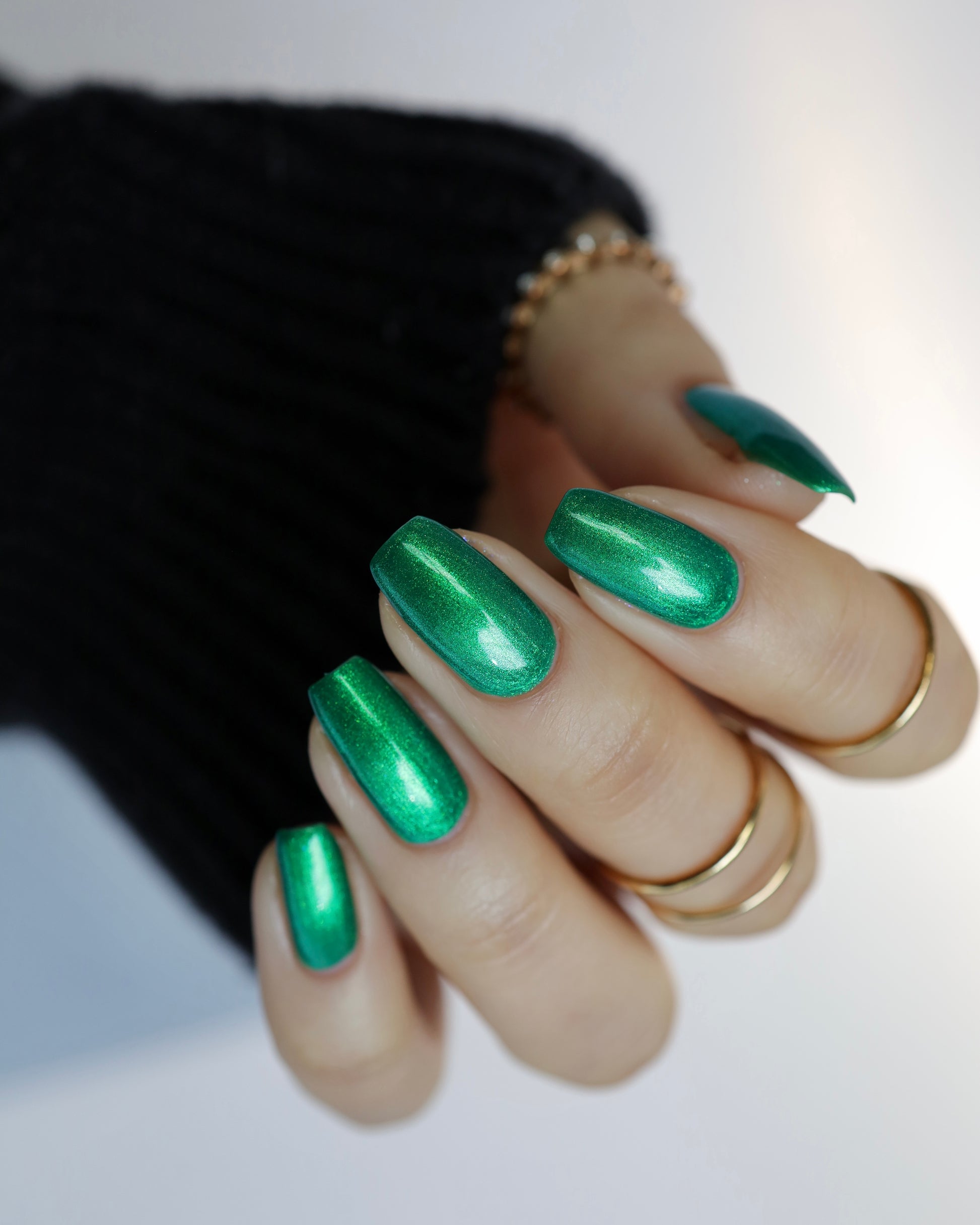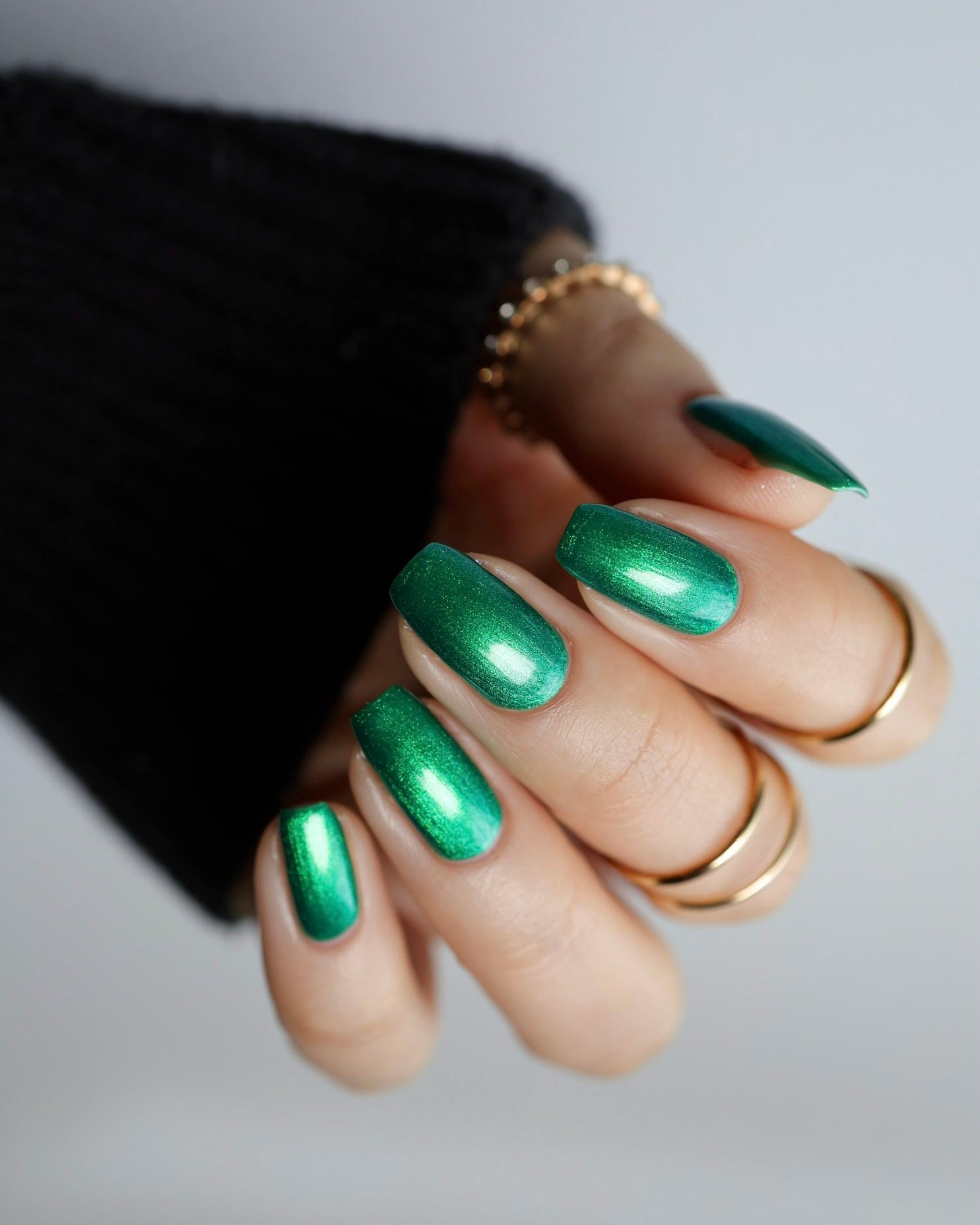 An emerald green base with vibrant green aurora shimmer that shifts subtly to teal