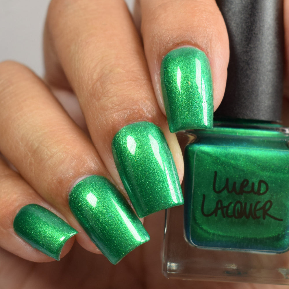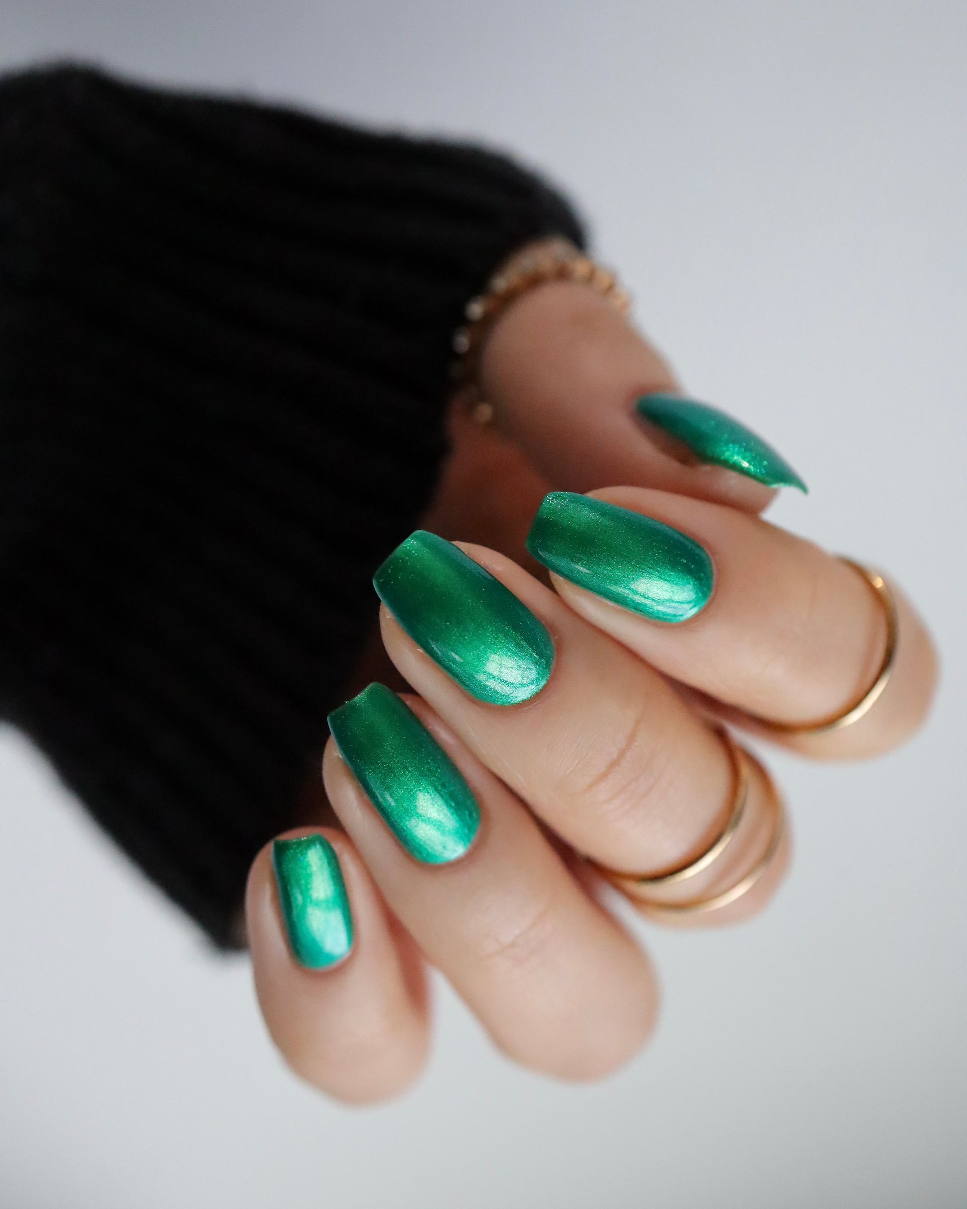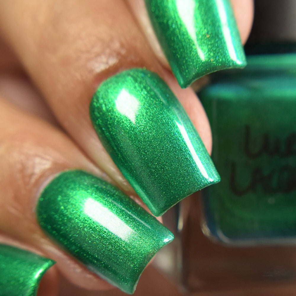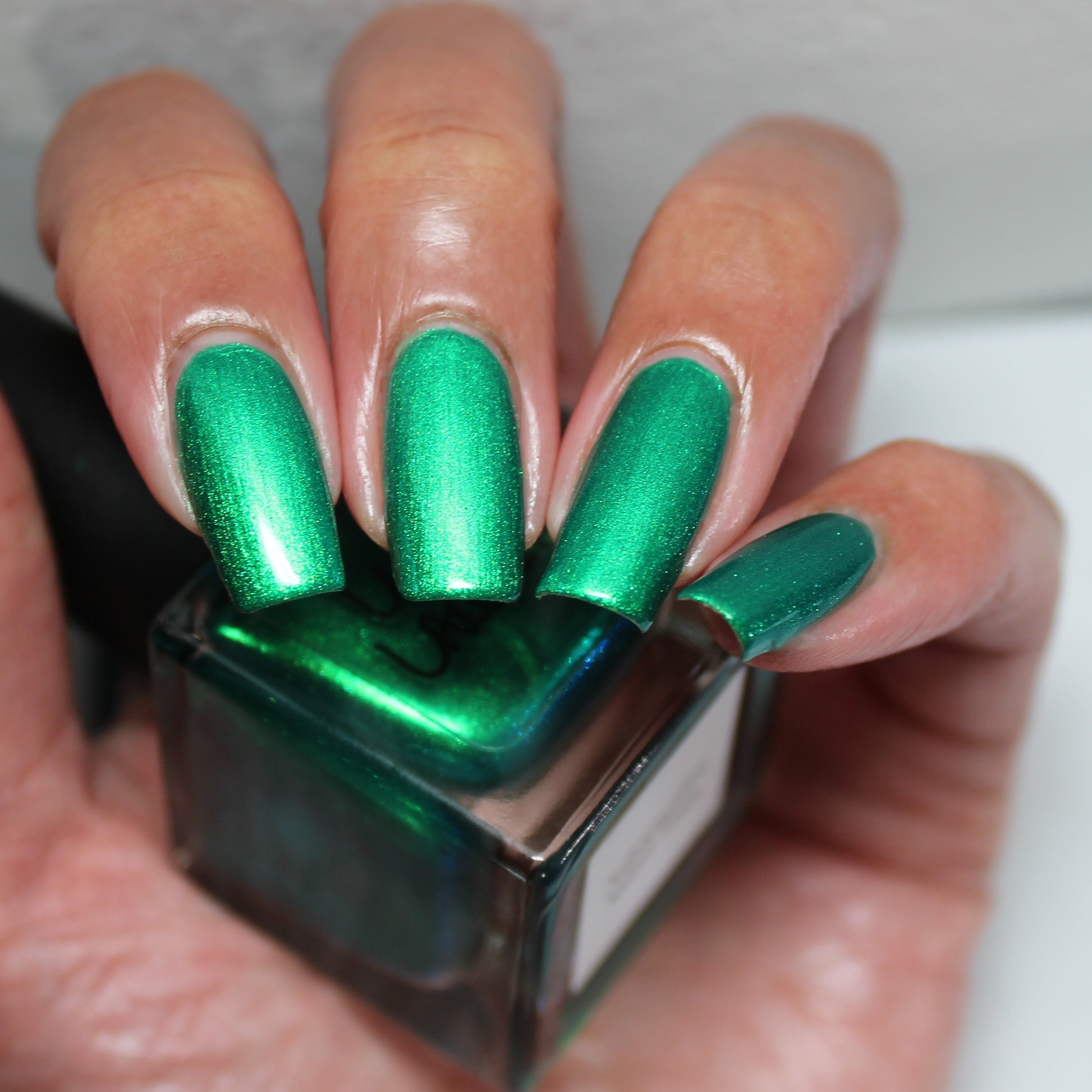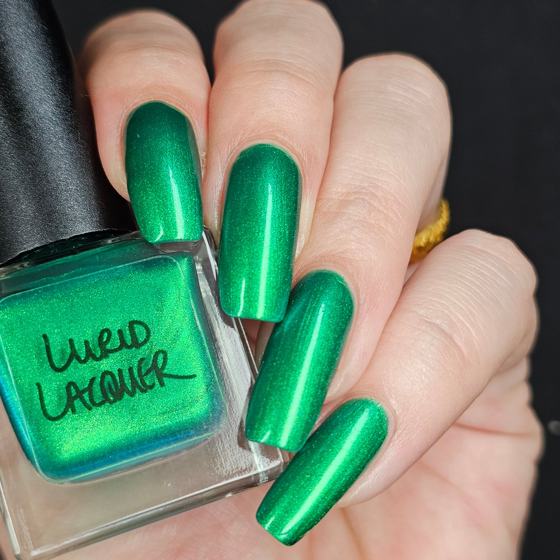 An emerald green base with vibrant green aurora shimmer that shifts subtly to teal