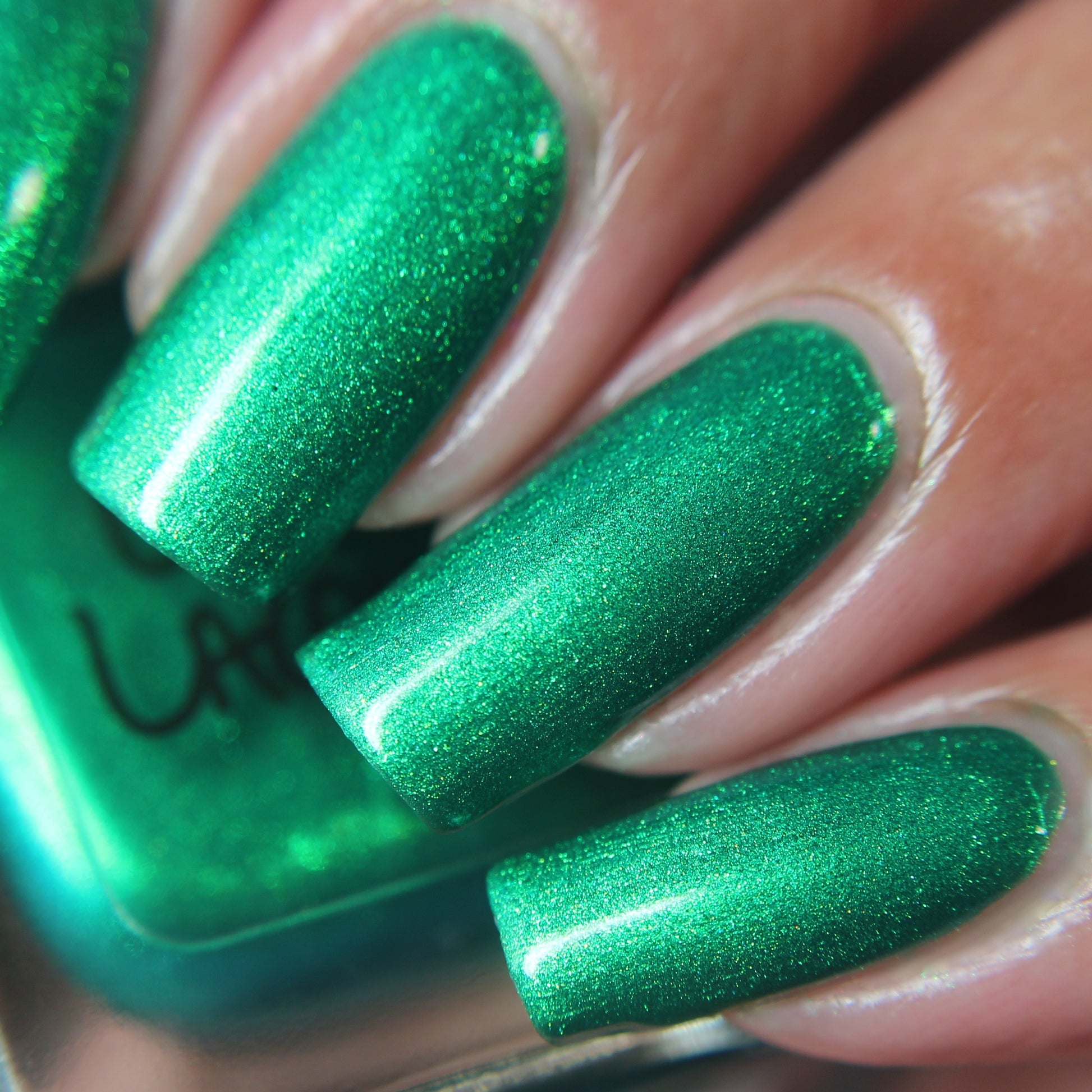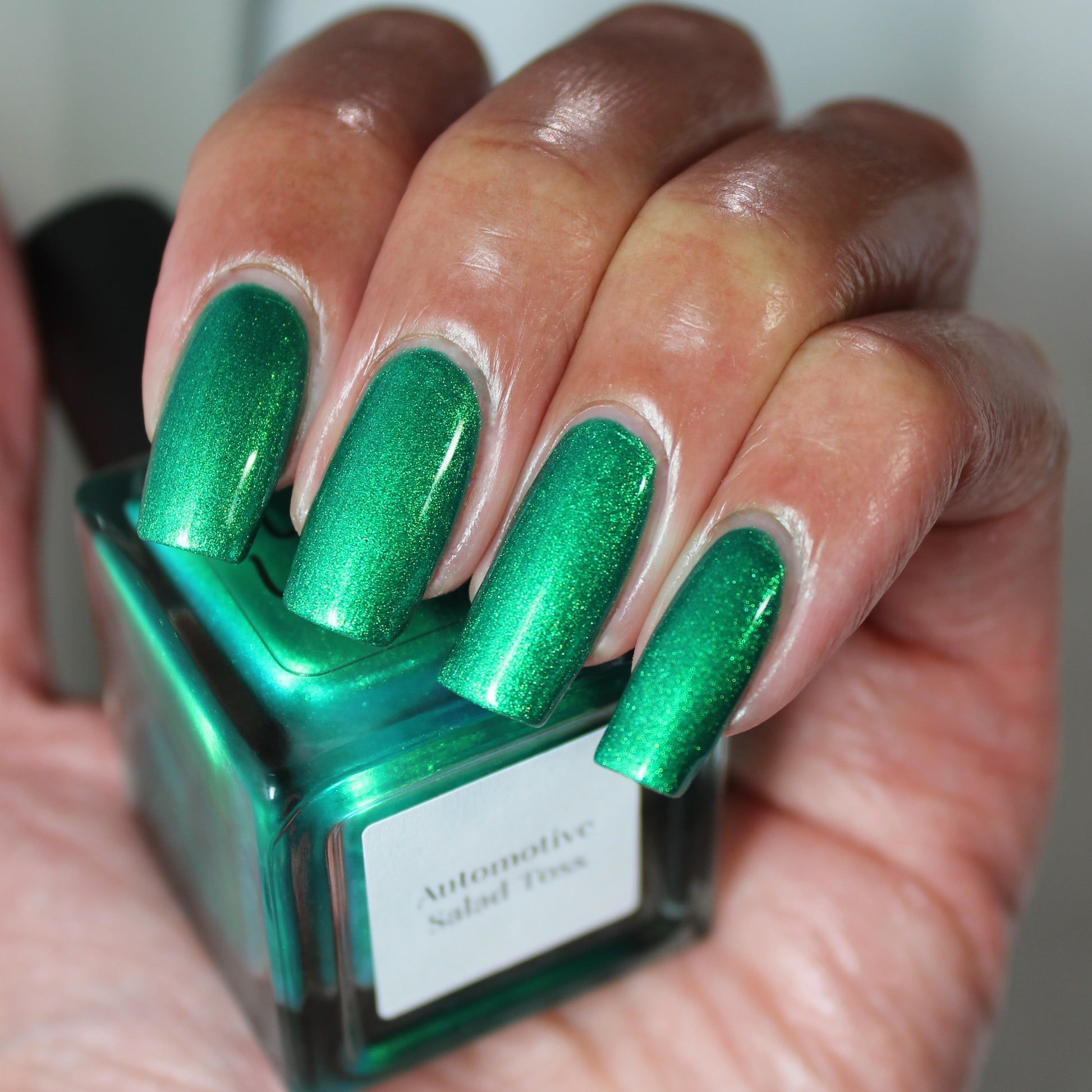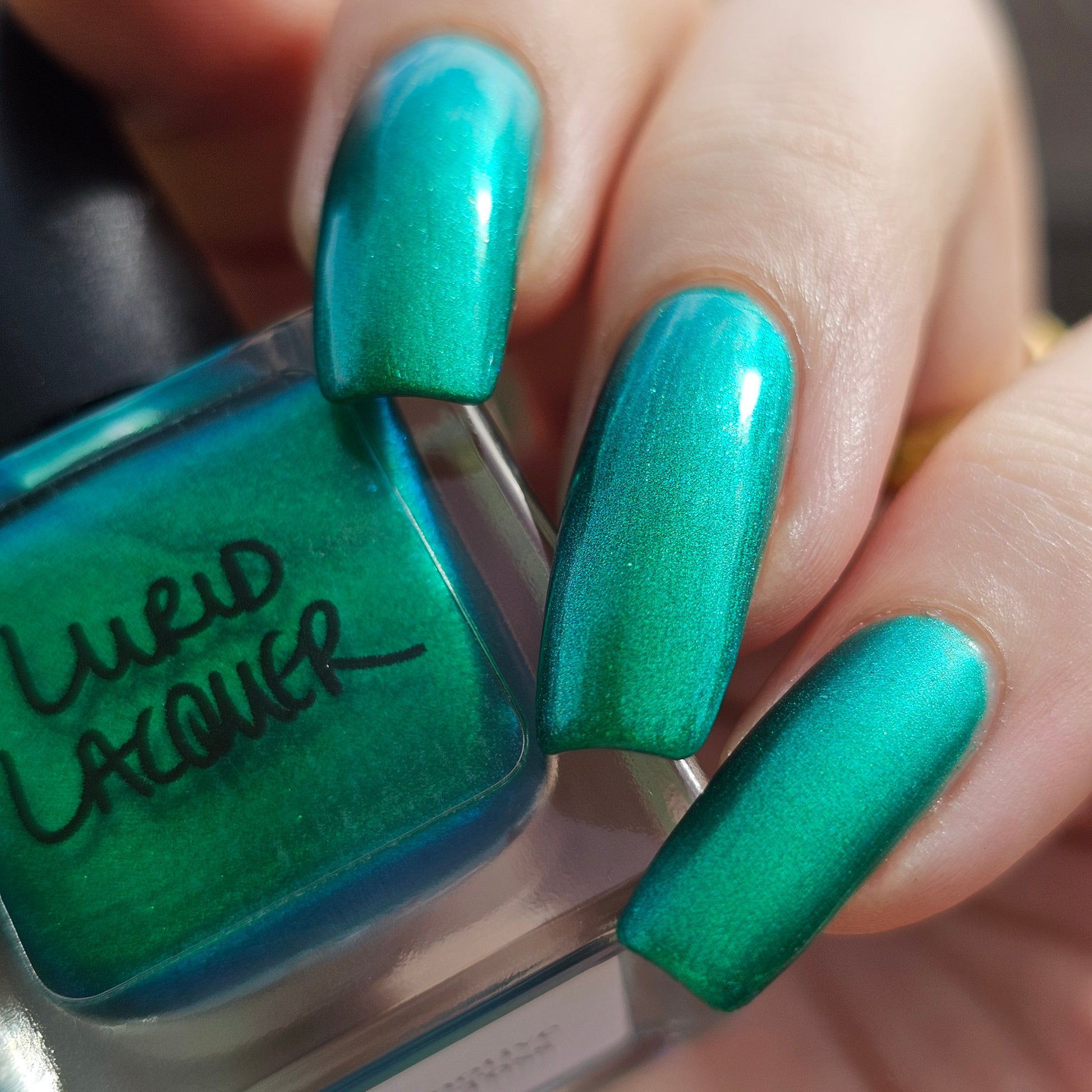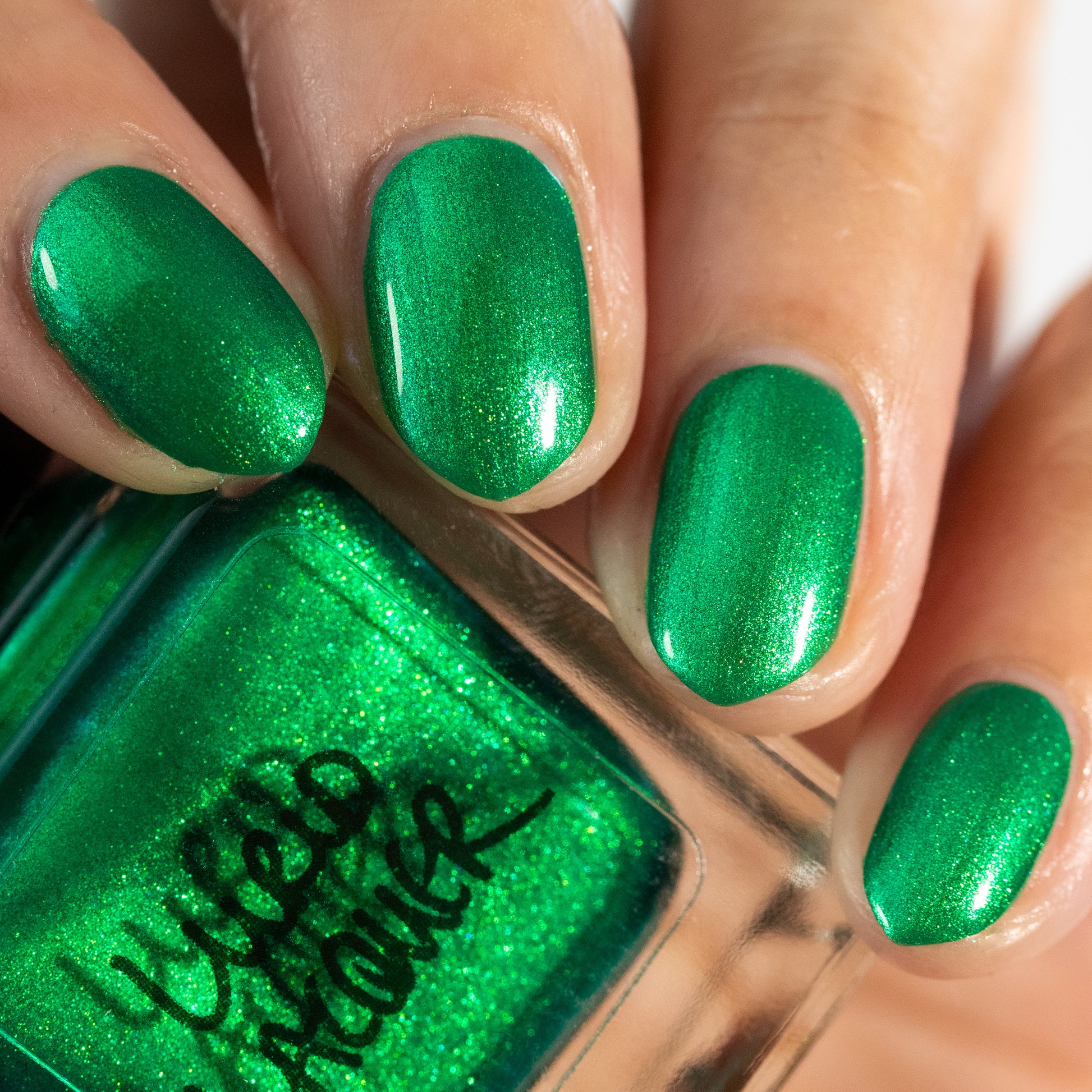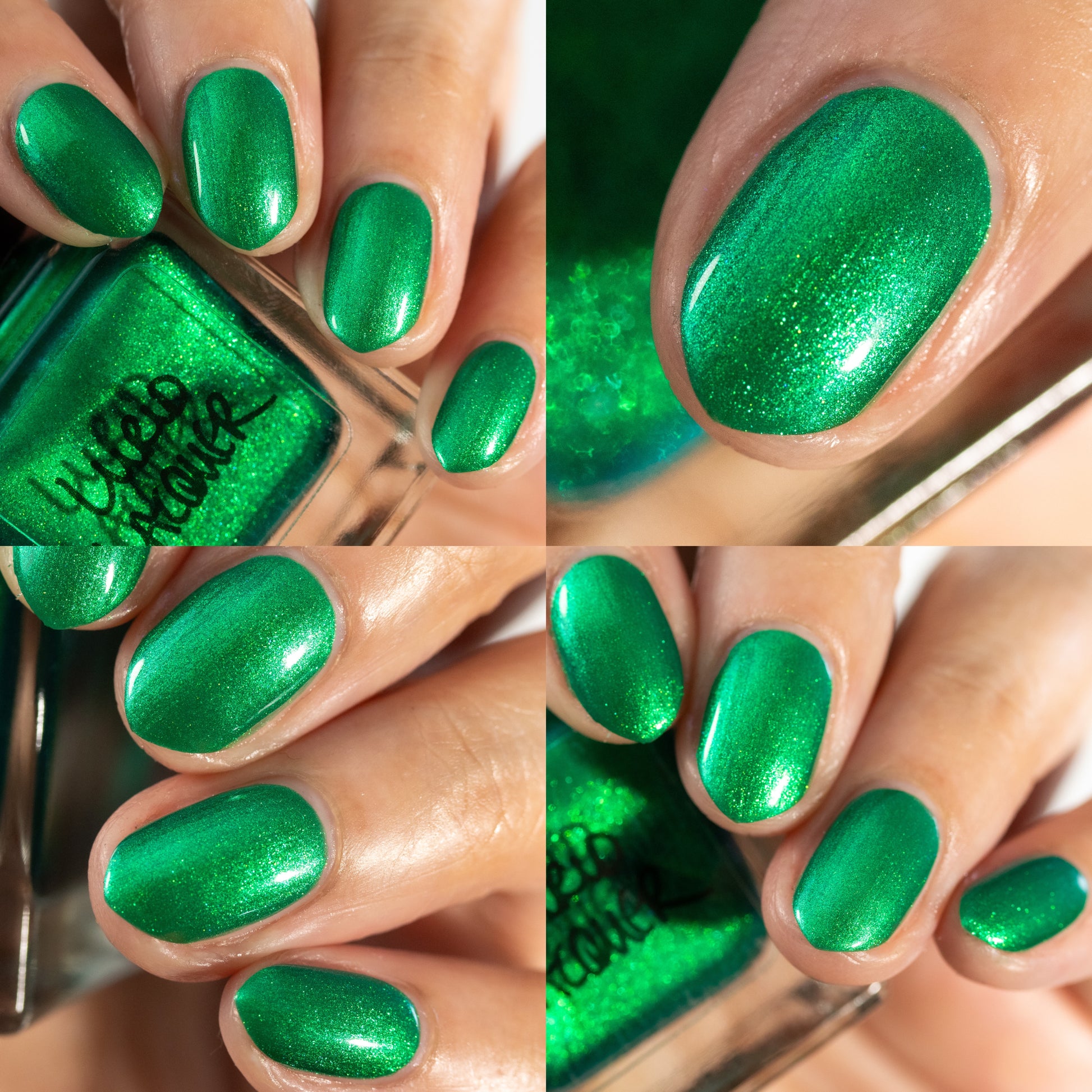 An emerald green base with vibrant green aurora shimmer that shifts subtly to teal