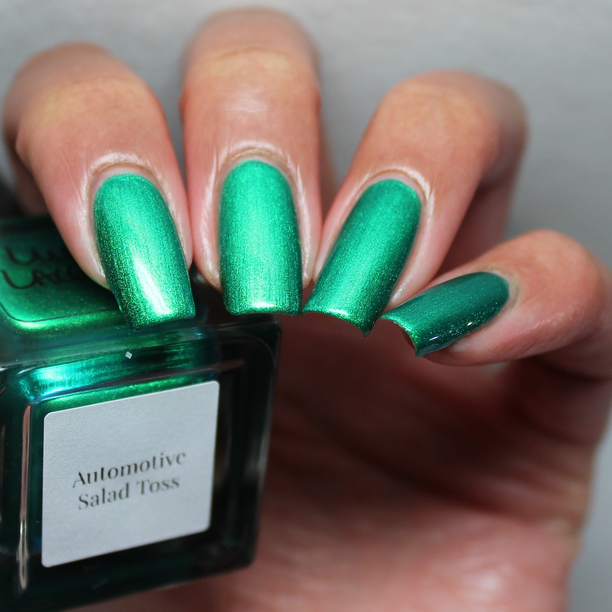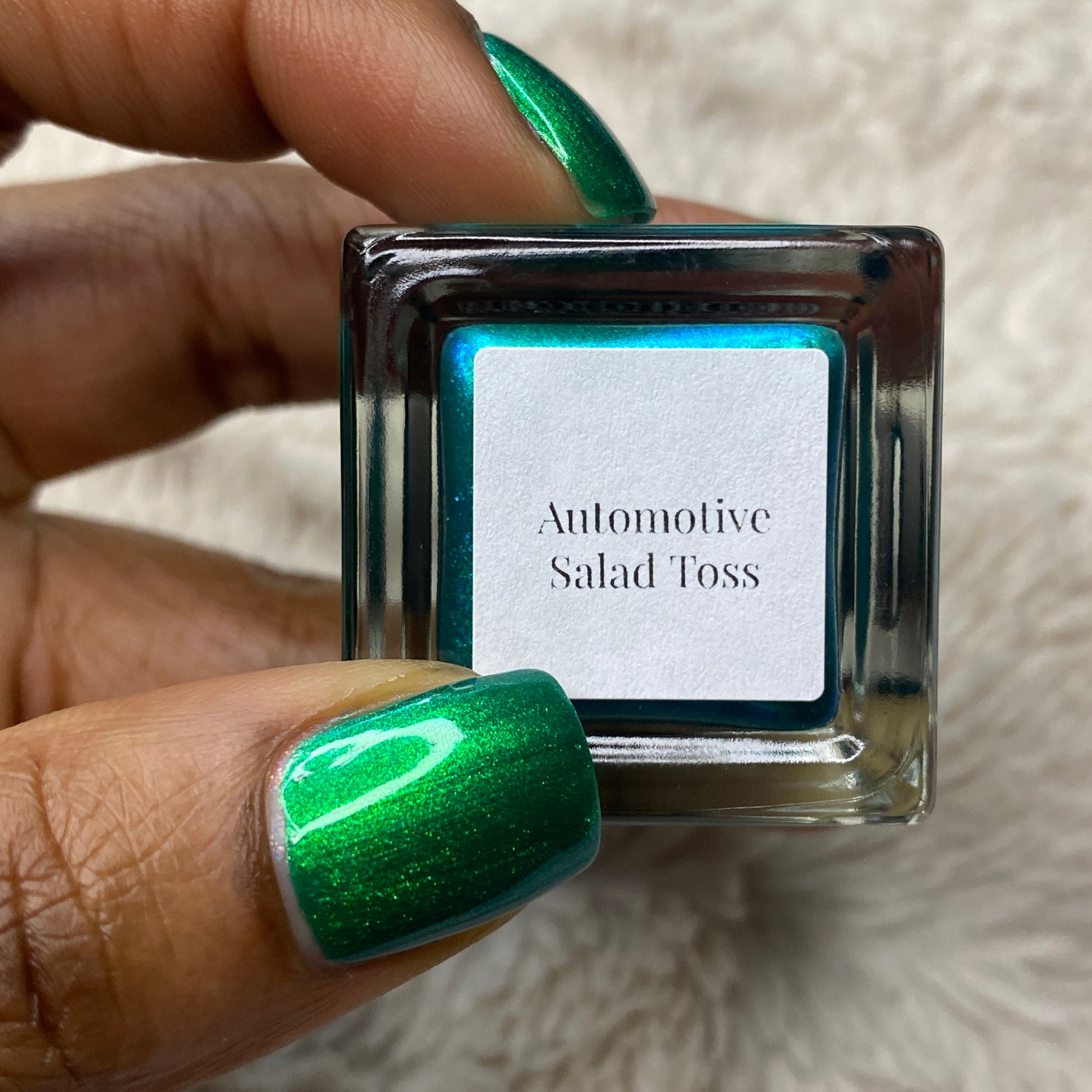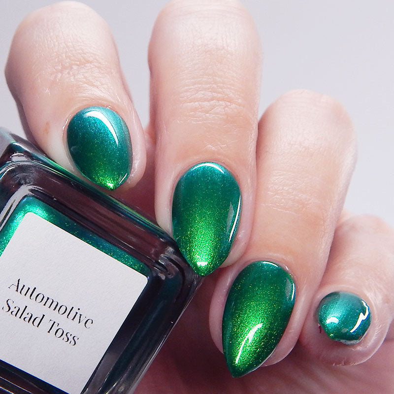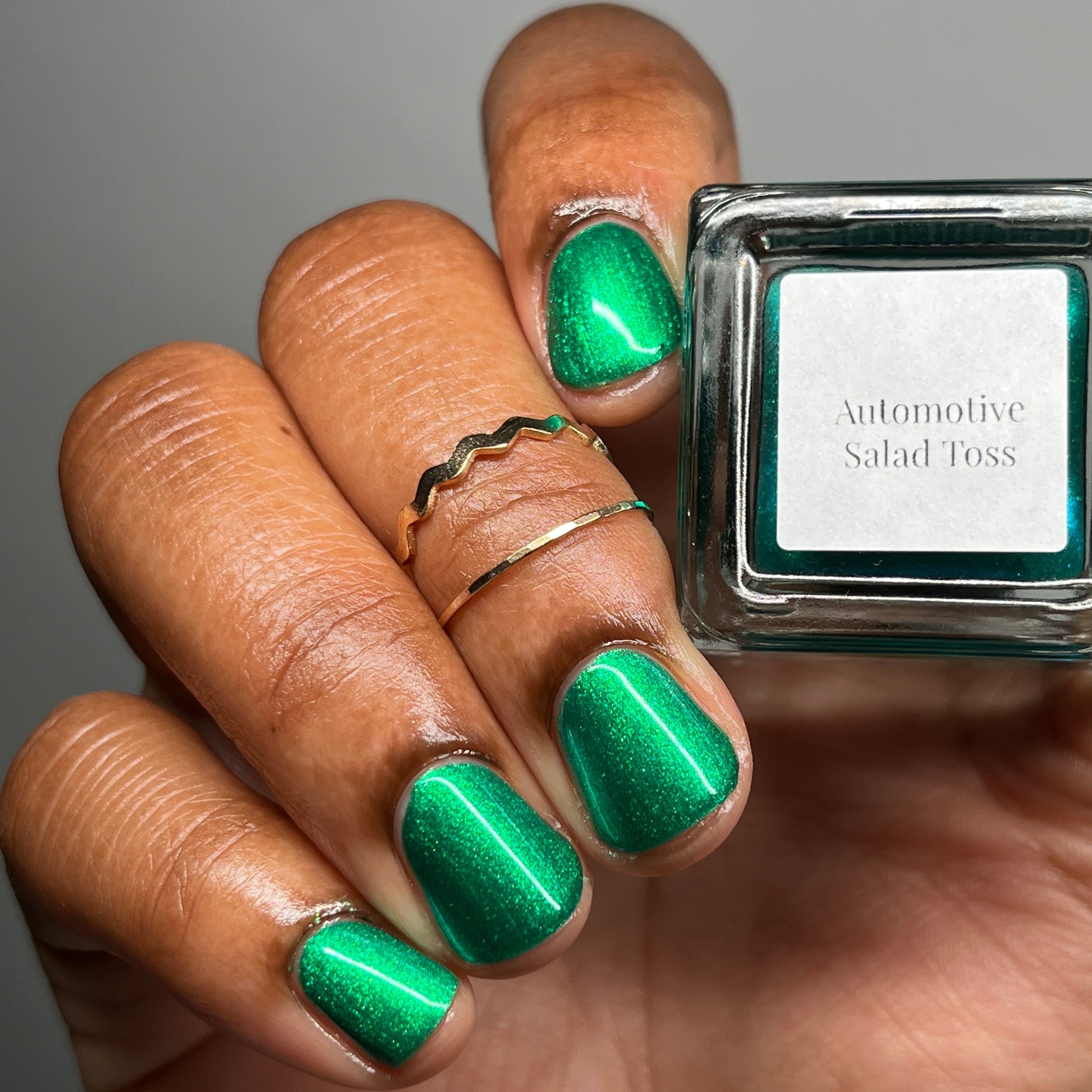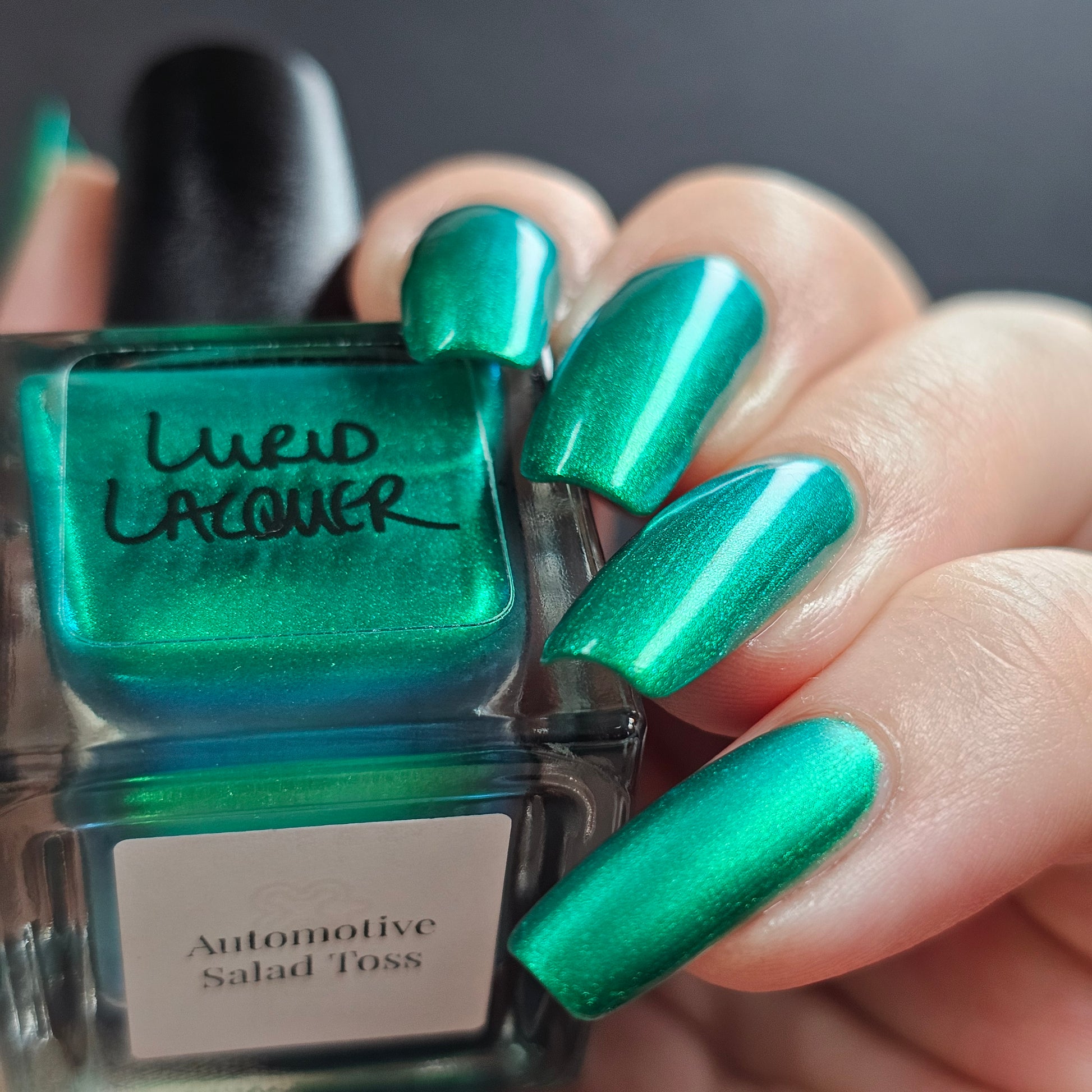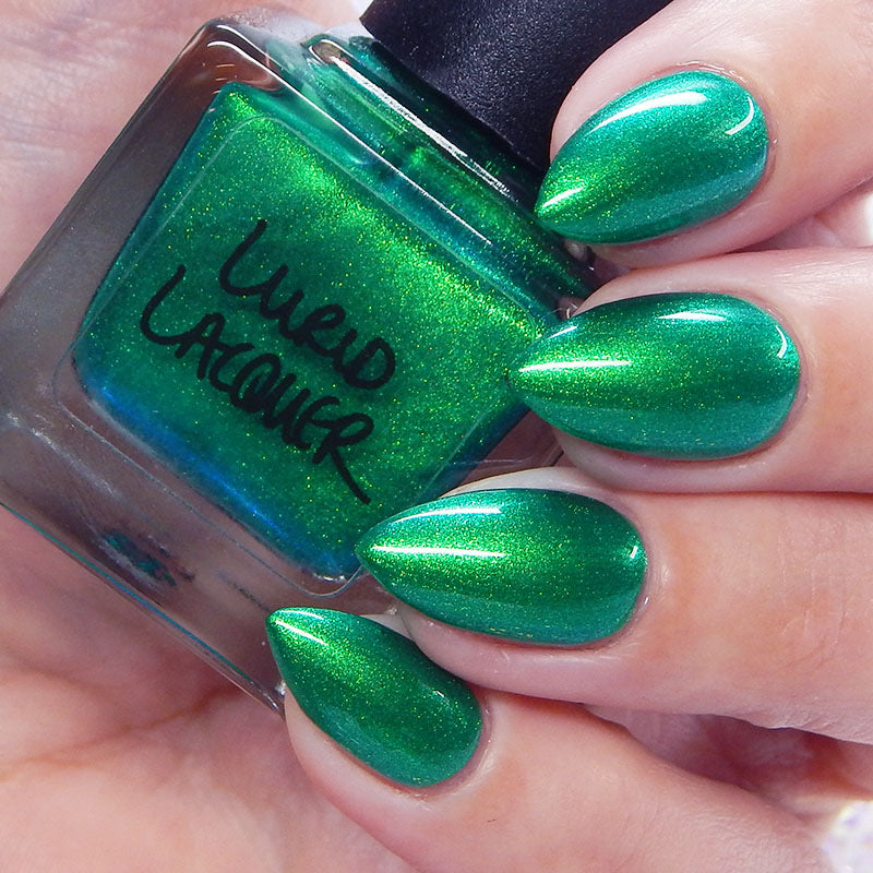 An emerald green base with vibrant green aurora shimmer that shifts subtly to teal