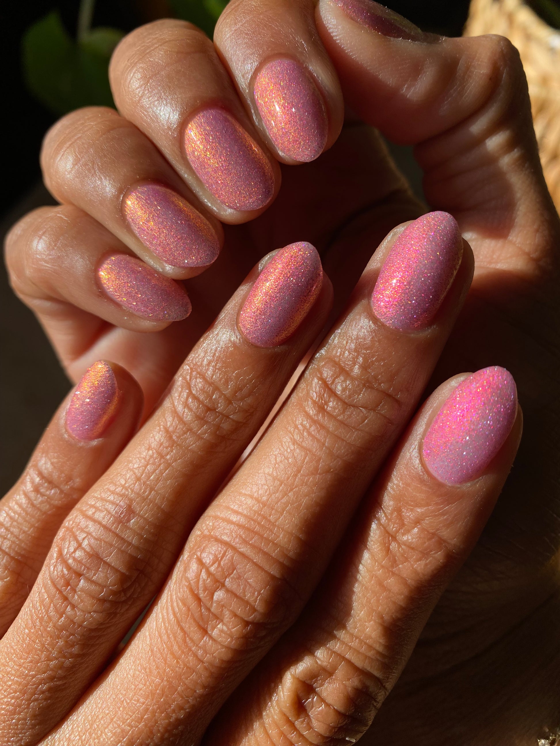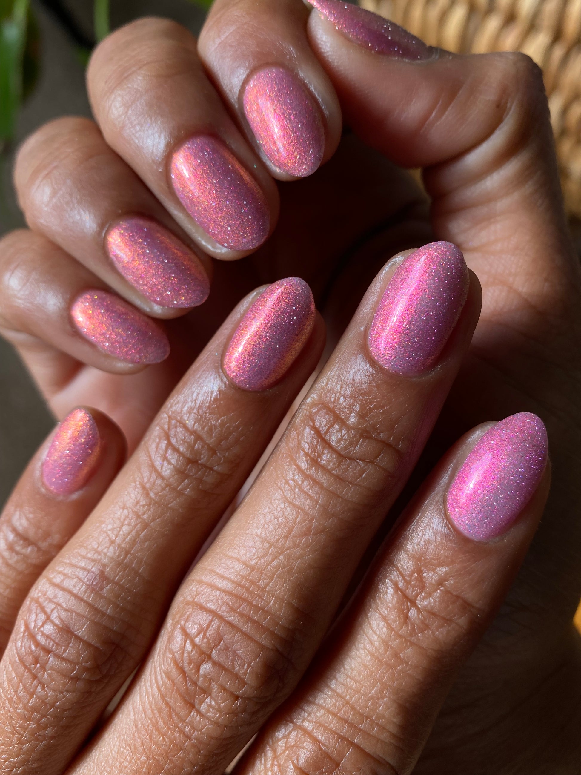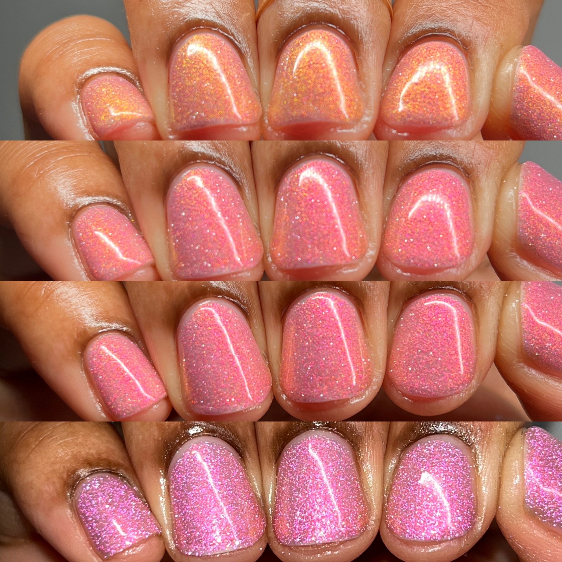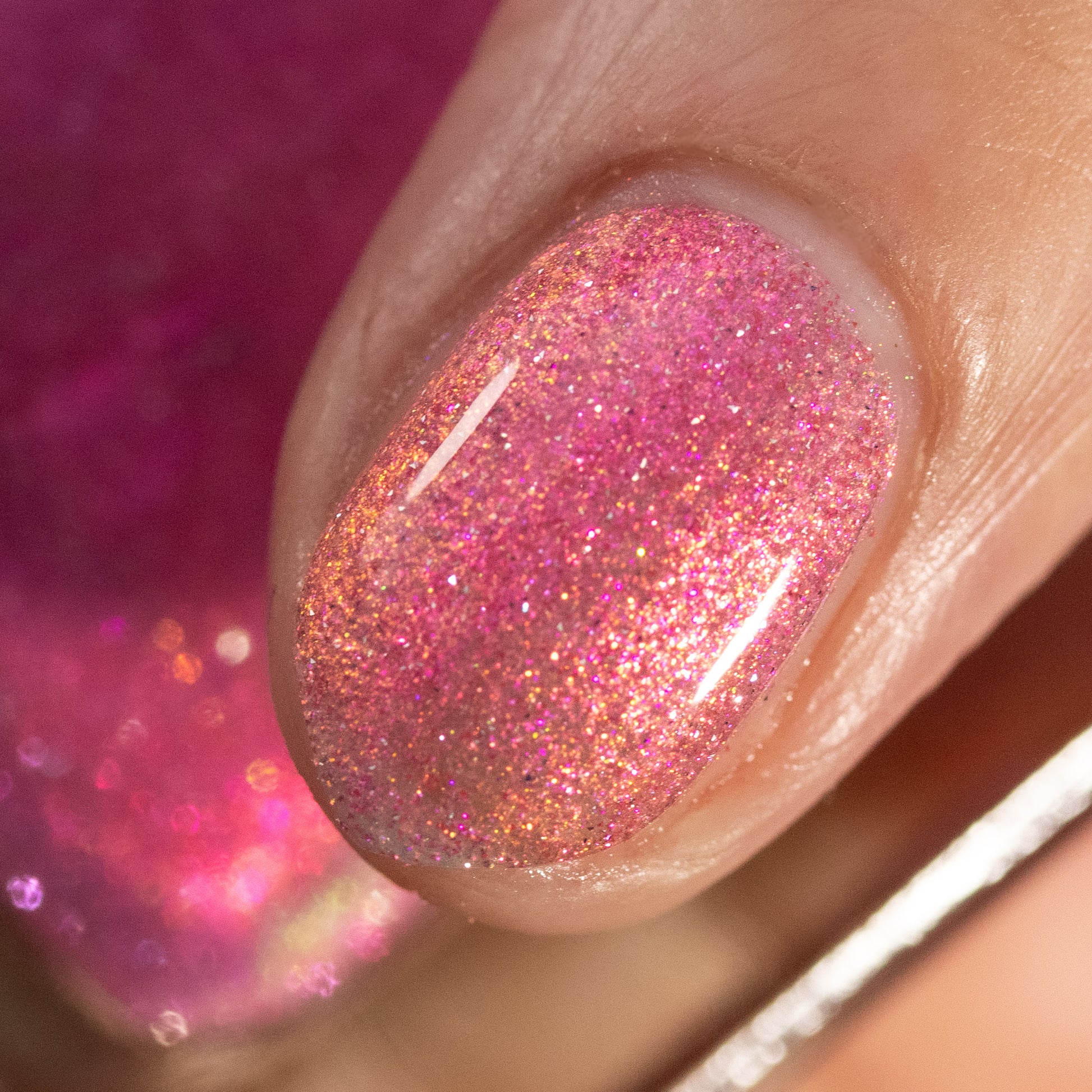 A pink jelly base with vibrant pink to orange to gold shimmer and pink reflective glitter