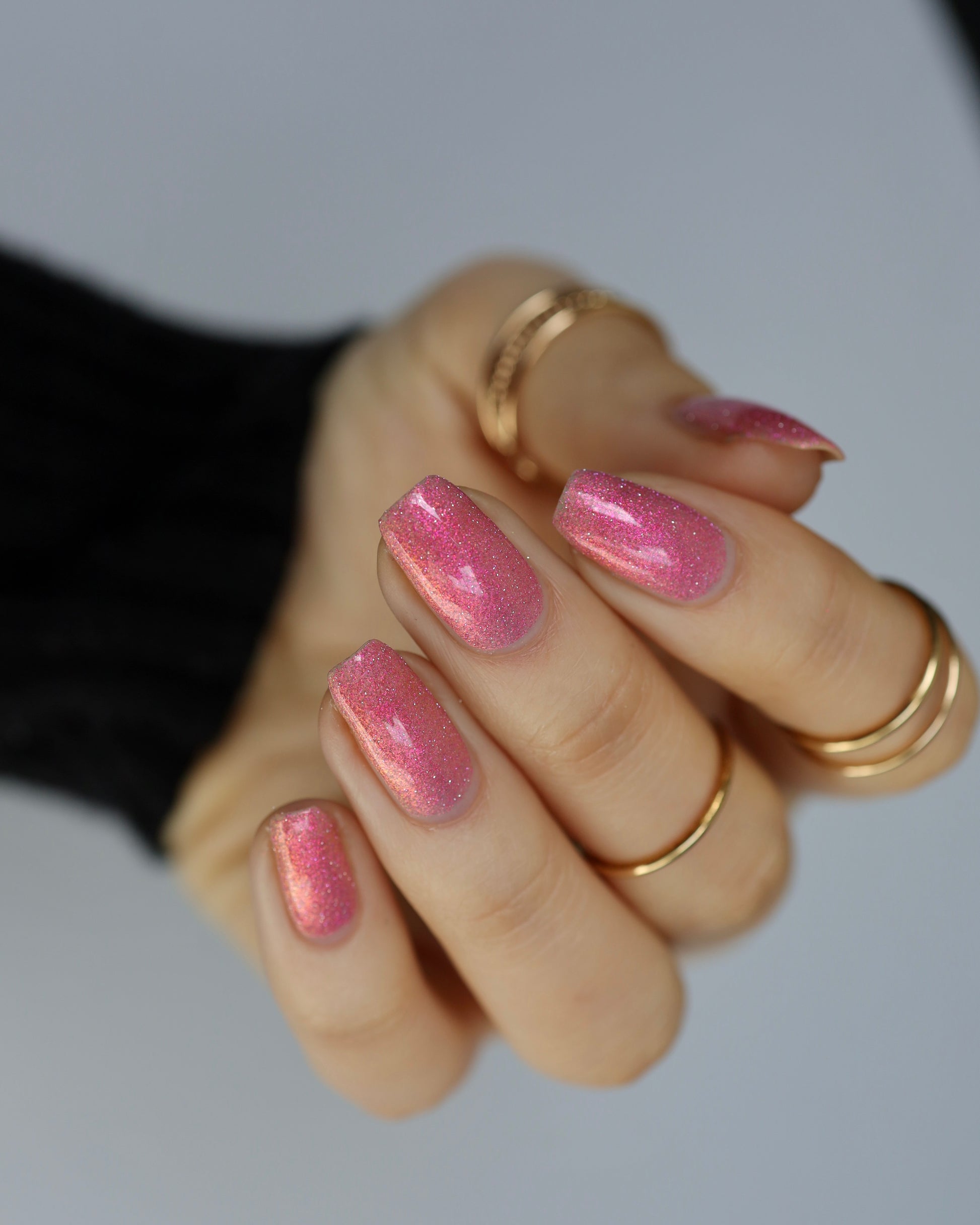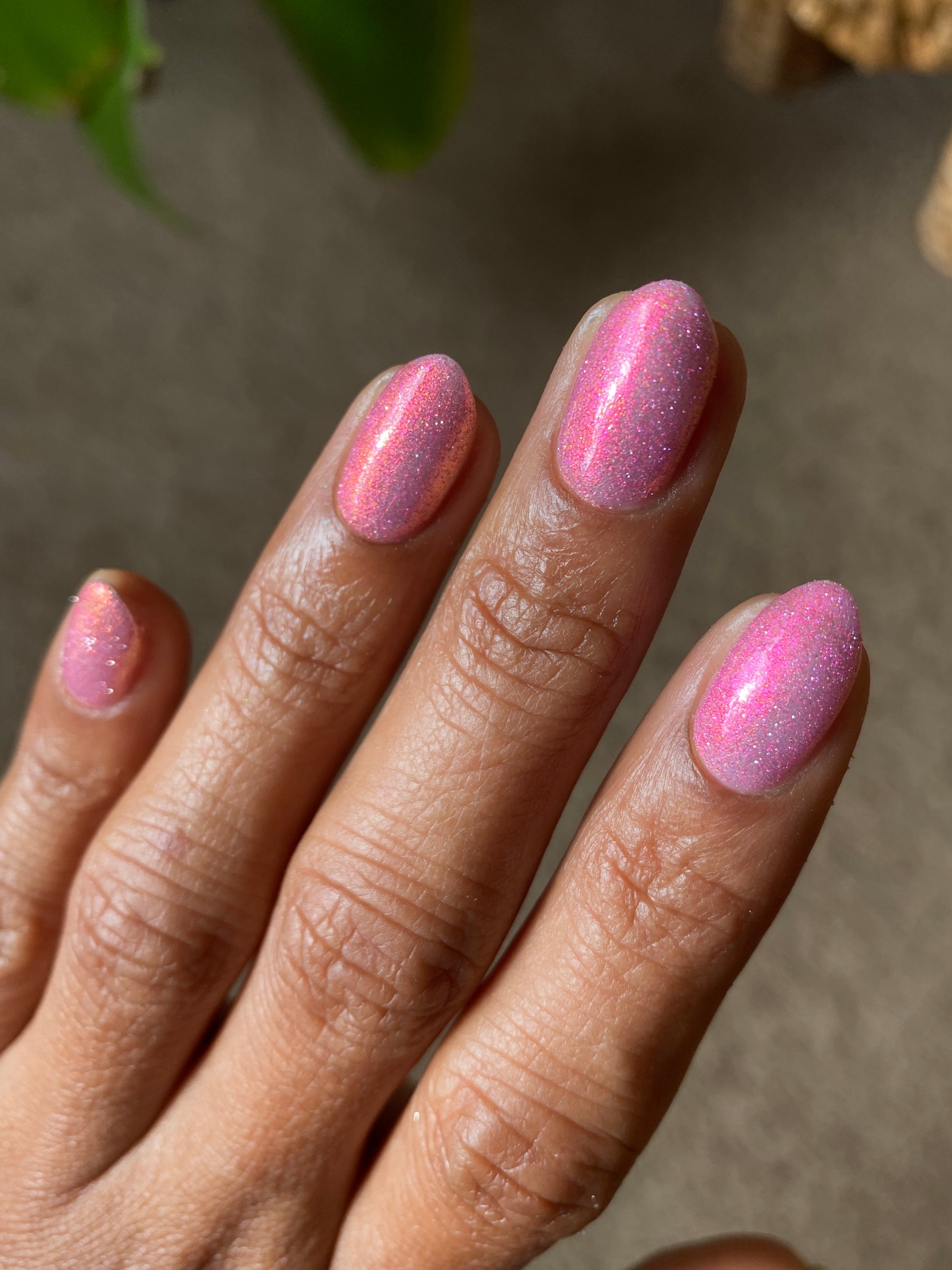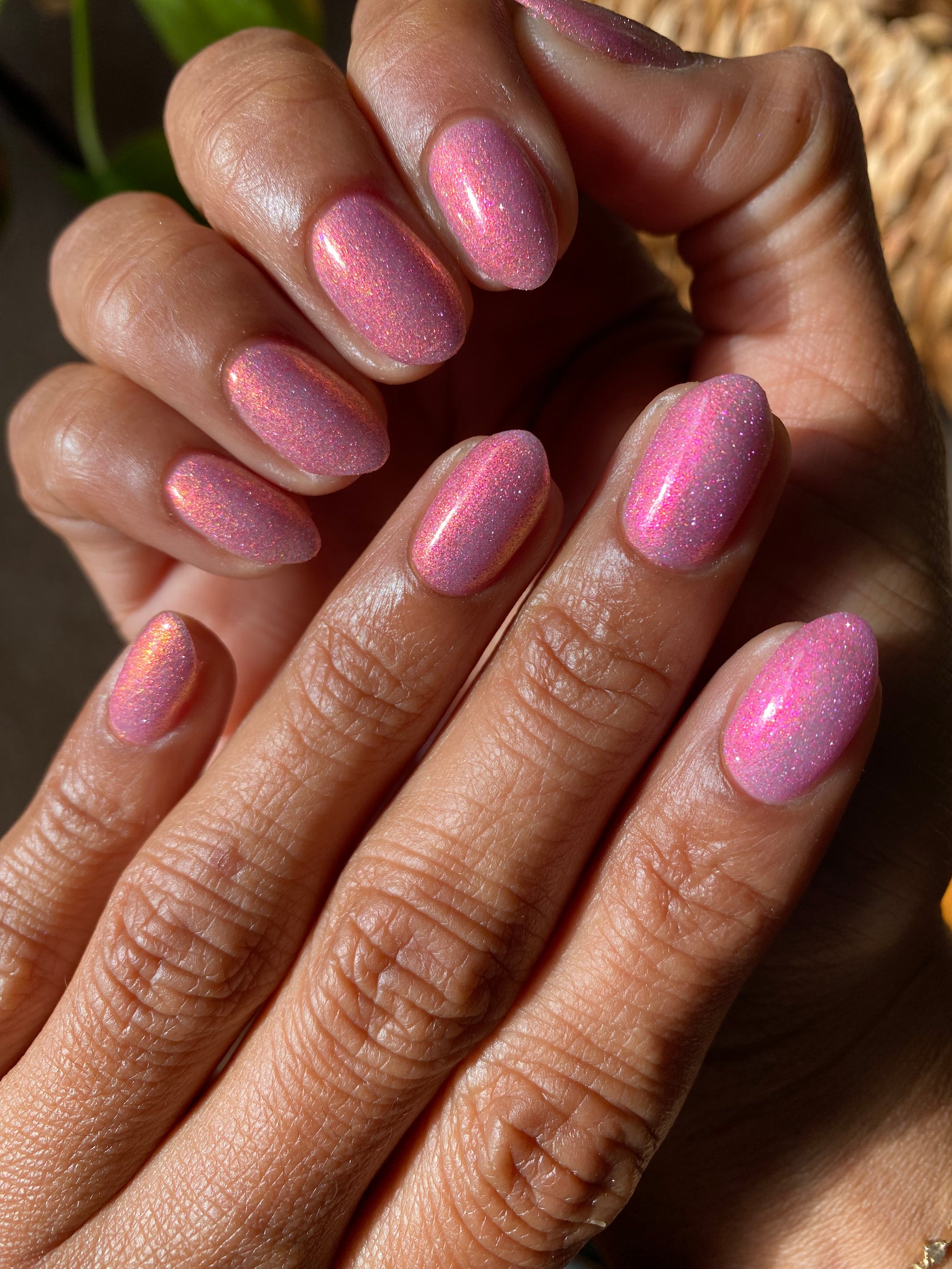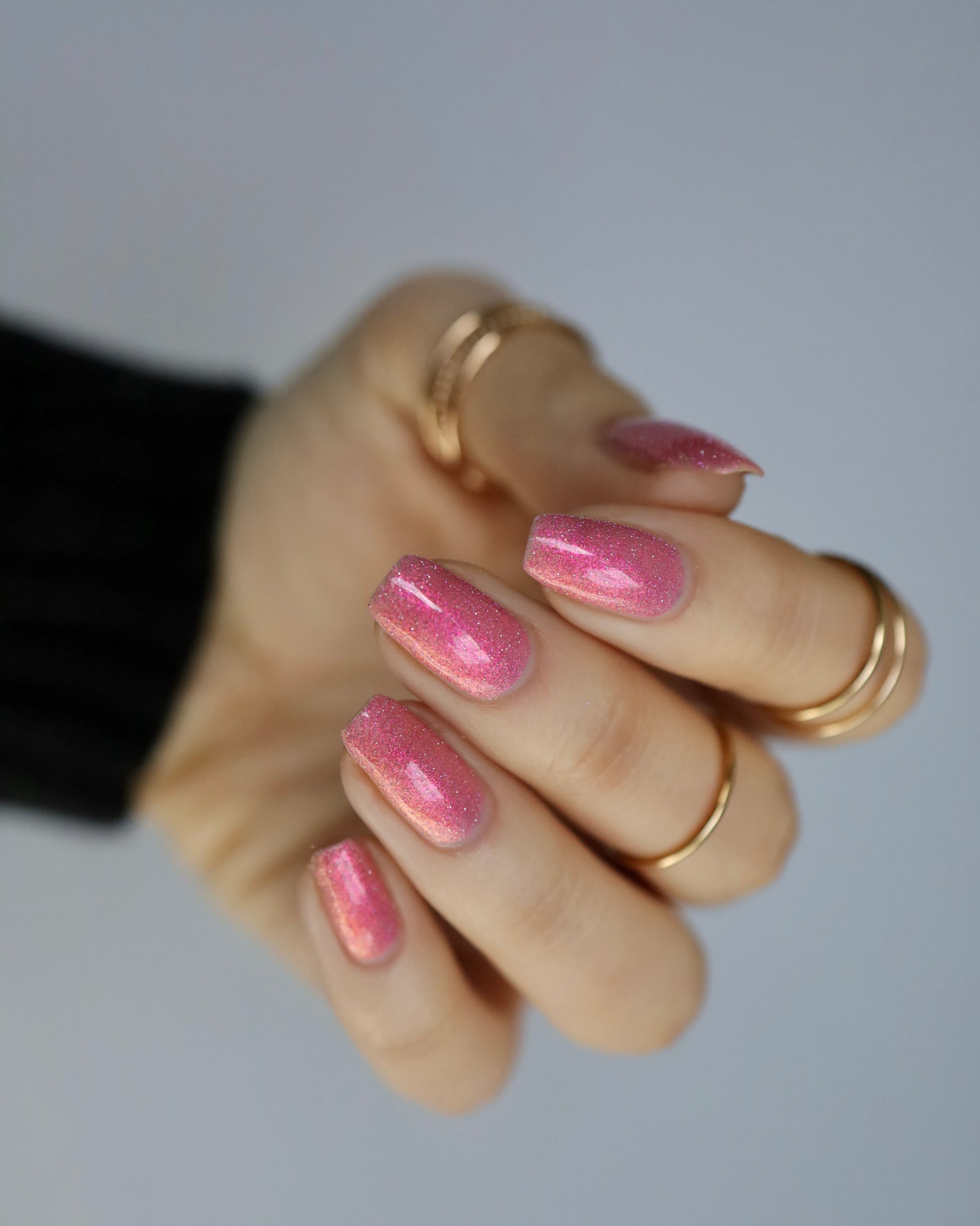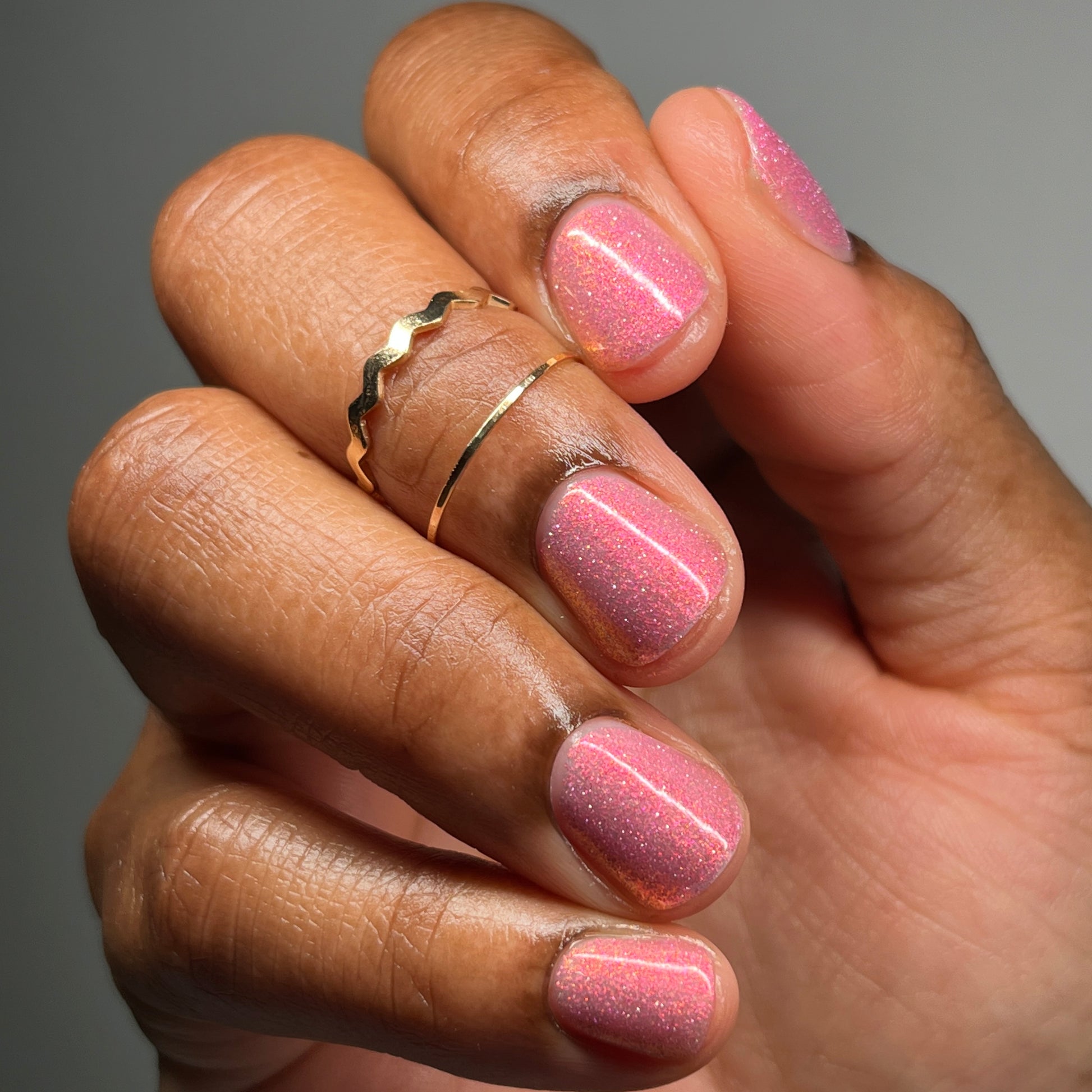 A pink jelly base with vibrant pink to orange to gold shimmer and pink reflective glitter