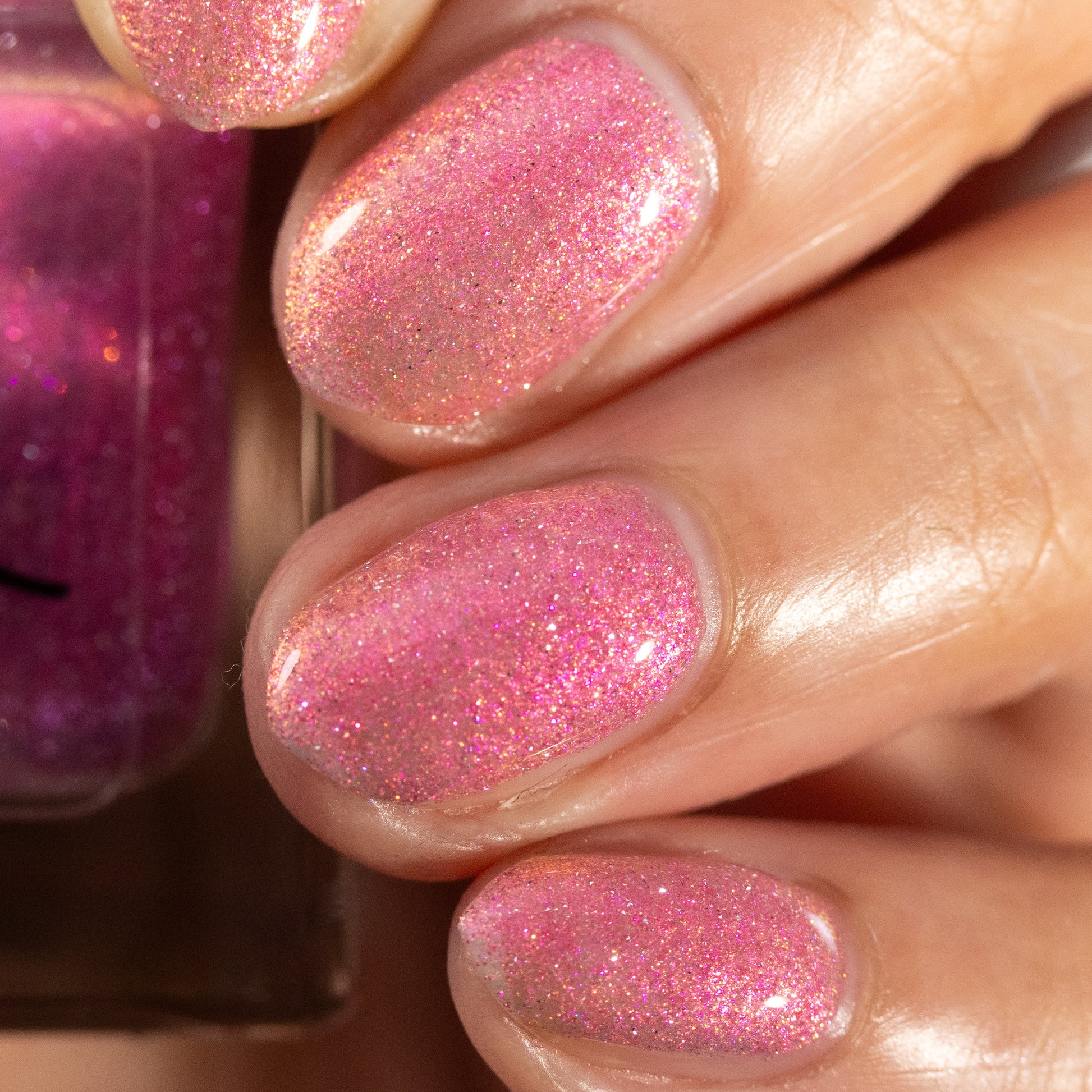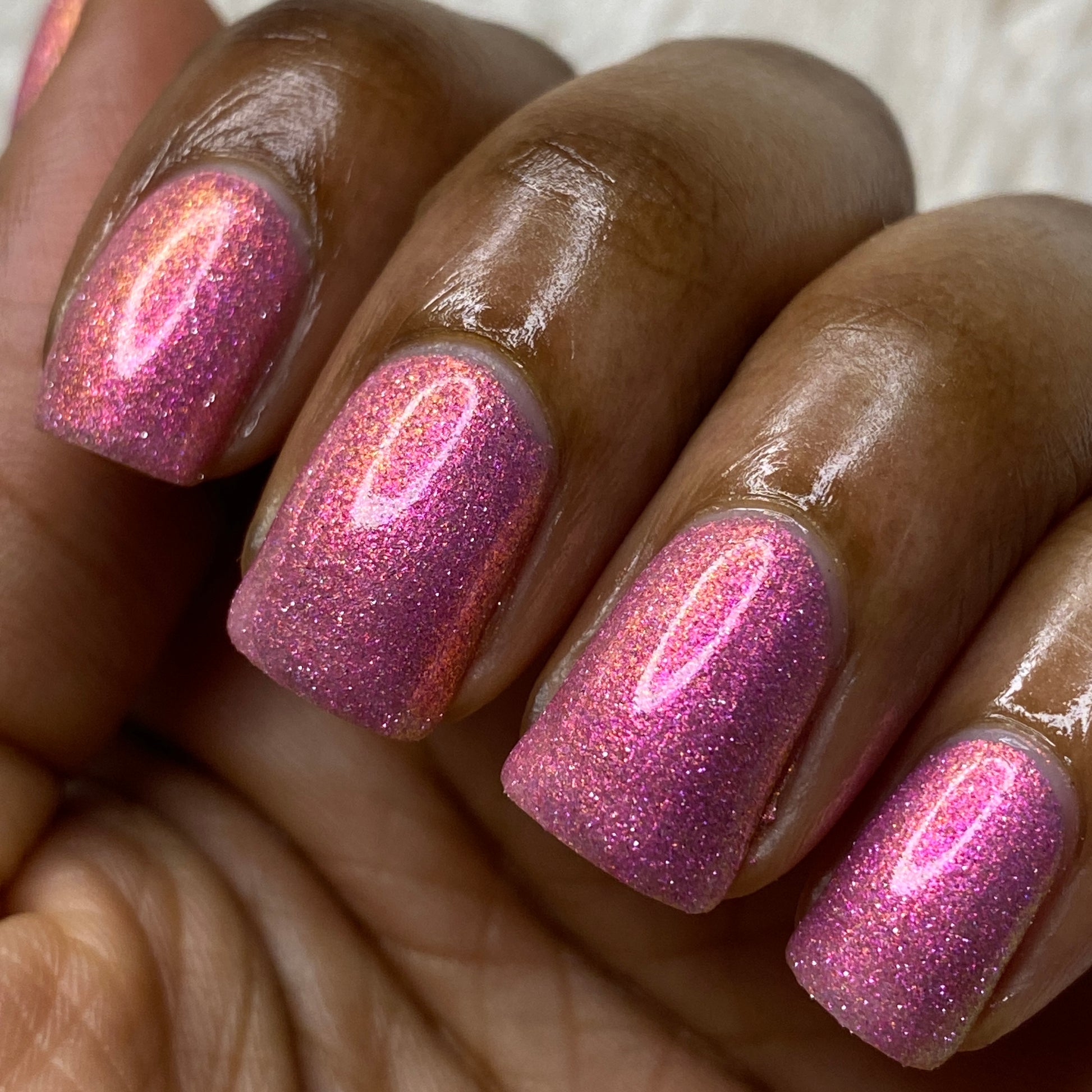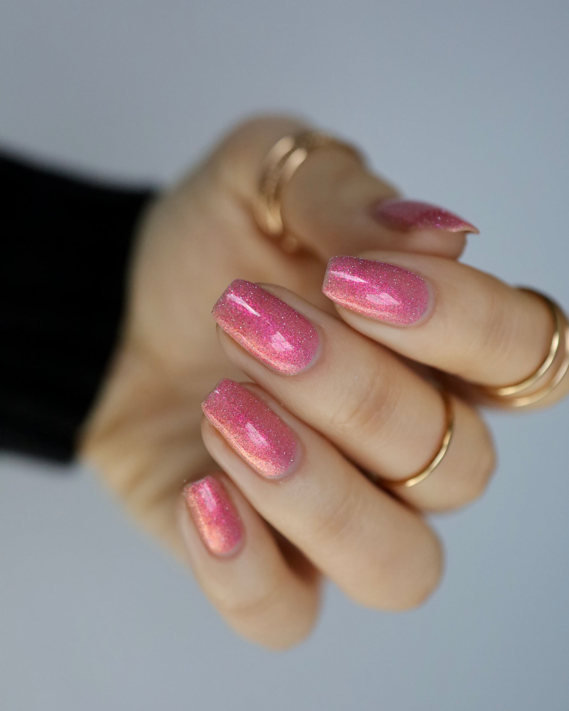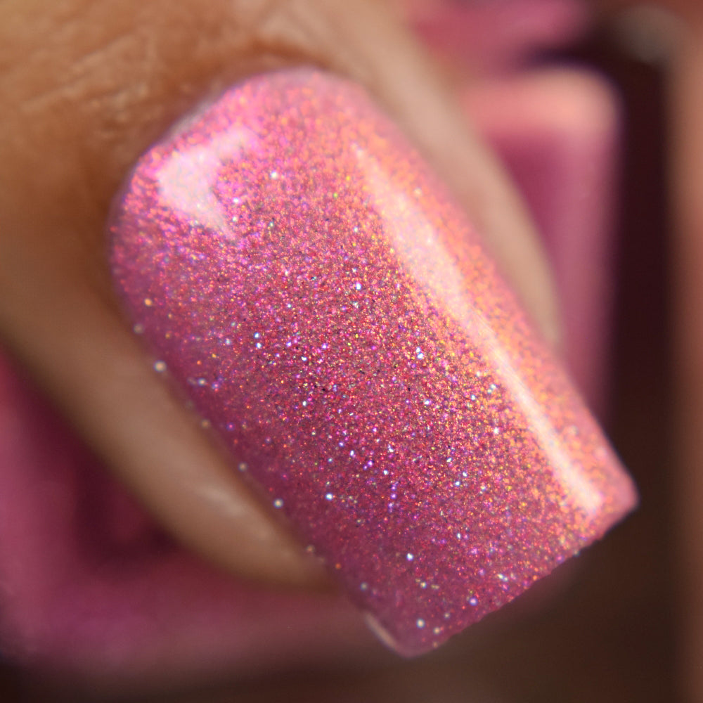 A pink jelly base with vibrant pink to orange to gold shimmer and pink reflective glitter
