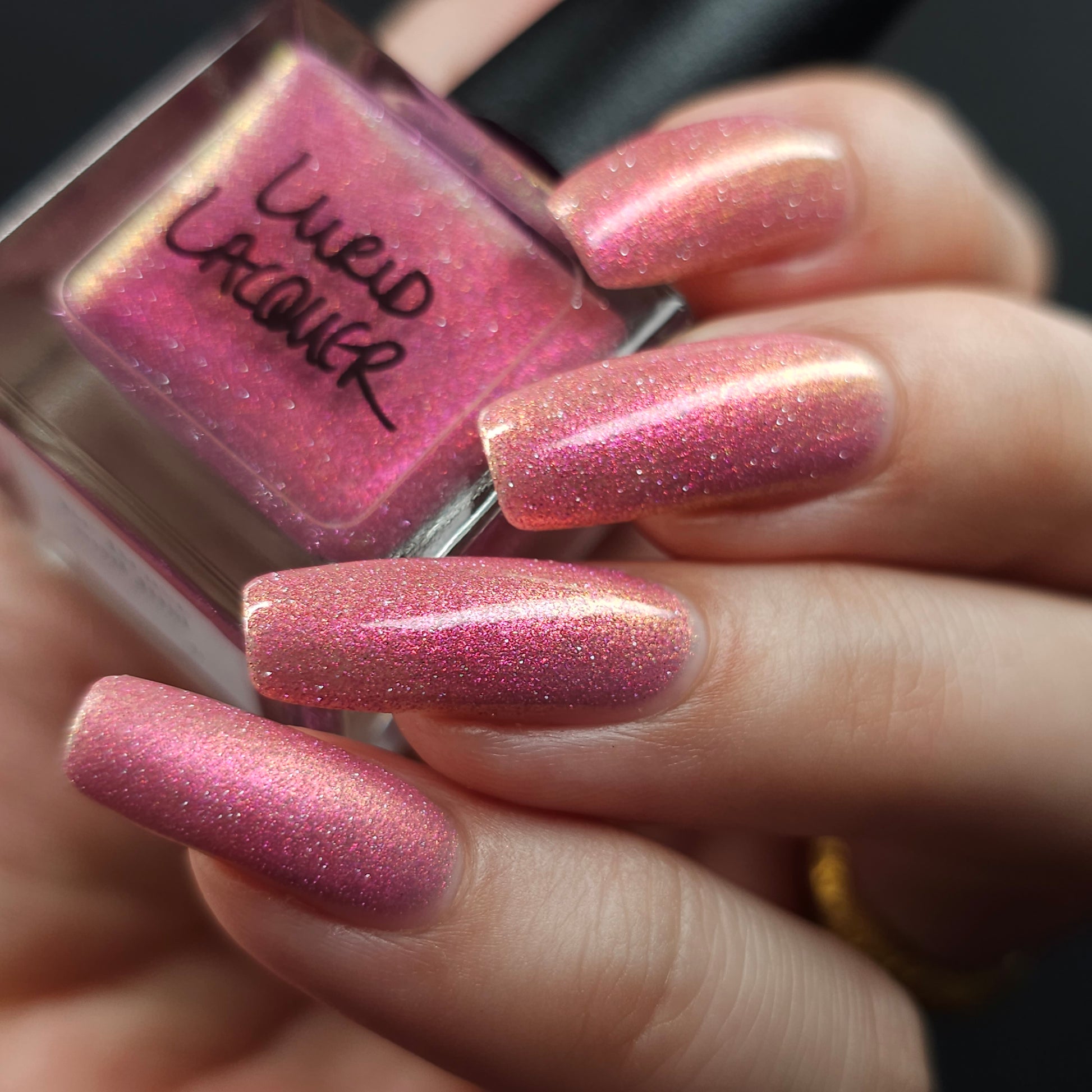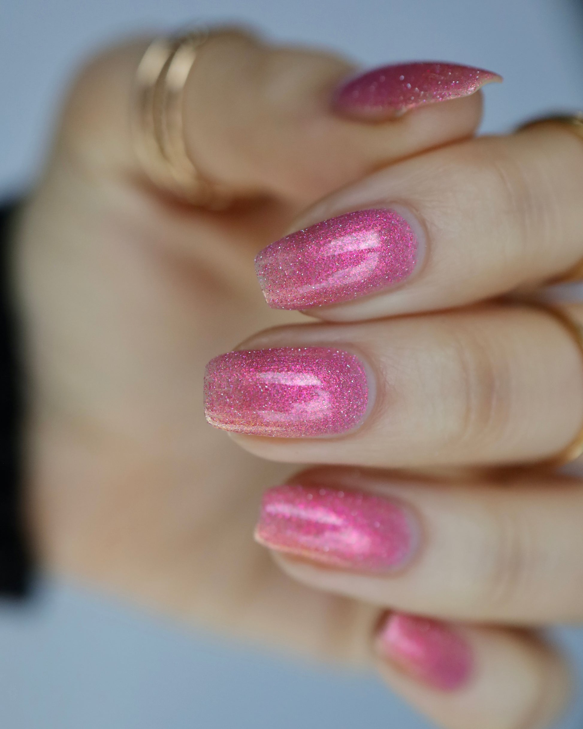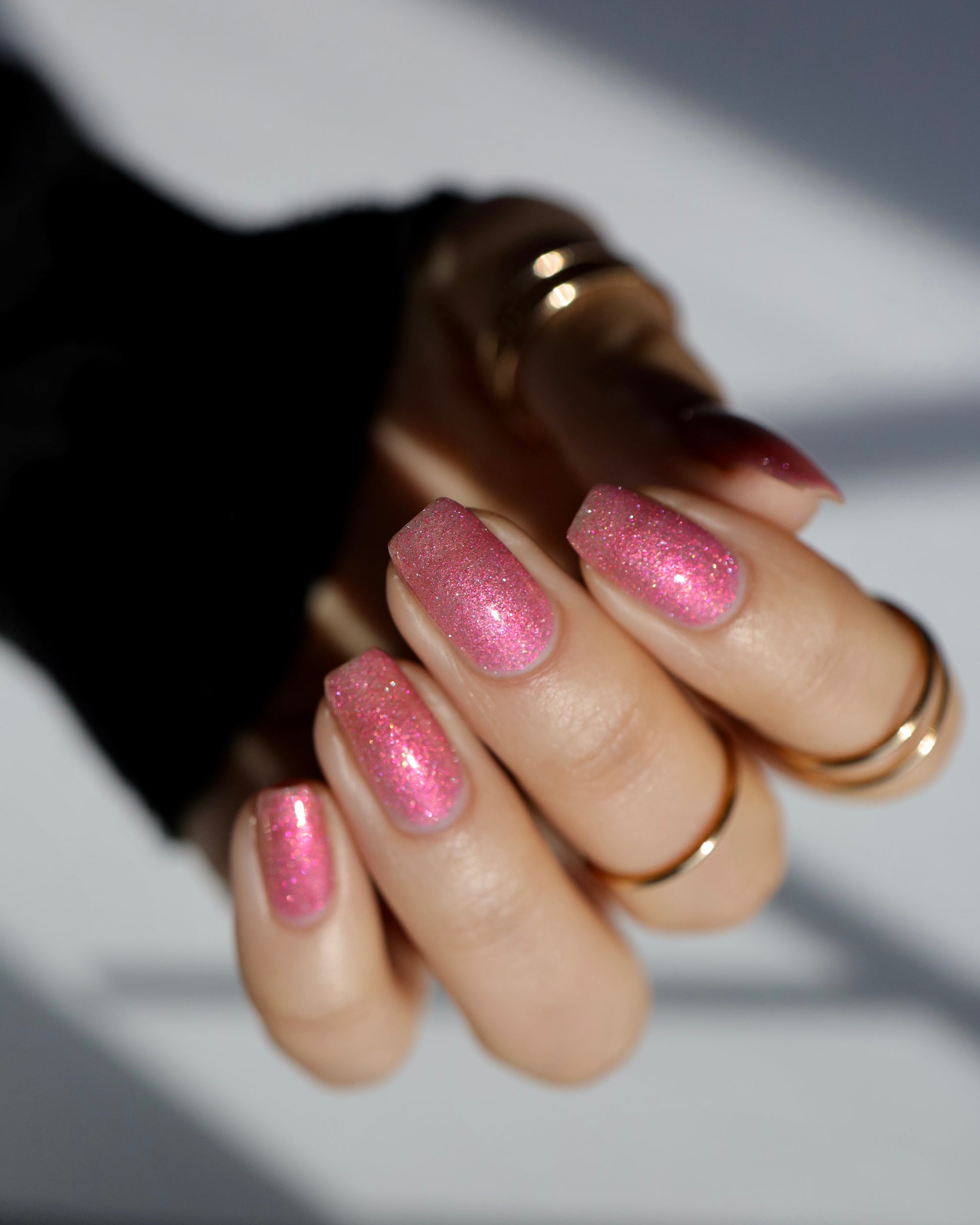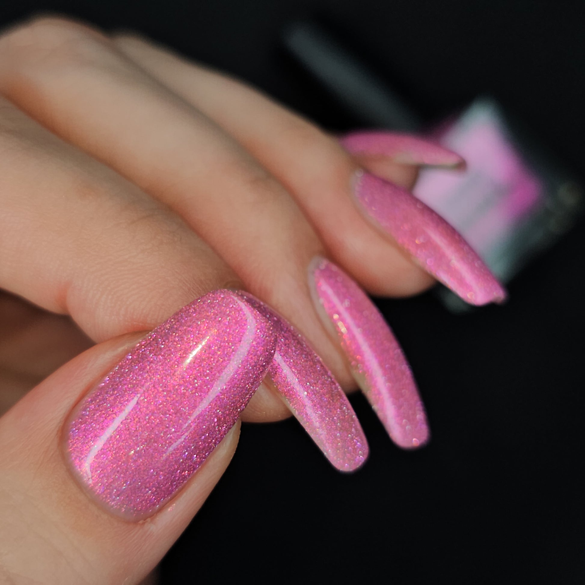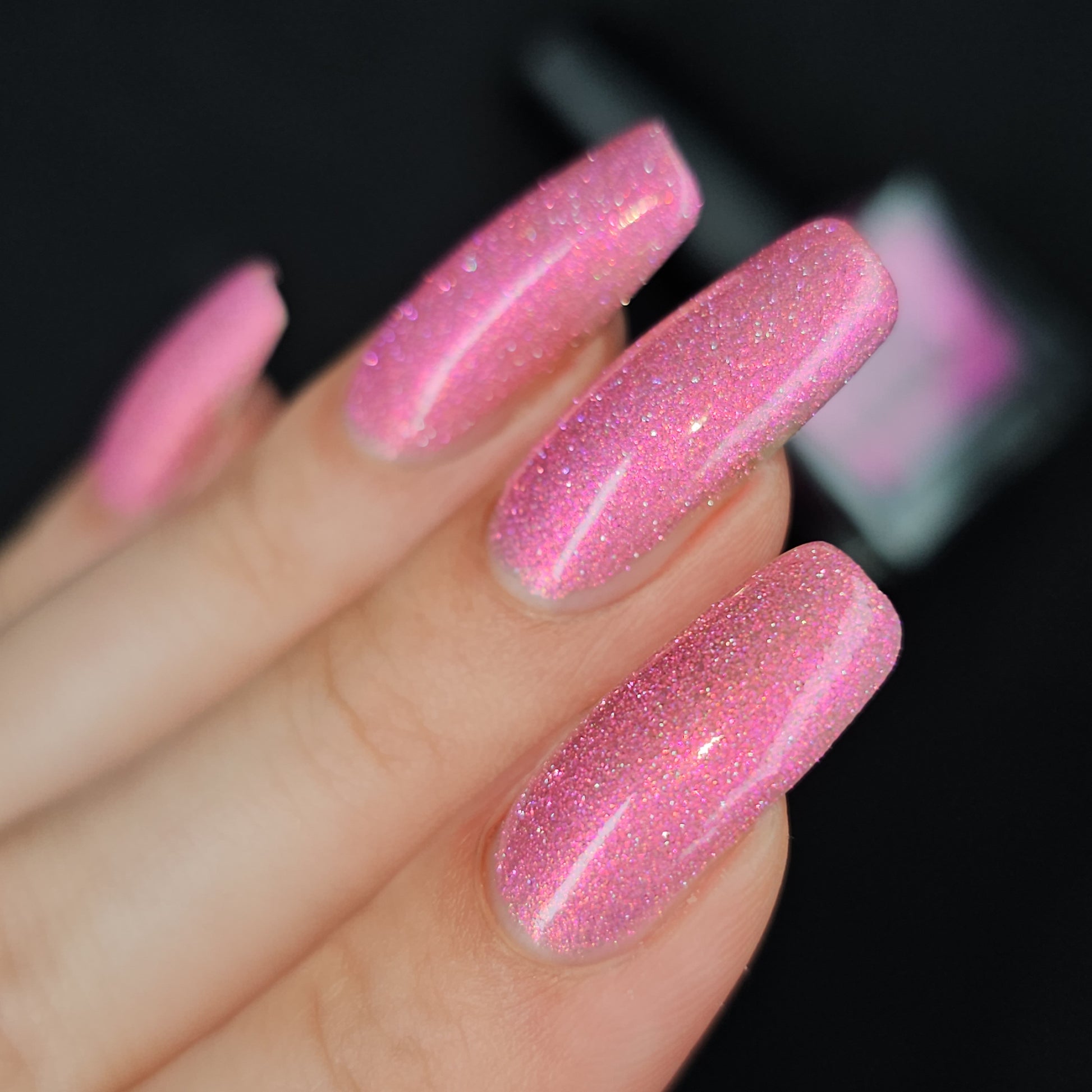 A pink jelly base with vibrant pink to orange to gold shimmer and pink reflective glitter