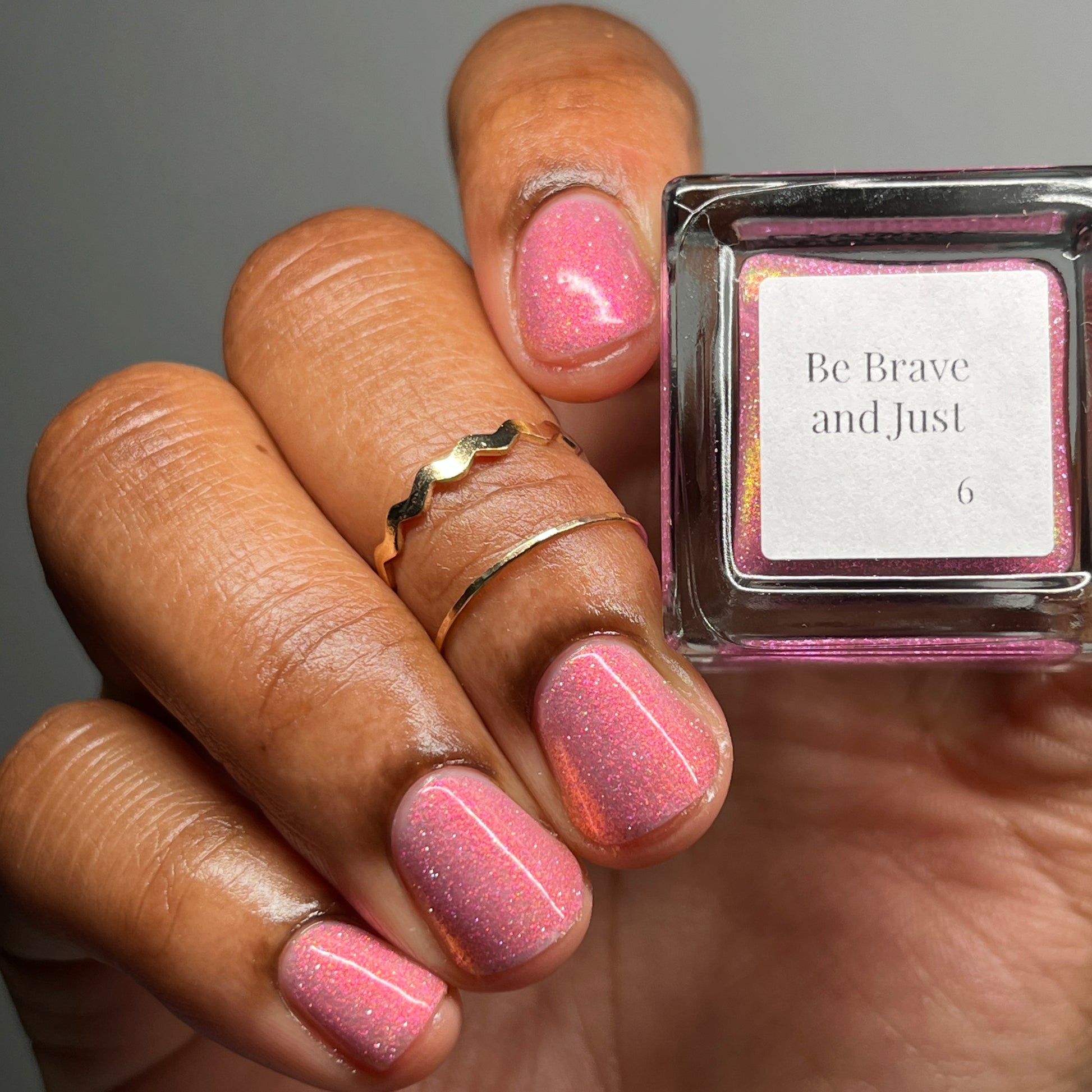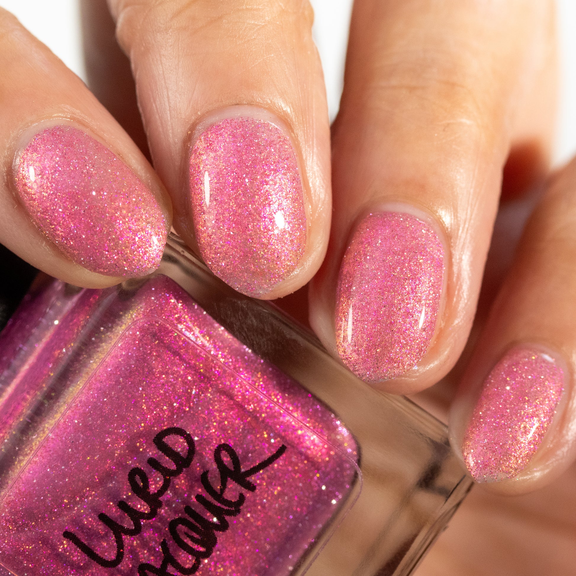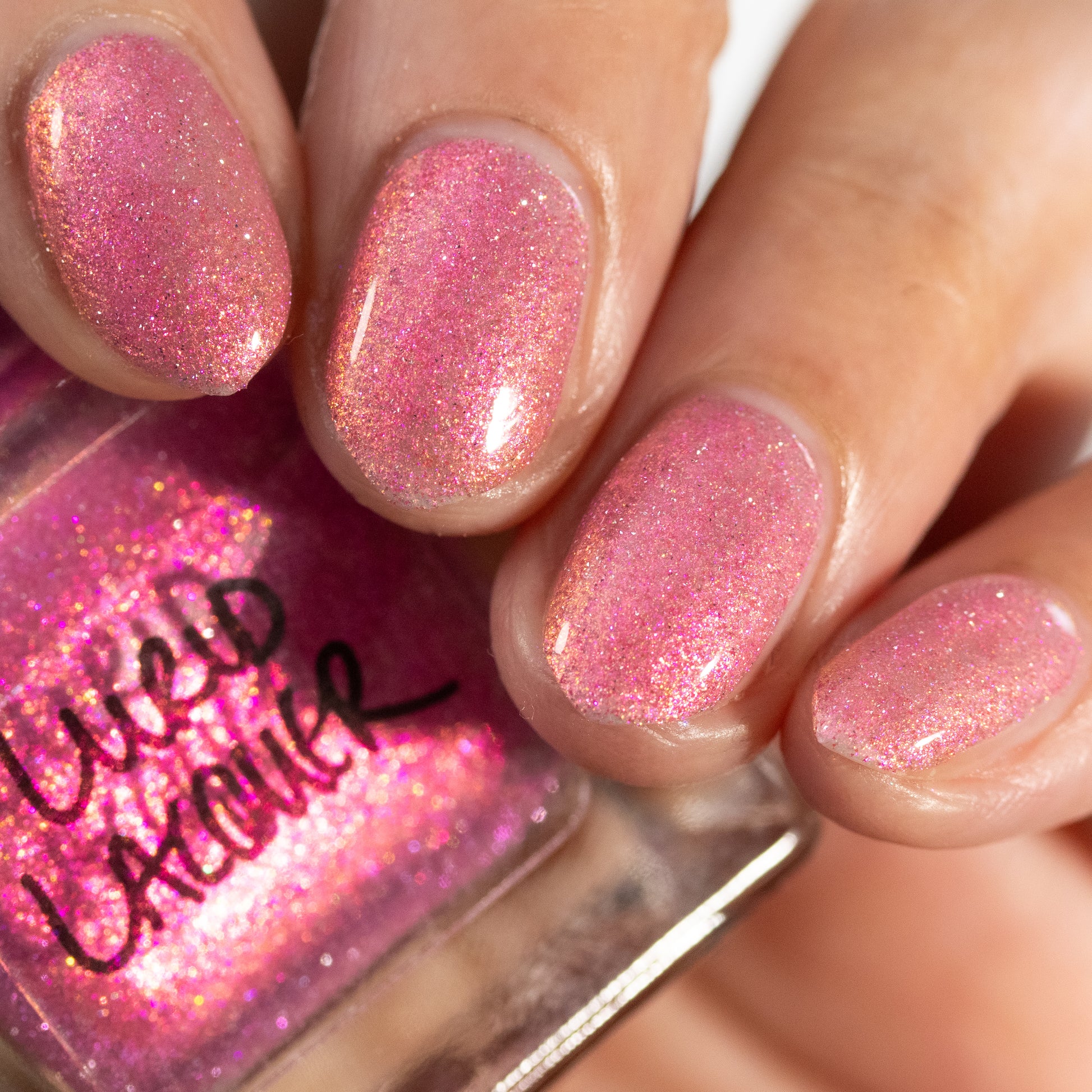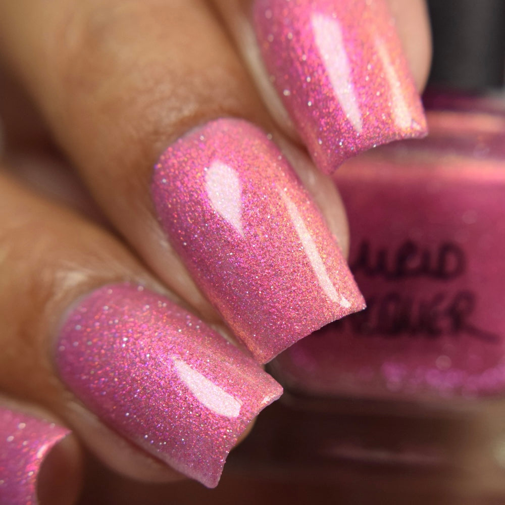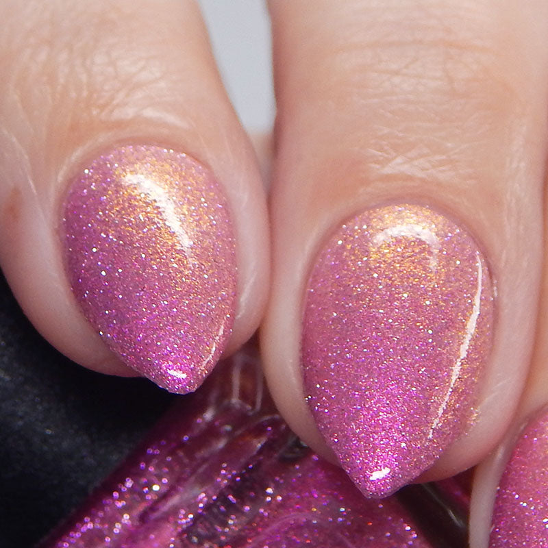 A pink jelly base with vibrant pink to orange to gold shimmer and pink reflective glitter