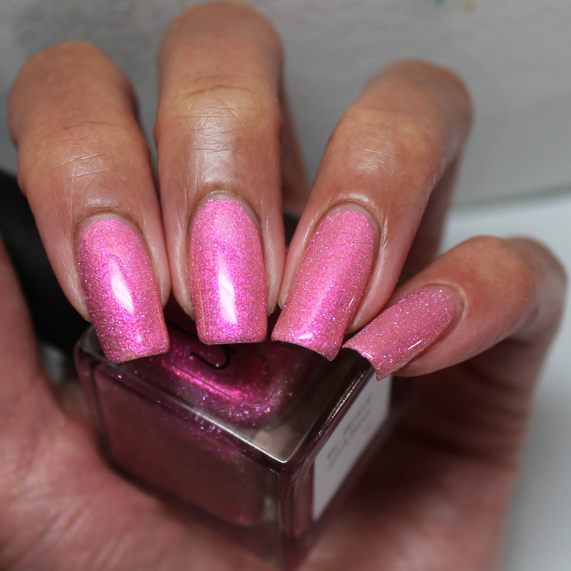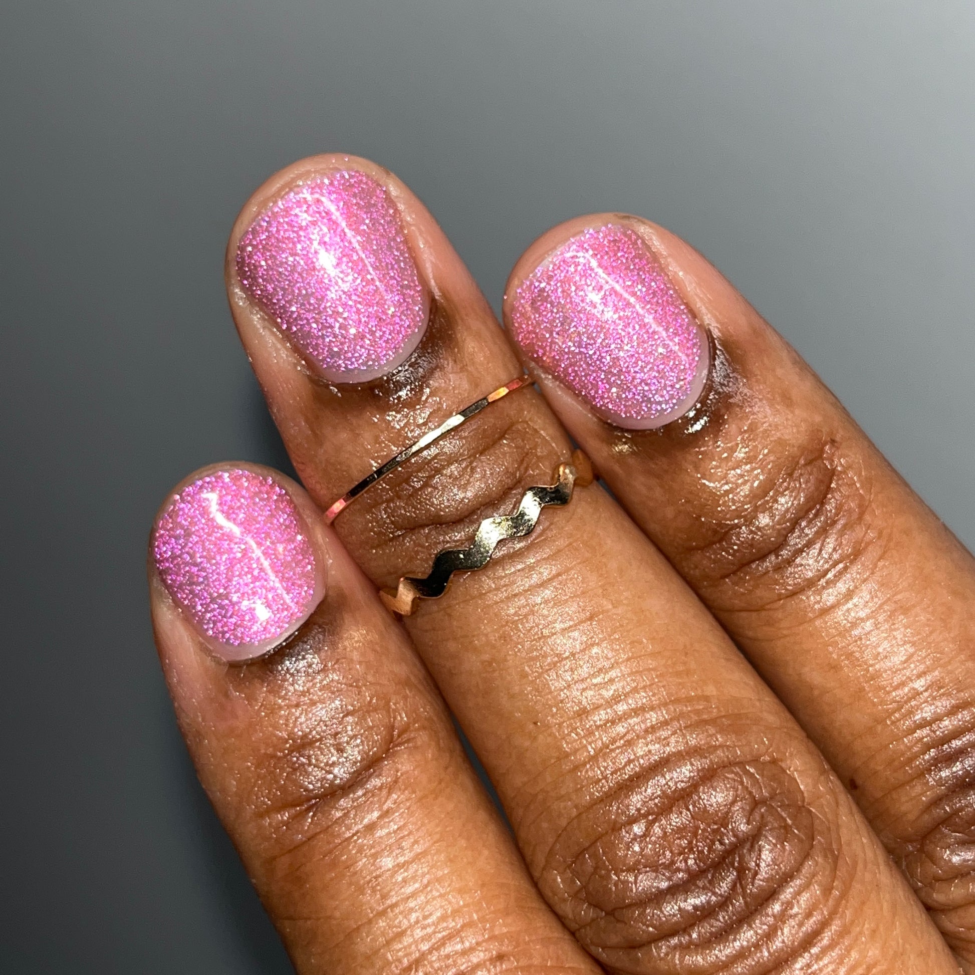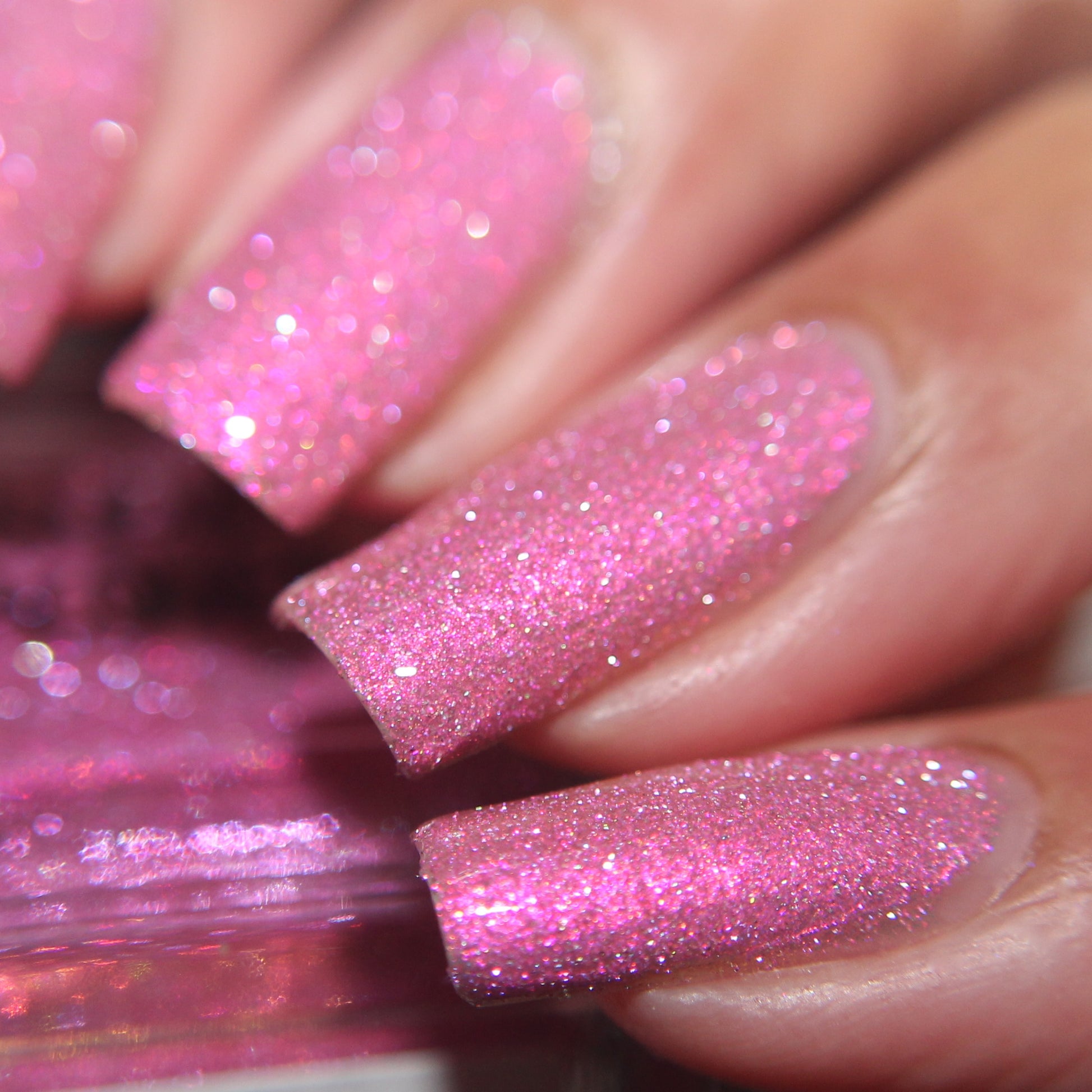 Please note: Reflective glitter polishes are textured and dry down with a gritty, sandpaper feeling. To make them look smooth and glossy, I recommend applying 2-3 coats of the polish, then applying one coat of a glitter smoother, followed by one coat of top coat.