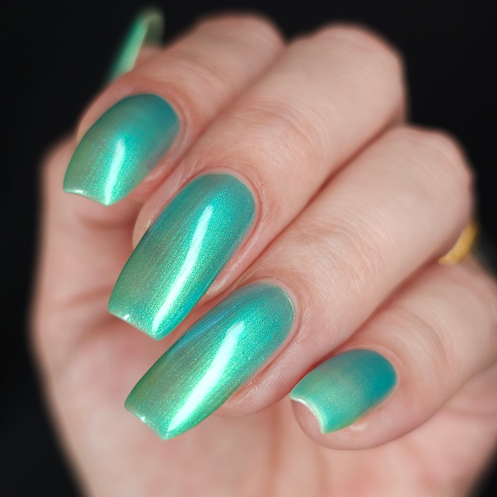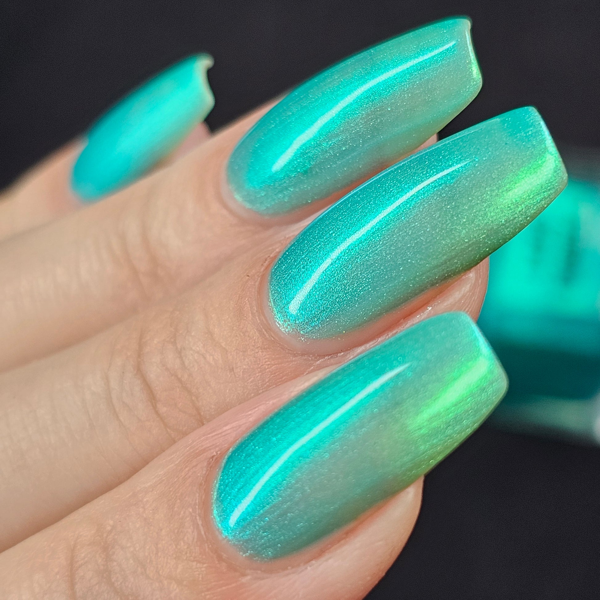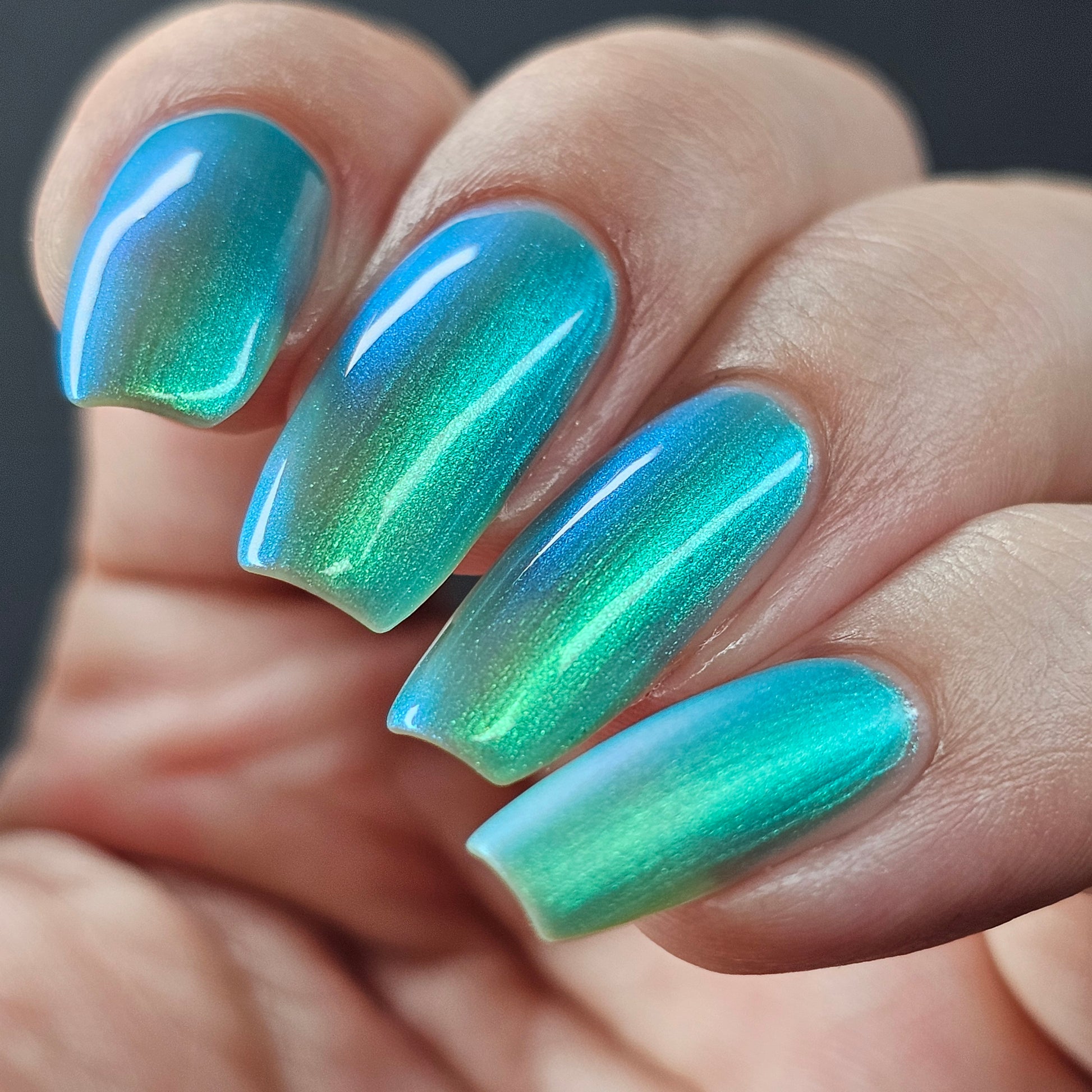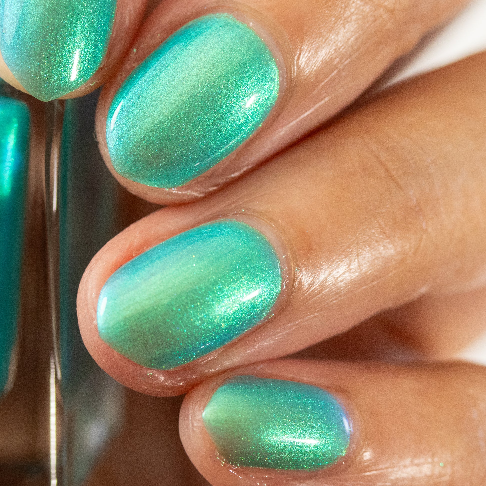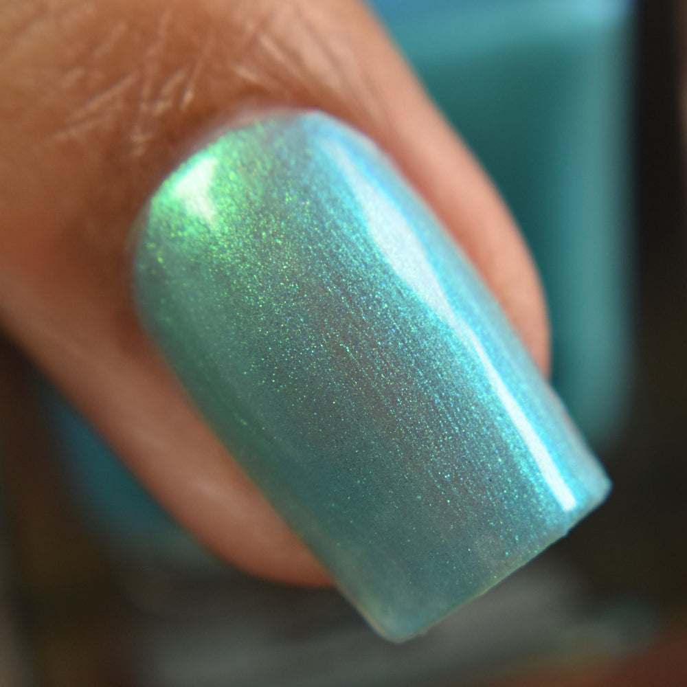 A semi-sheer aqua base with an aurora shimmer that shifts from green to blue