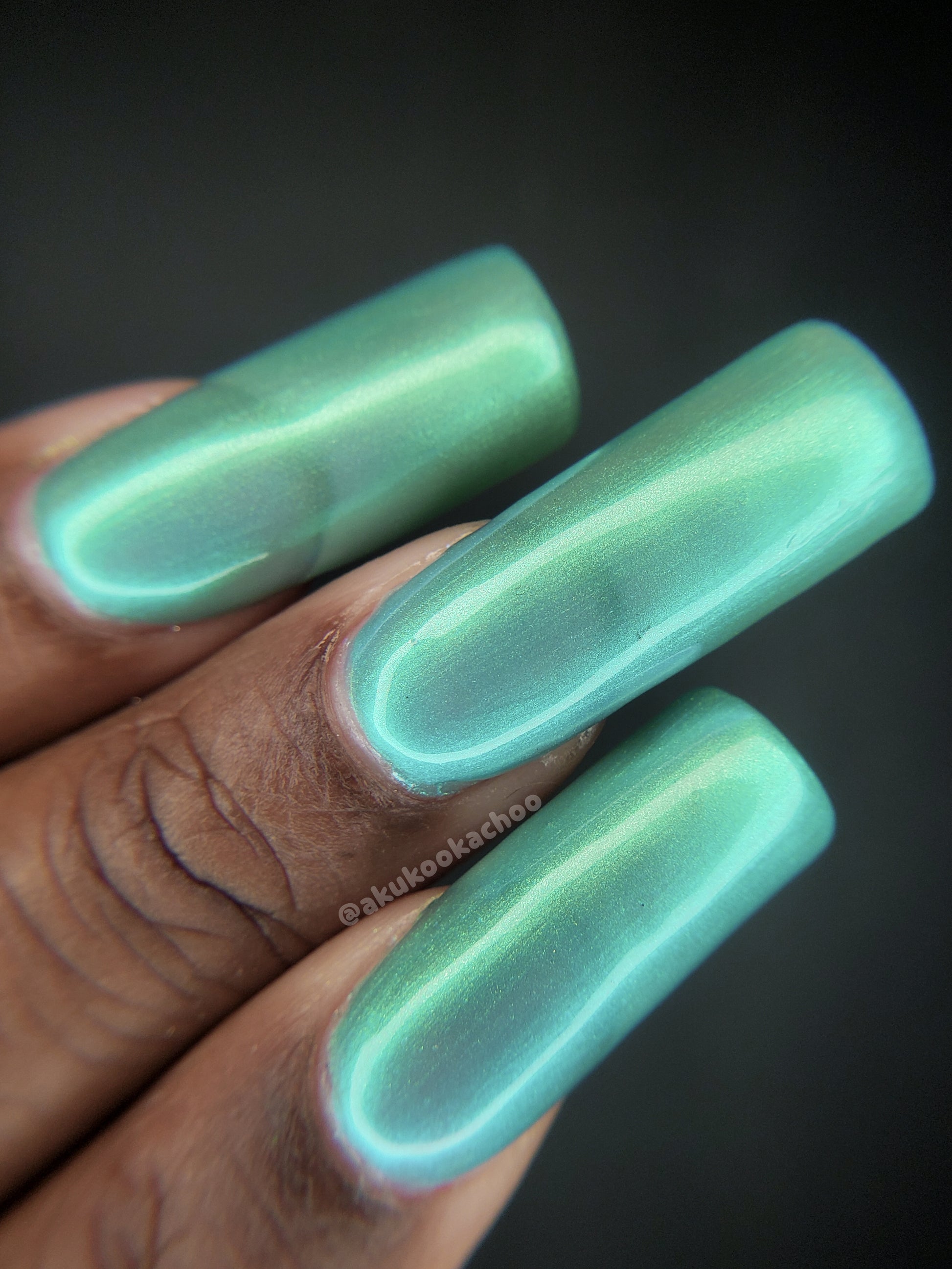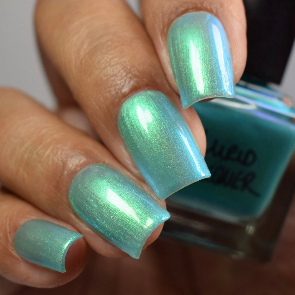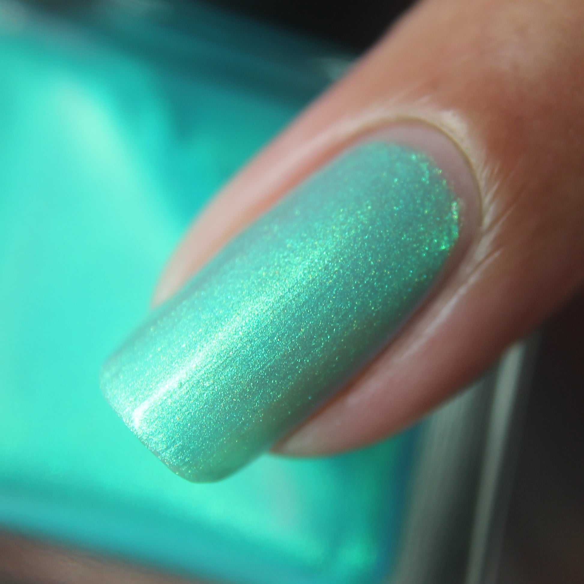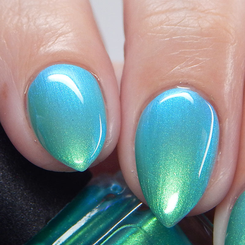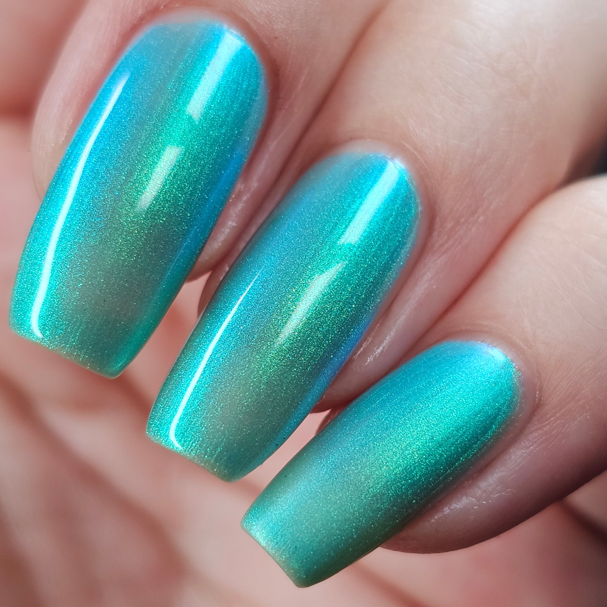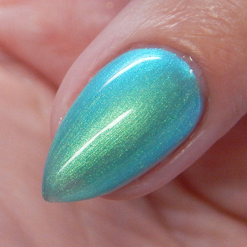 A semi-sheer aqua base with an aurora shimmer that shifts from green to blue