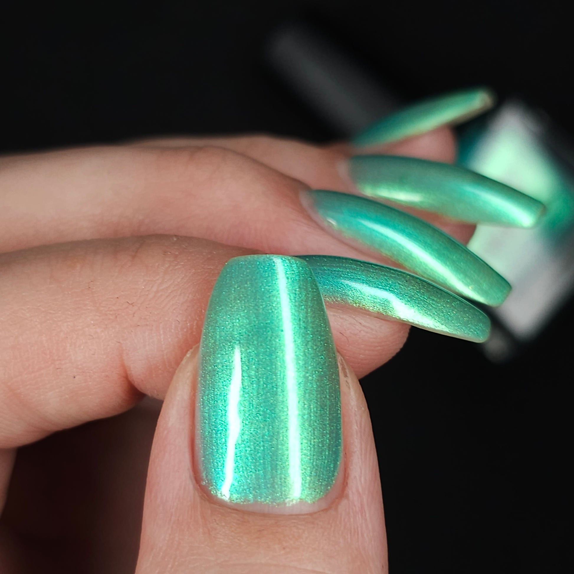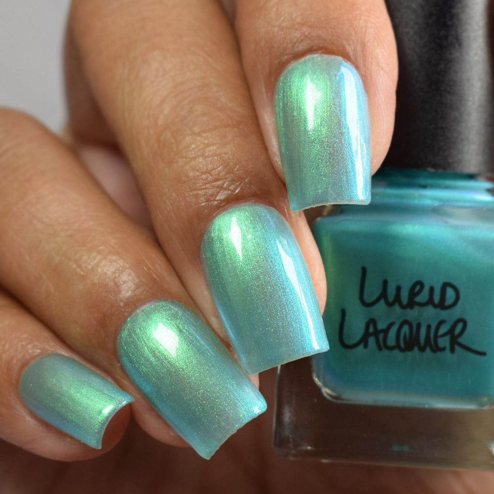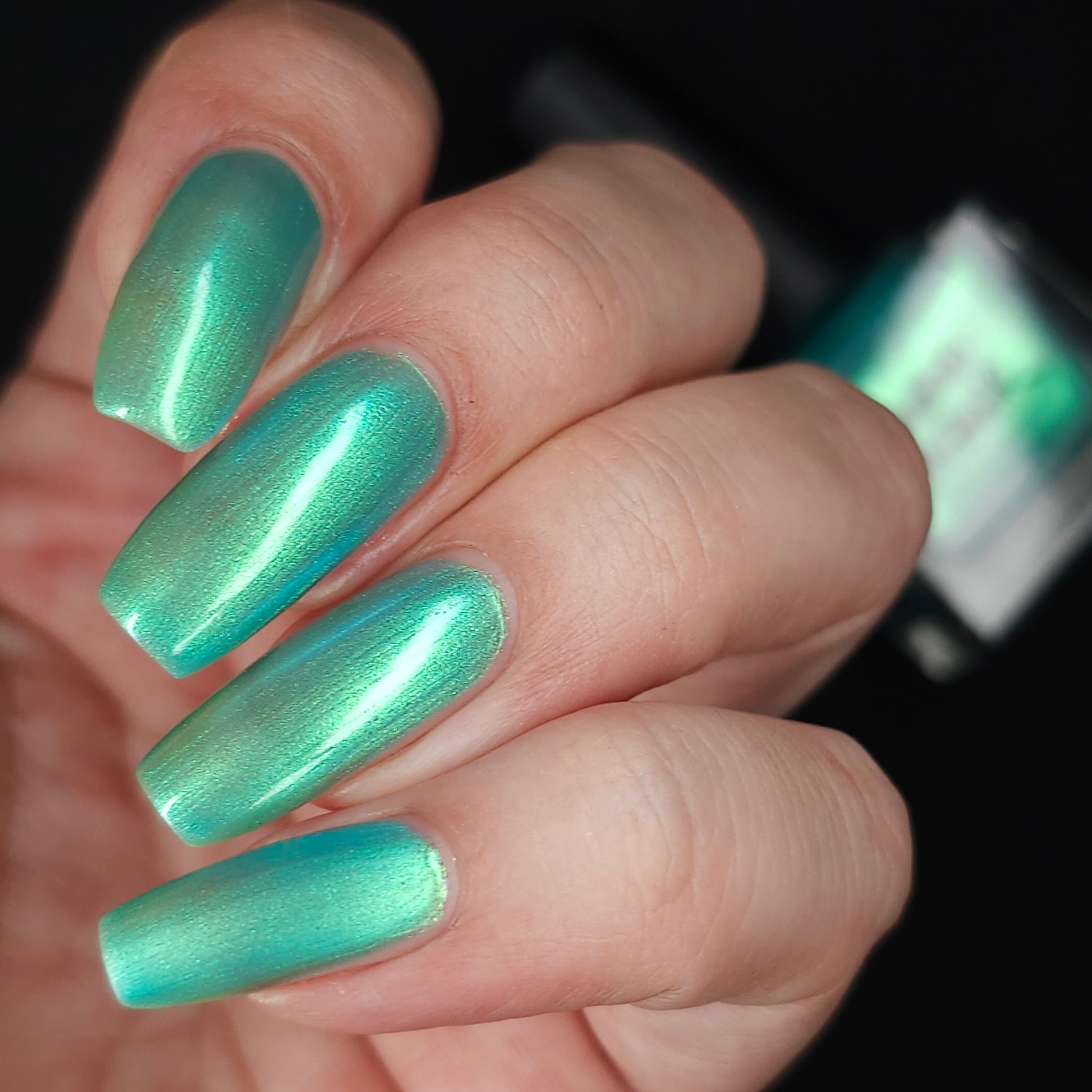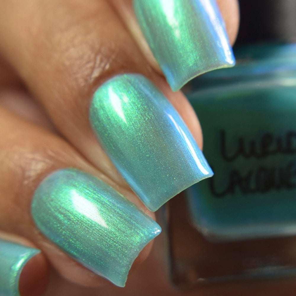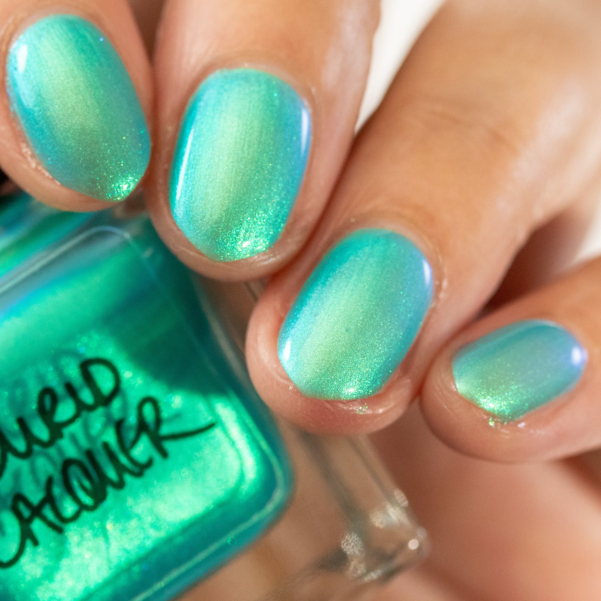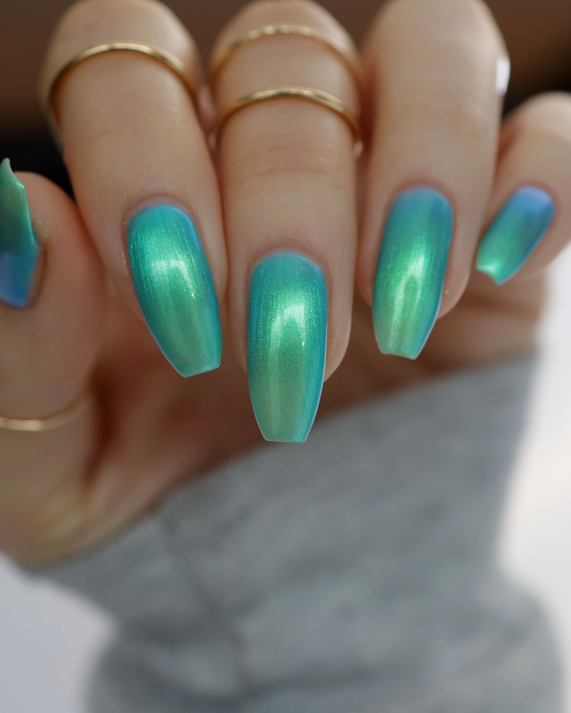 A semi-sheer aqua base with an aurora shimmer that shifts from green to blue
