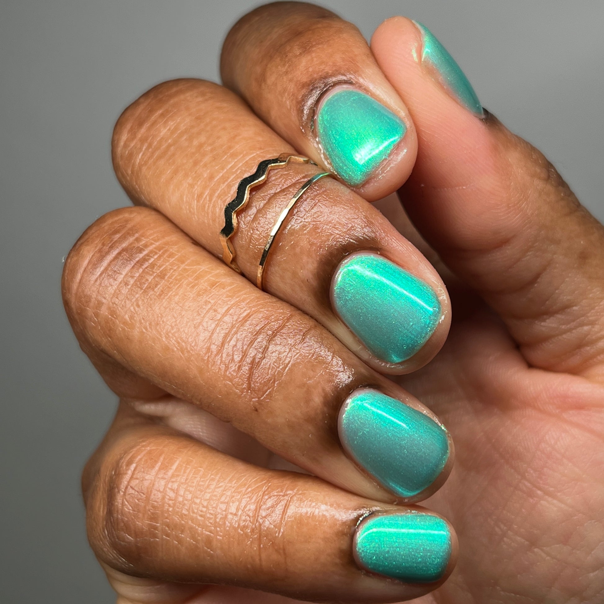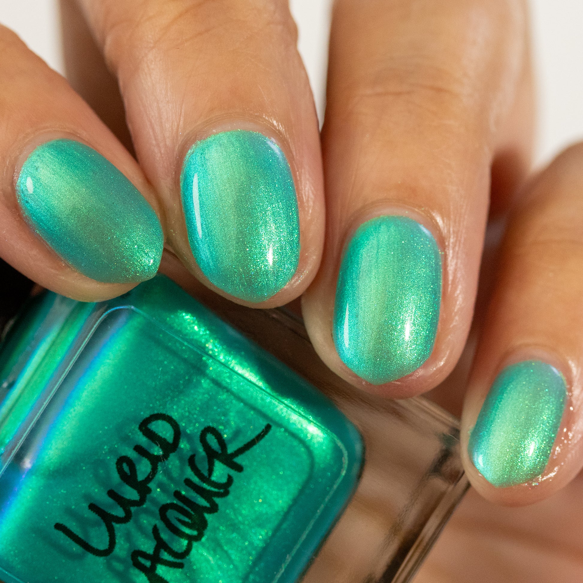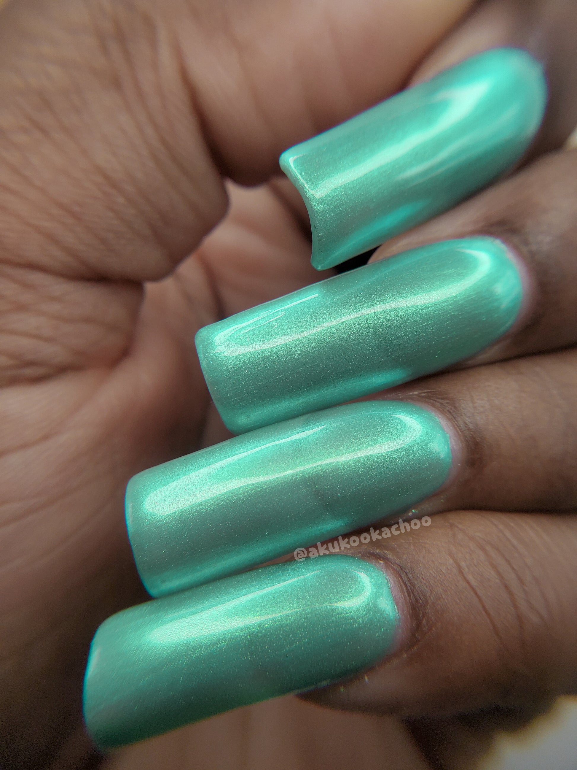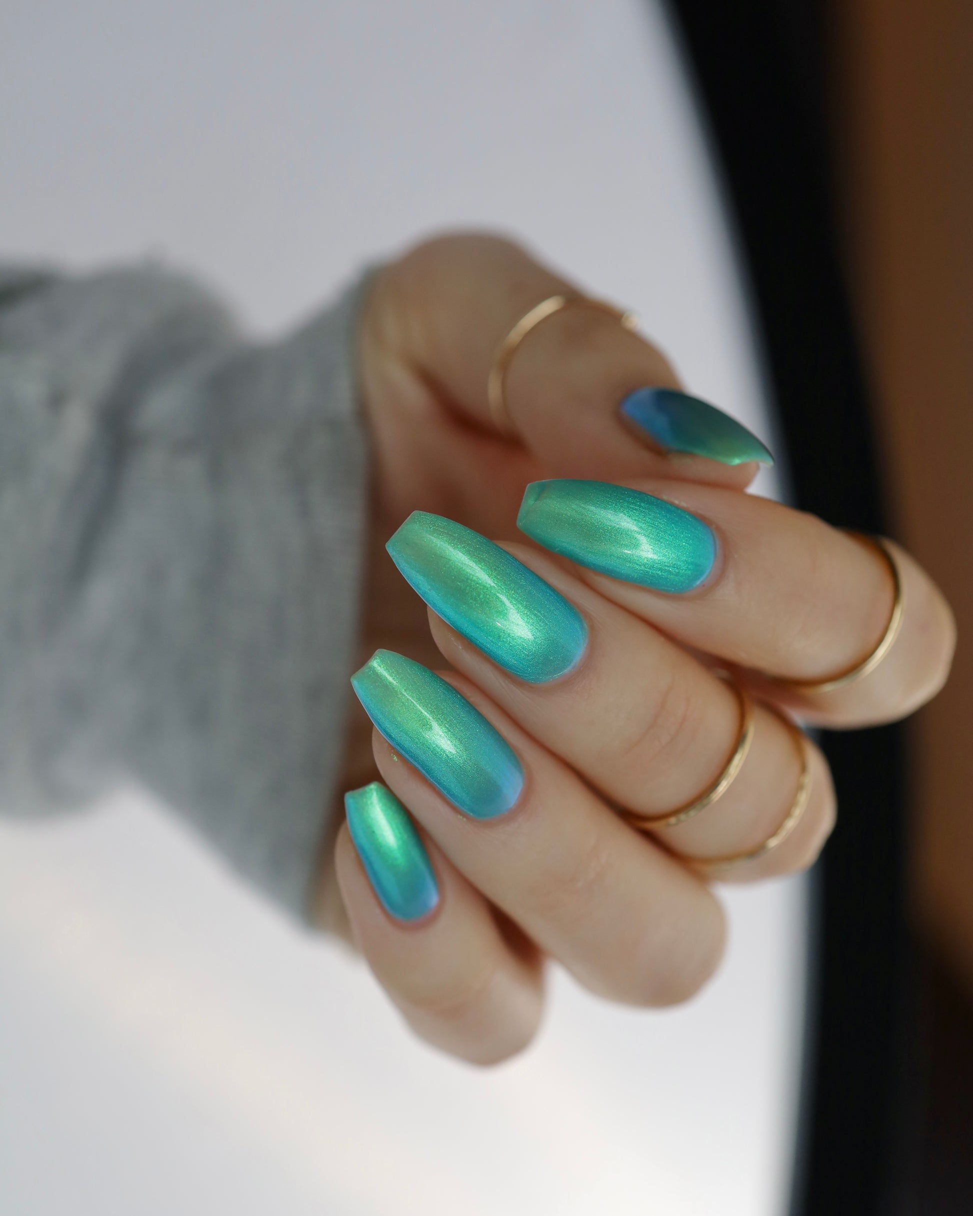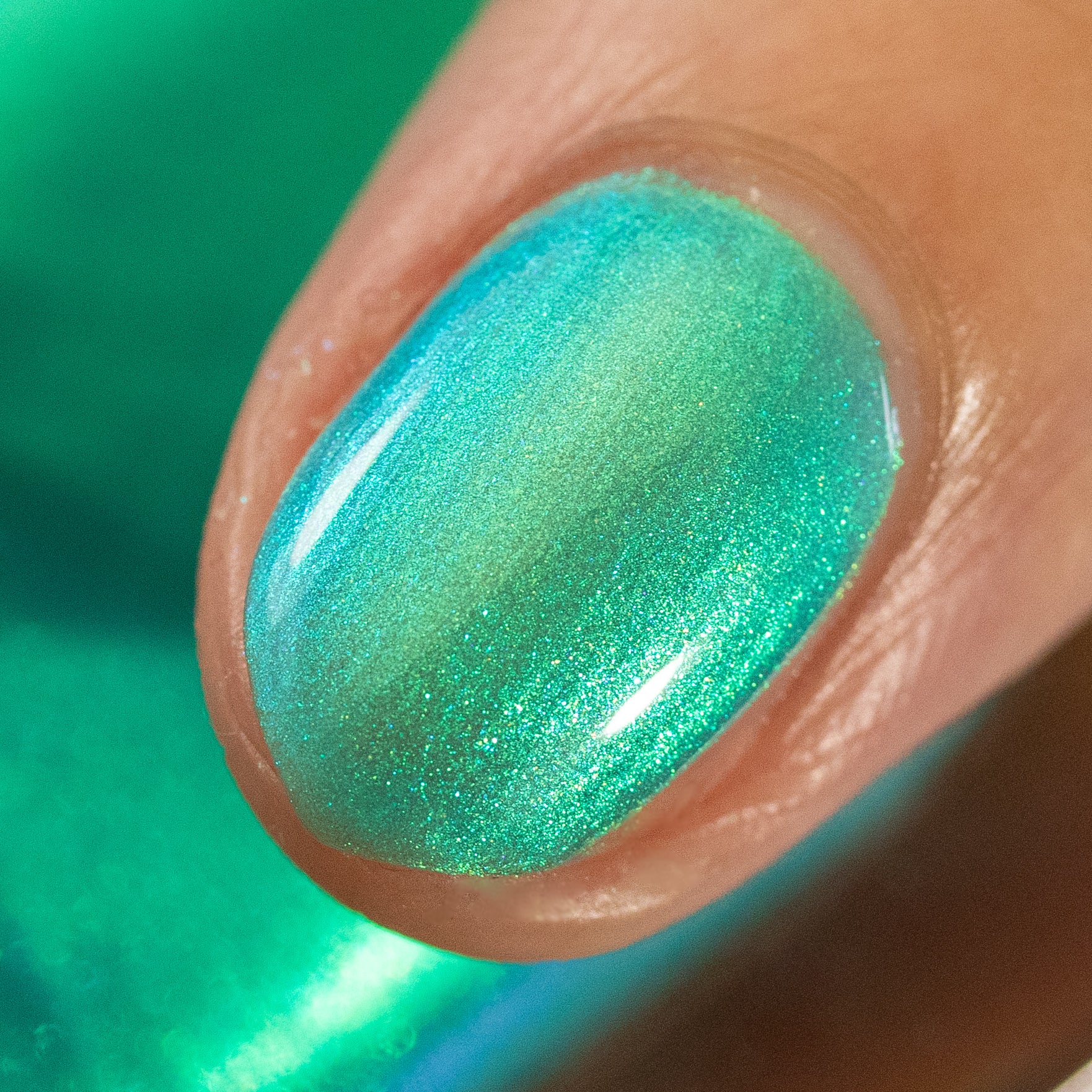 A semi-sheer aqua base with an aurora shimmer that shifts from green to blue