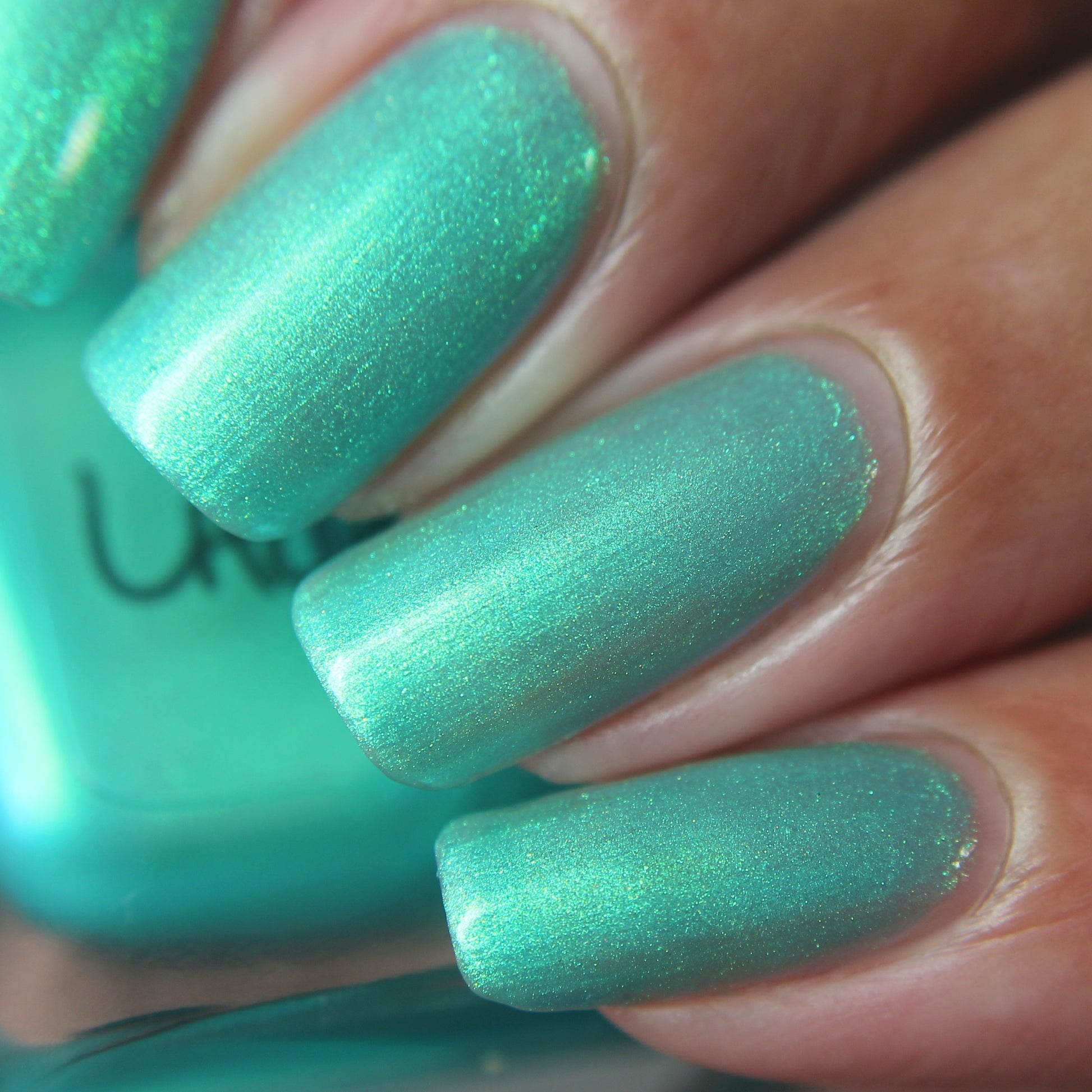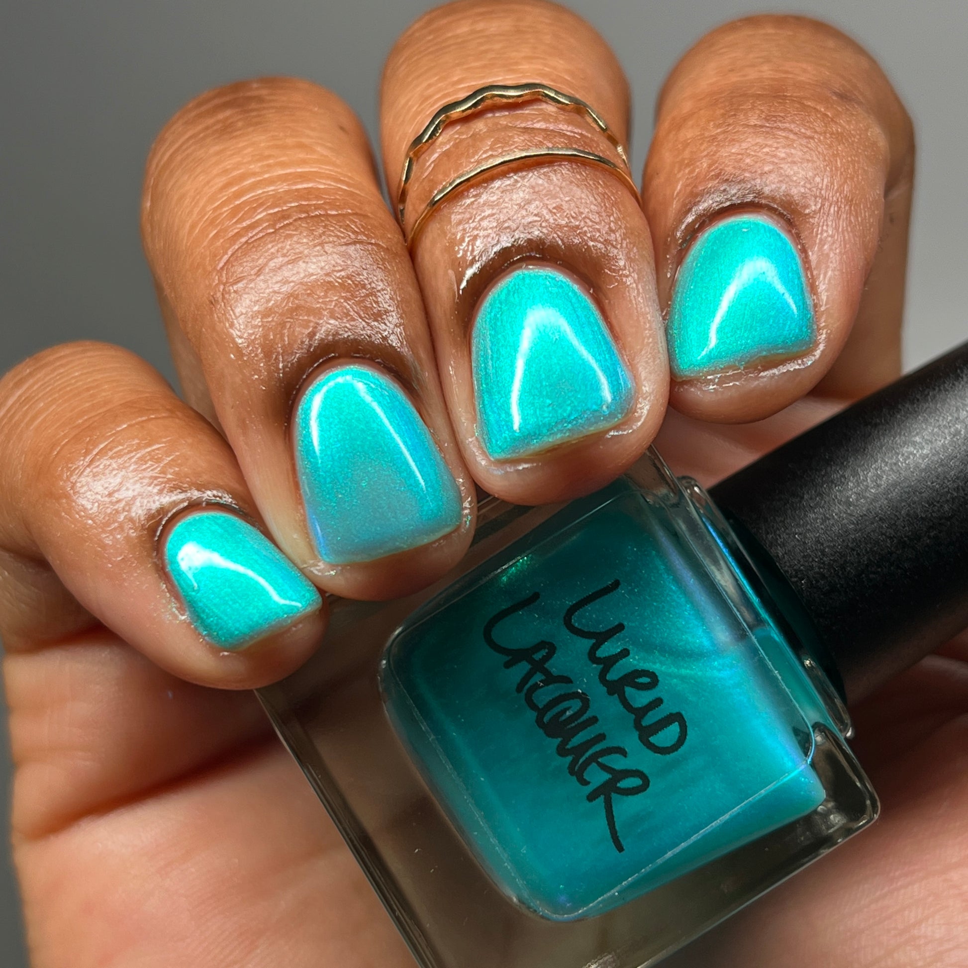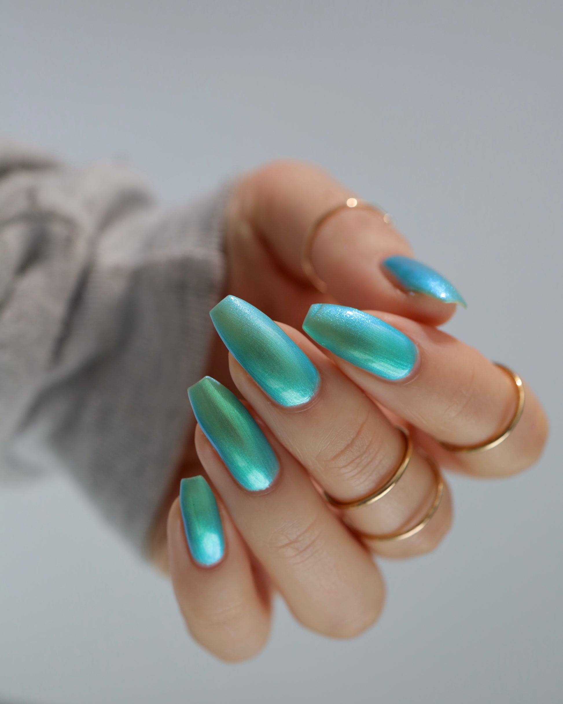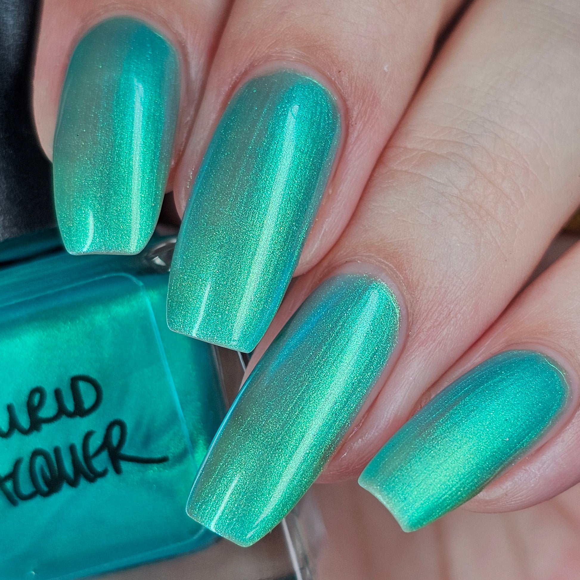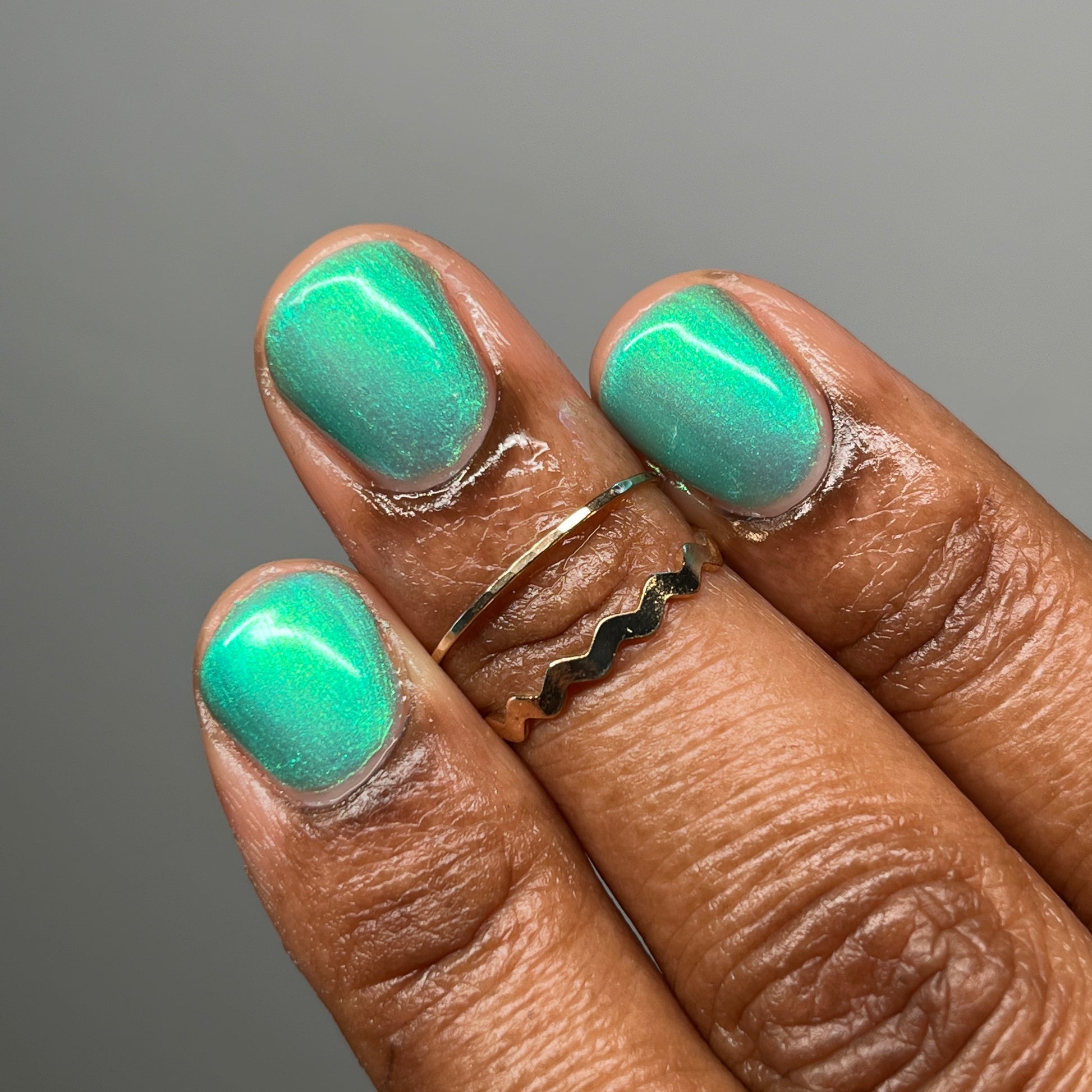 A semi-sheer aqua base with an aurora shimmer that shifts from green to blue