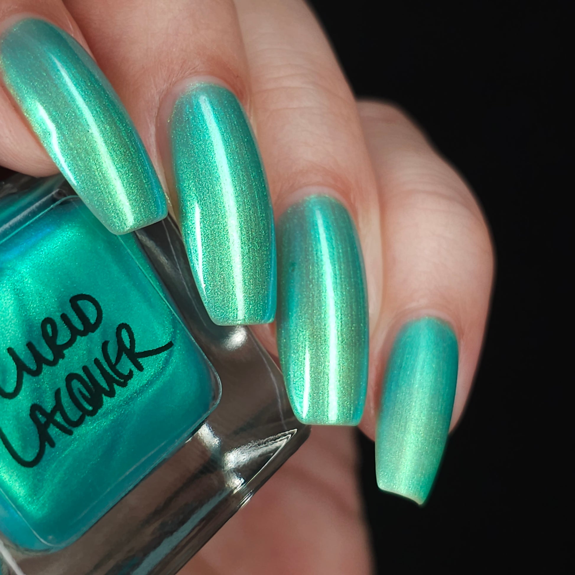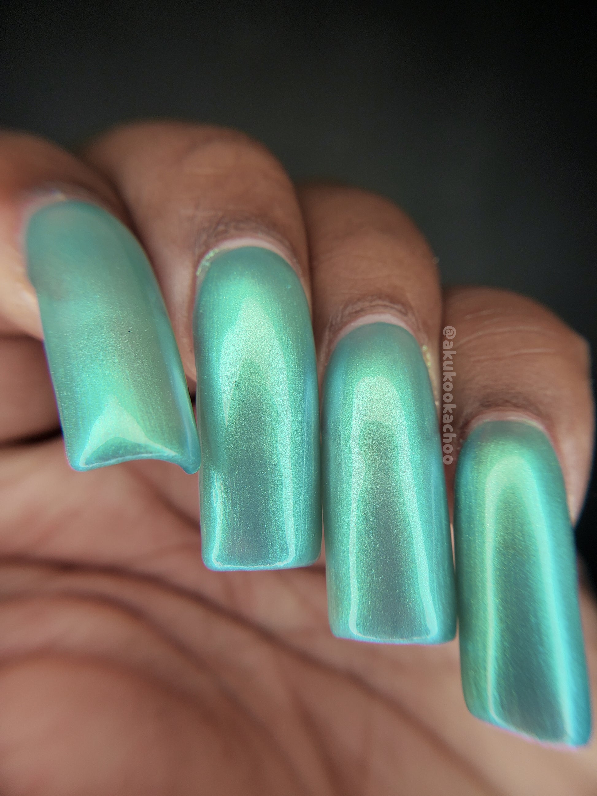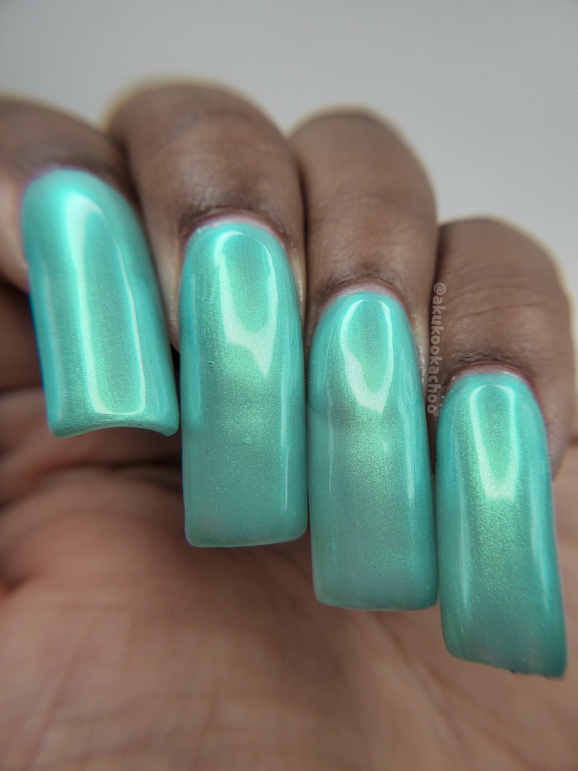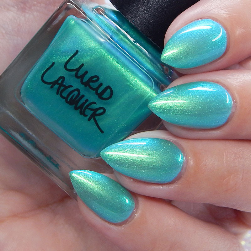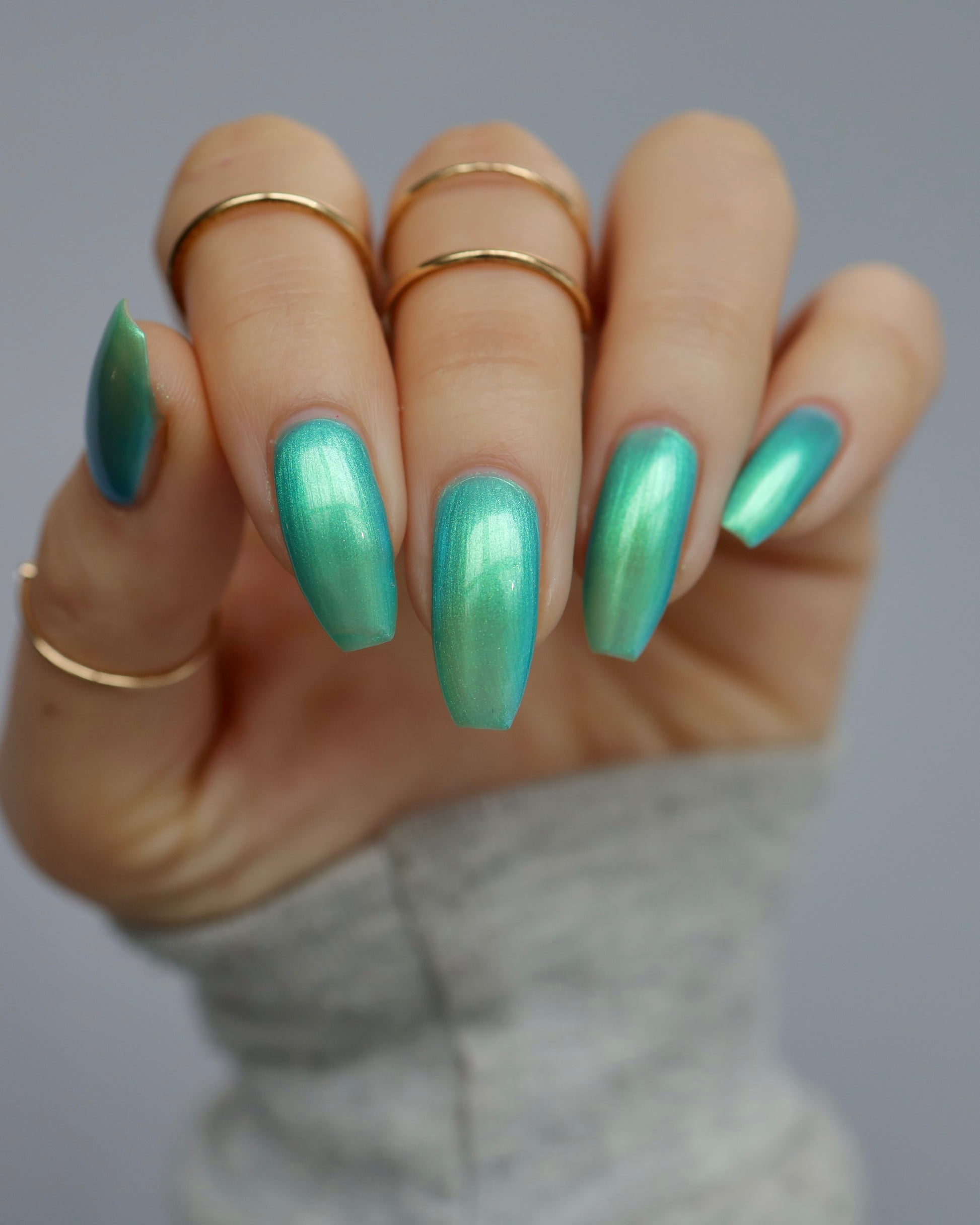 A semi-sheer aqua base with an aurora shimmer that shifts from green to blue