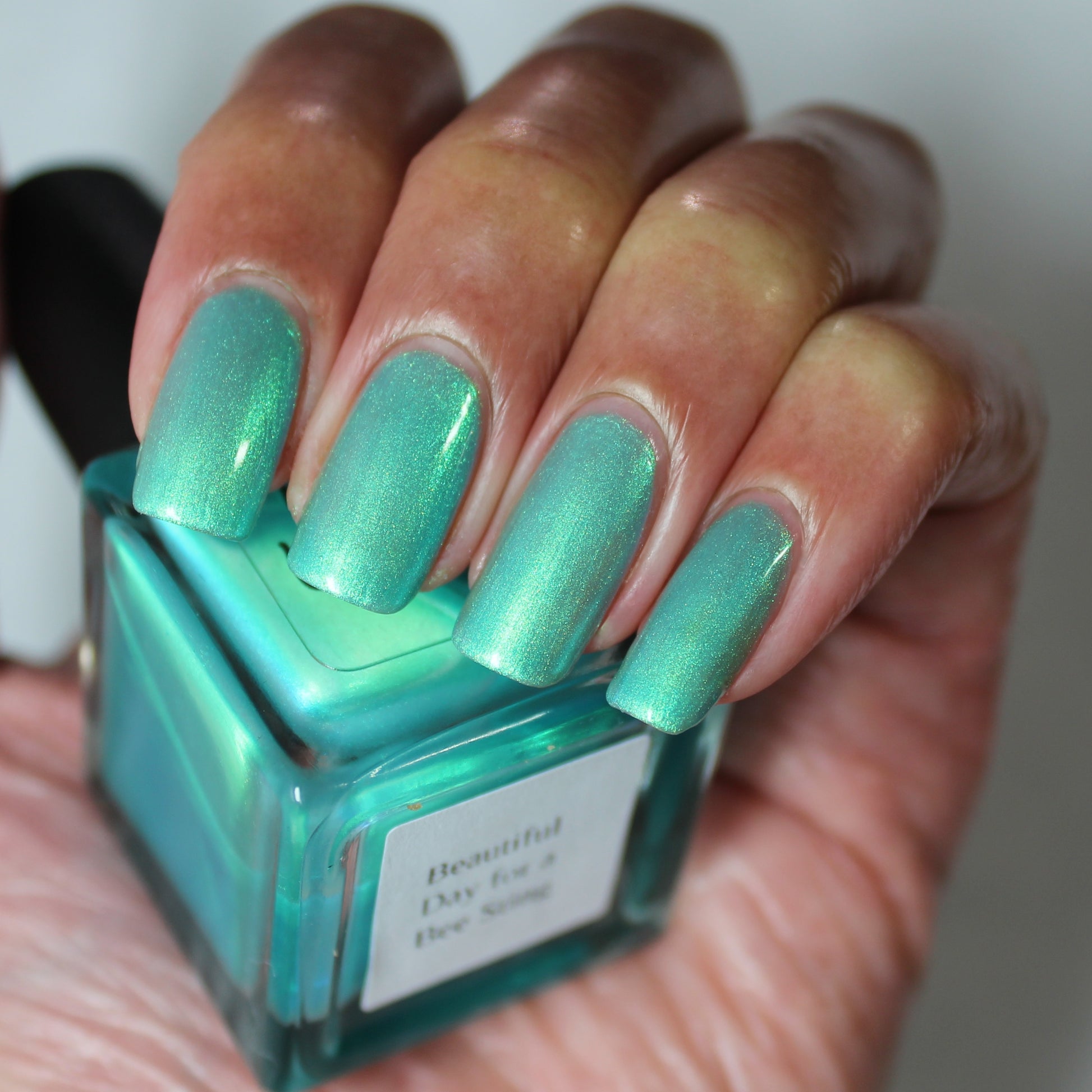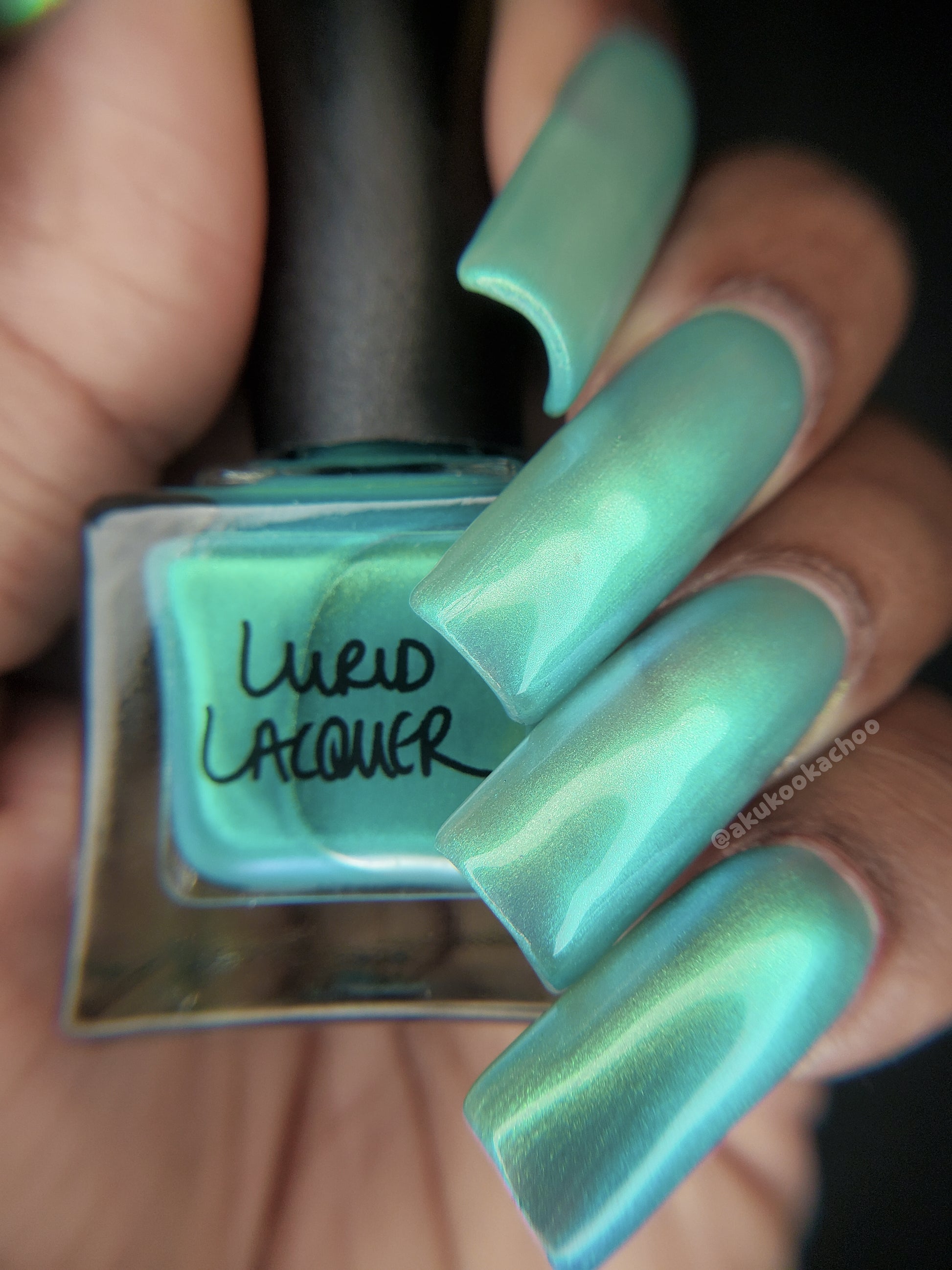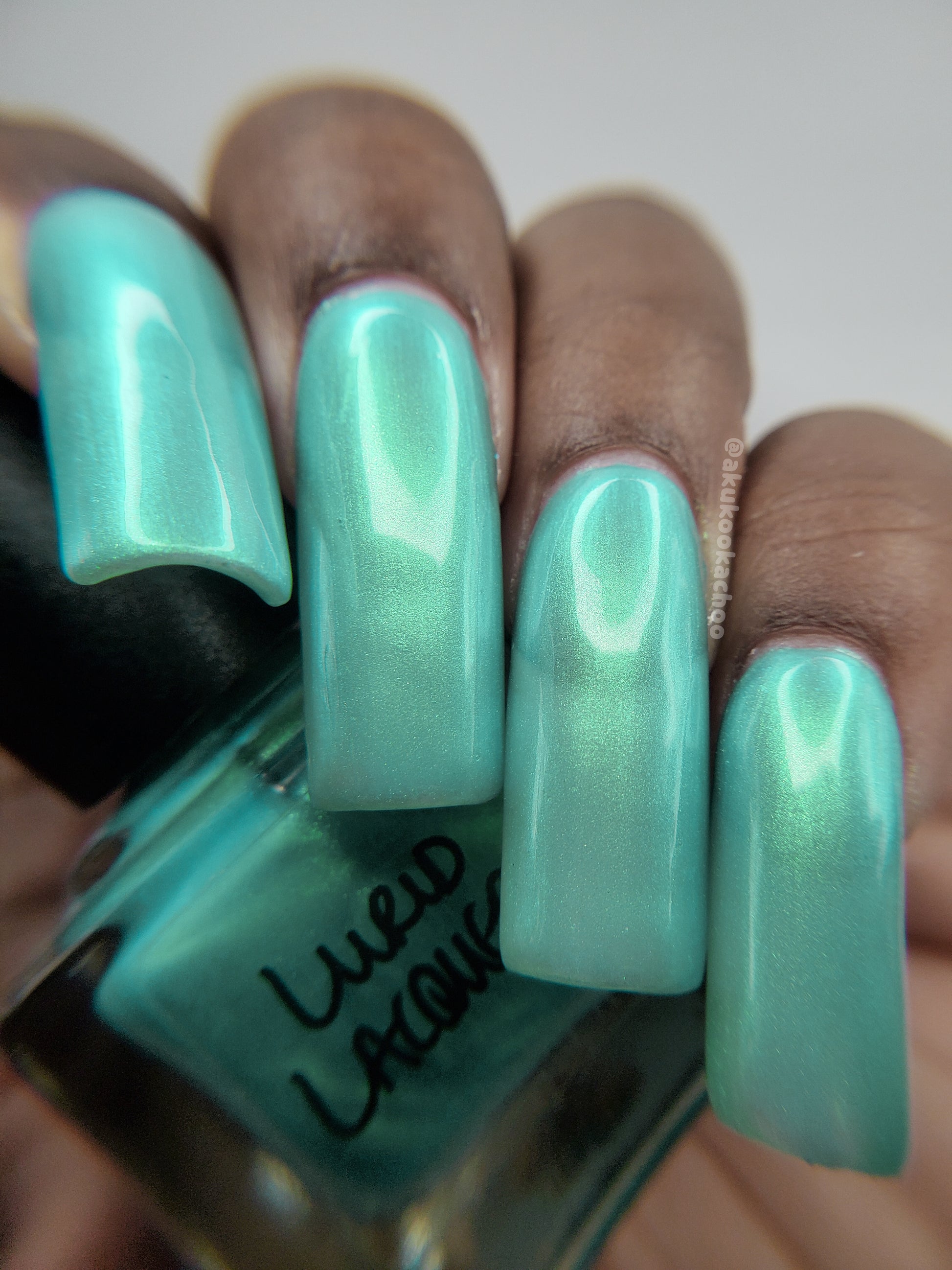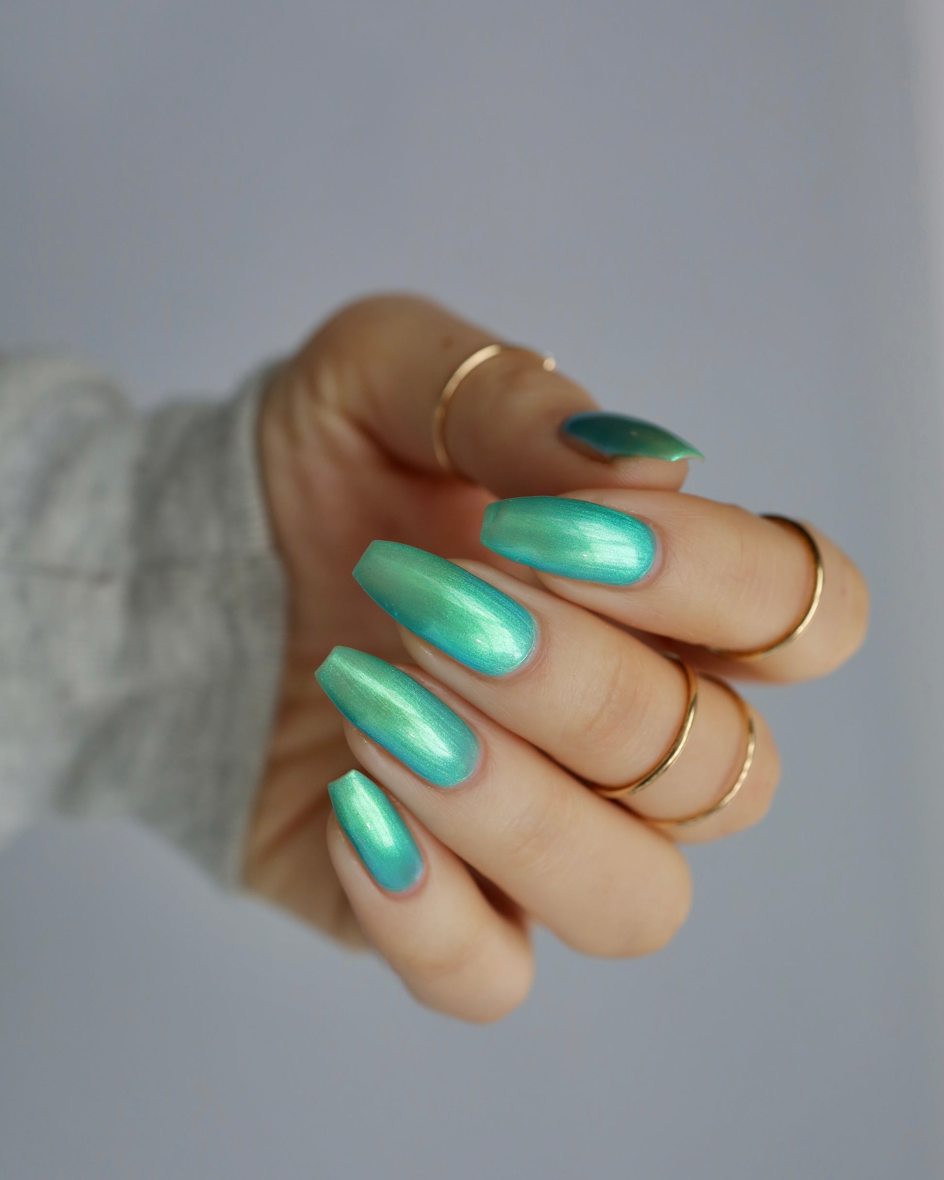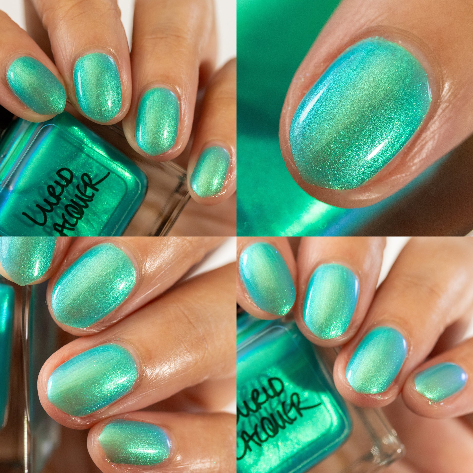 A semi-sheer aqua base with an aurora shimmer that shifts from green to blue