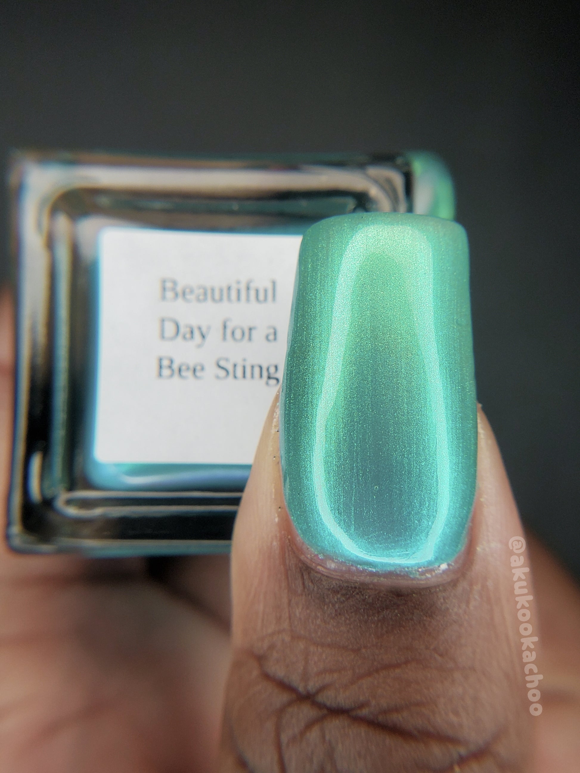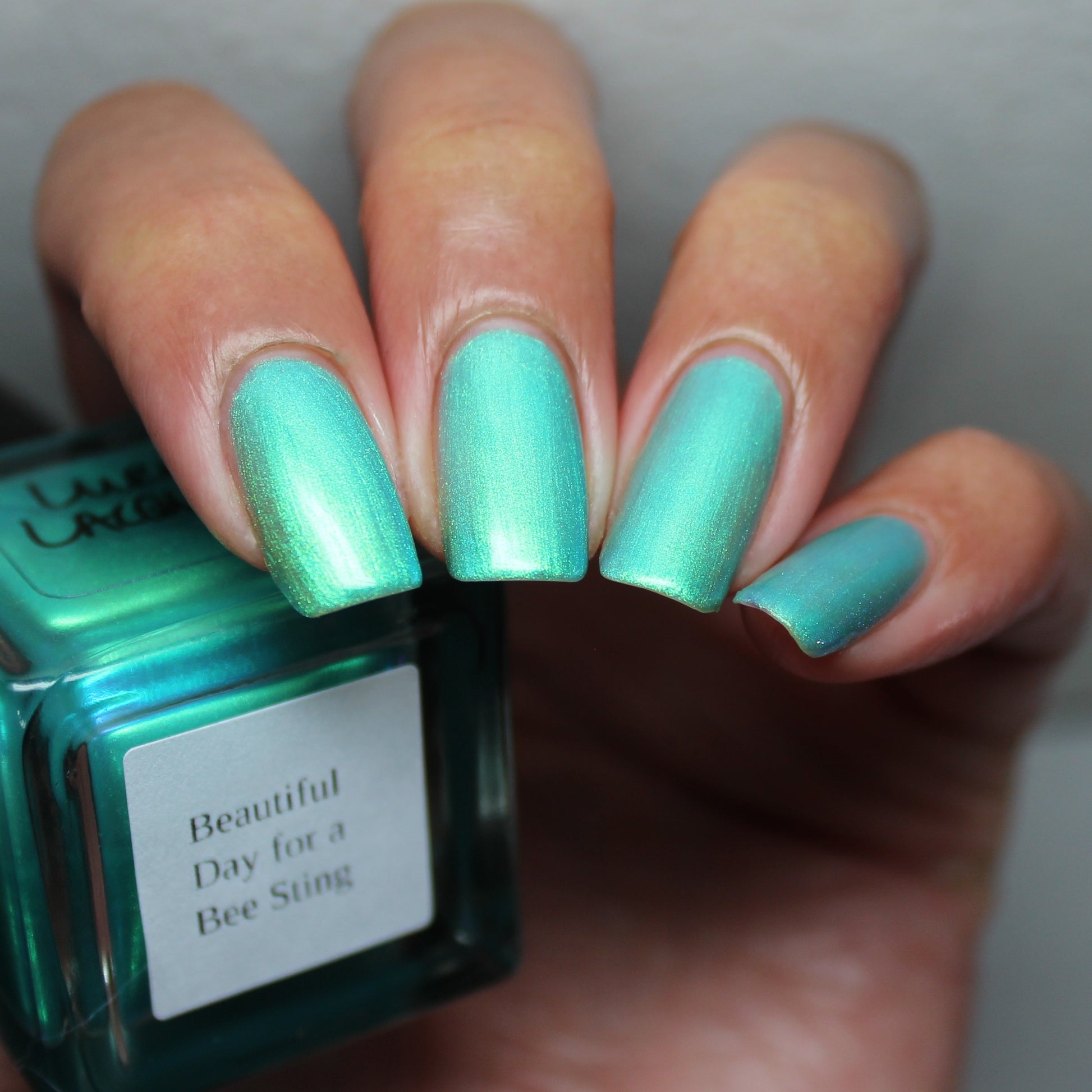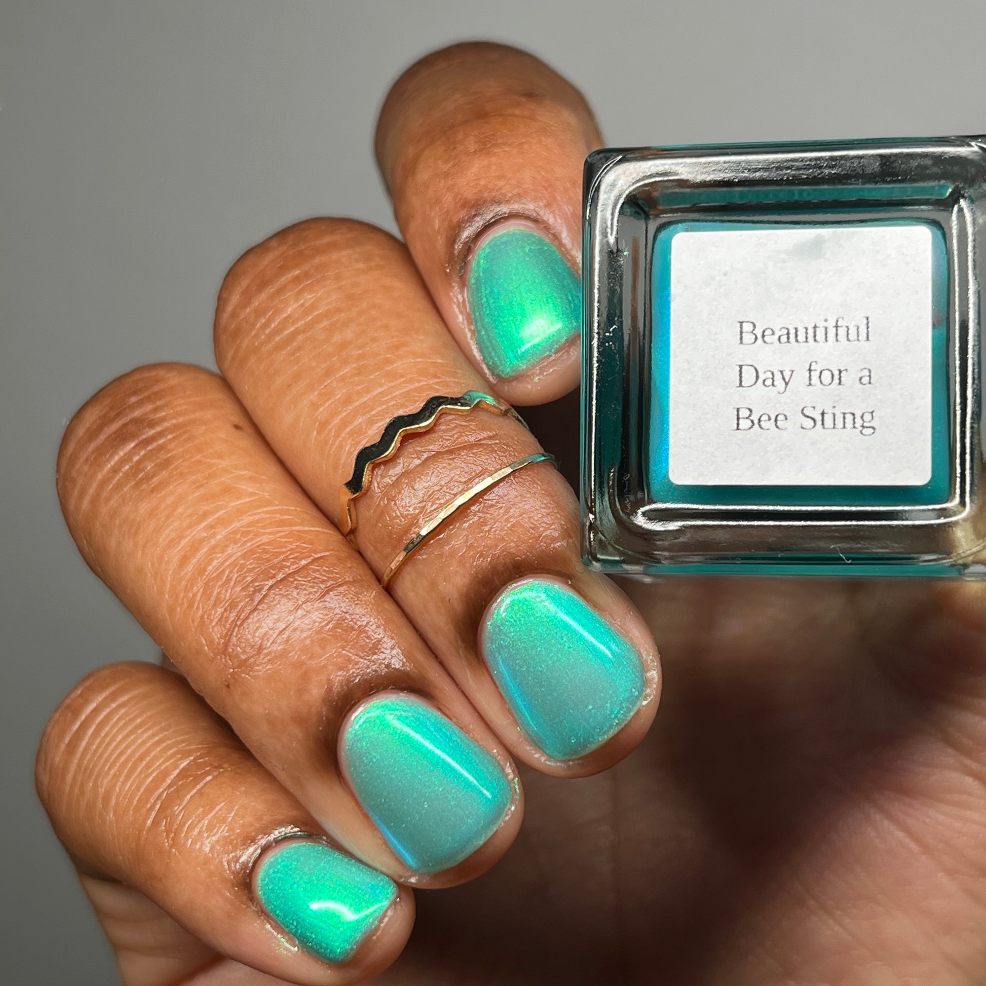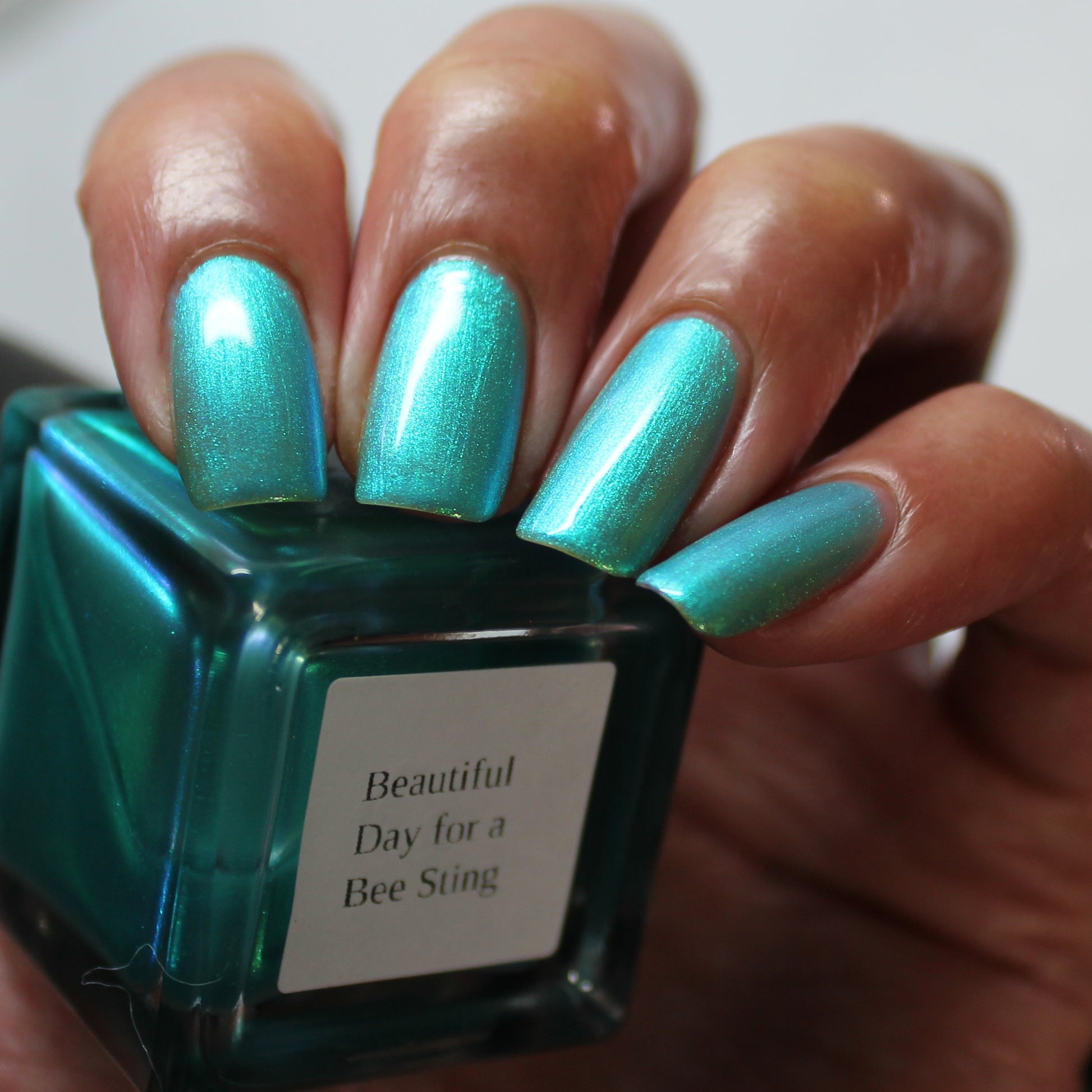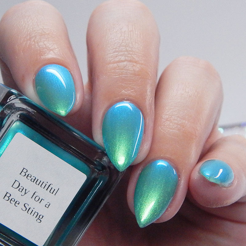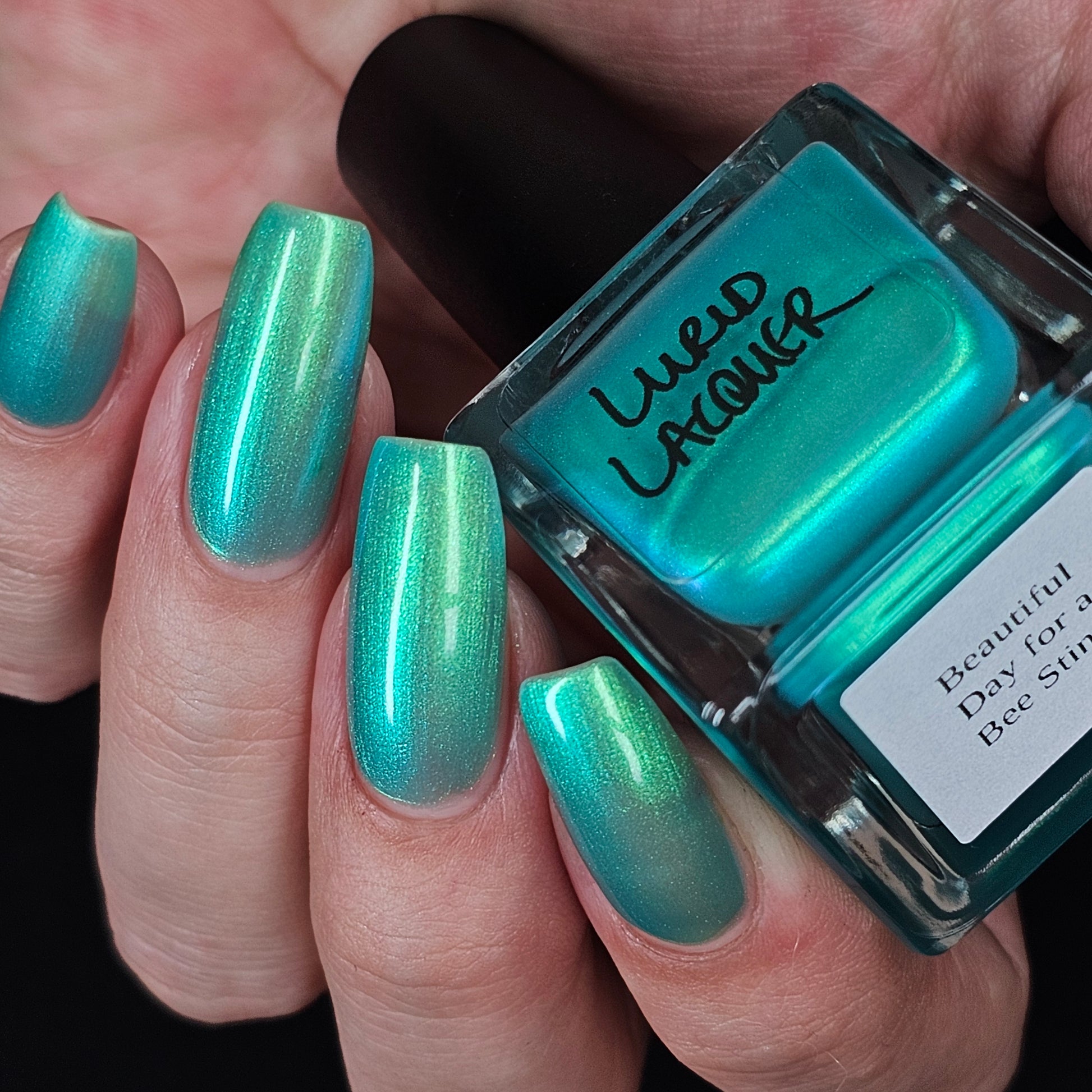 A semi-sheer aqua base with an aurora shimmer that shifts from green to blue