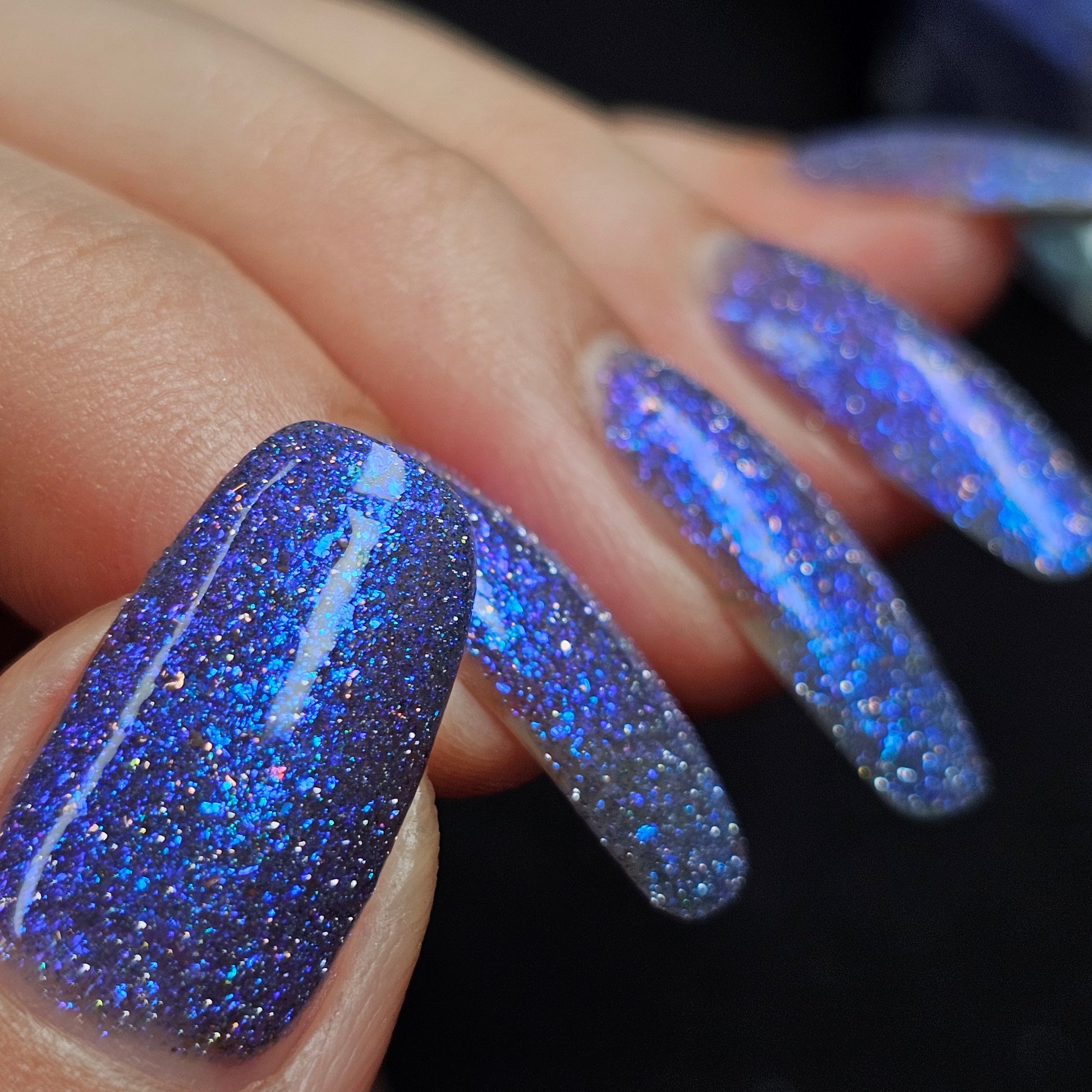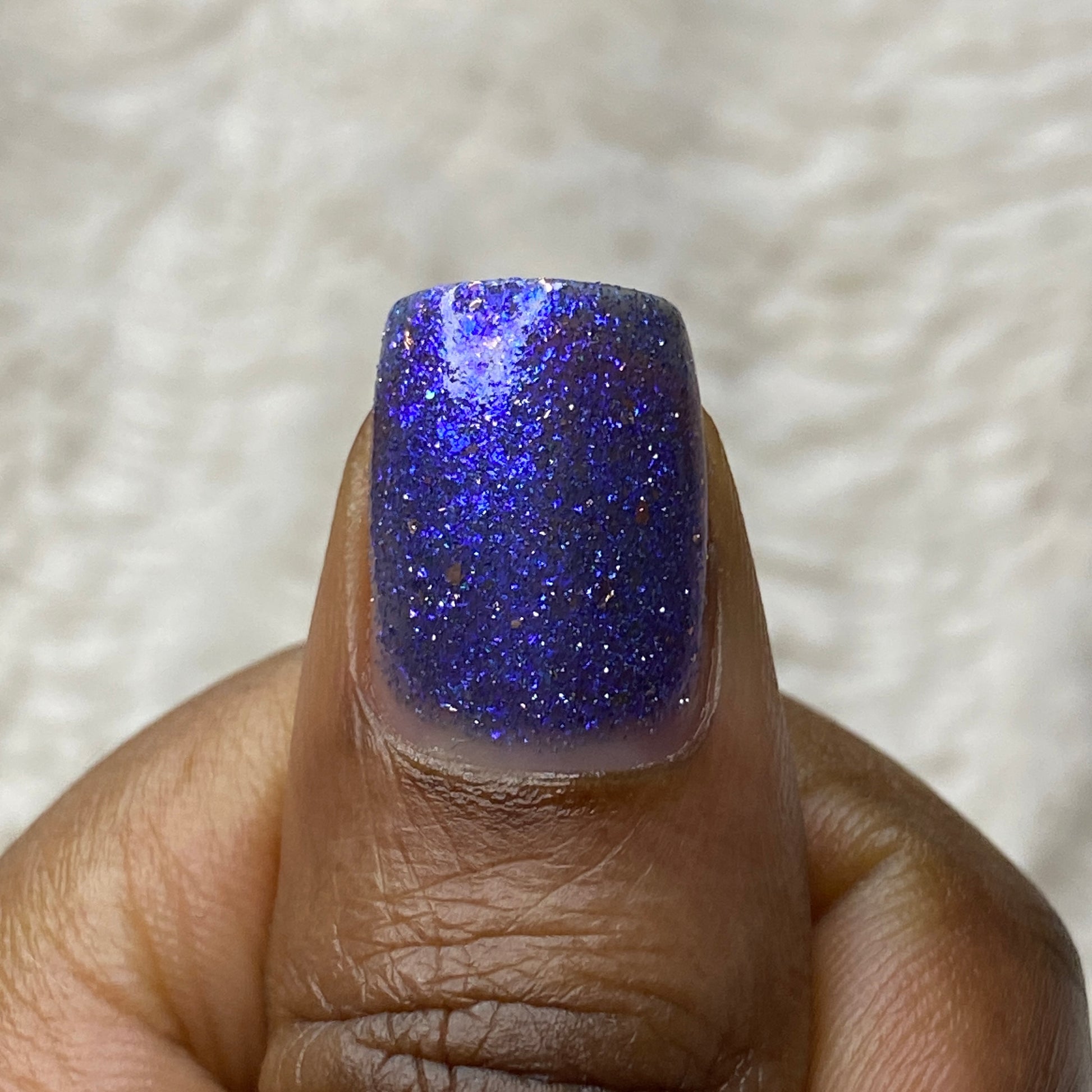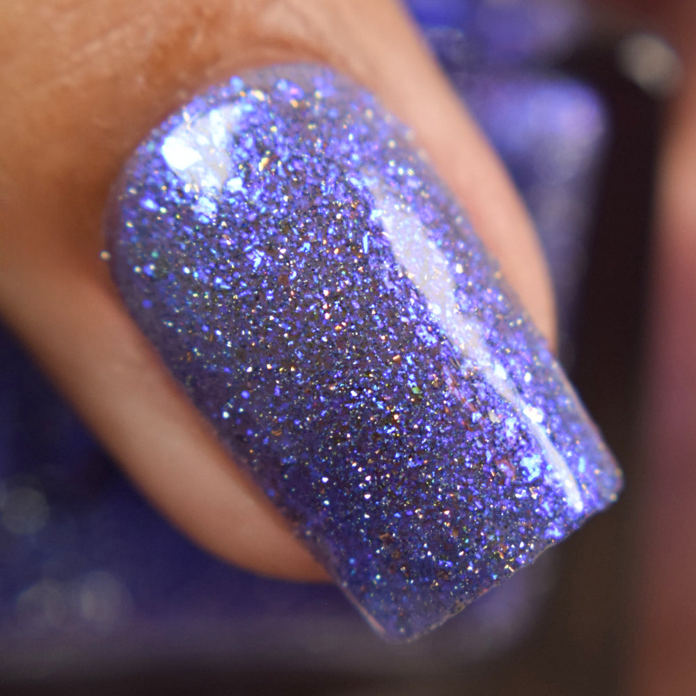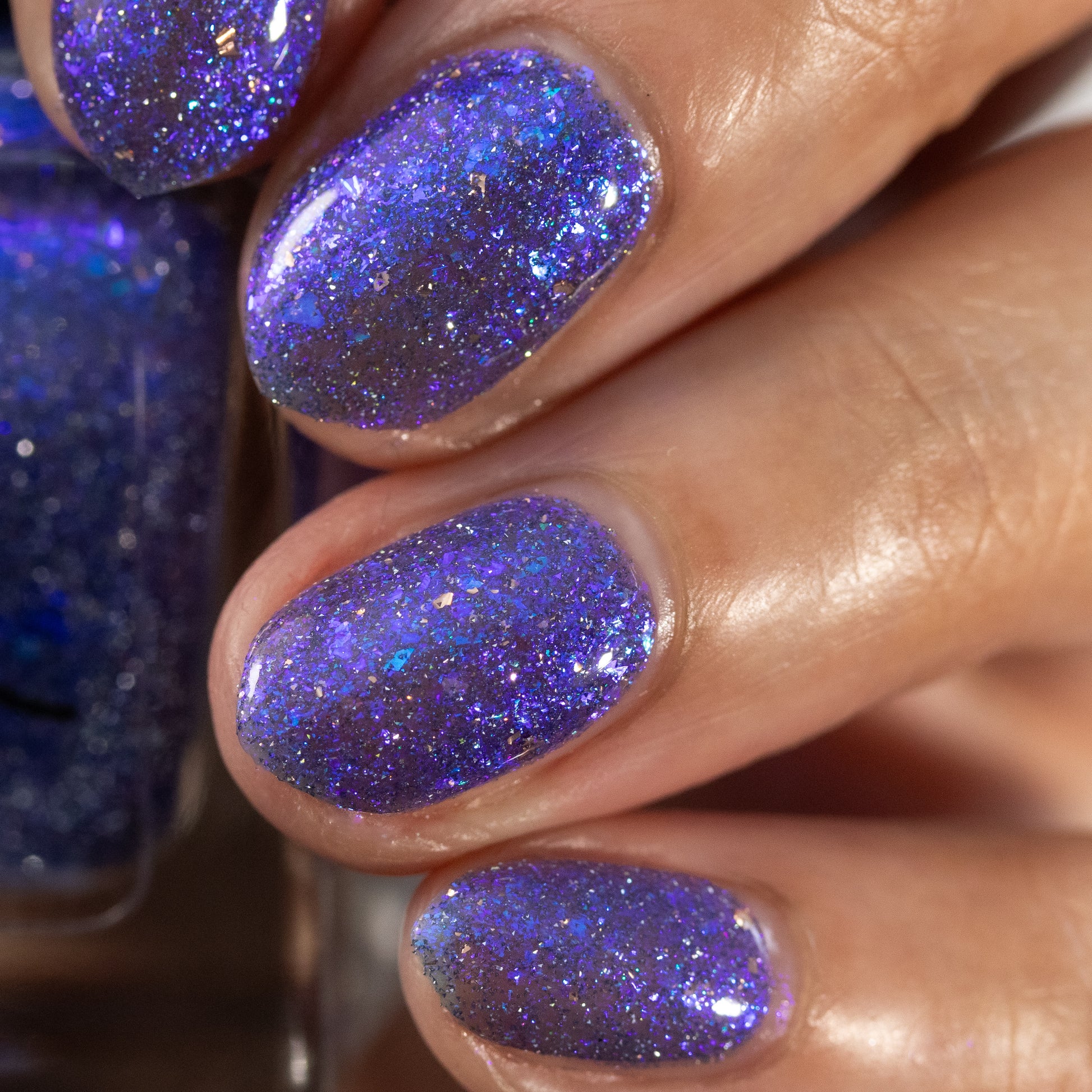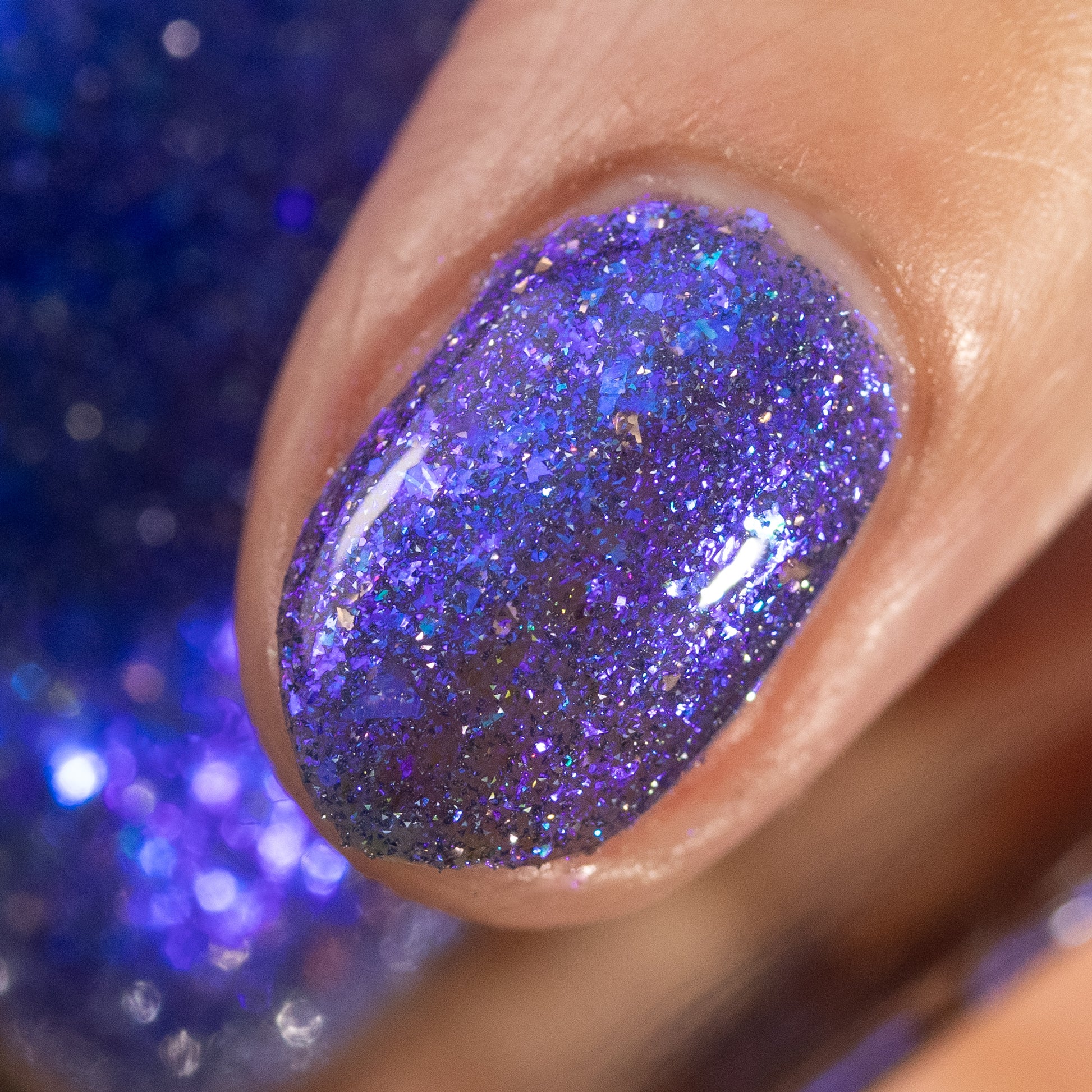 An indigo jelly base with iridescent flakes that shift from blue to purple, rose gold metallic flakies, silver light reflective glitter, and a sprinkle of aurora pigment that shifts from blue to purple to pink.