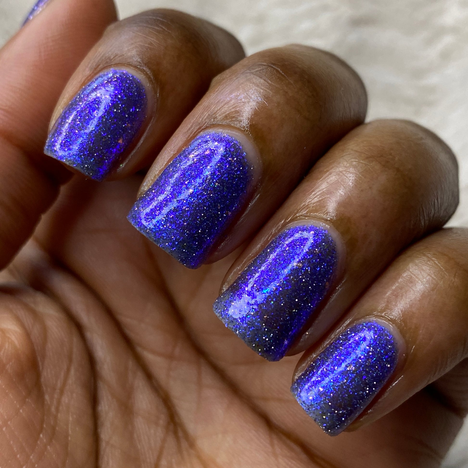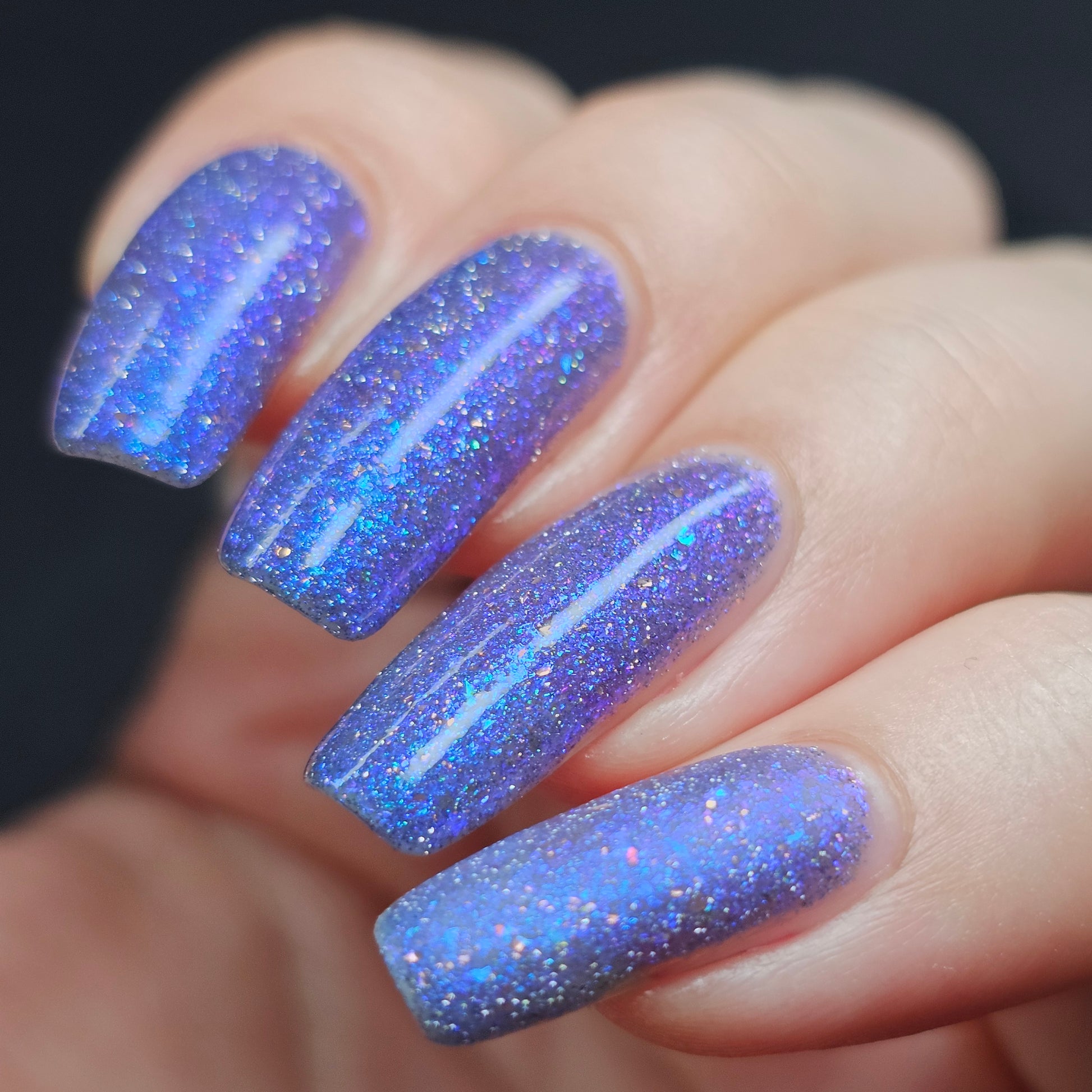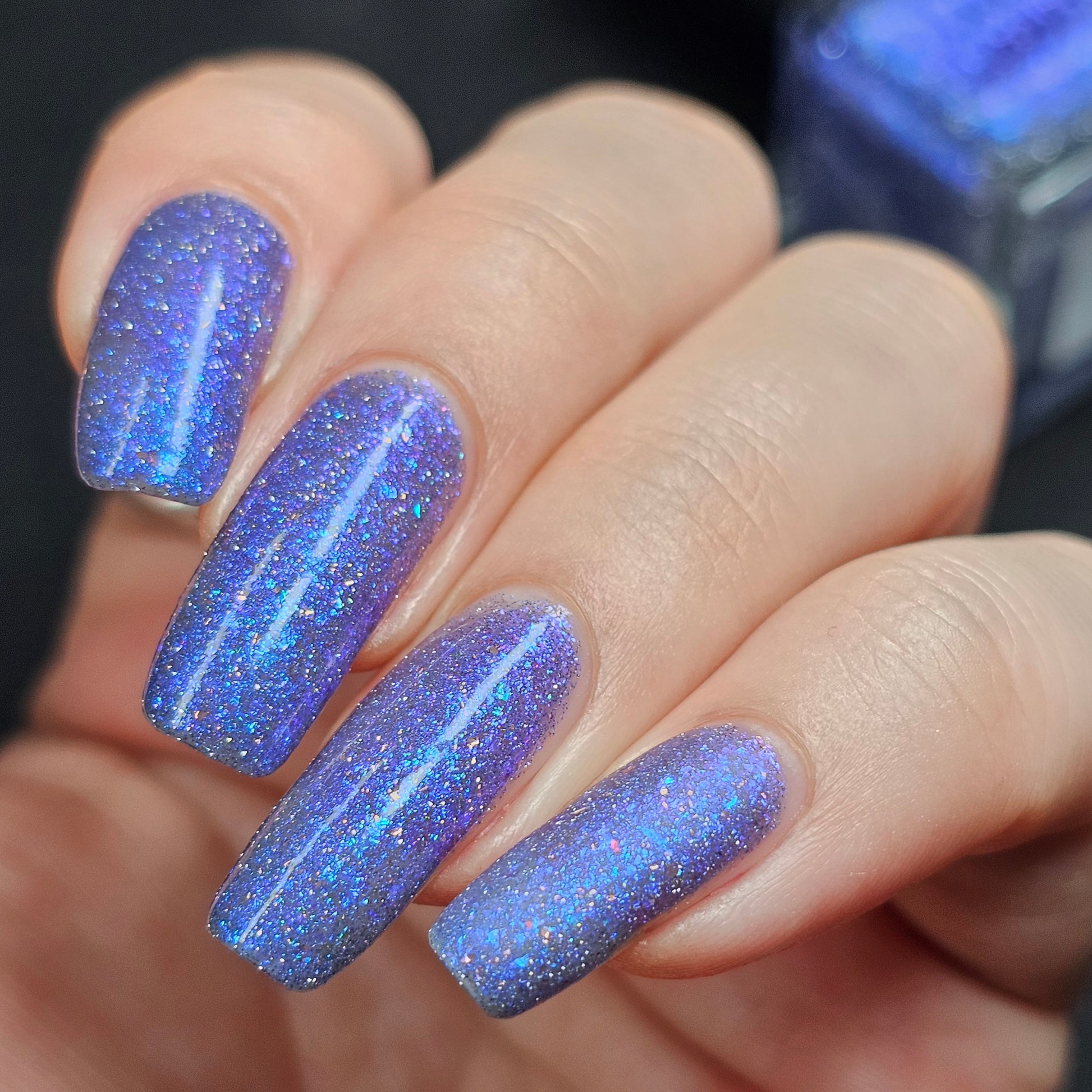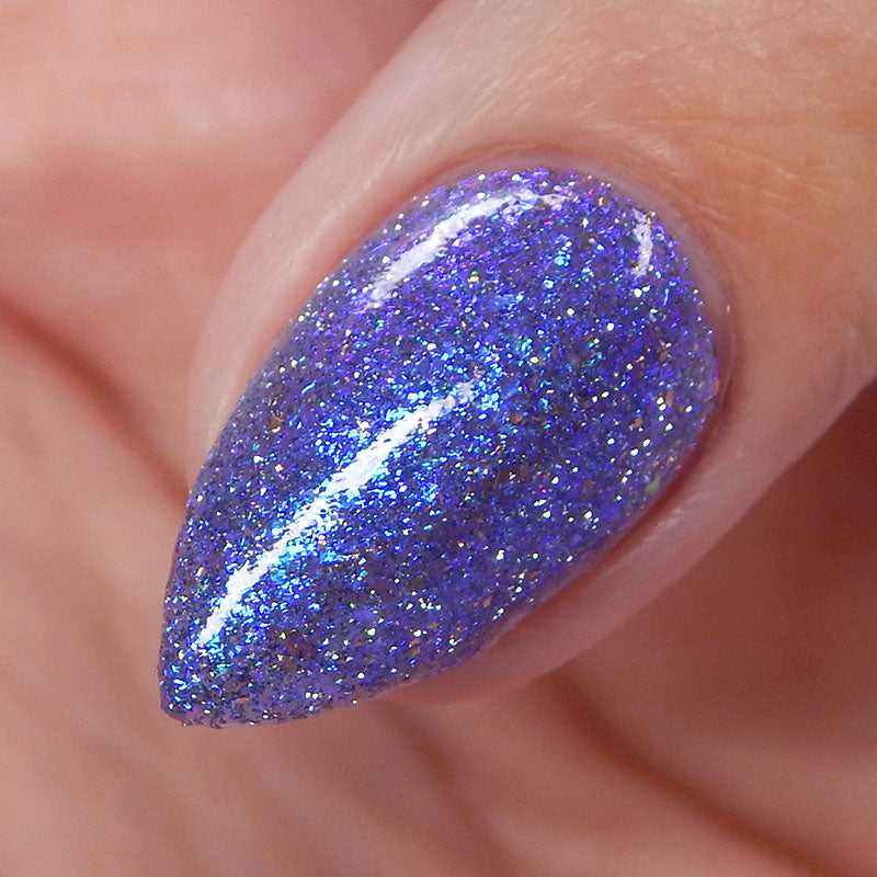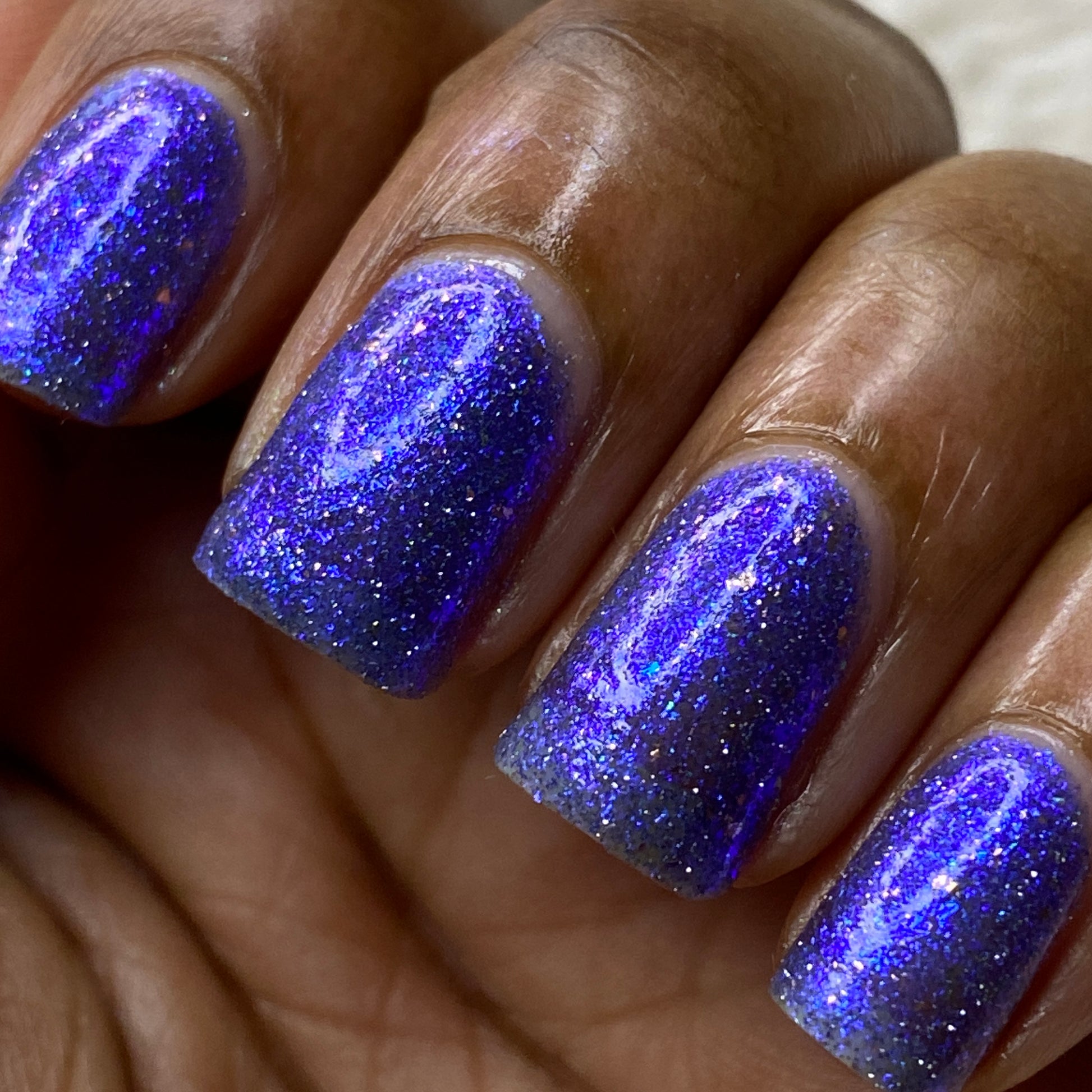 An indigo jelly base with iridescent flakes that shift from blue to purple, rose gold metallic flakies, silver light reflective glitter, and a sprinkle of aurora pigment that shifts from blue to purple to pink.