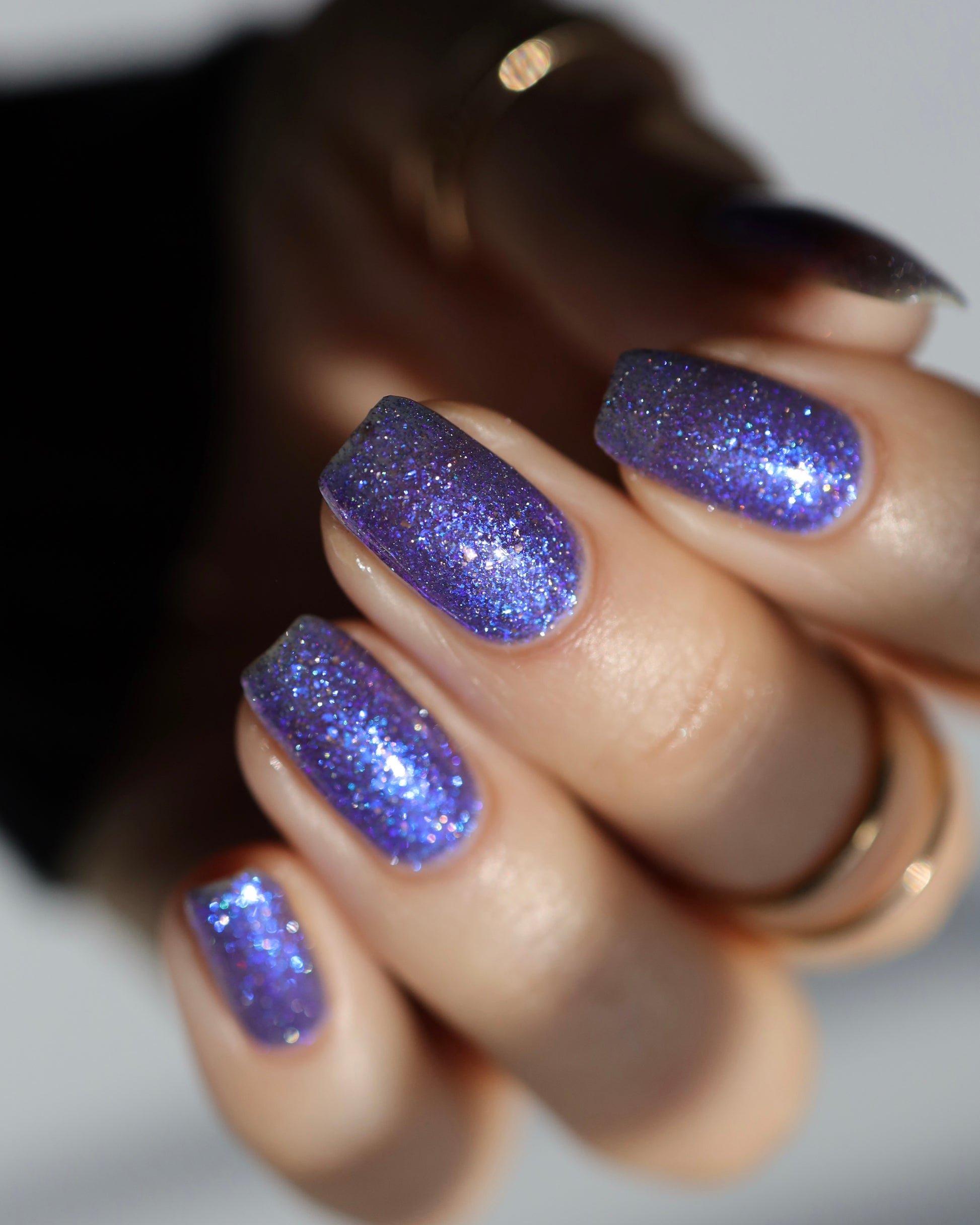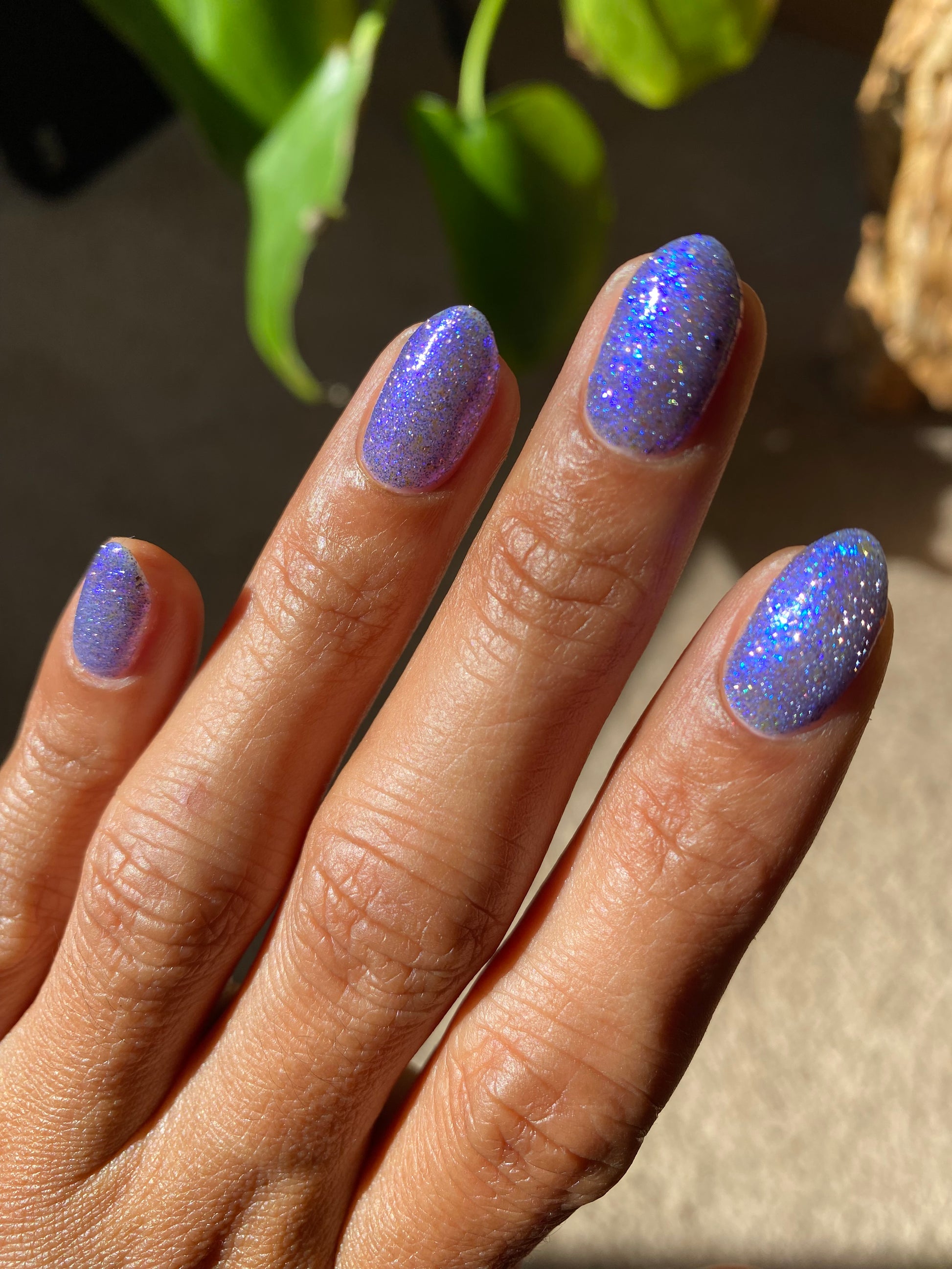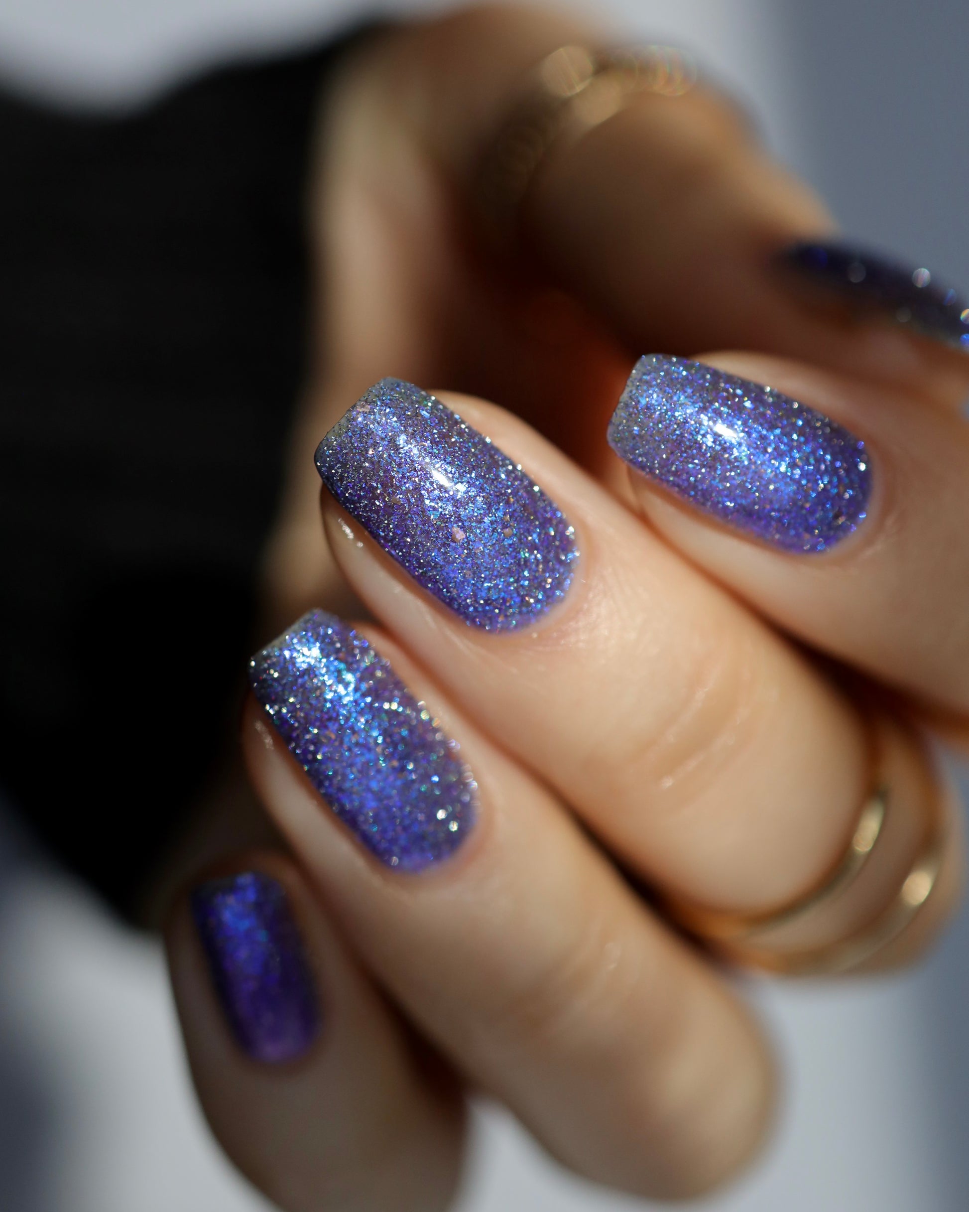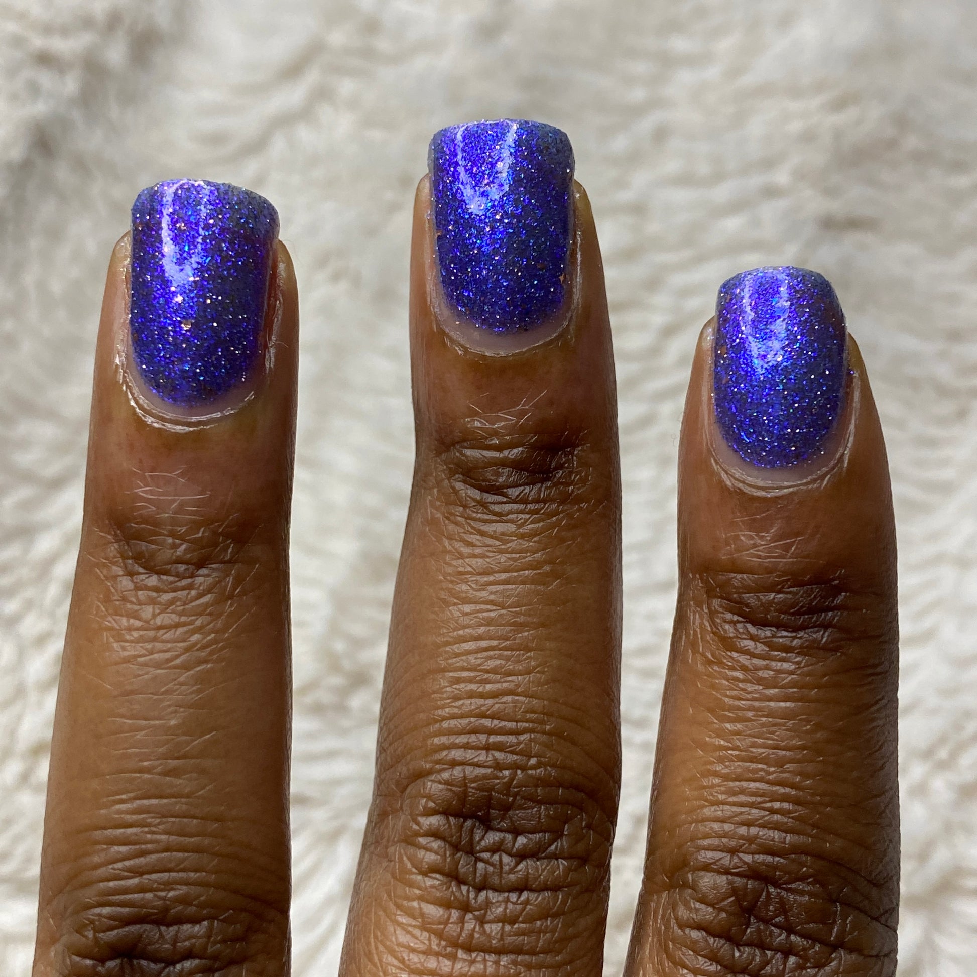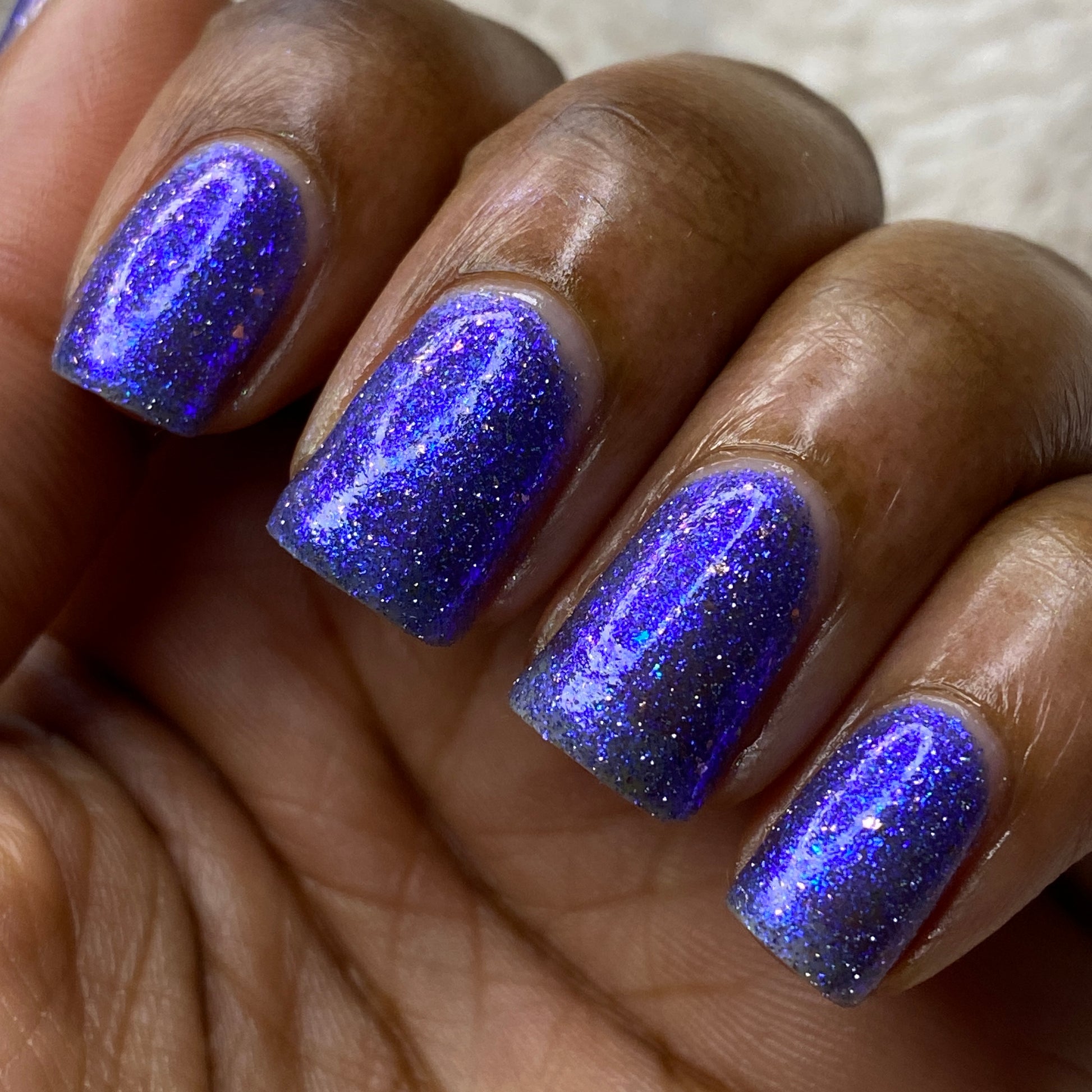 An indigo jelly base with iridescent flakes that shift from blue to purple, rose gold metallic flakies, silver light reflective glitter, and a sprinkle of aurora pigment that shifts from blue to purple to pink.