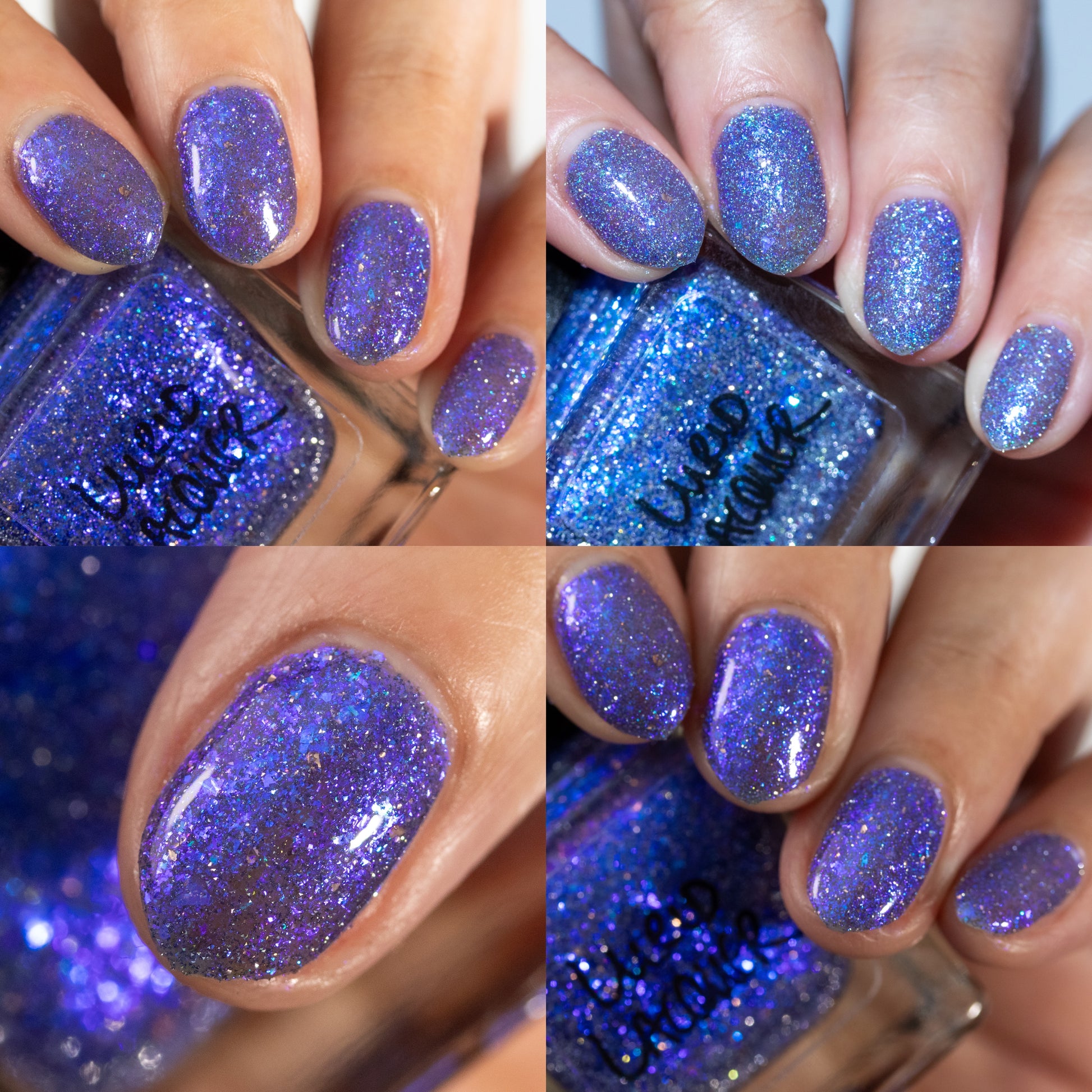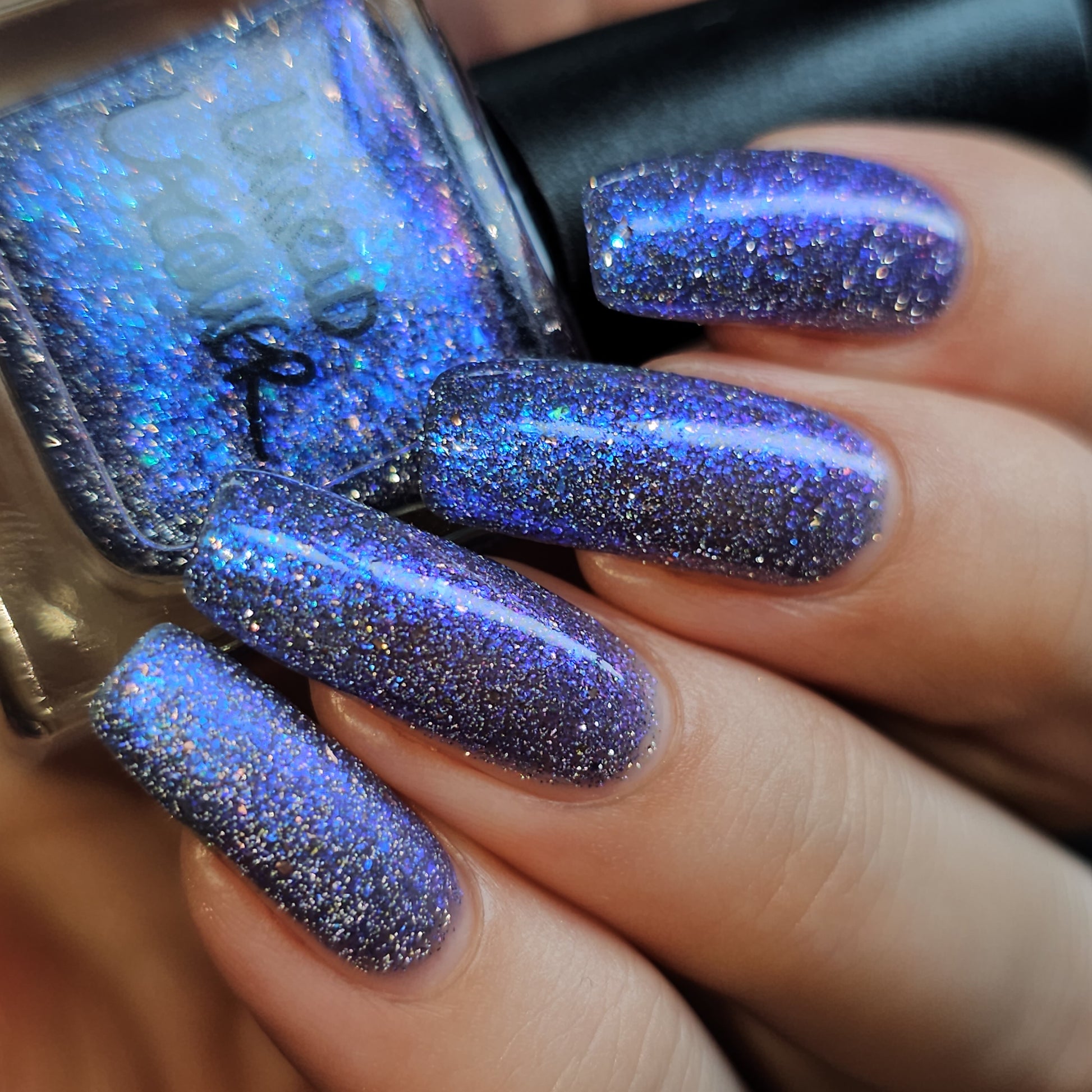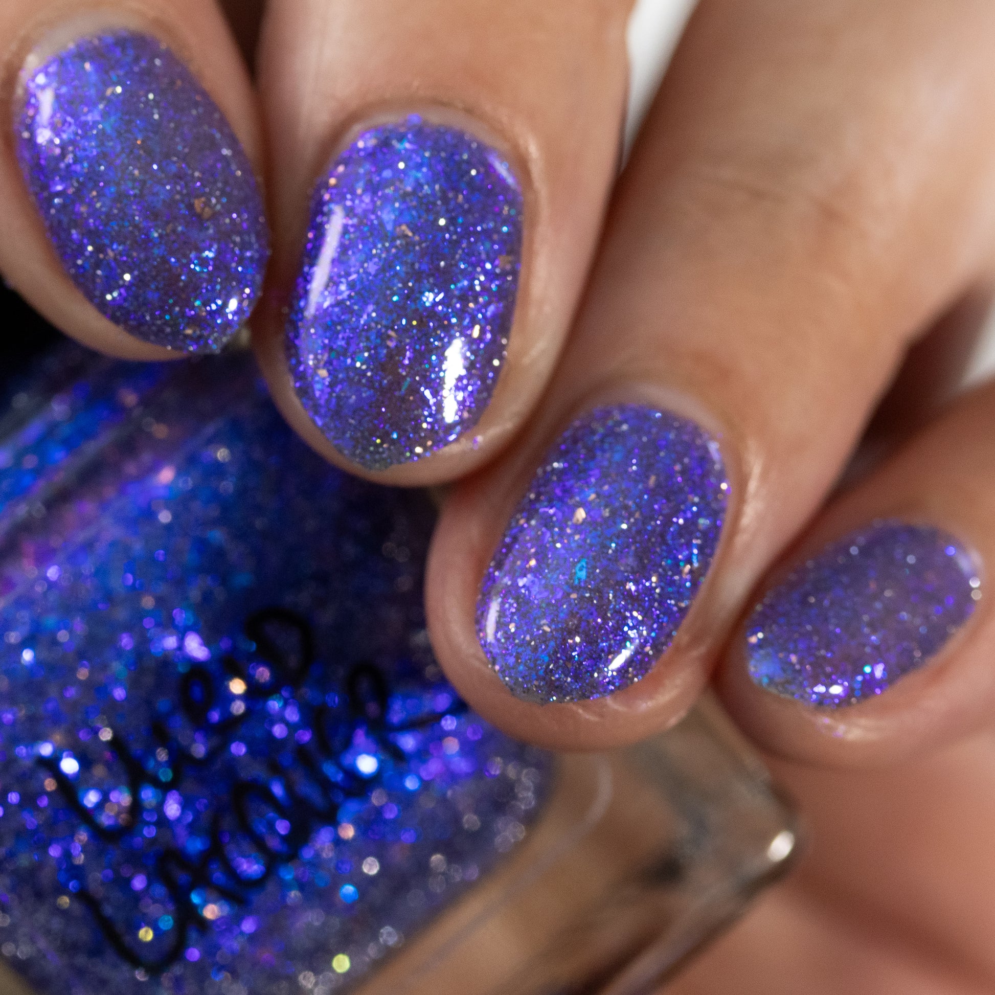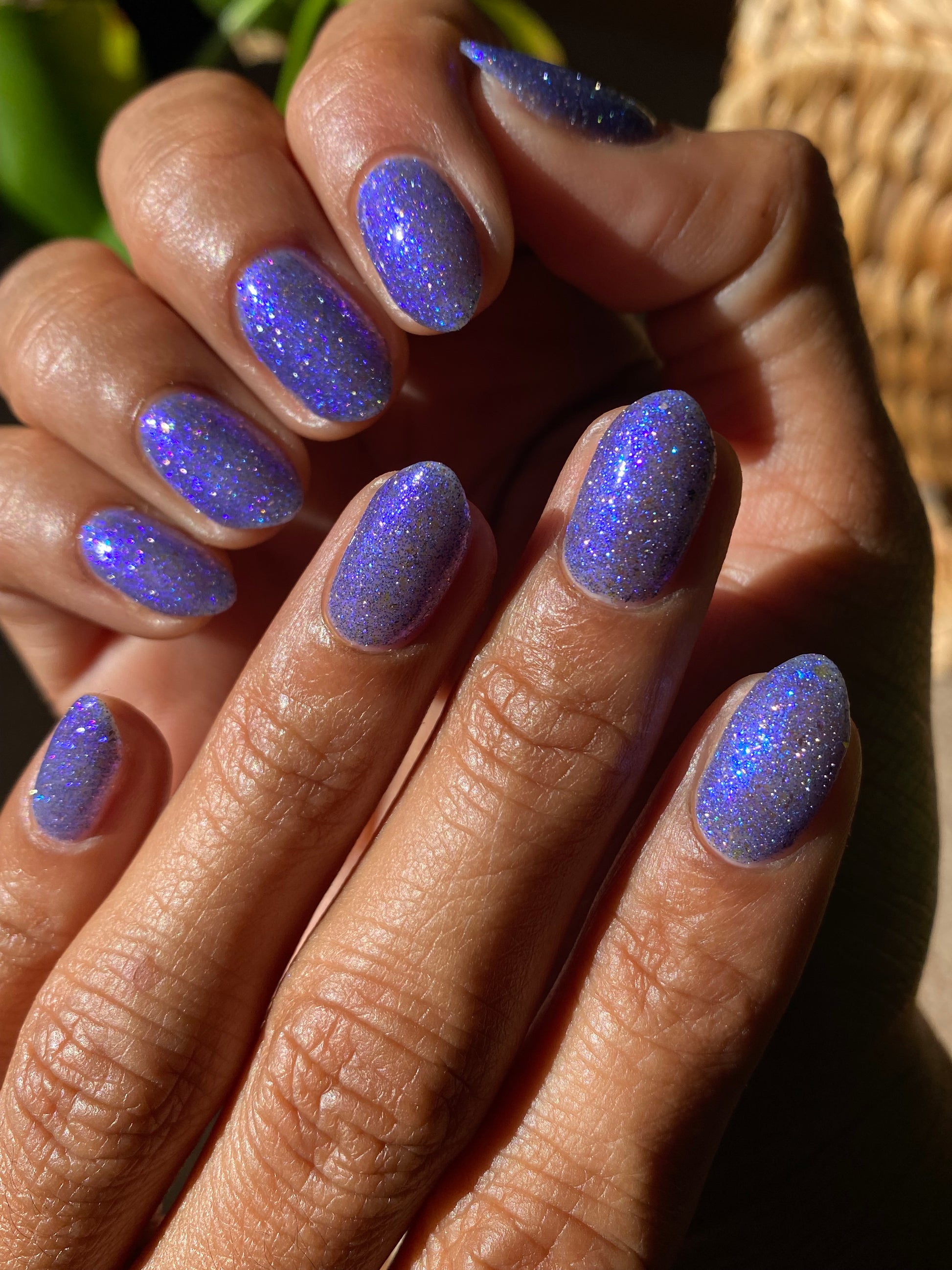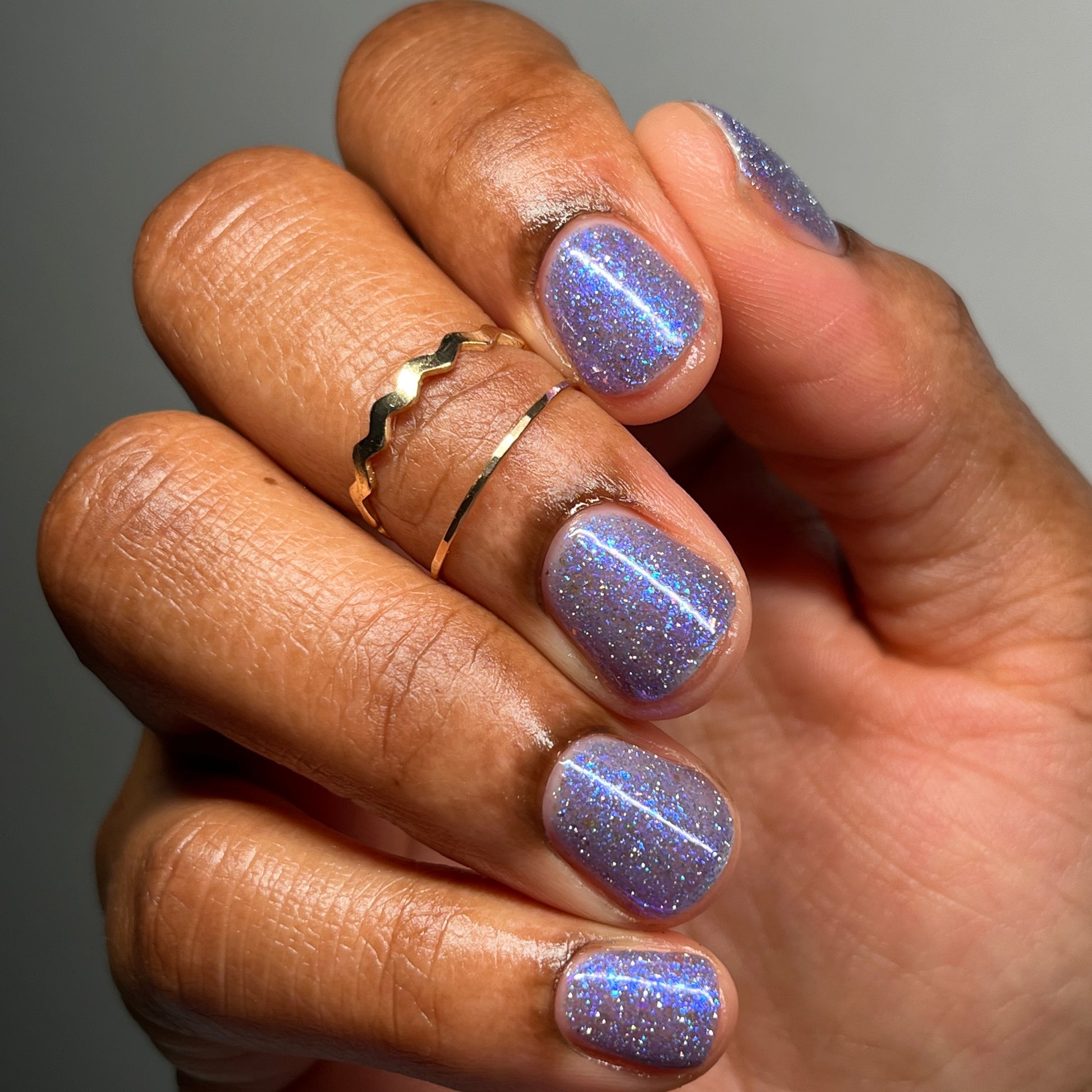 An indigo jelly base with iridescent flakes that shift from blue to purple, rose gold metallic flakies, silver light reflective glitter, and a sprinkle of aurora pigment that shifts from blue to purple to pink.