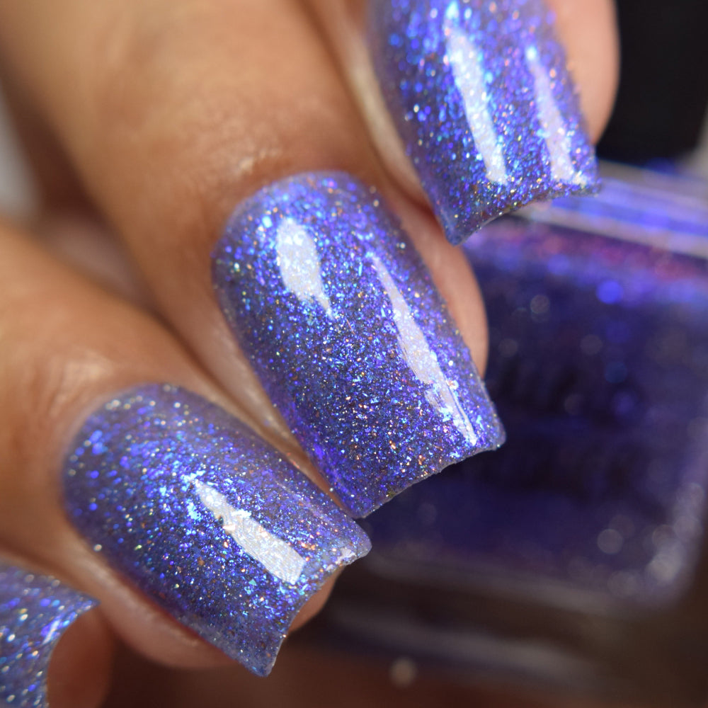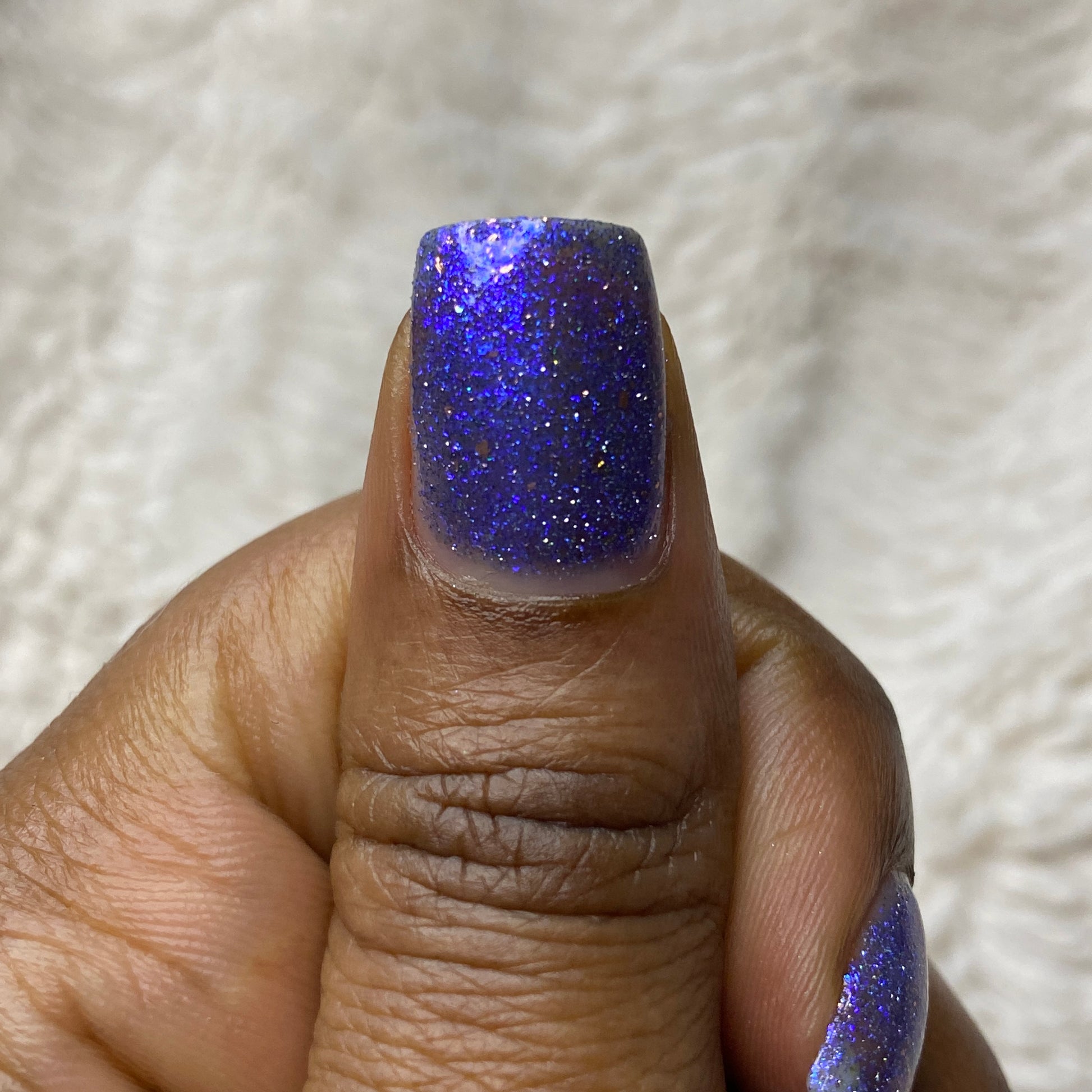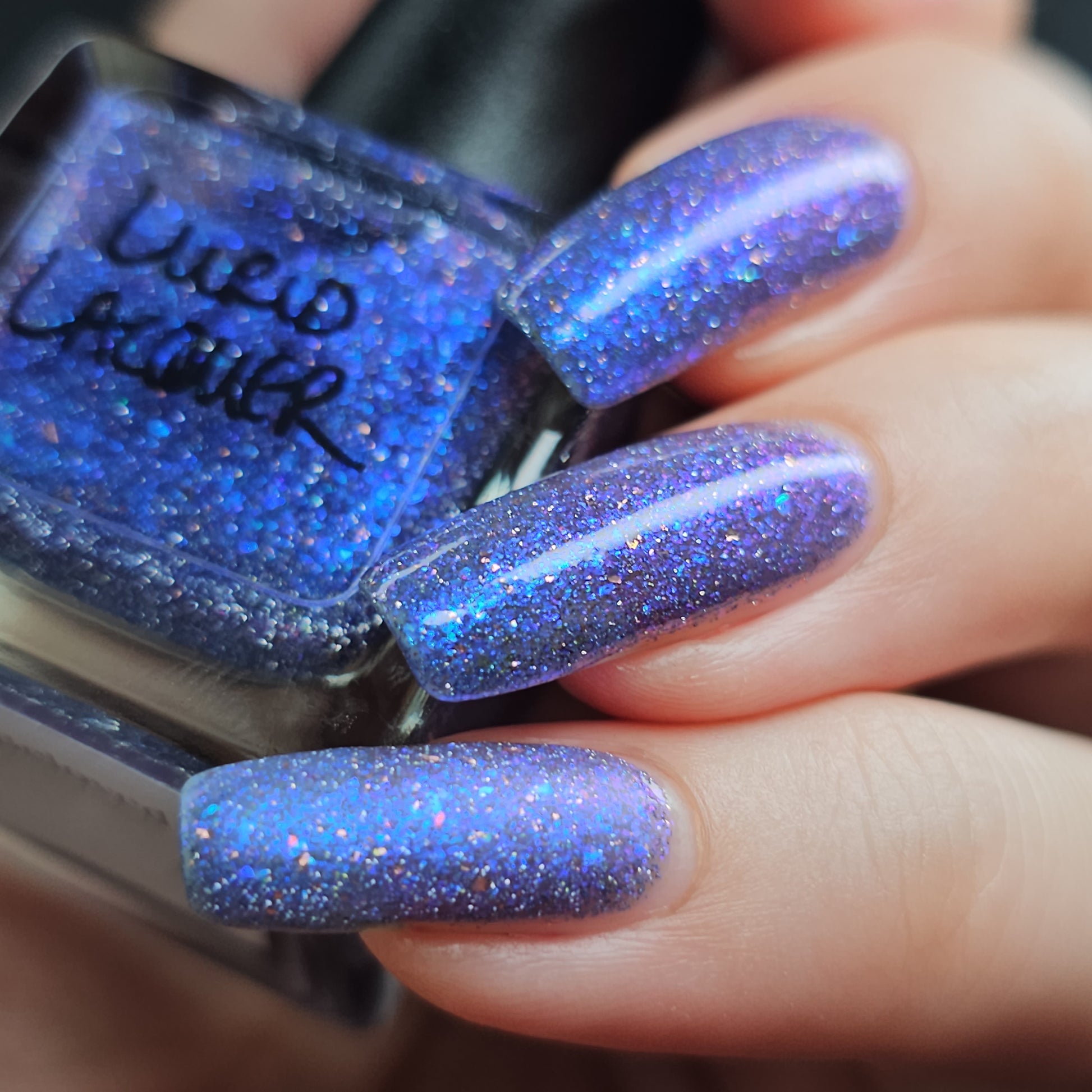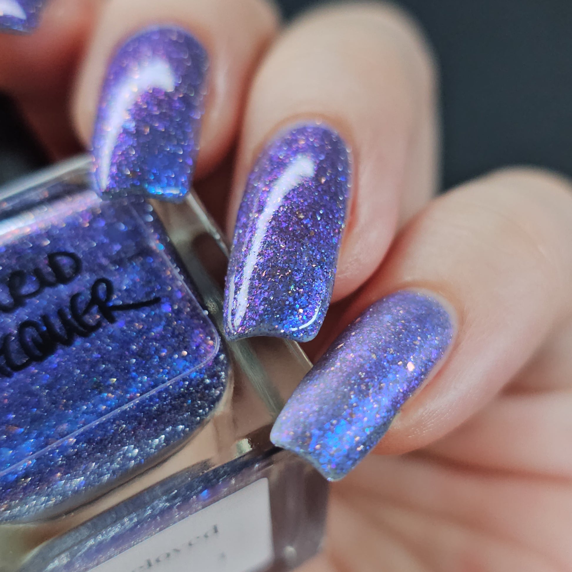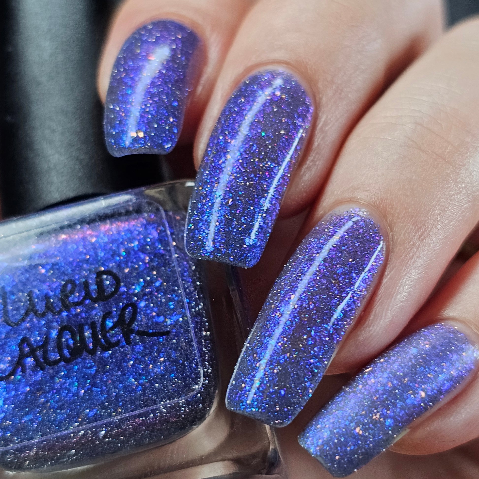 An indigo jelly base with iridescent flakes that shift from blue to purple, rose gold metallic flakies, silver light reflective glitter, and a sprinkle of aurora pigment that shifts from blue to purple to pink.