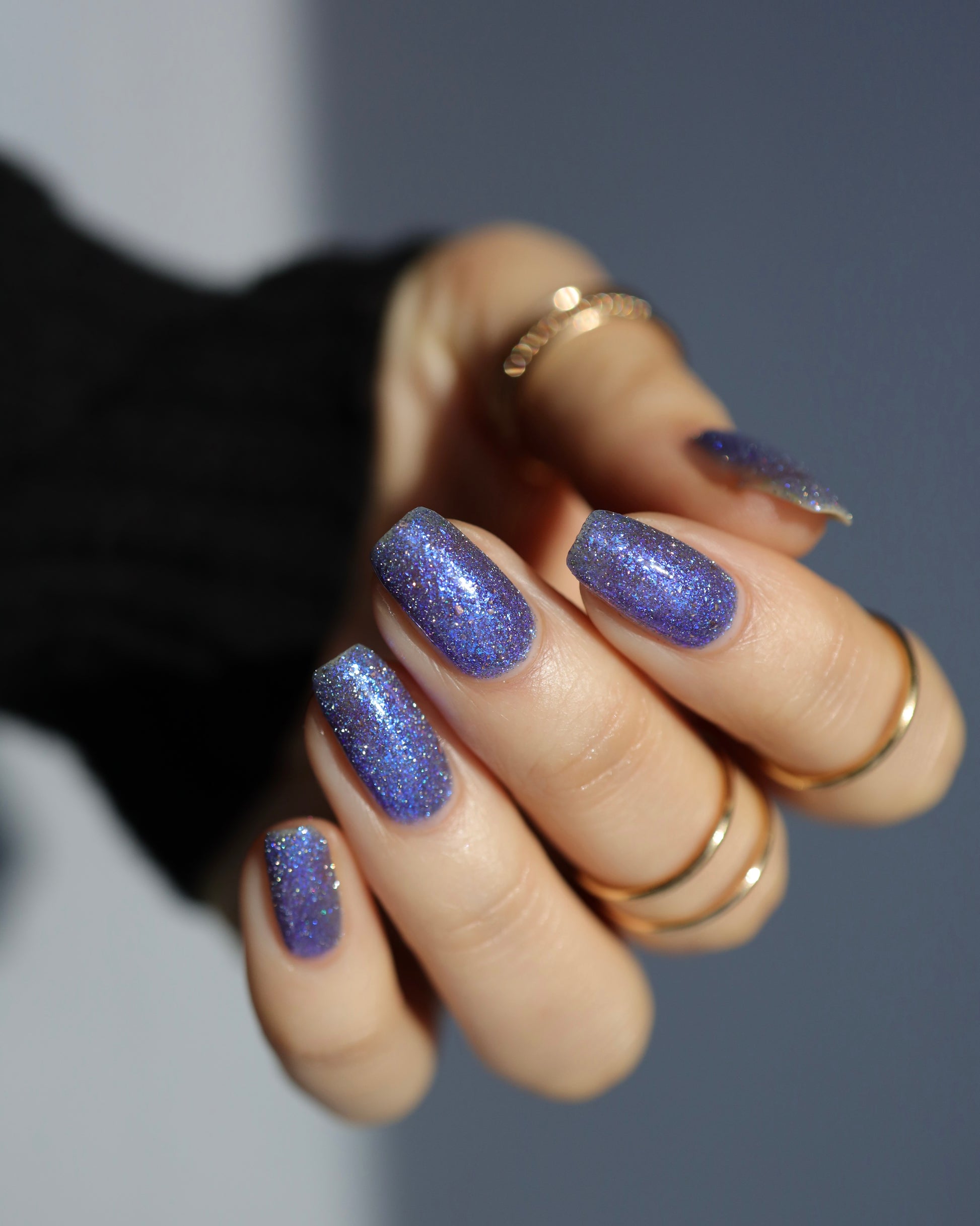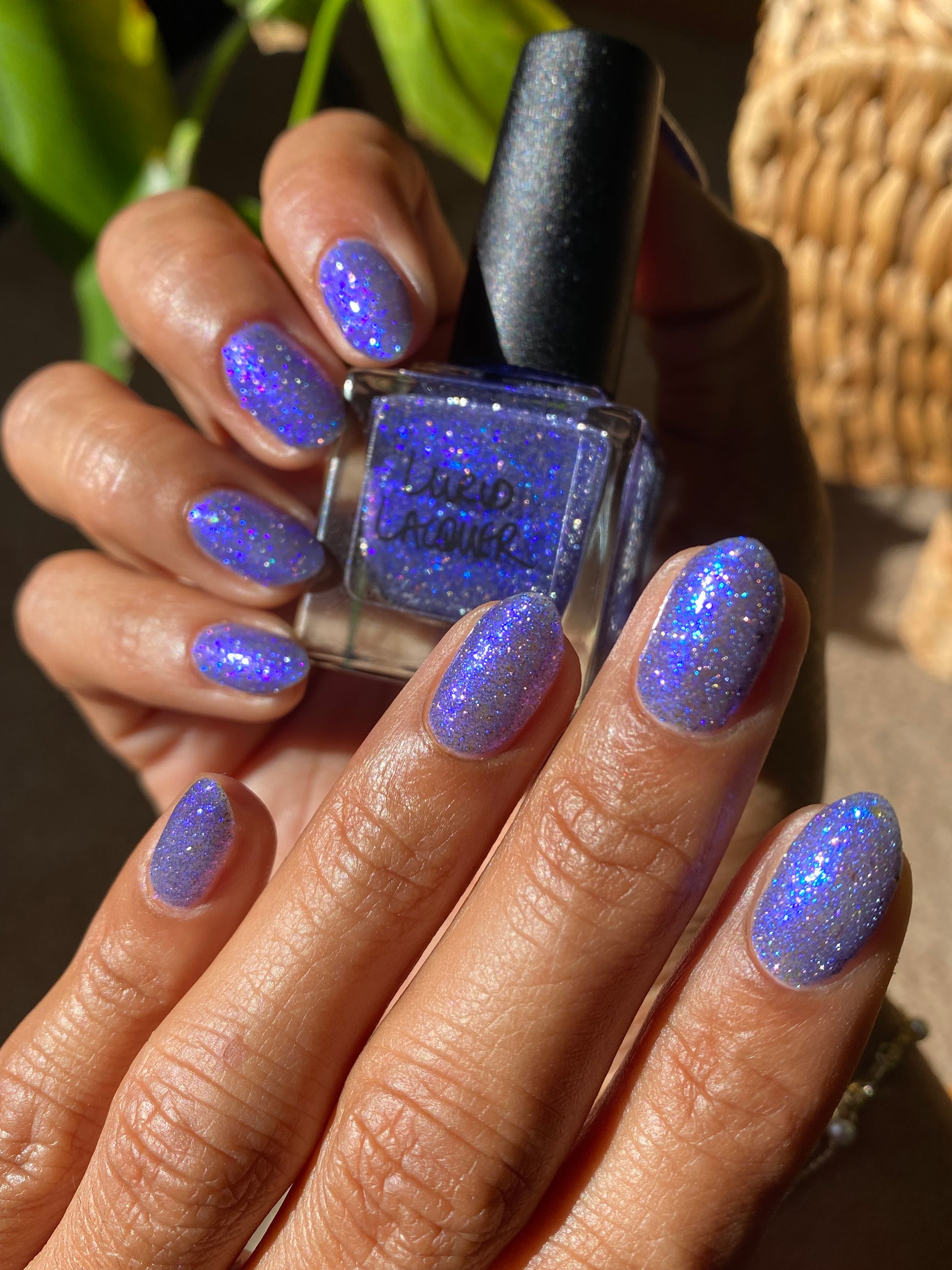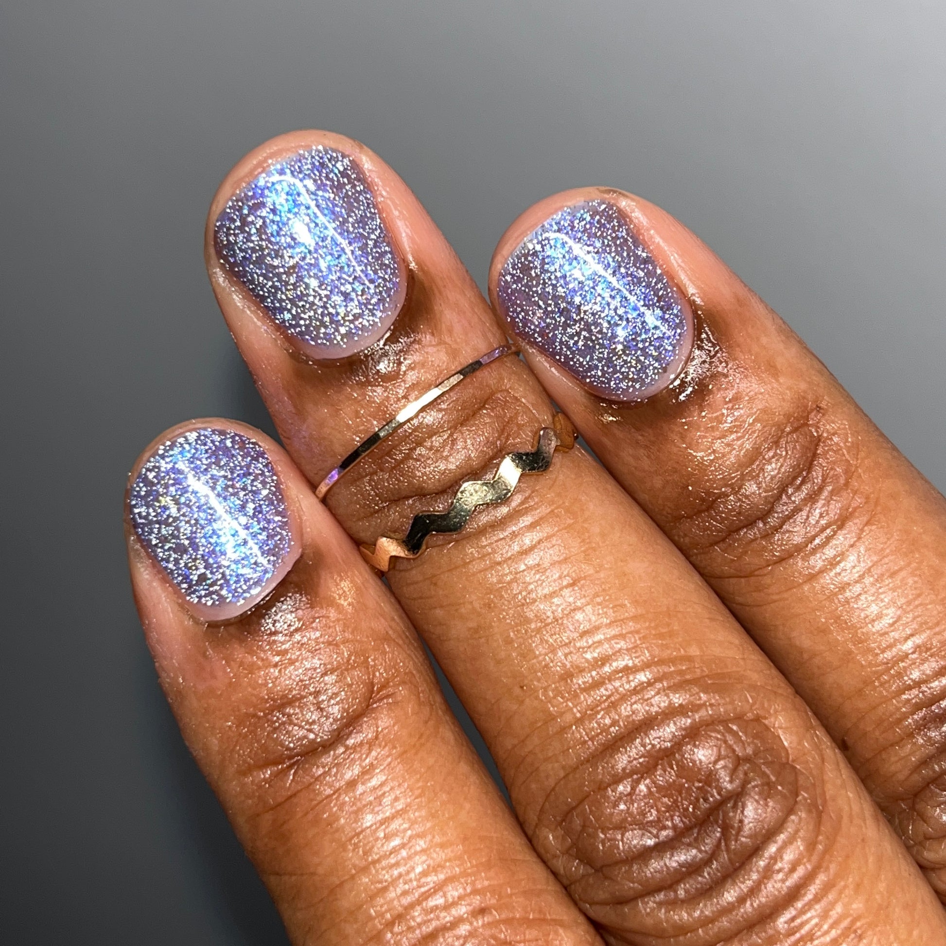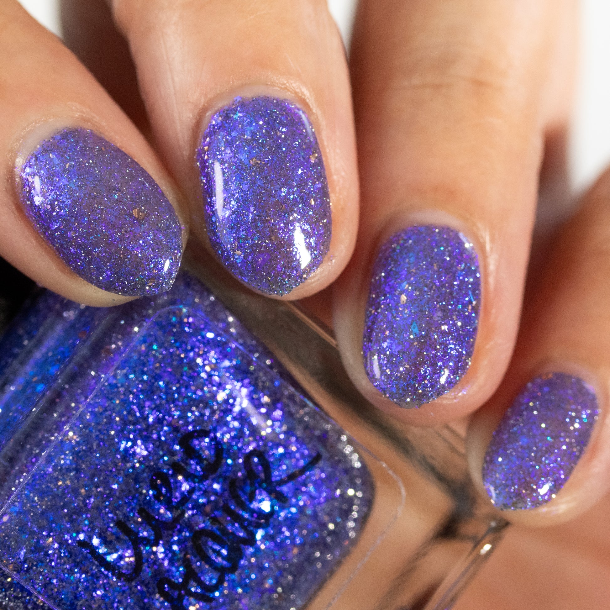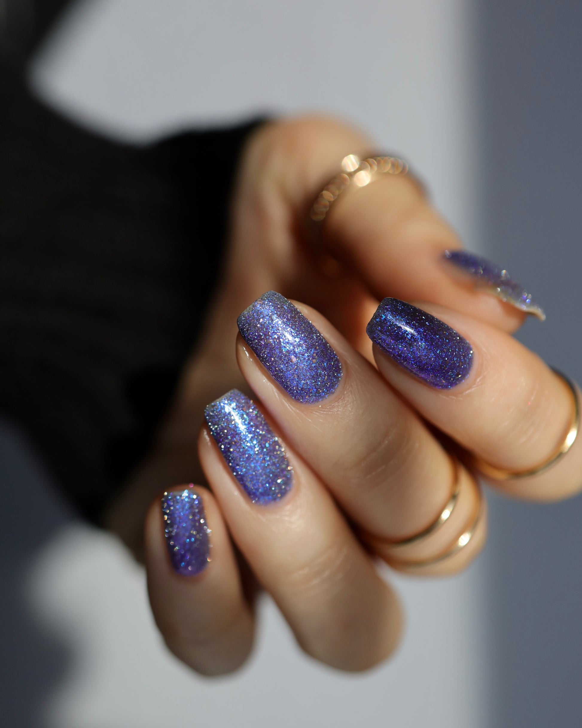 An indigo jelly base with iridescent flakes that shift from blue to purple, rose gold metallic flakies, silver light reflective glitter, and a sprinkle of aurora pigment that shifts from blue to purple to pink.