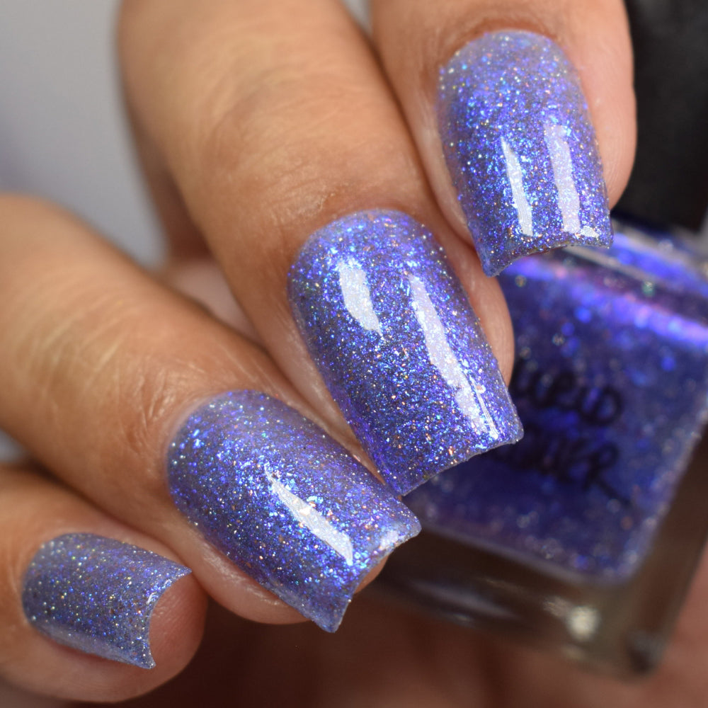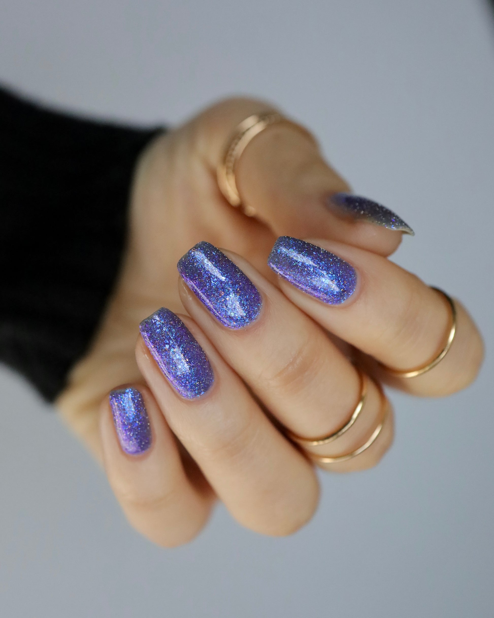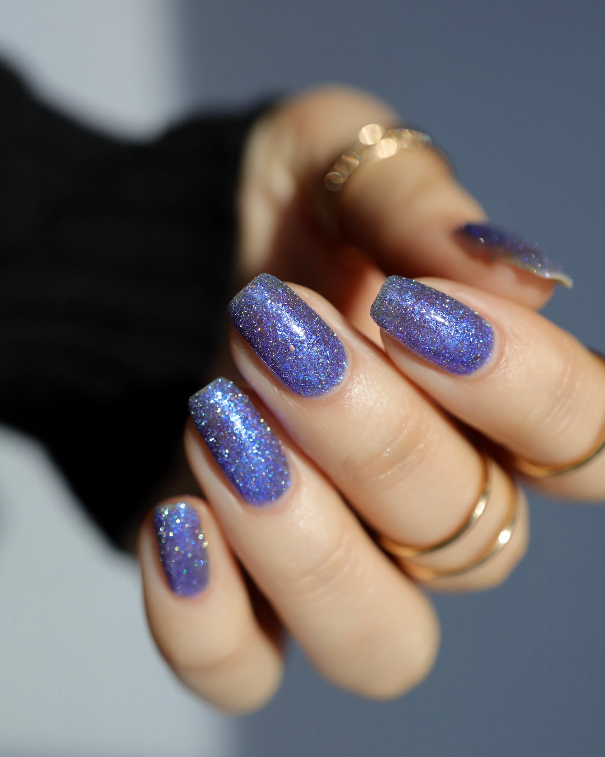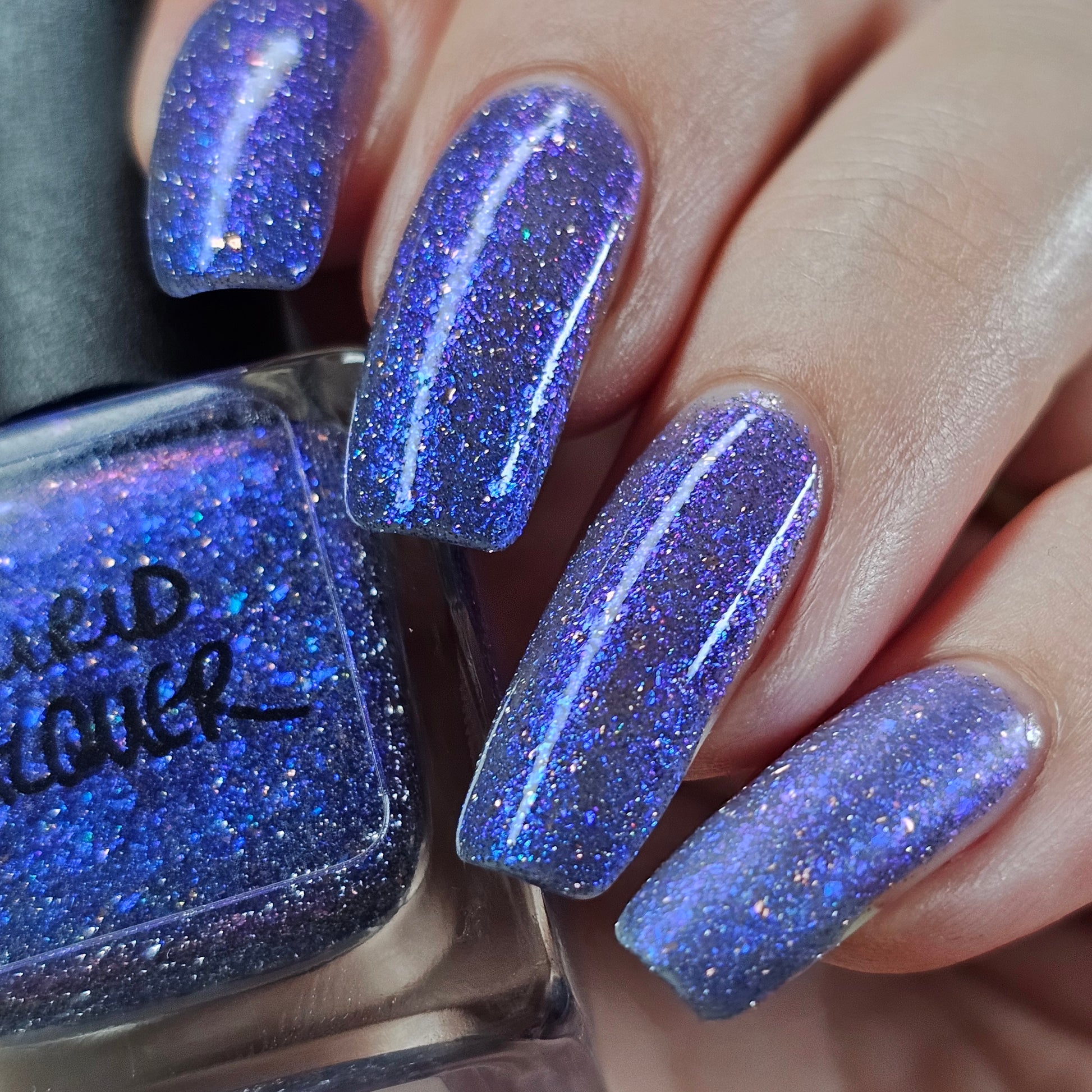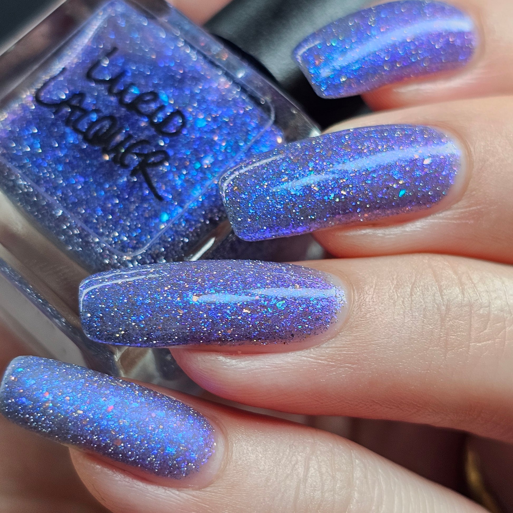 An indigo jelly base with iridescent flakes that shift from blue to purple, rose gold metallic flakies, silver light reflective glitter, and a sprinkle of aurora pigment that shifts from blue to purple to pink.